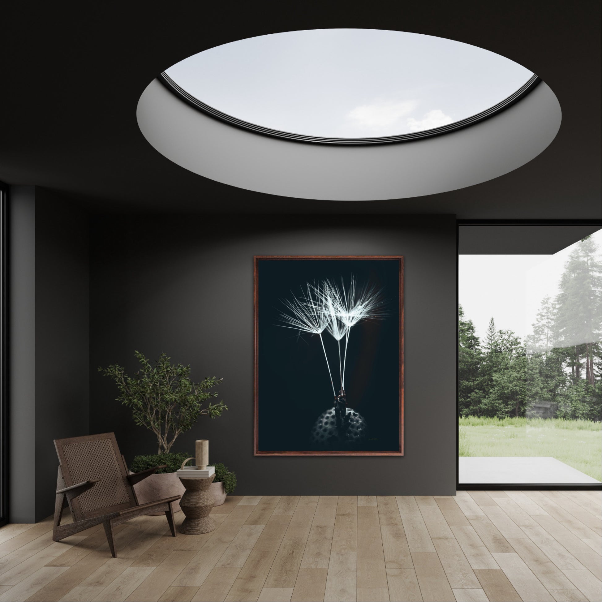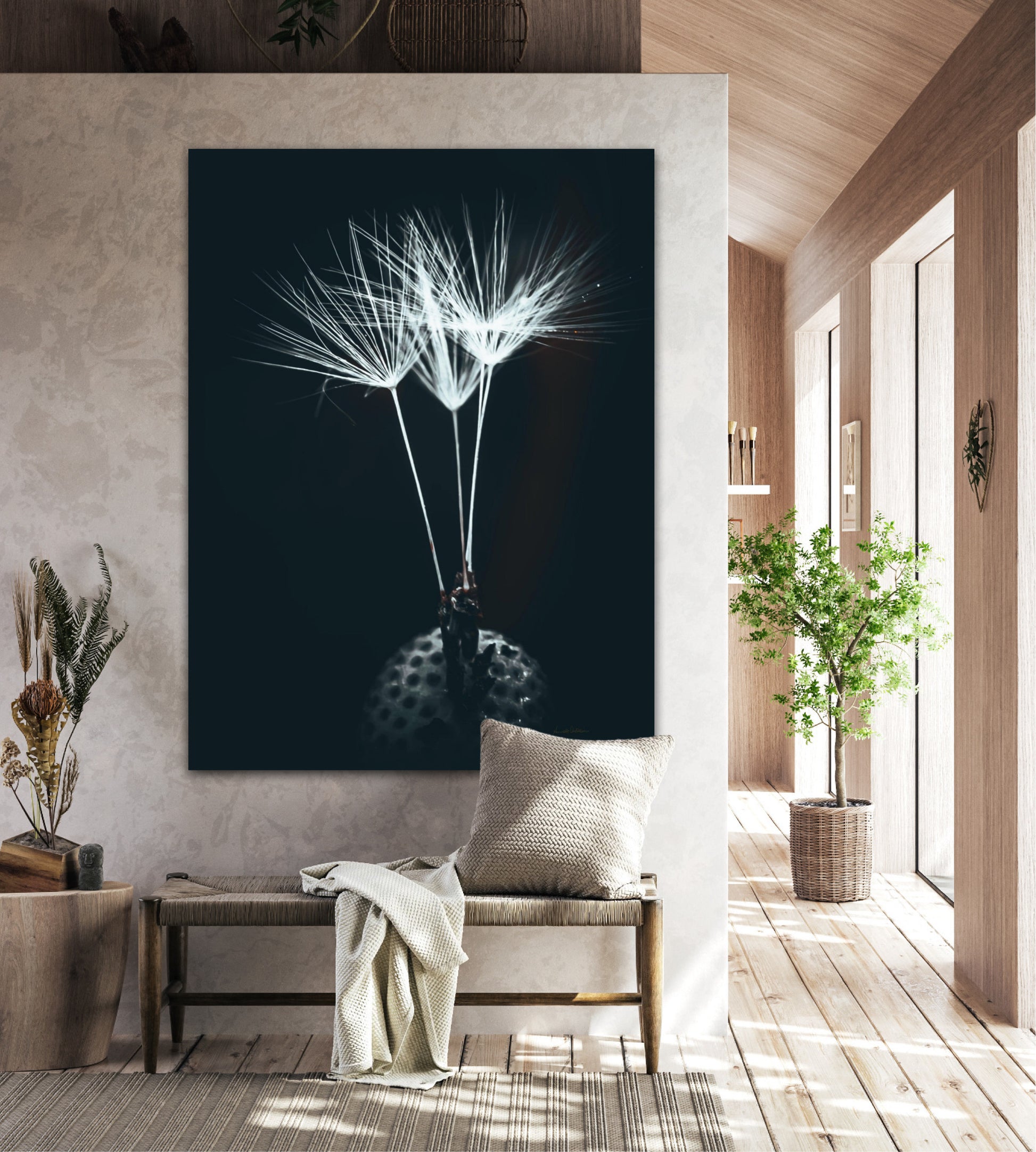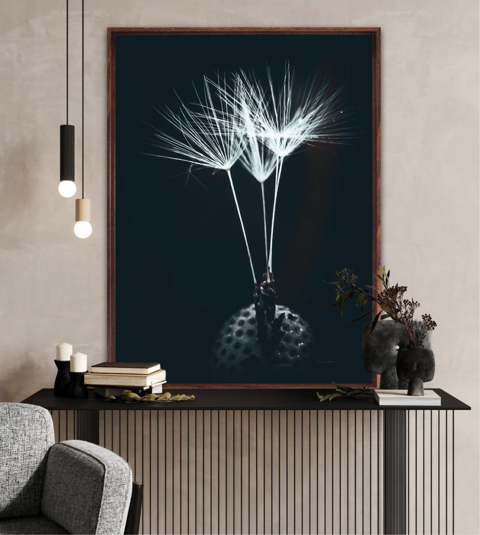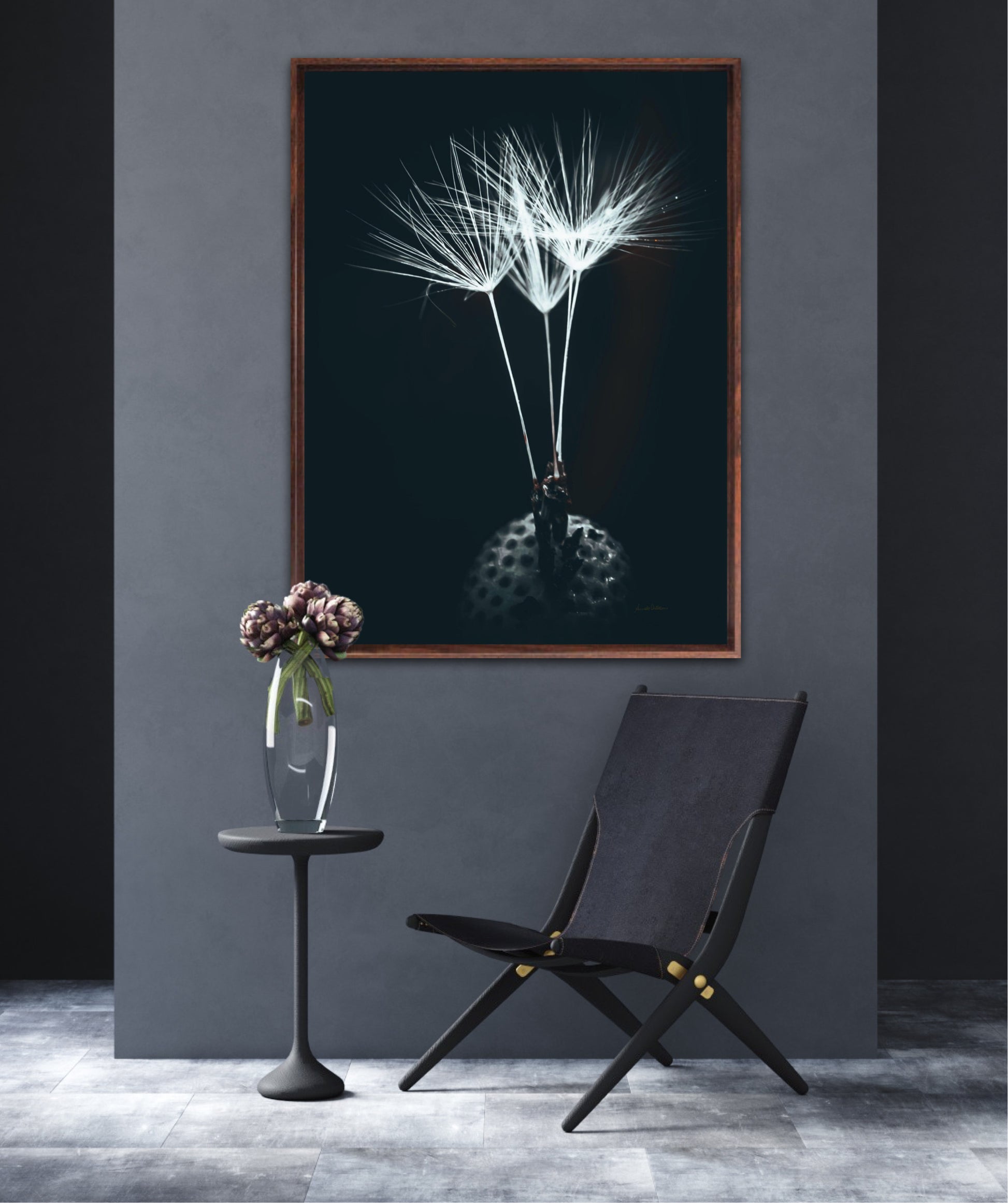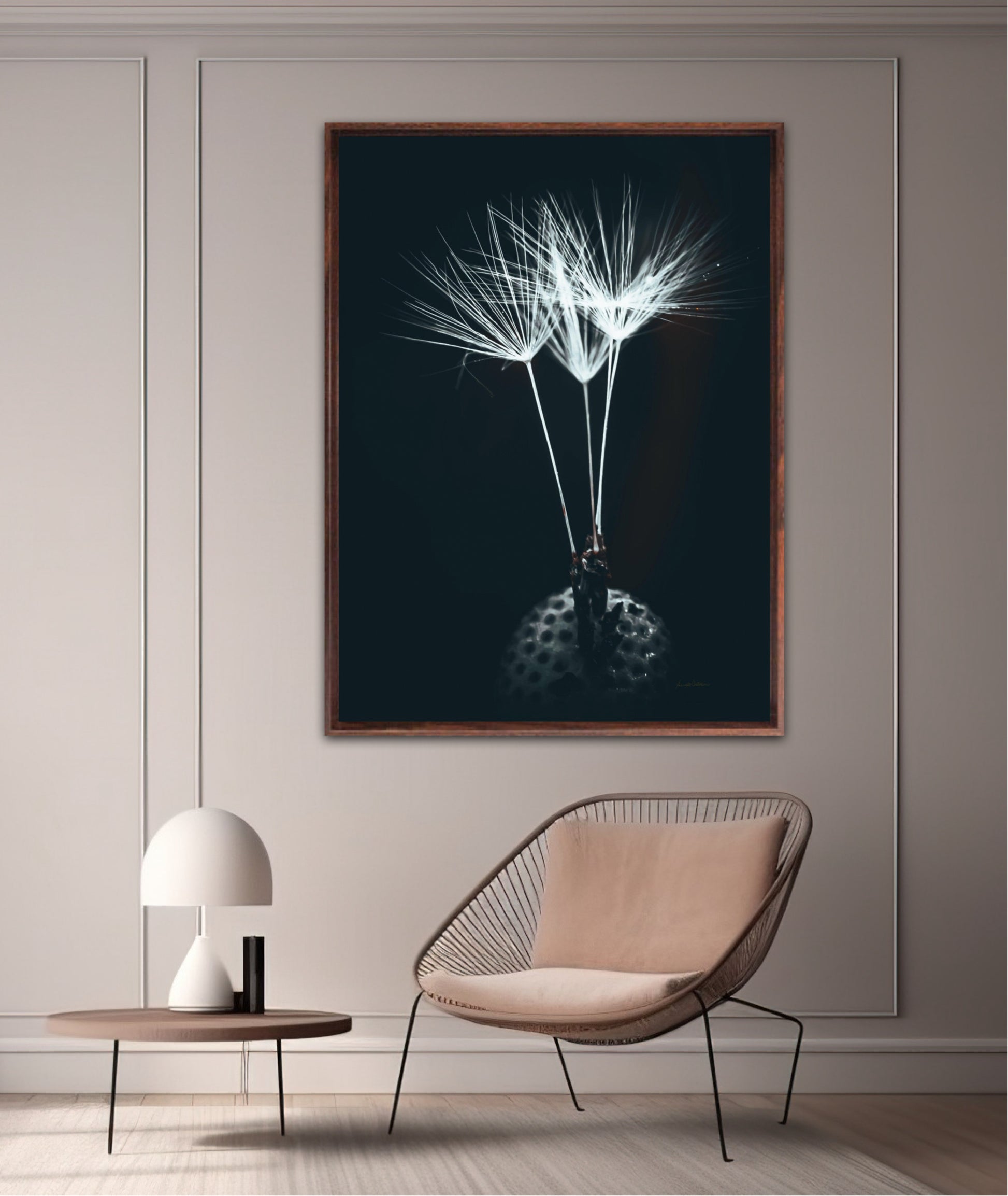 Beautiful and timeless photographic artwork of three dandelion seeds on a dark background. Get a unique and classic piece of art on your wall that stands year after year.