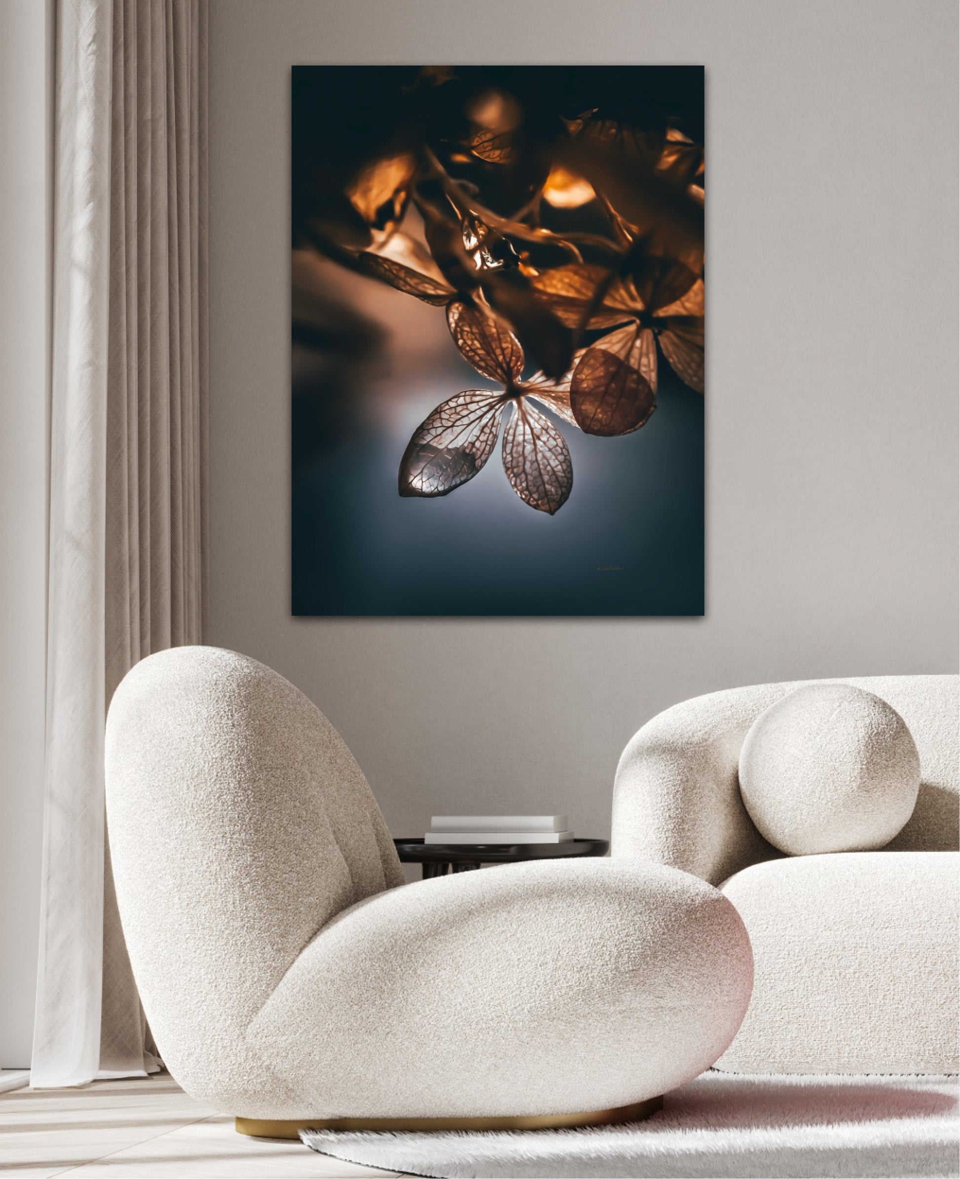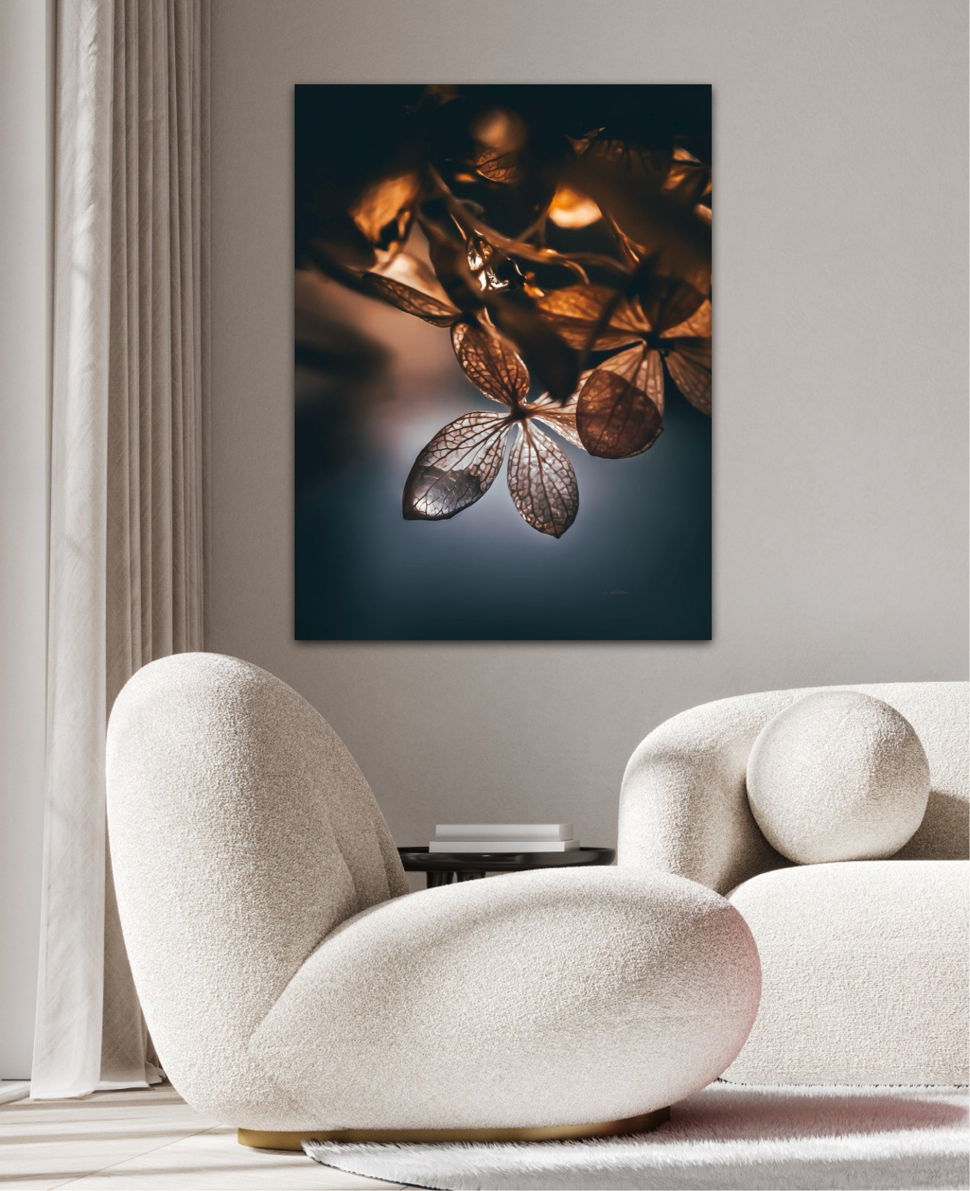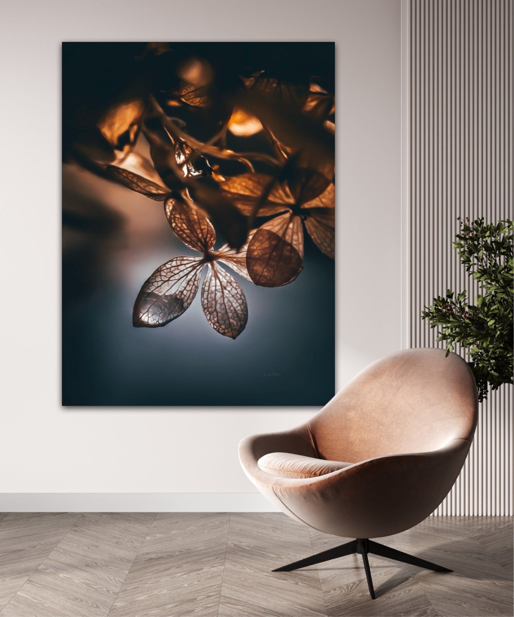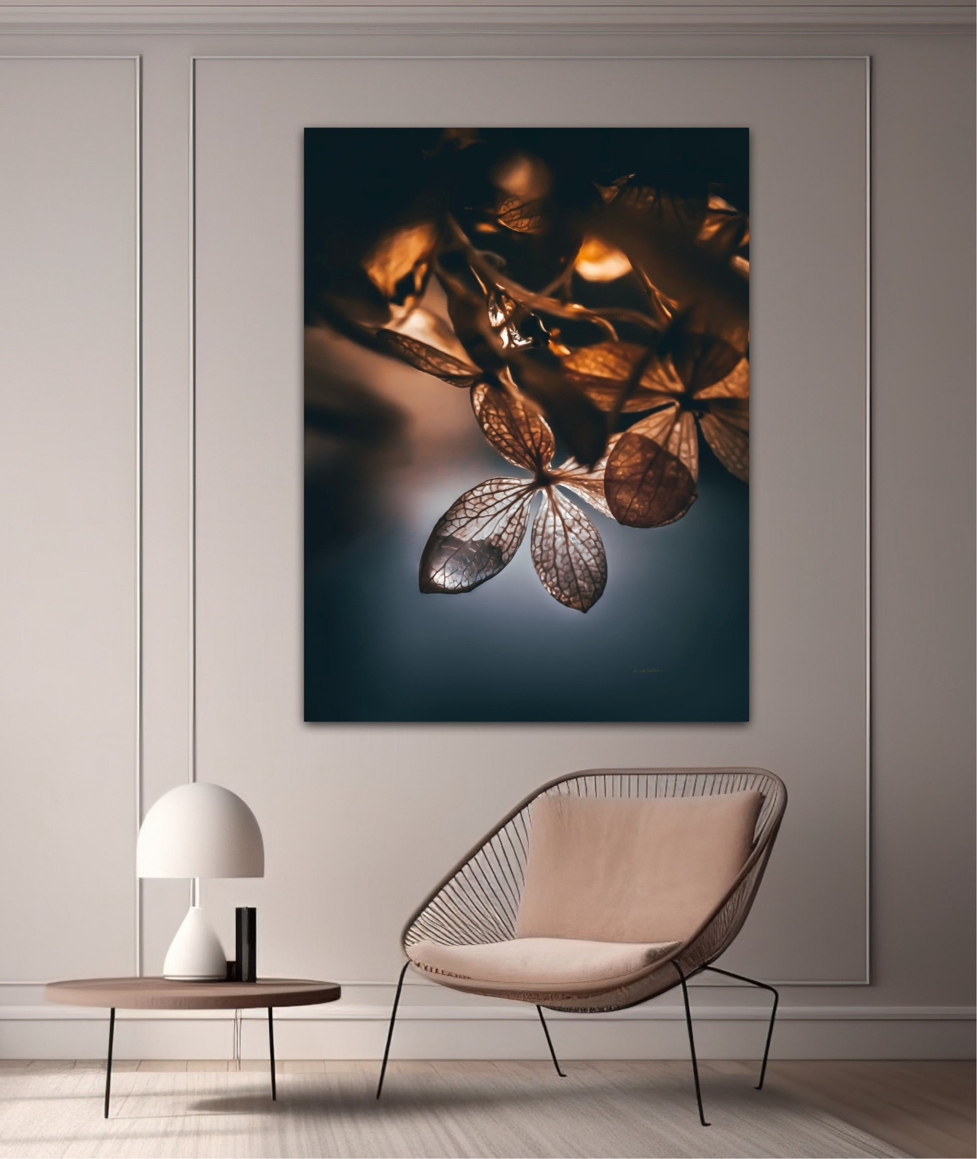 Beautiful photographic wall art of a lilac hydrangea leaf that has withered. Raindrops have collected in the leaf and give a warm expression. It is also impressive to see all the details in the blade up close. Get an original and beautiful piece of art on the wall with this photo.