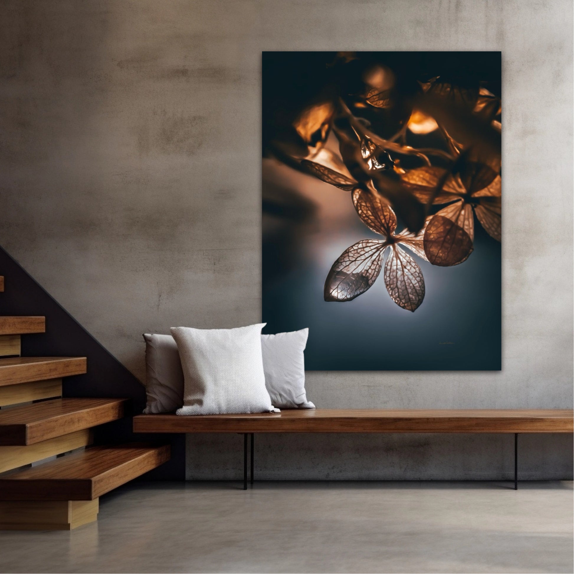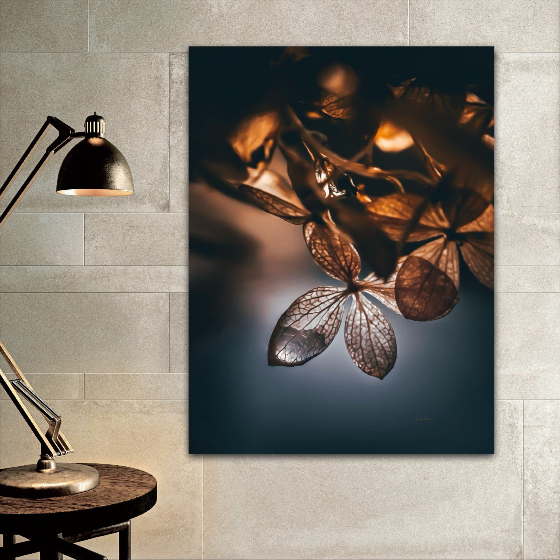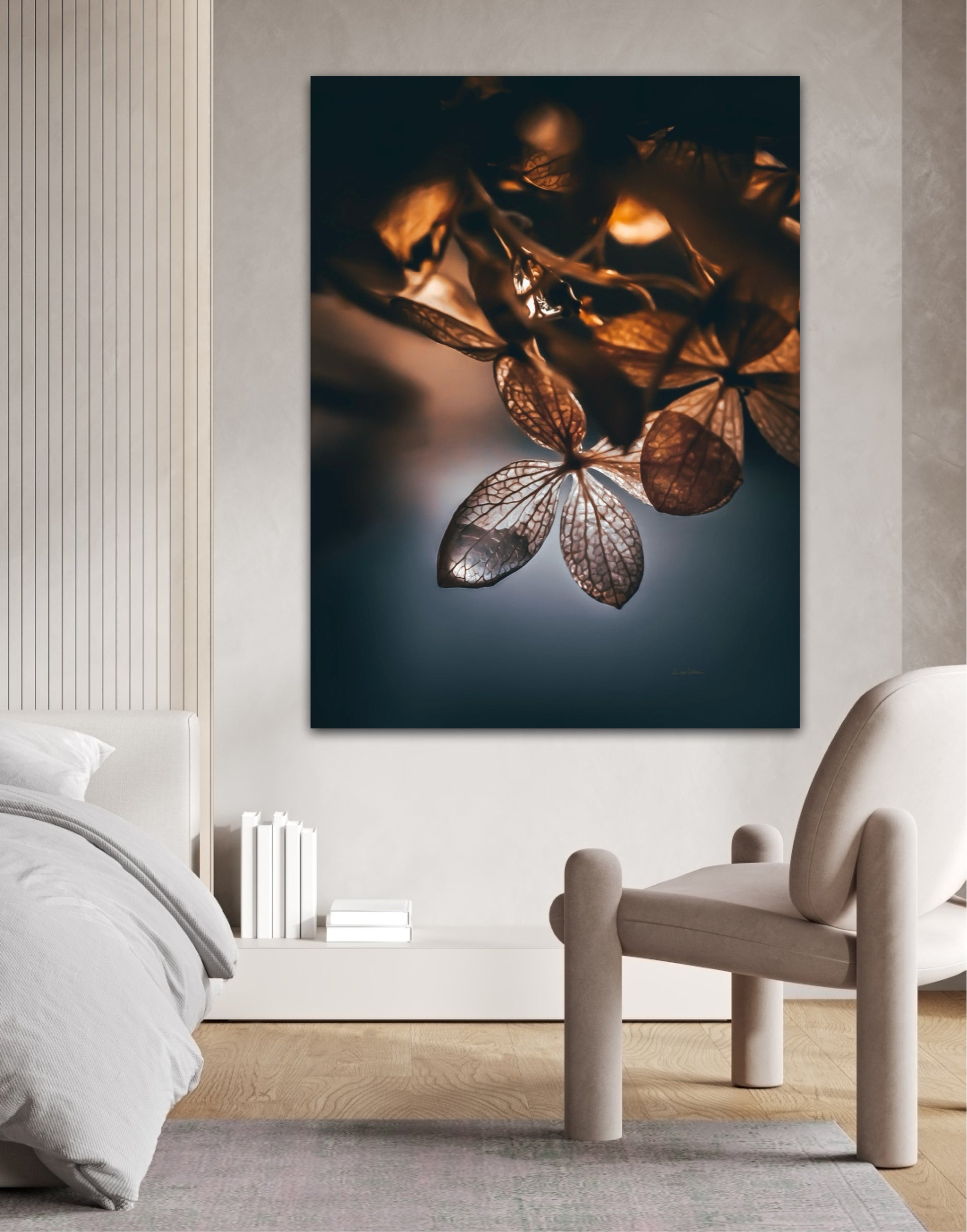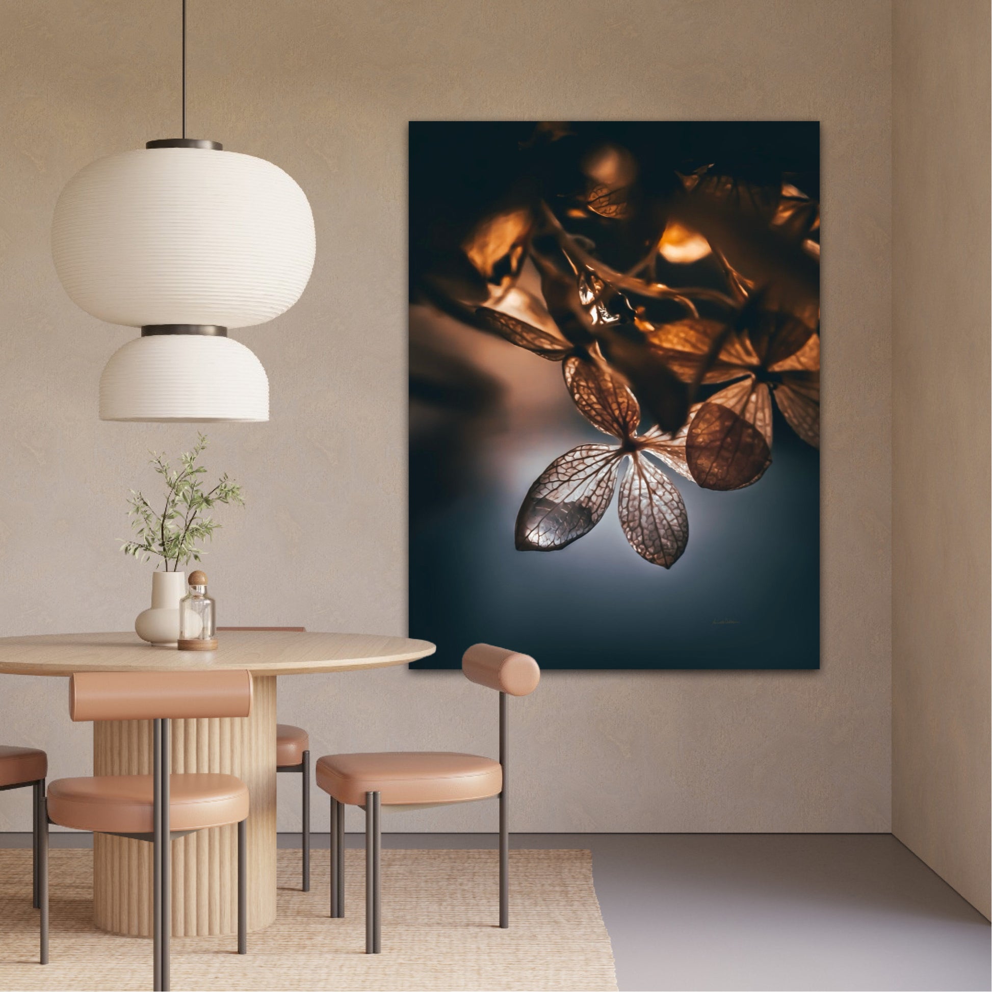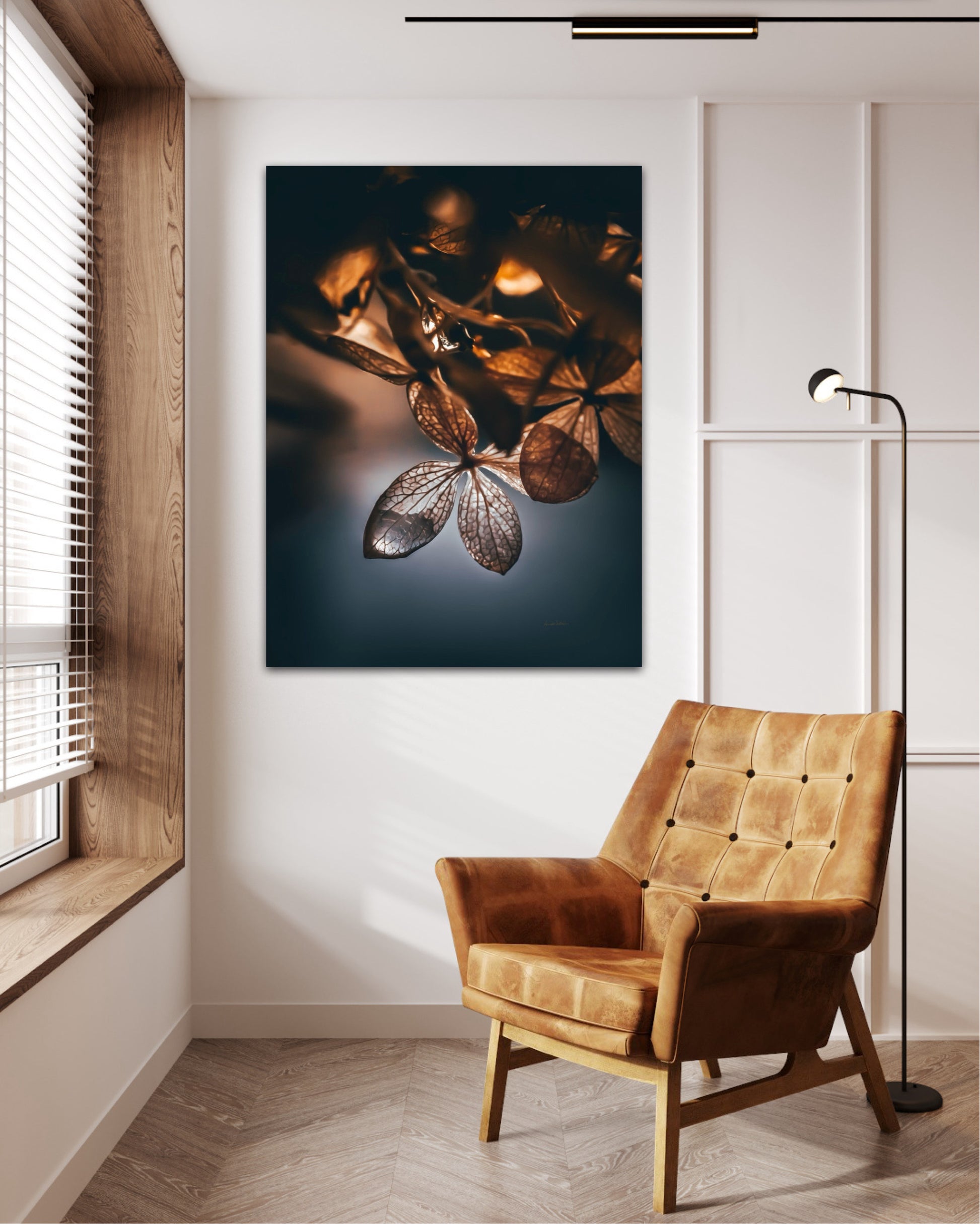 Beautiful photographic wall art of a lilac hydrangea leaf that has withered. Raindrops have collected in the leaf and give a warm expression. It is also impressive to see all the details in the blade up close. Get an original and beautiful piece of art on the wall with this photo.