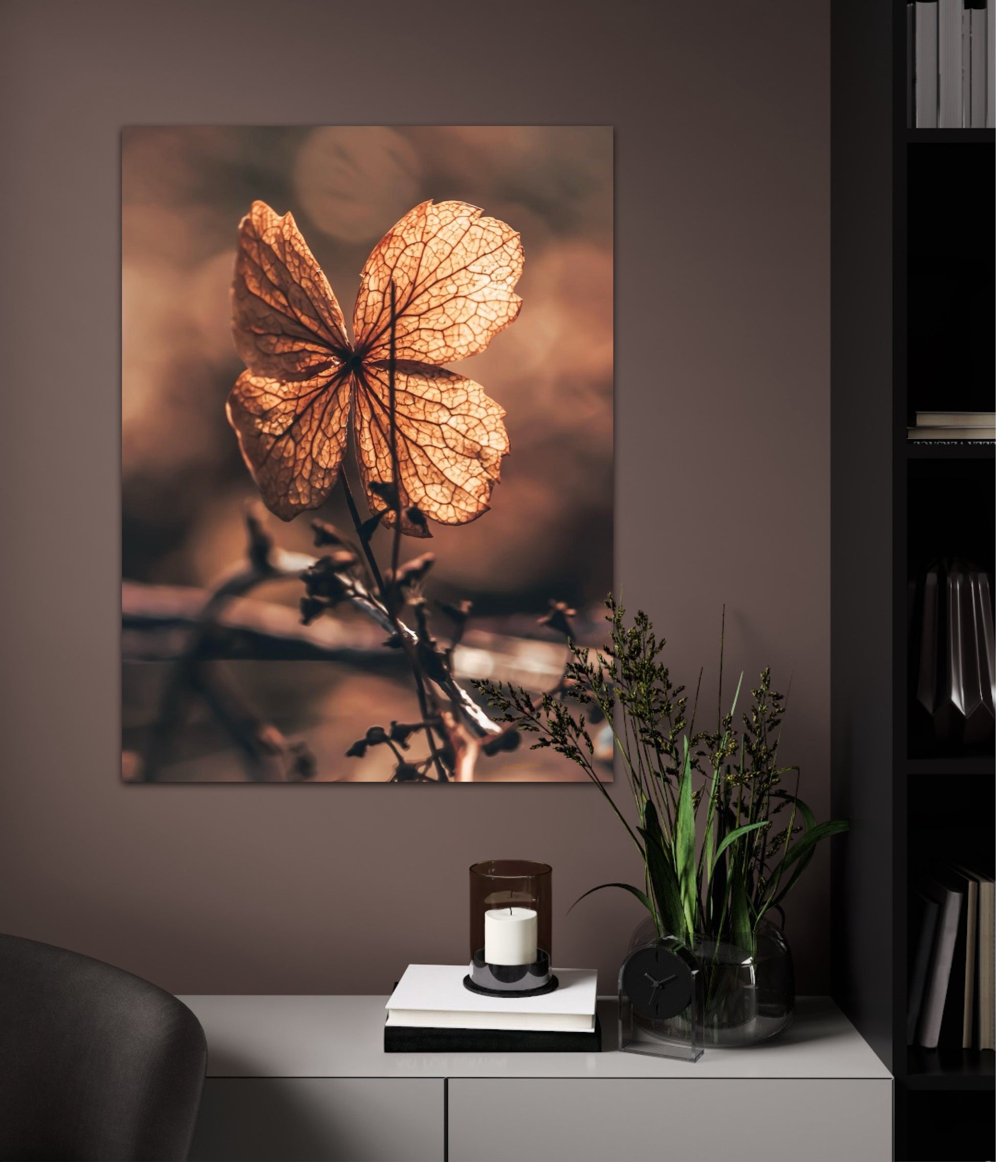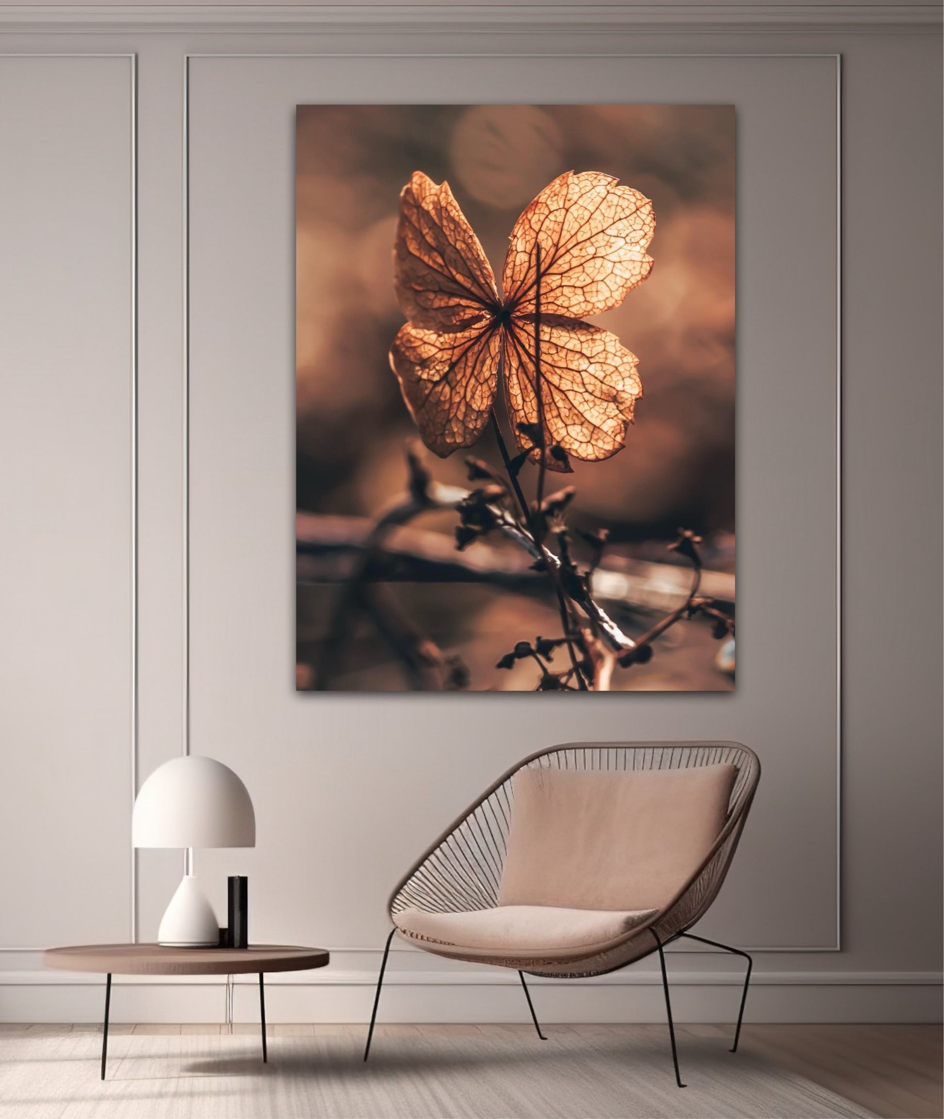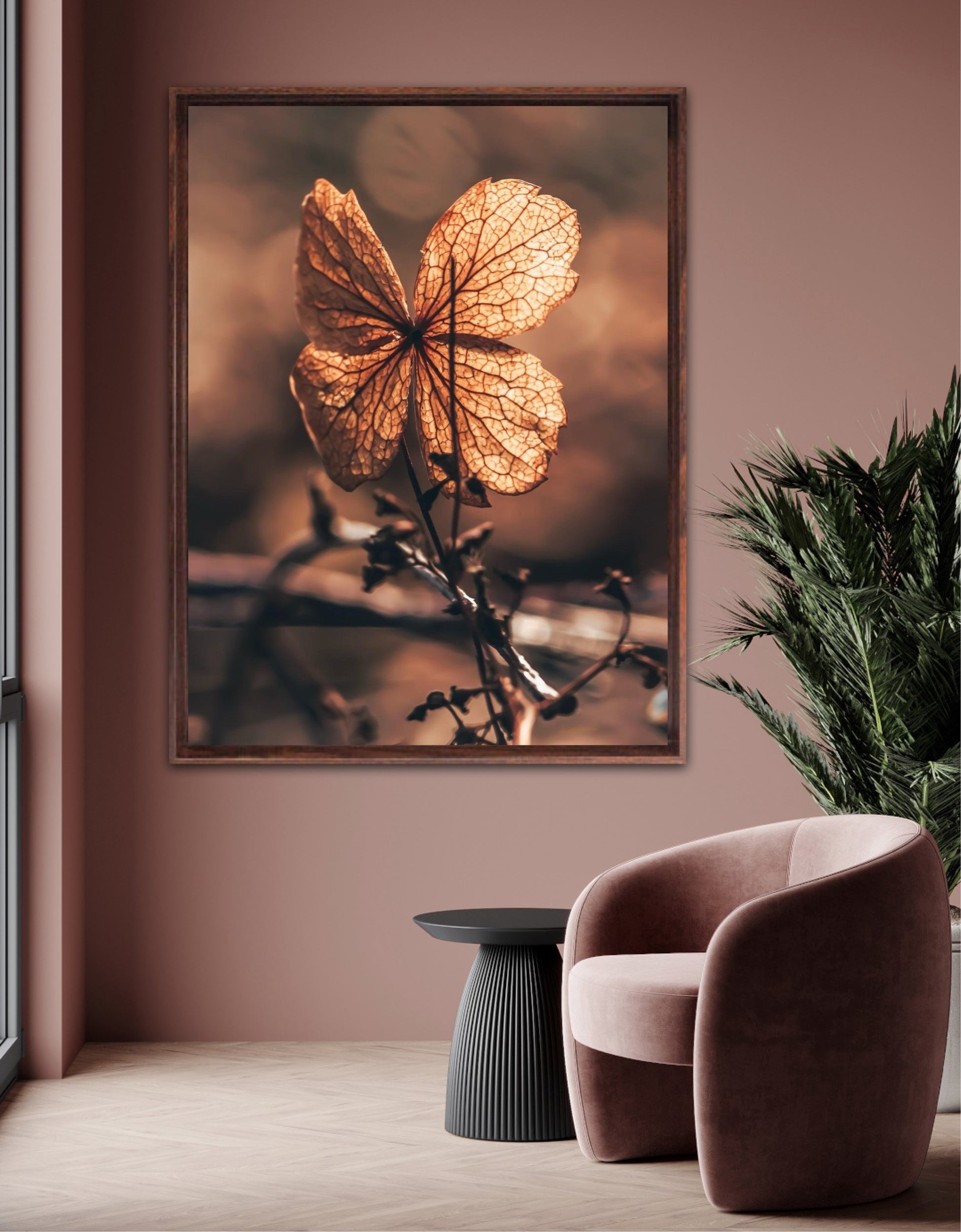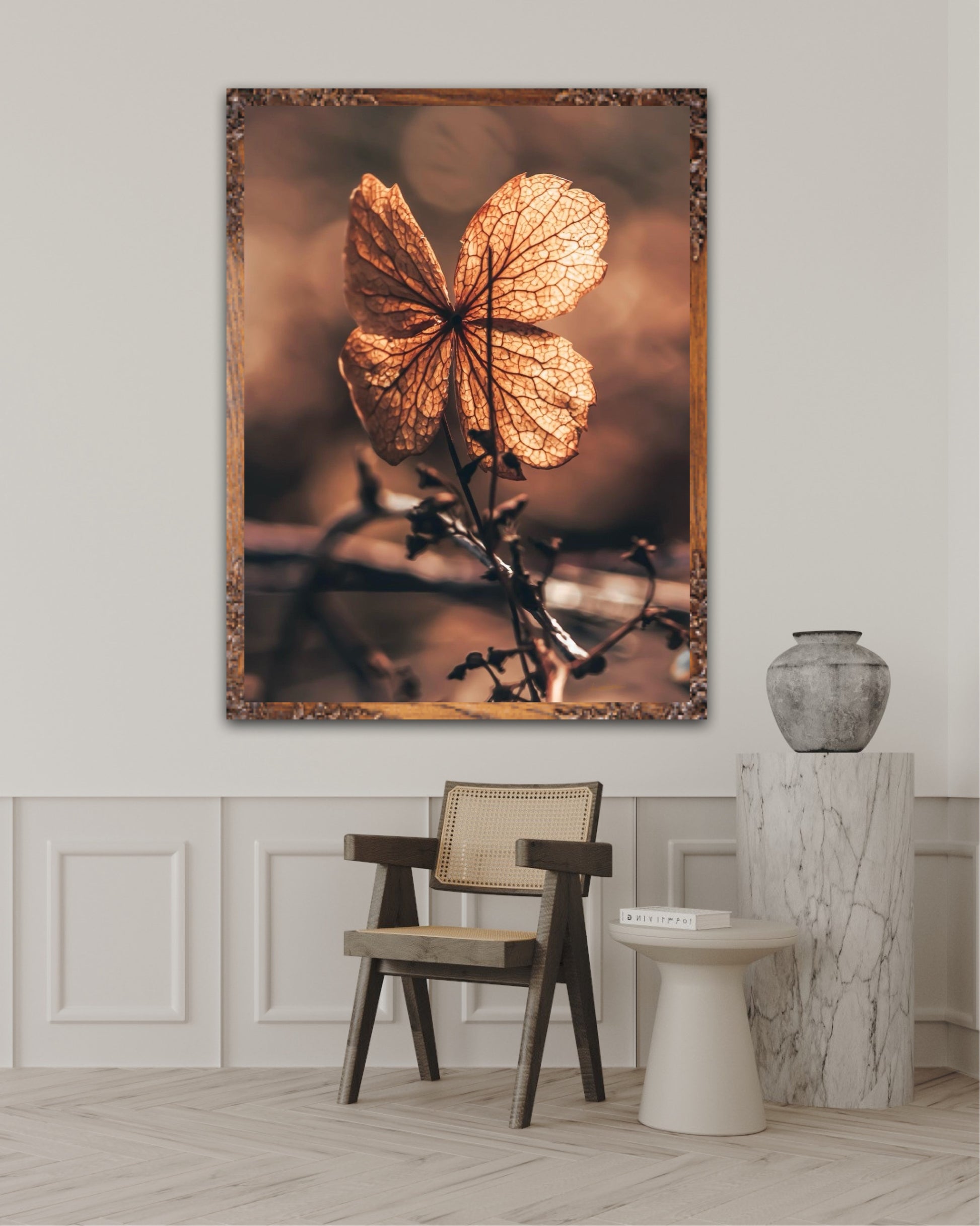 Beautiful photographic wall art of a dried Hydrangea leaf in a wonderful and strong posture, in warm golden light. This artwork will make you feel grounded and at peace.