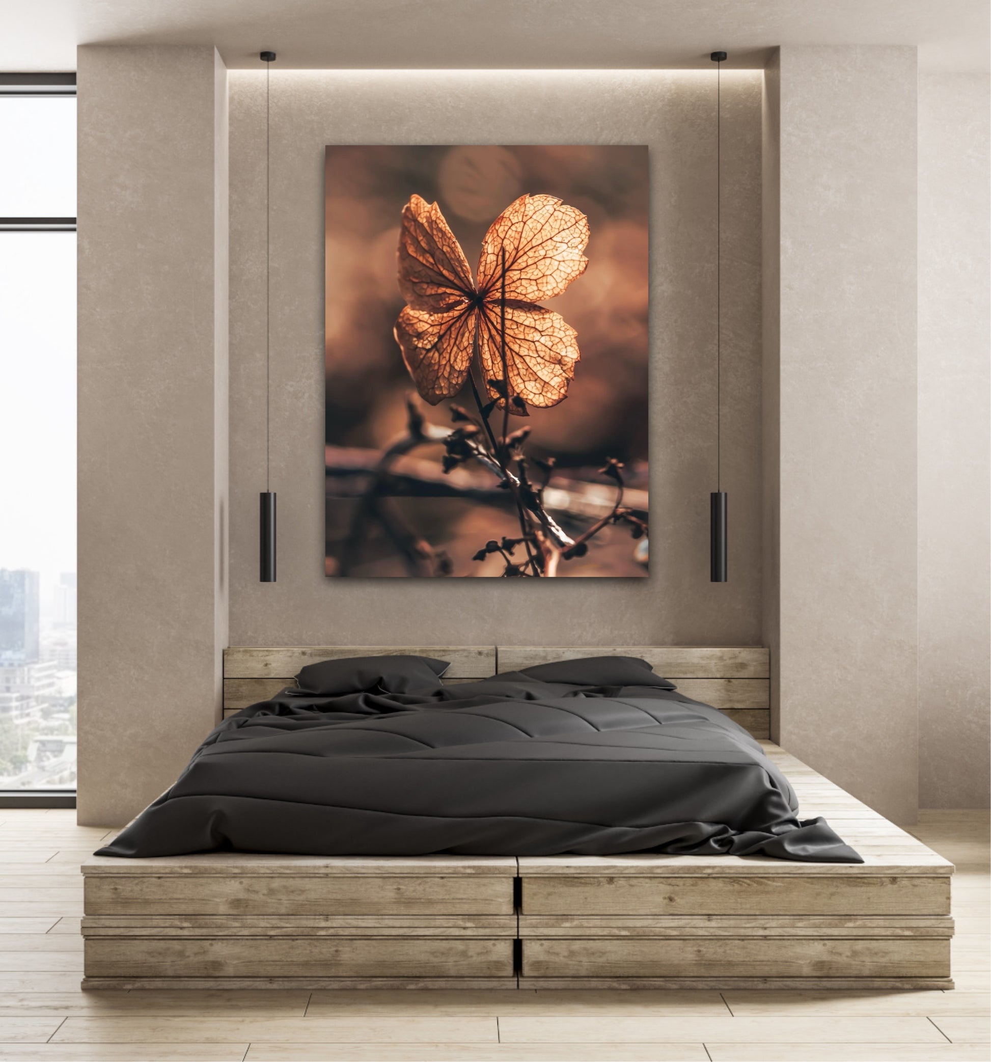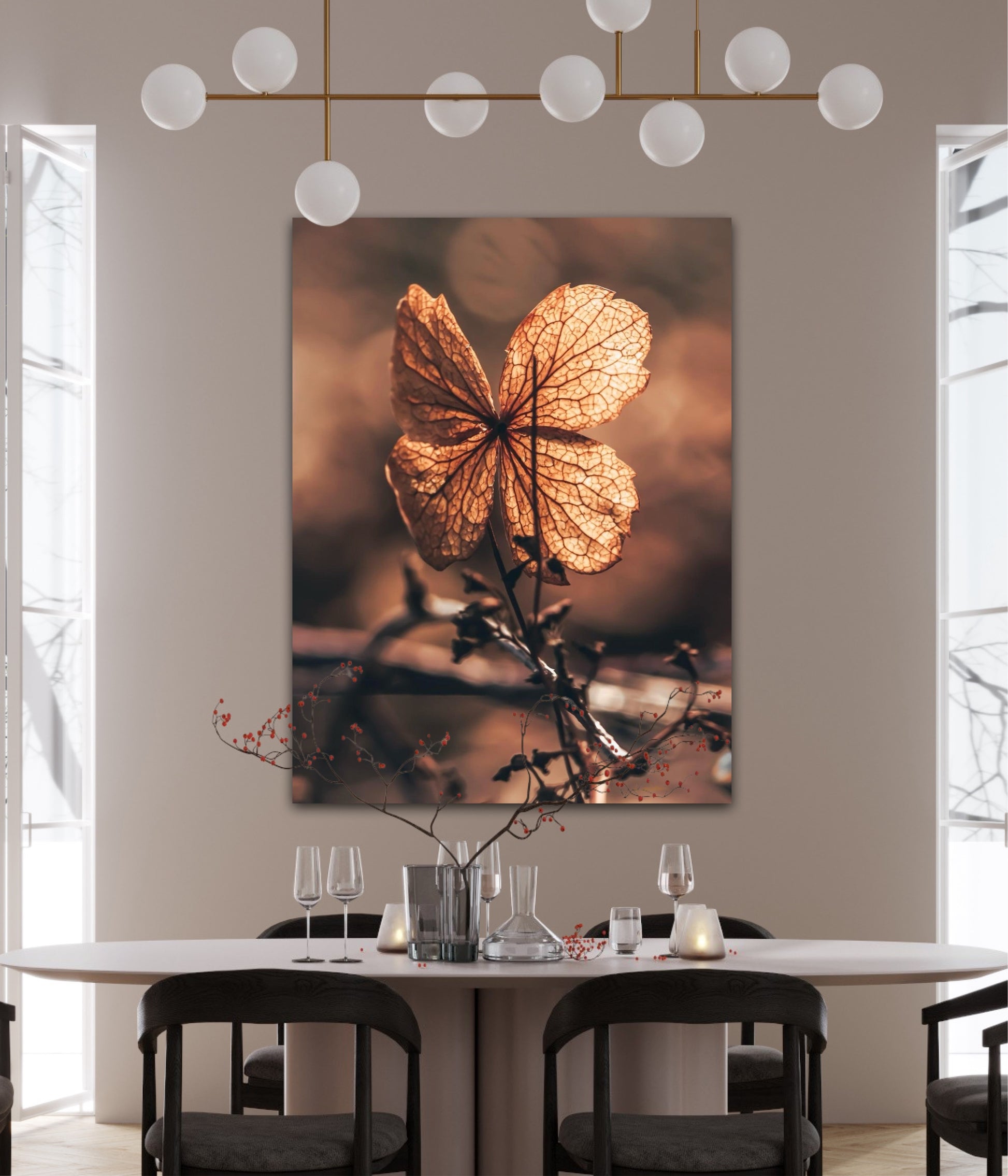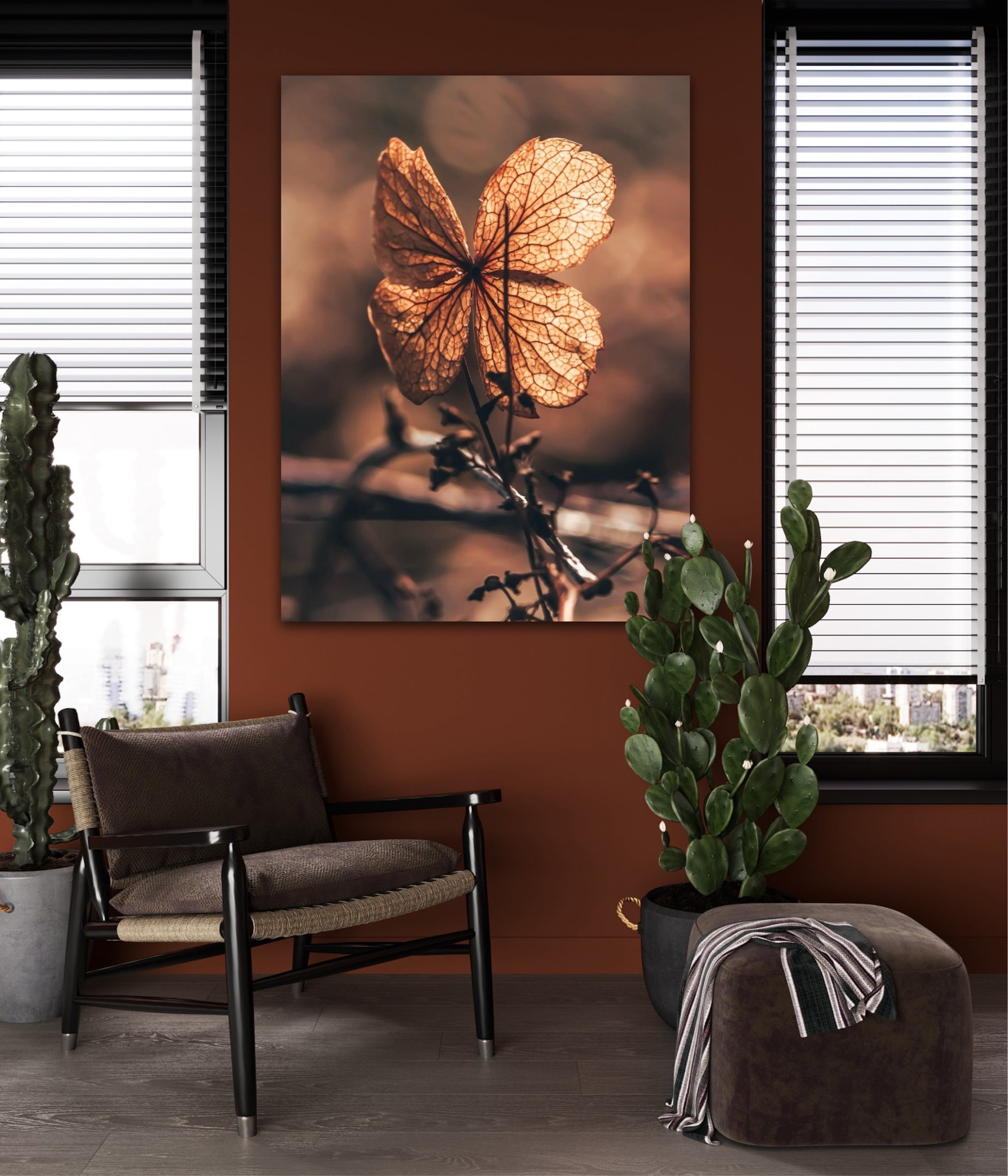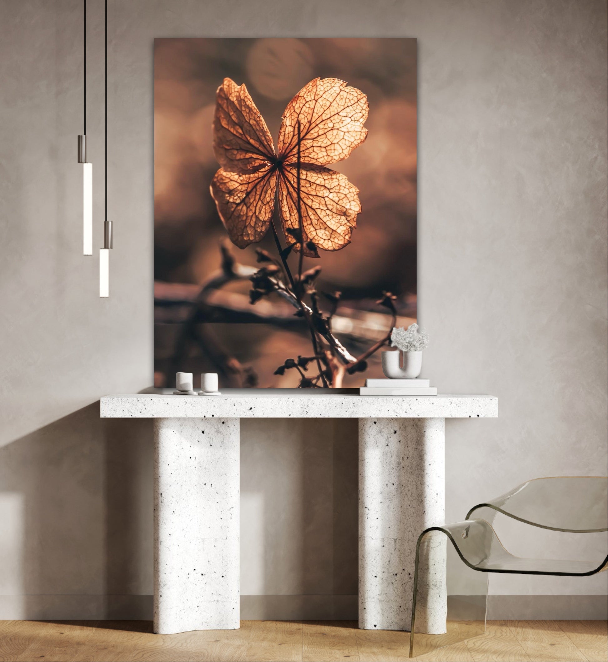 Beautiful photographic wall art of a dried Hydrangea leaf in a wonderful and strong posture, in warm golden light. This artwork will make you feel grounded and at peace.