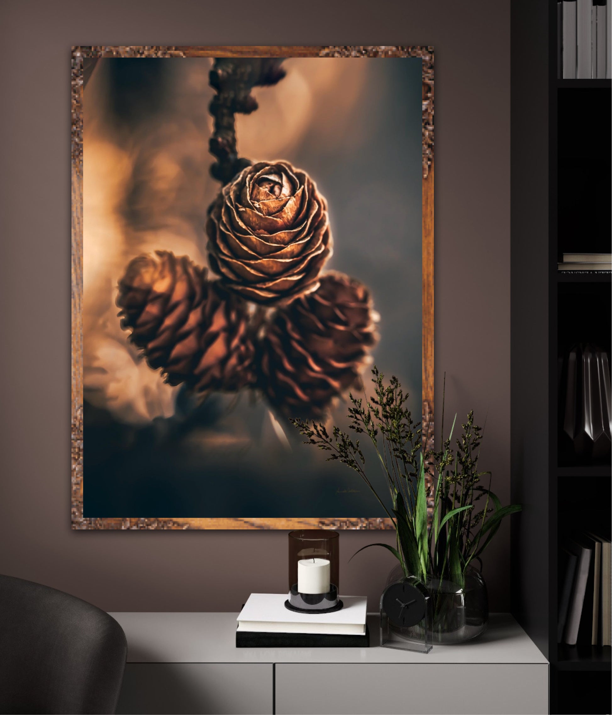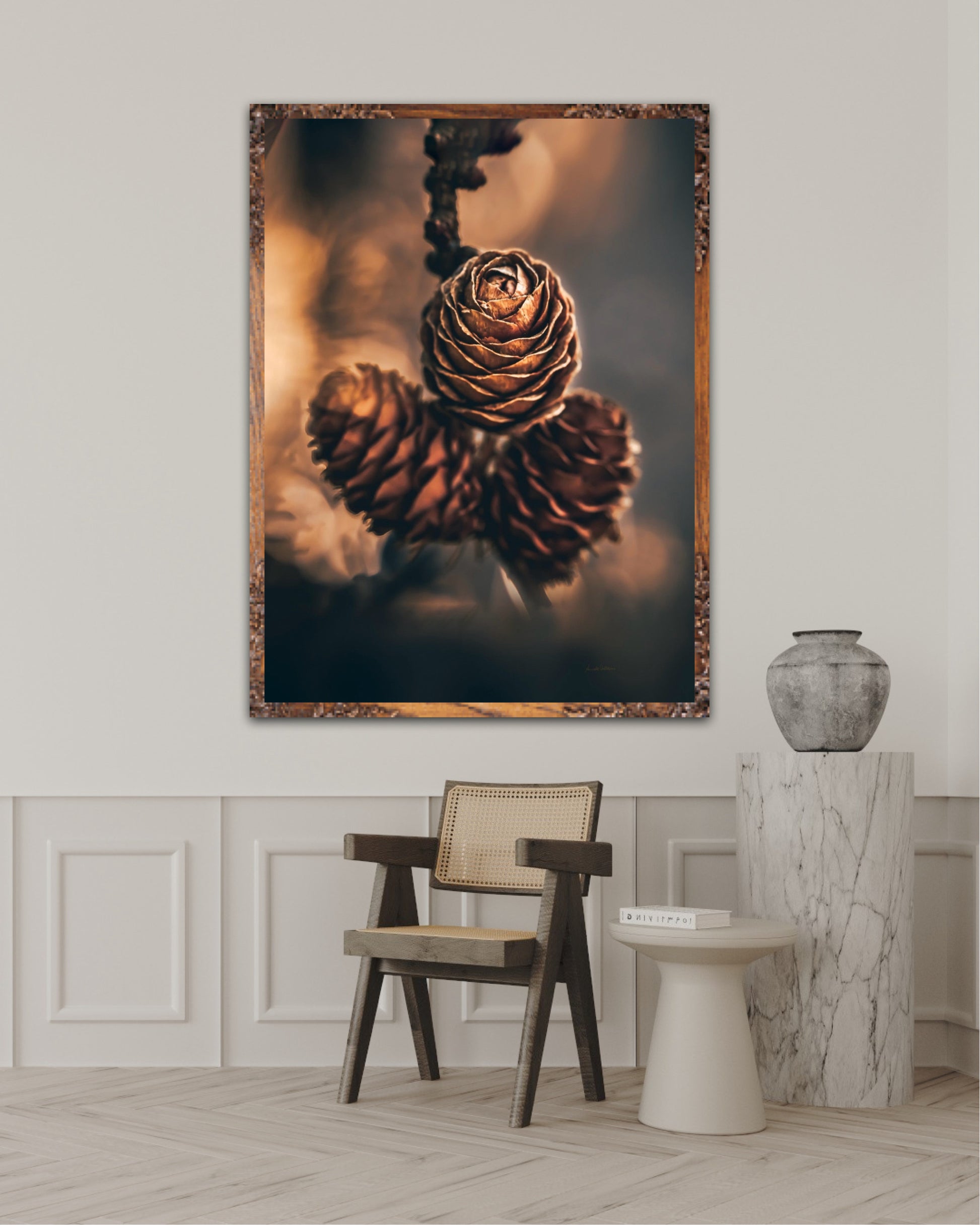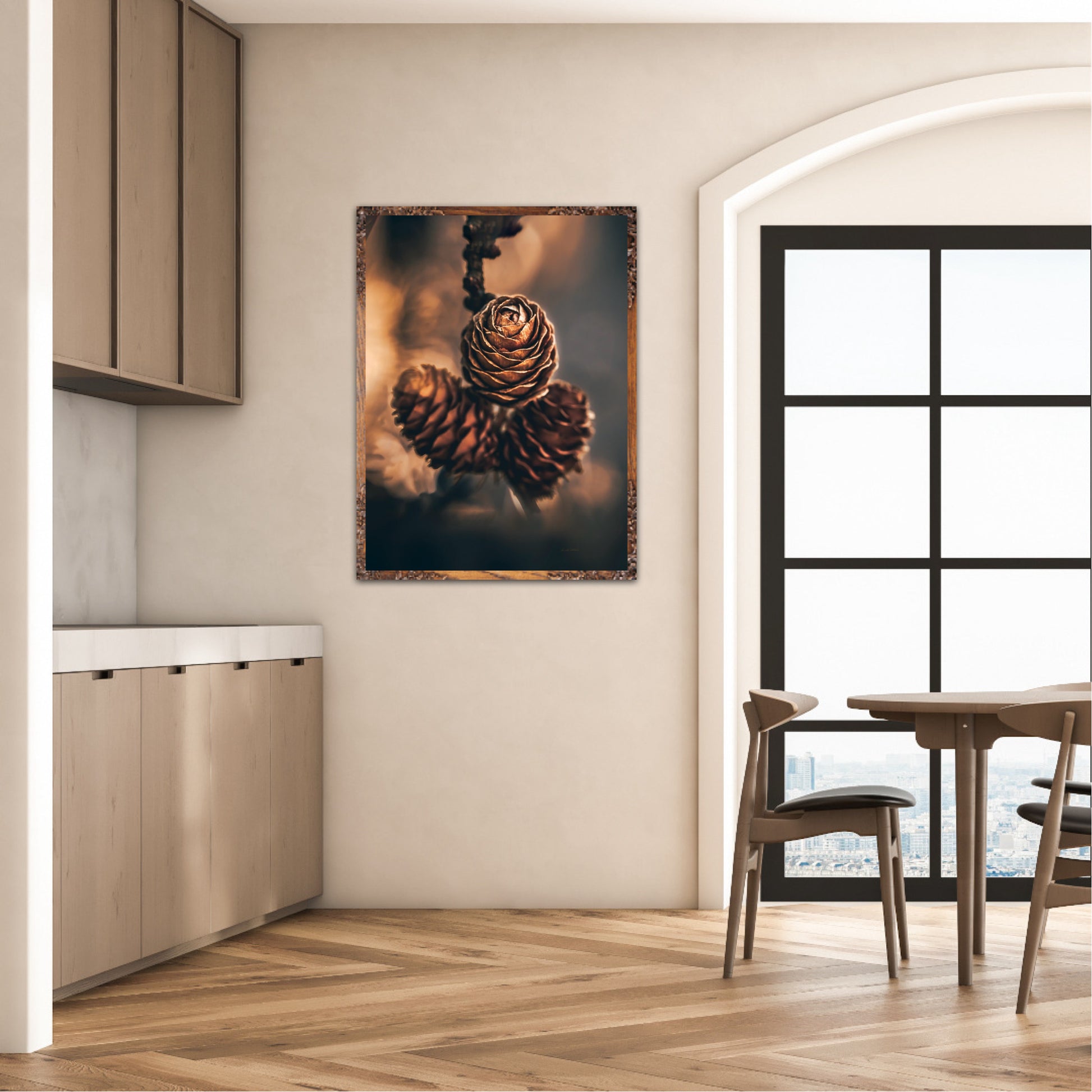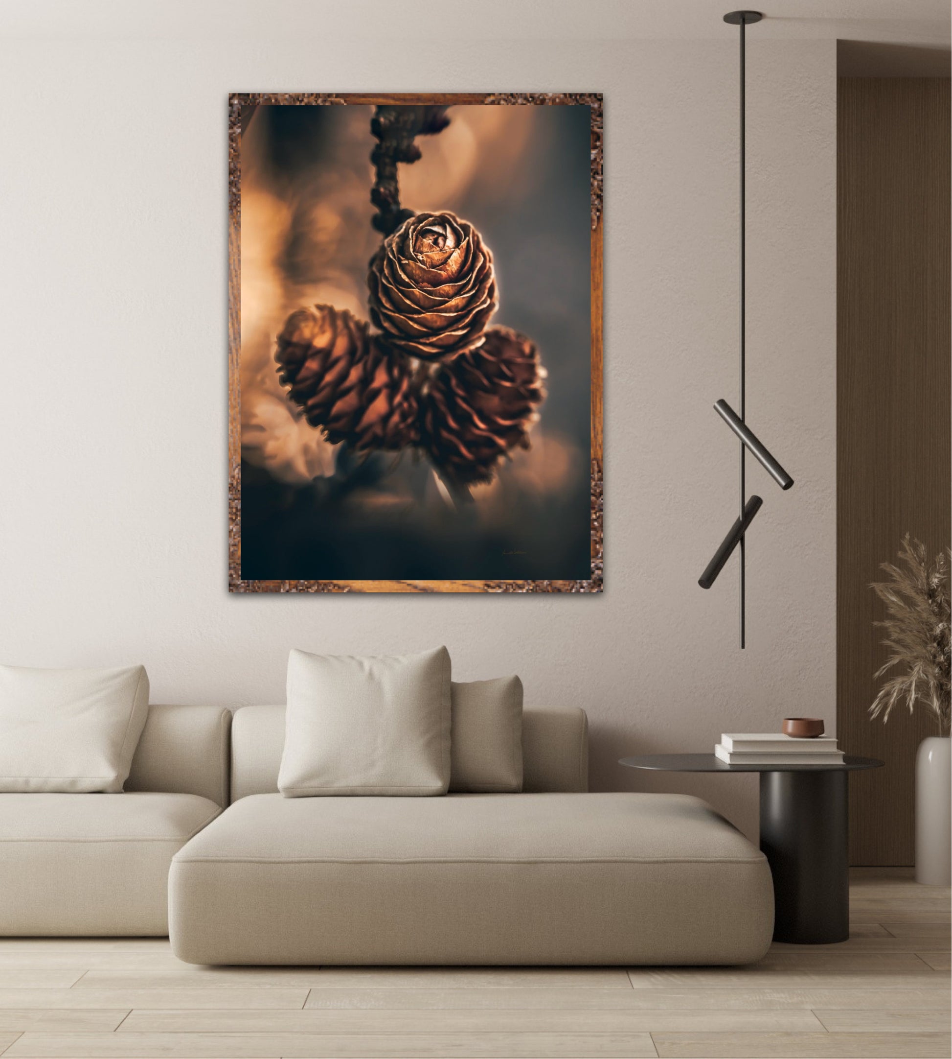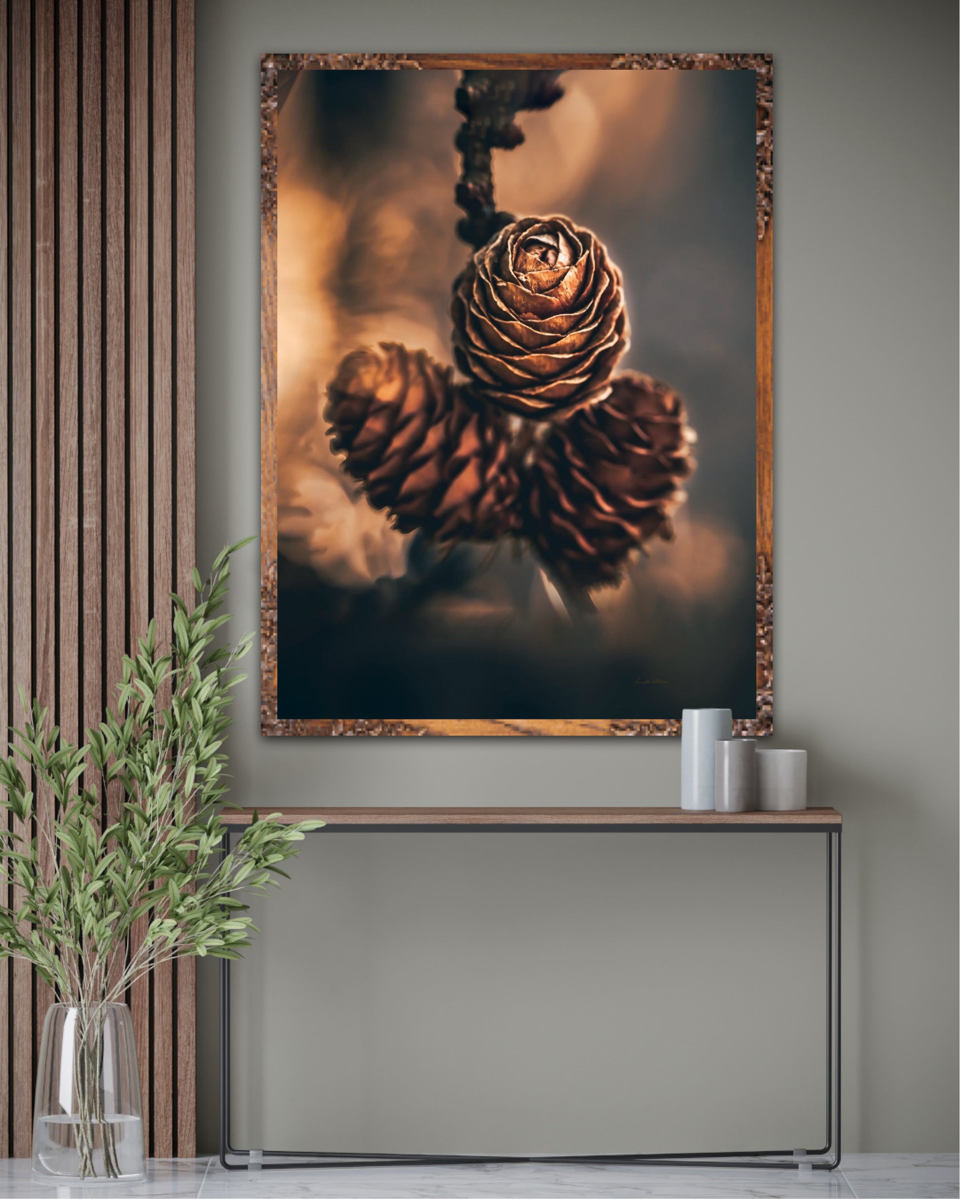 Beautiful photographic wall art of three pine cones that shine so beautifully in golden light. The colours are beautiful earth tones and are very pleasant to look at. This wall art will be a great decoration on your wall. It gives you peace from nature, and will impress friends and family. Get a beautiful piece of art on the wall. The wall art fits particularly well in the cabin.