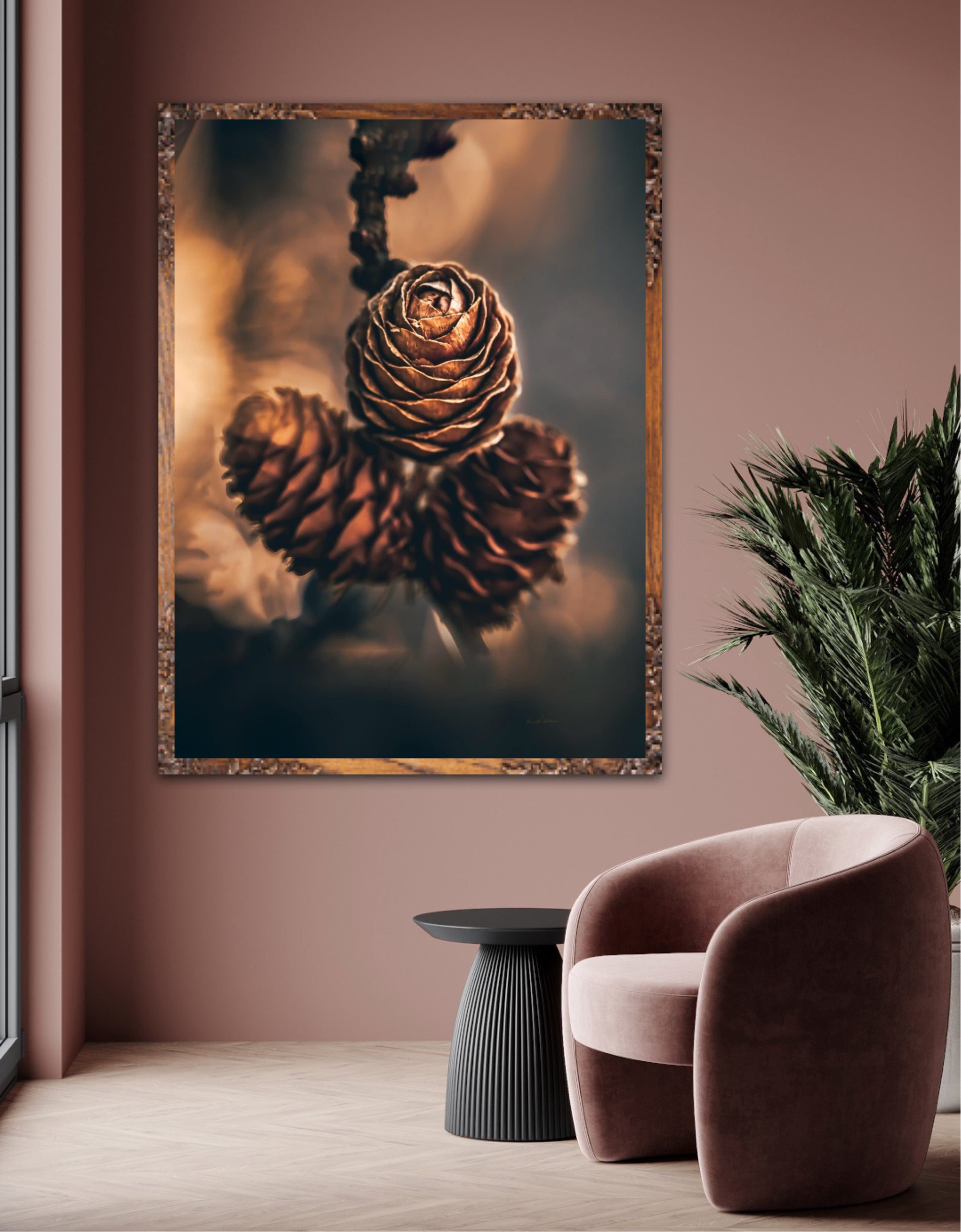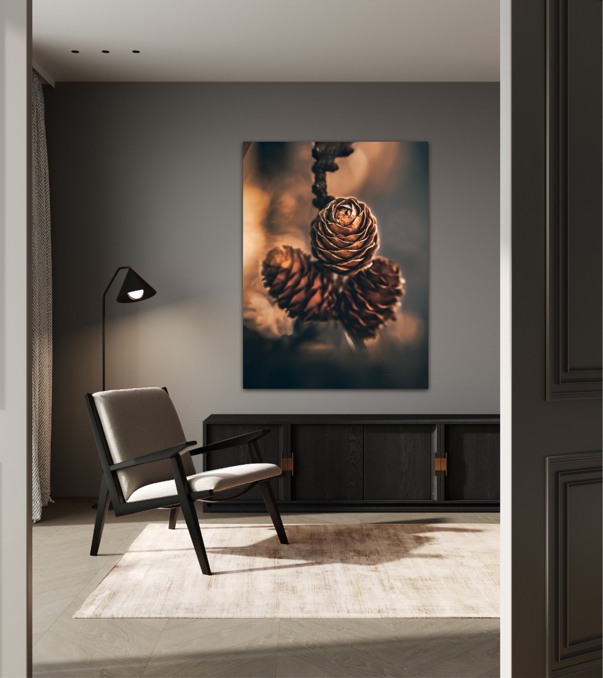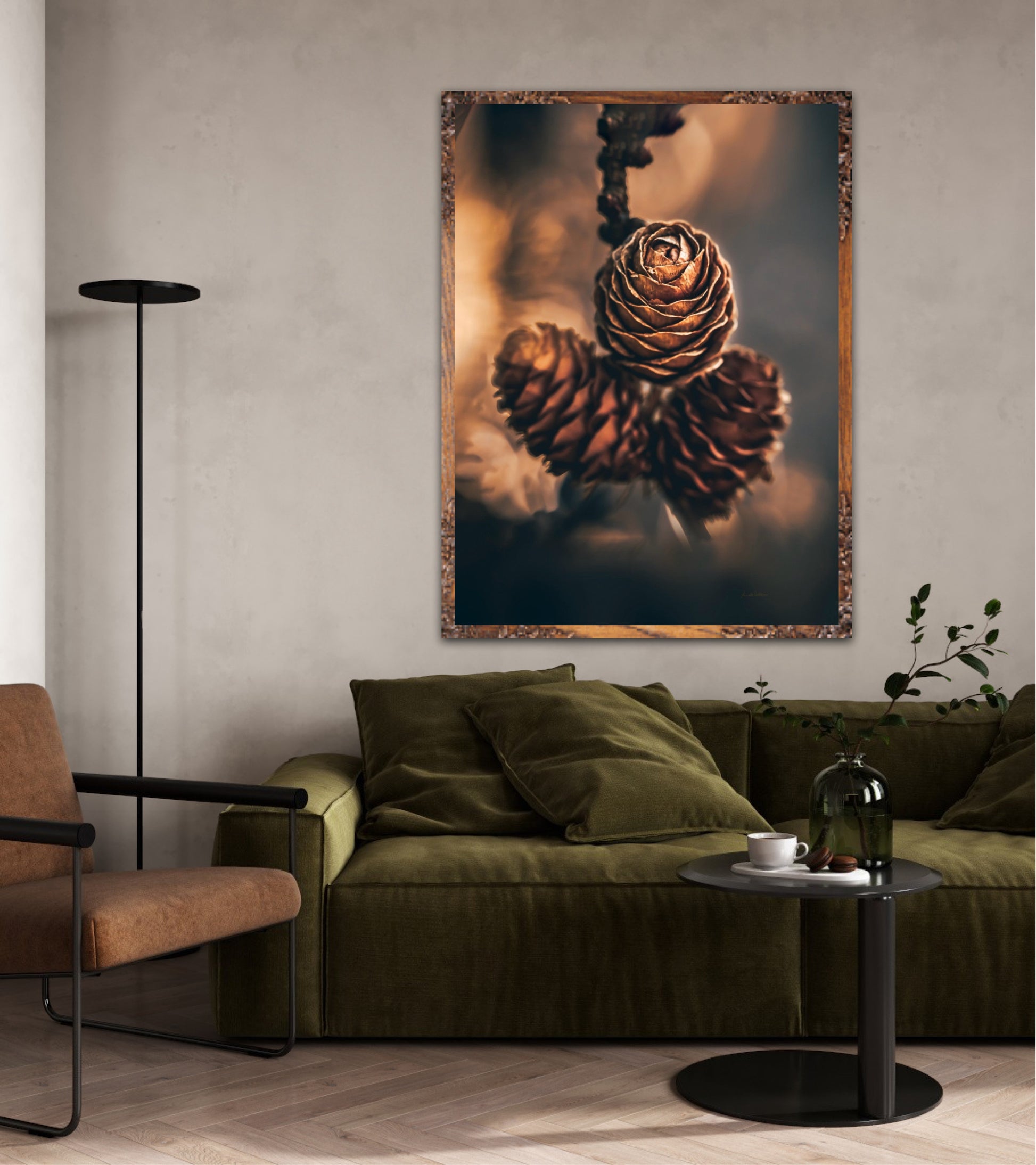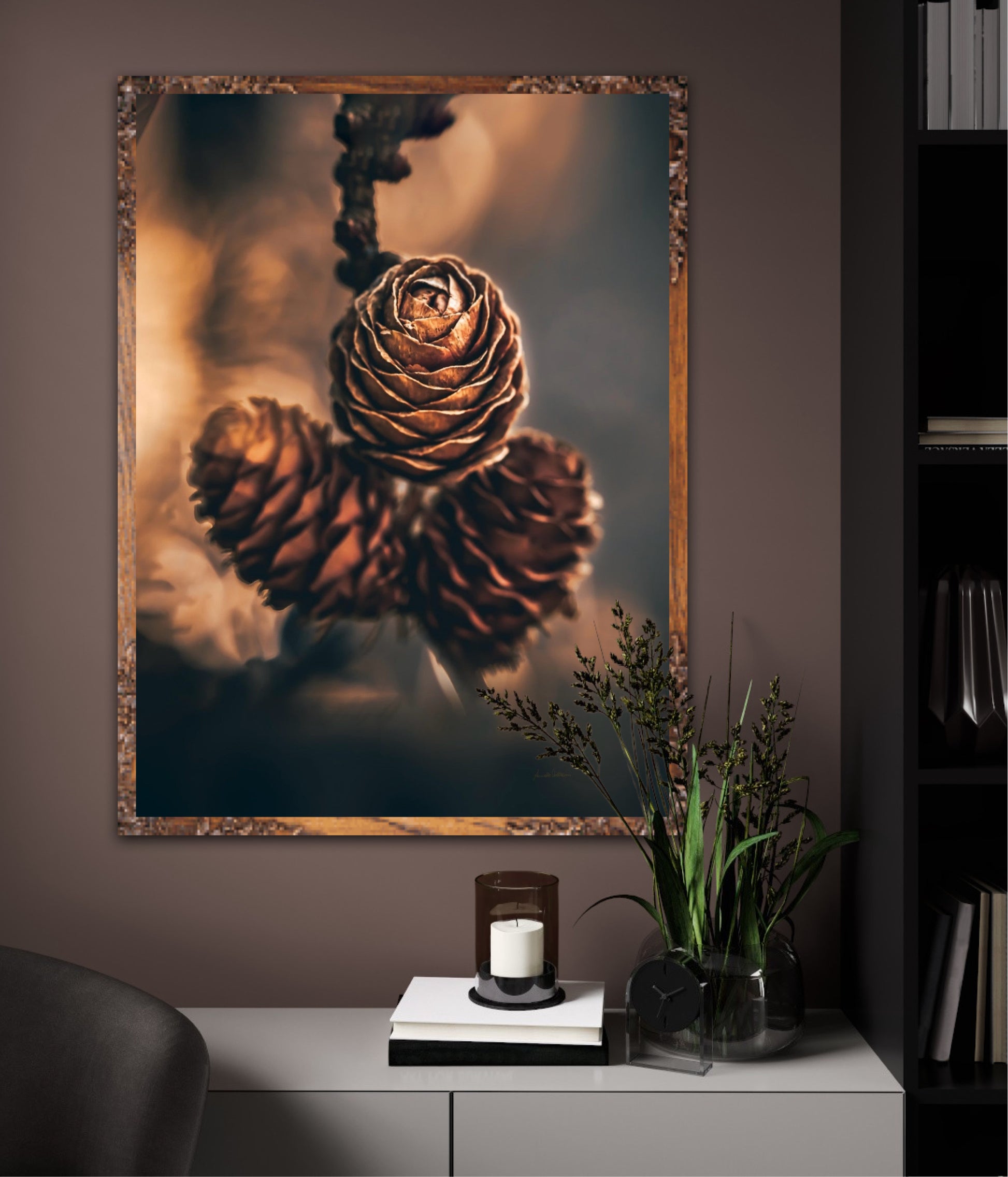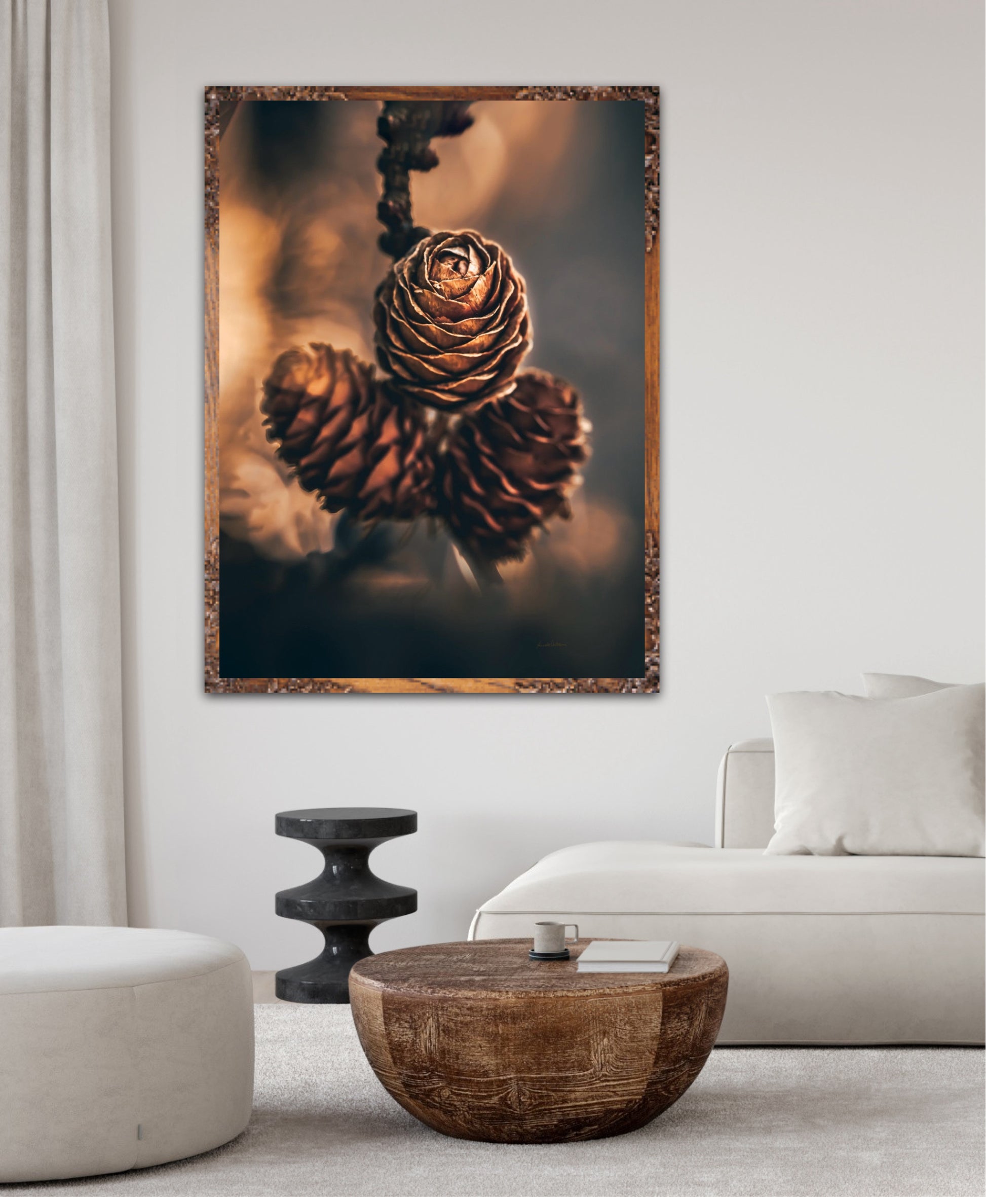 Beautiful photographic wall art of three pine cones that shine so beautifully in golden light. The colours are beautiful earth tones and are very pleasant to look at. This wall art will be a great decoration on your wall. It gives you peace from nature, and will impress friends and family. Get a beautiful piece of art on the wall. The wall art fits particularly well in the cabin.