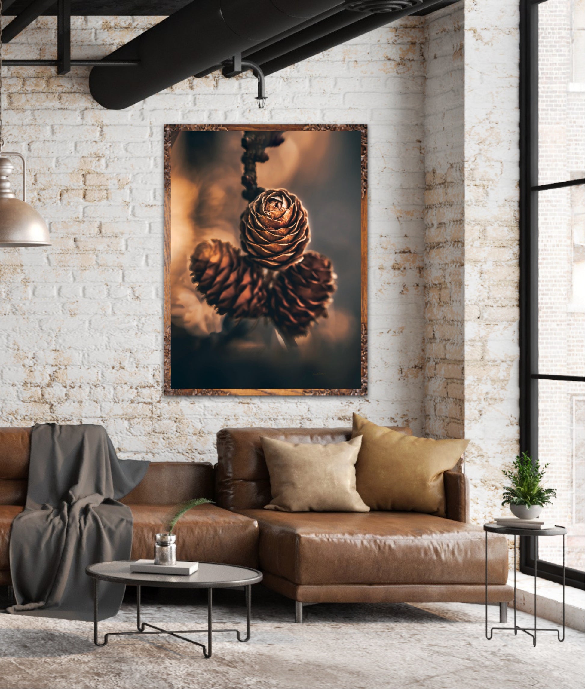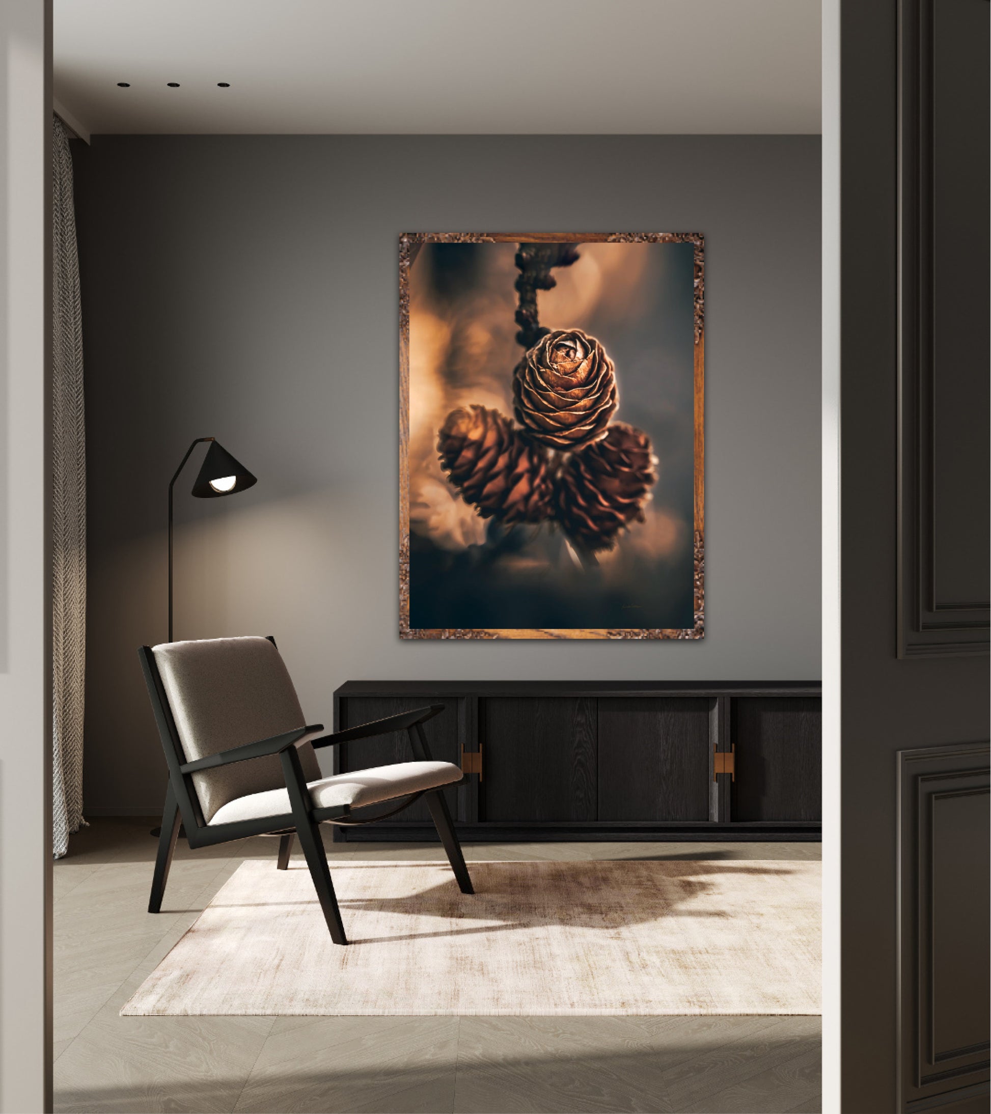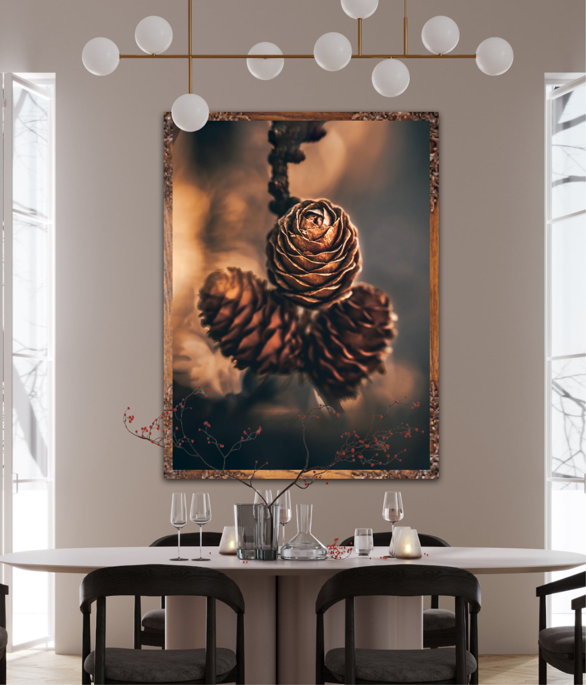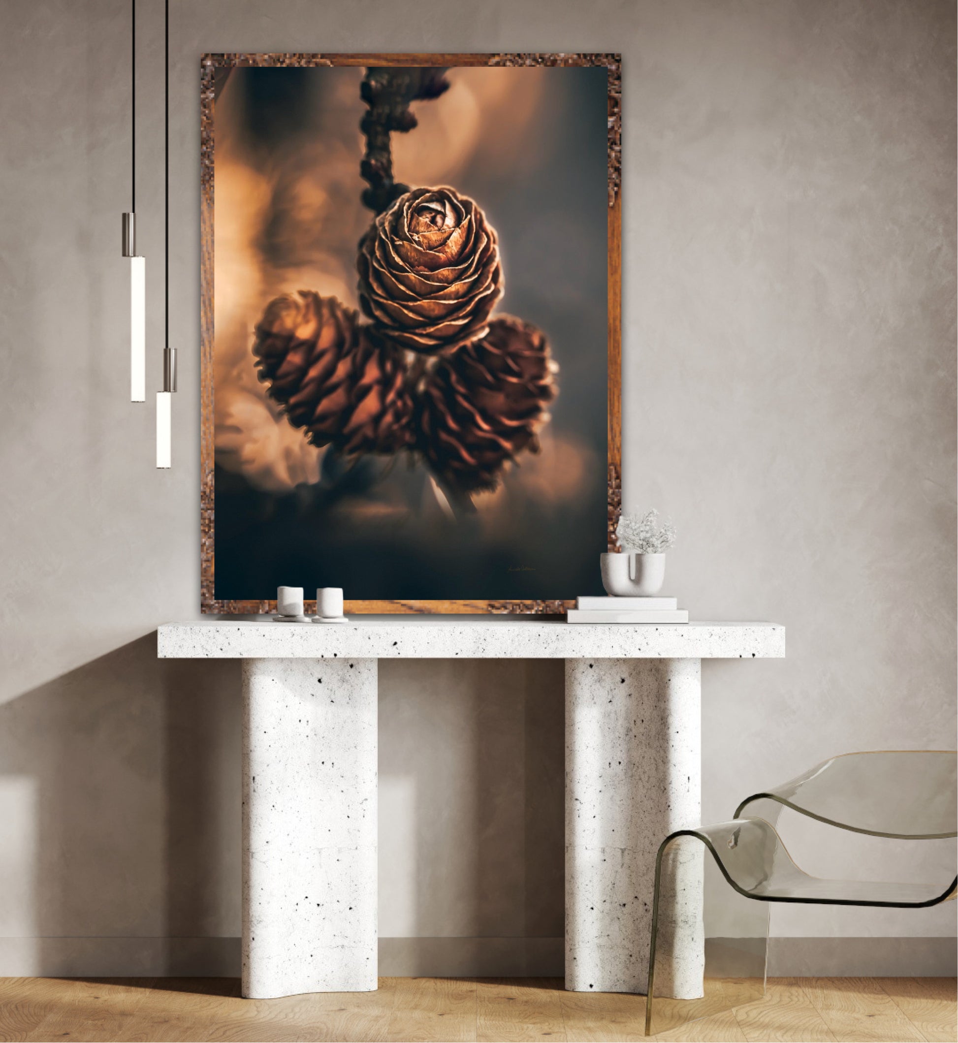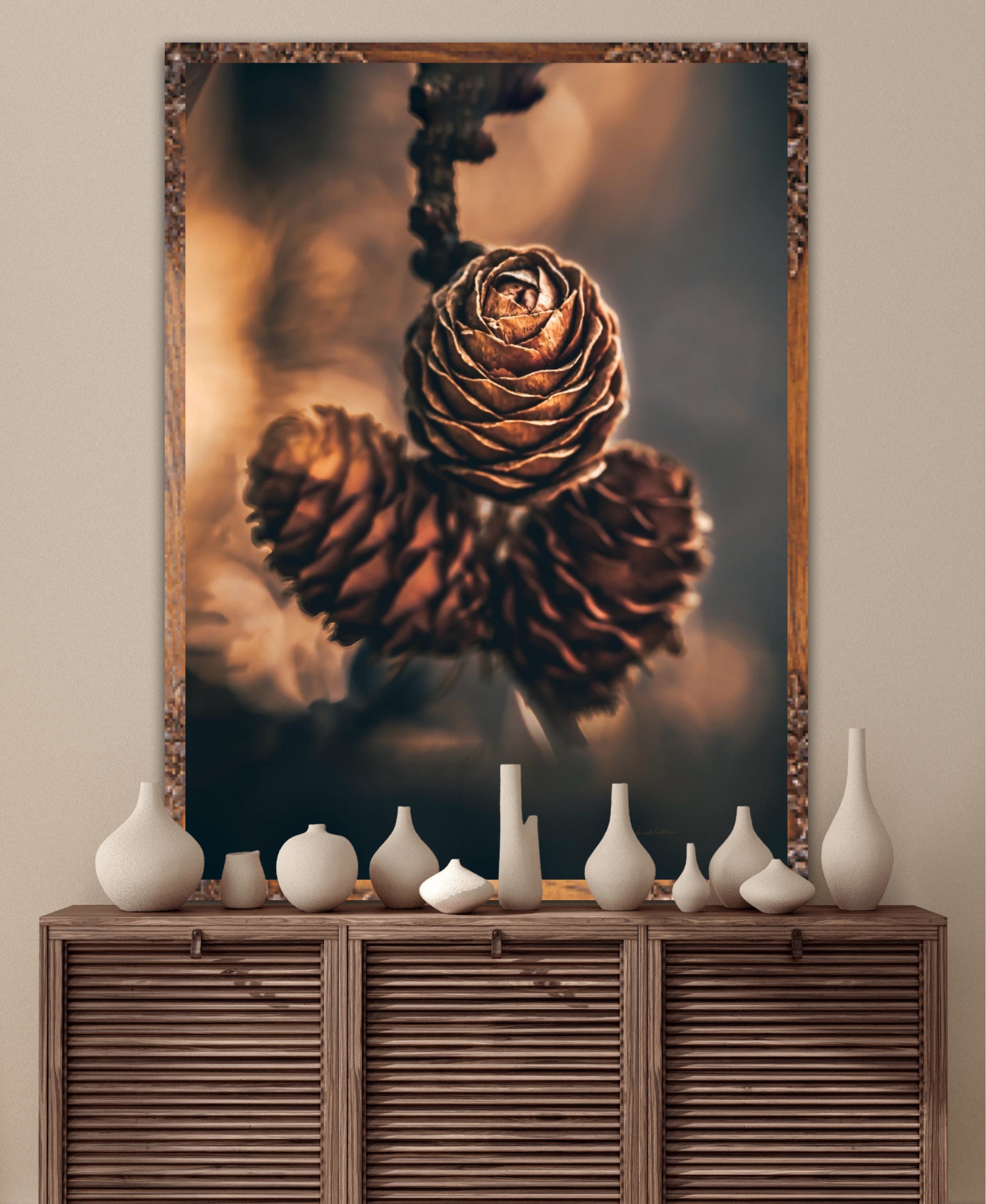 Beautiful photographic wall art of three pine cones that shine so beautifully in golden light. The colours are beautiful earth tones and are very pleasant to look at. This wall art will be a great decoration on your wall. It gives you peace from nature, and will impress friends and family. Get a beautiful piece of art on the wall. The wall art fits particularly well in the cabin.