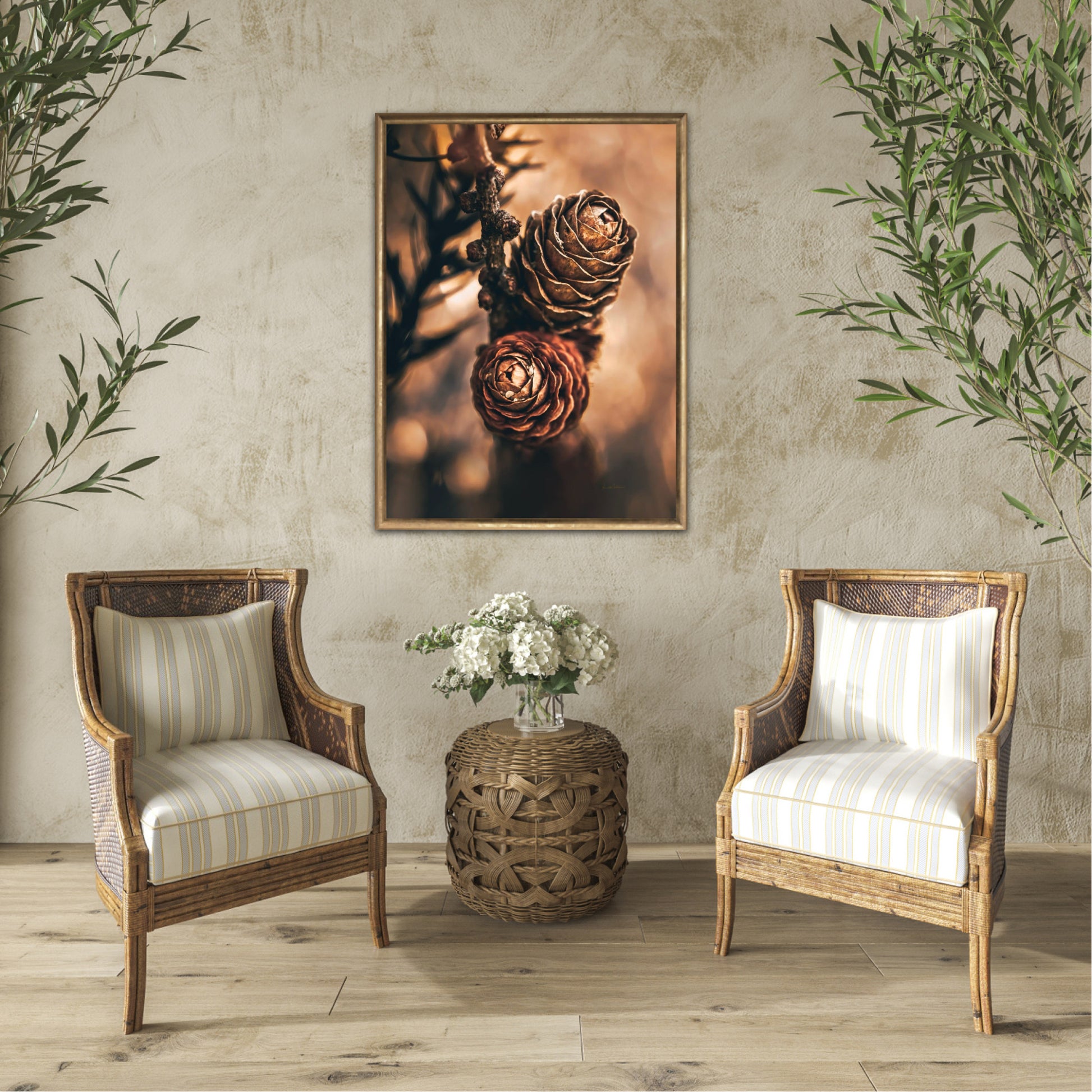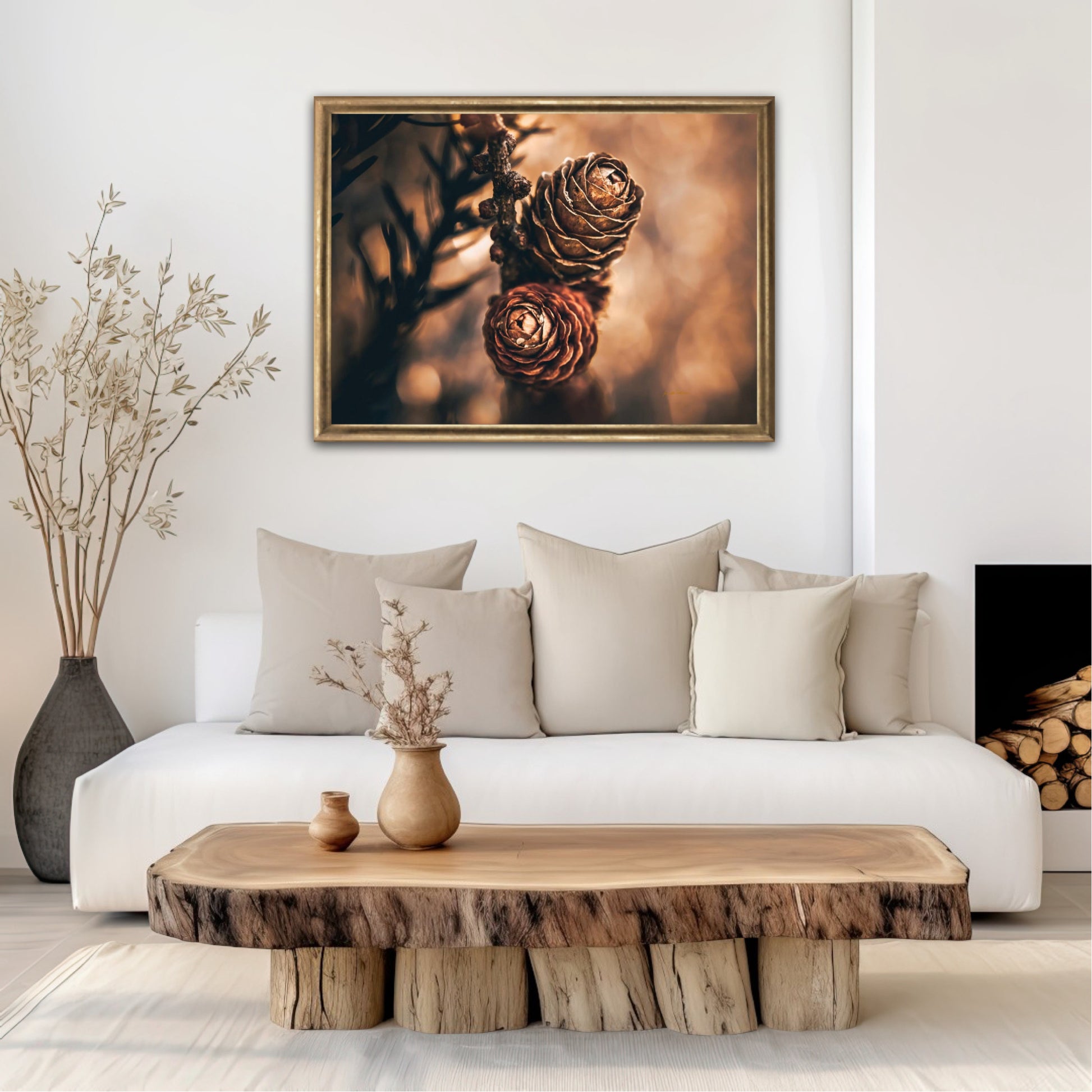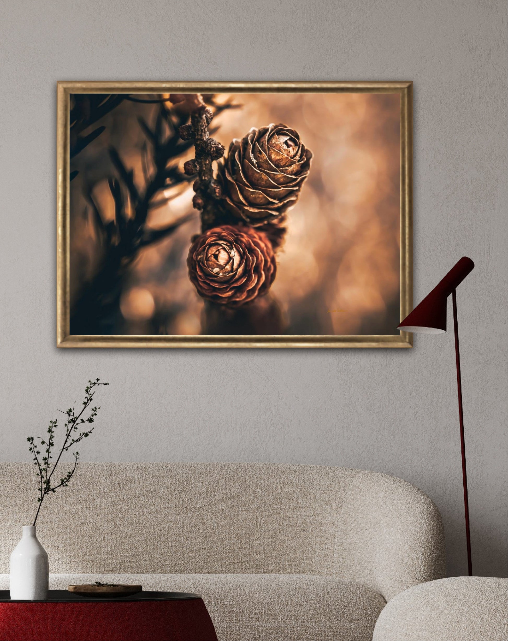 Beautiful photographic wall art of larch pine cones in golden brown and orange tones, with beautiful details and lovely light. The artwork has golden atmosphere that will make you feel warm and cosy.