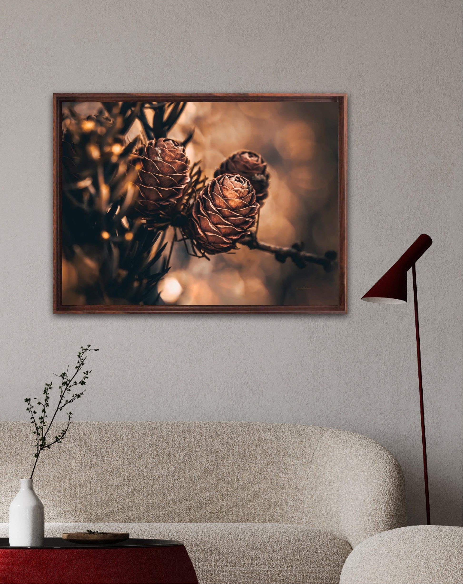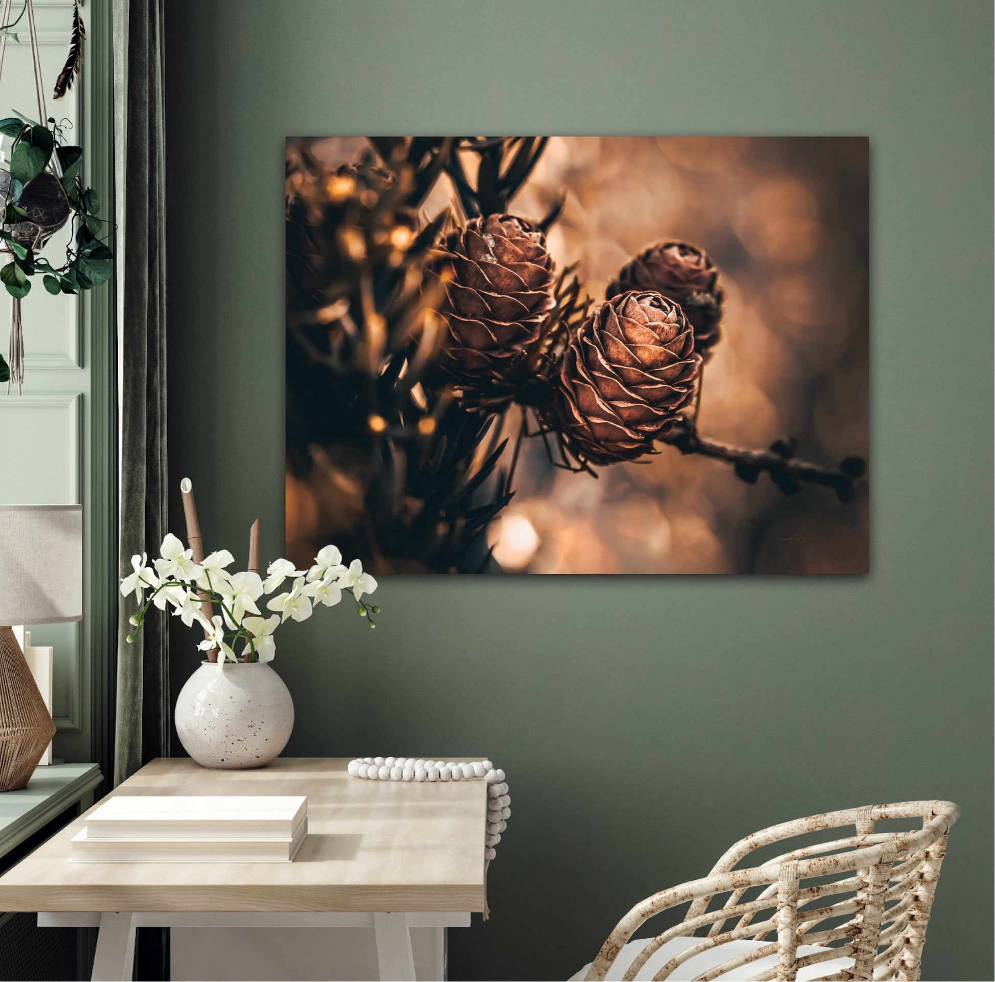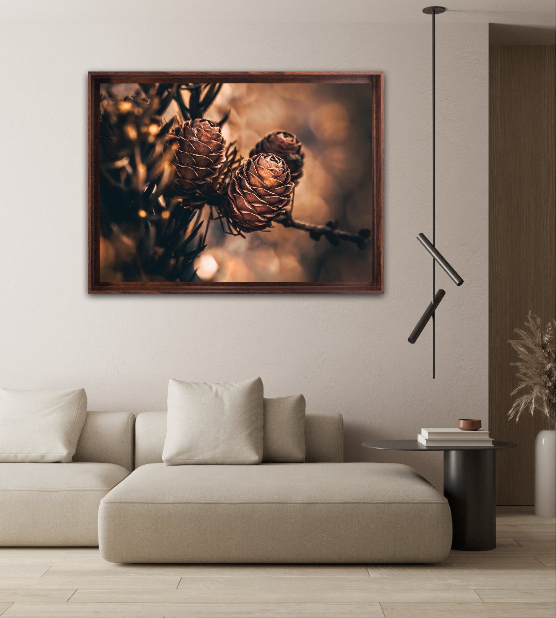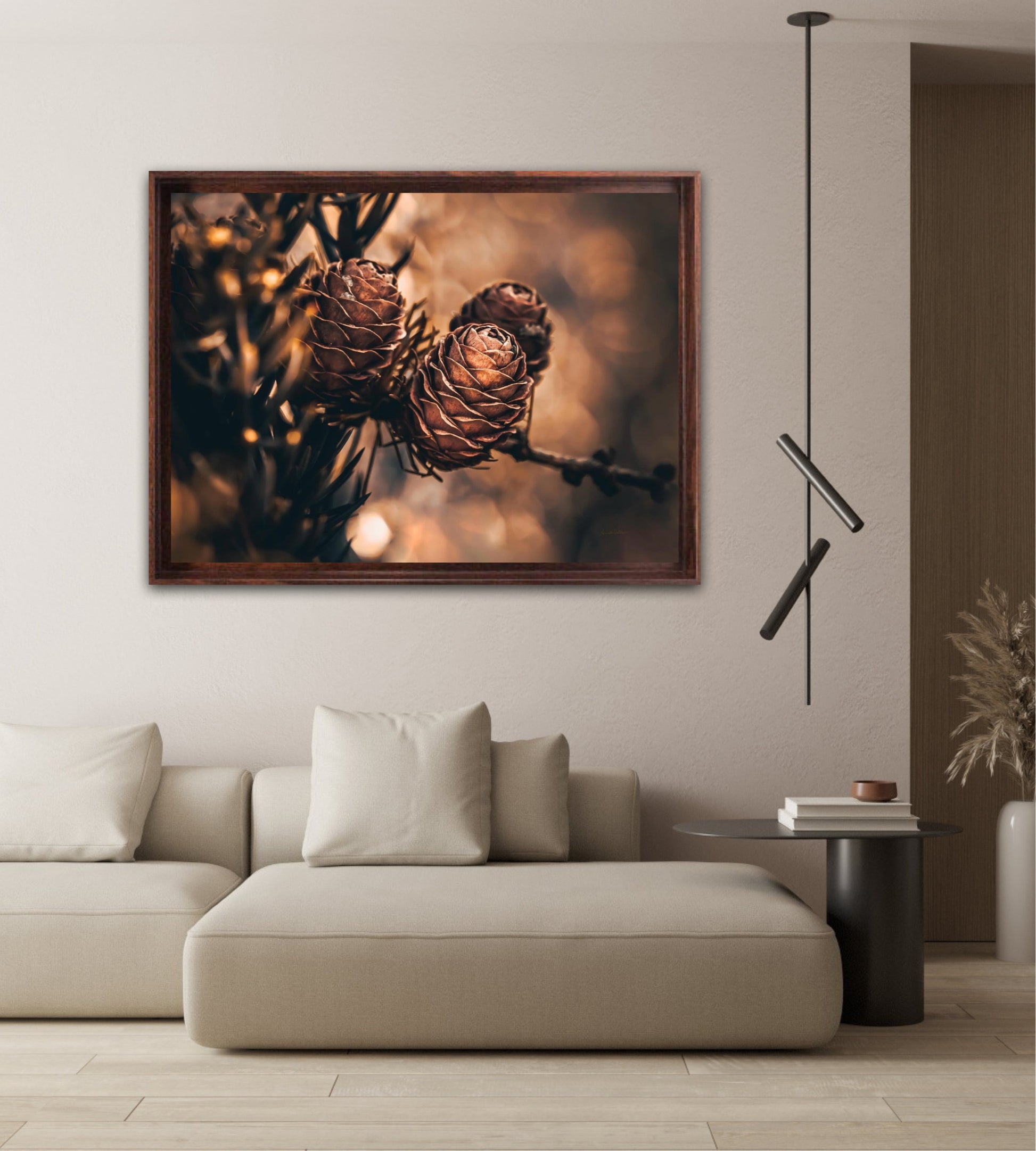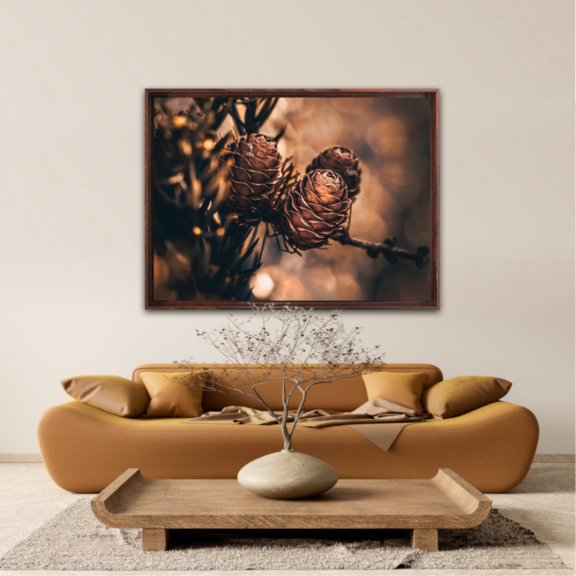 Beautiful photographic wall art of larch pine cones in golden brown and orange tones, with beautiful details and lovely light. The artwork has golden atmosphere that will make you feel warm and cosy.