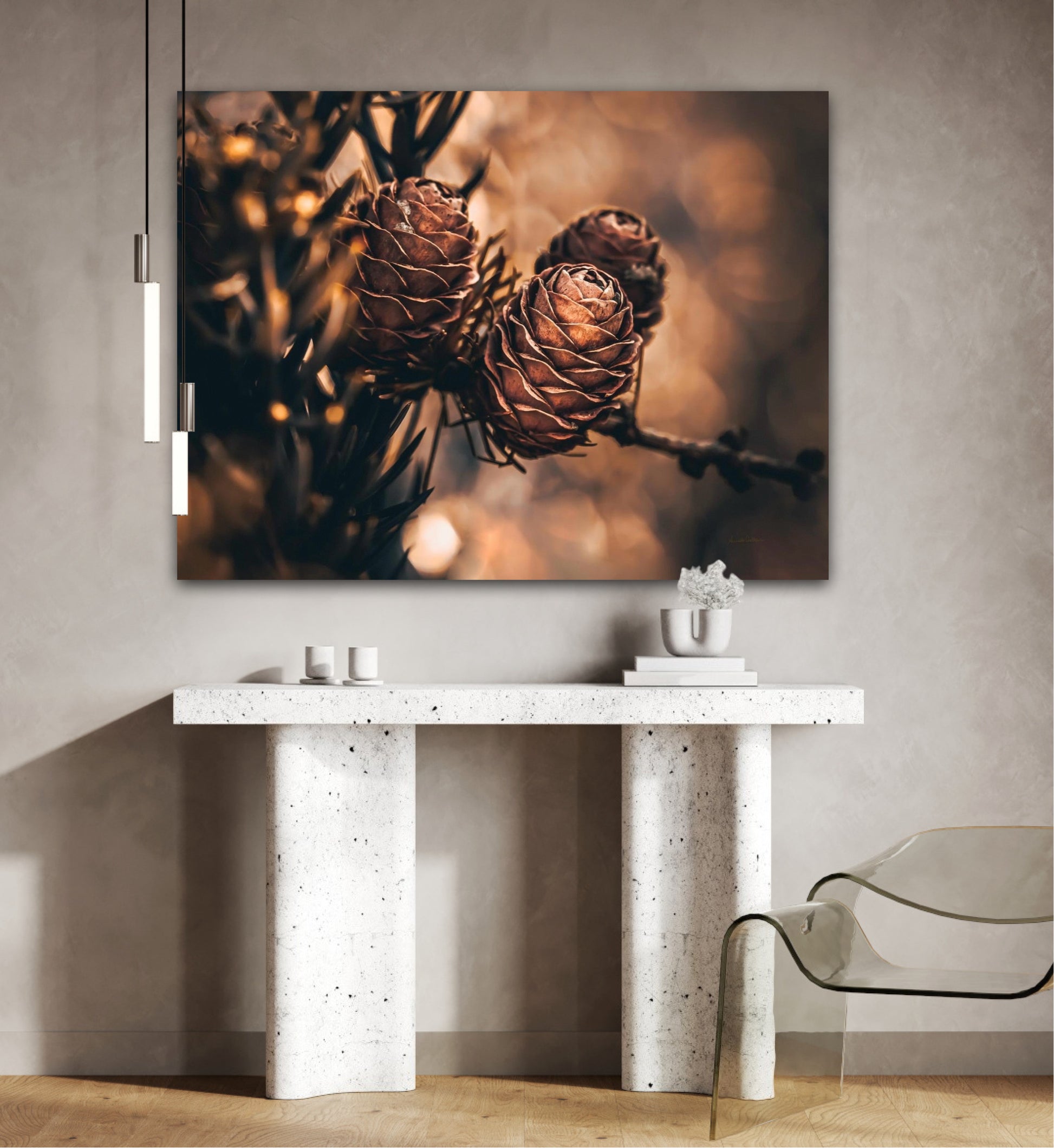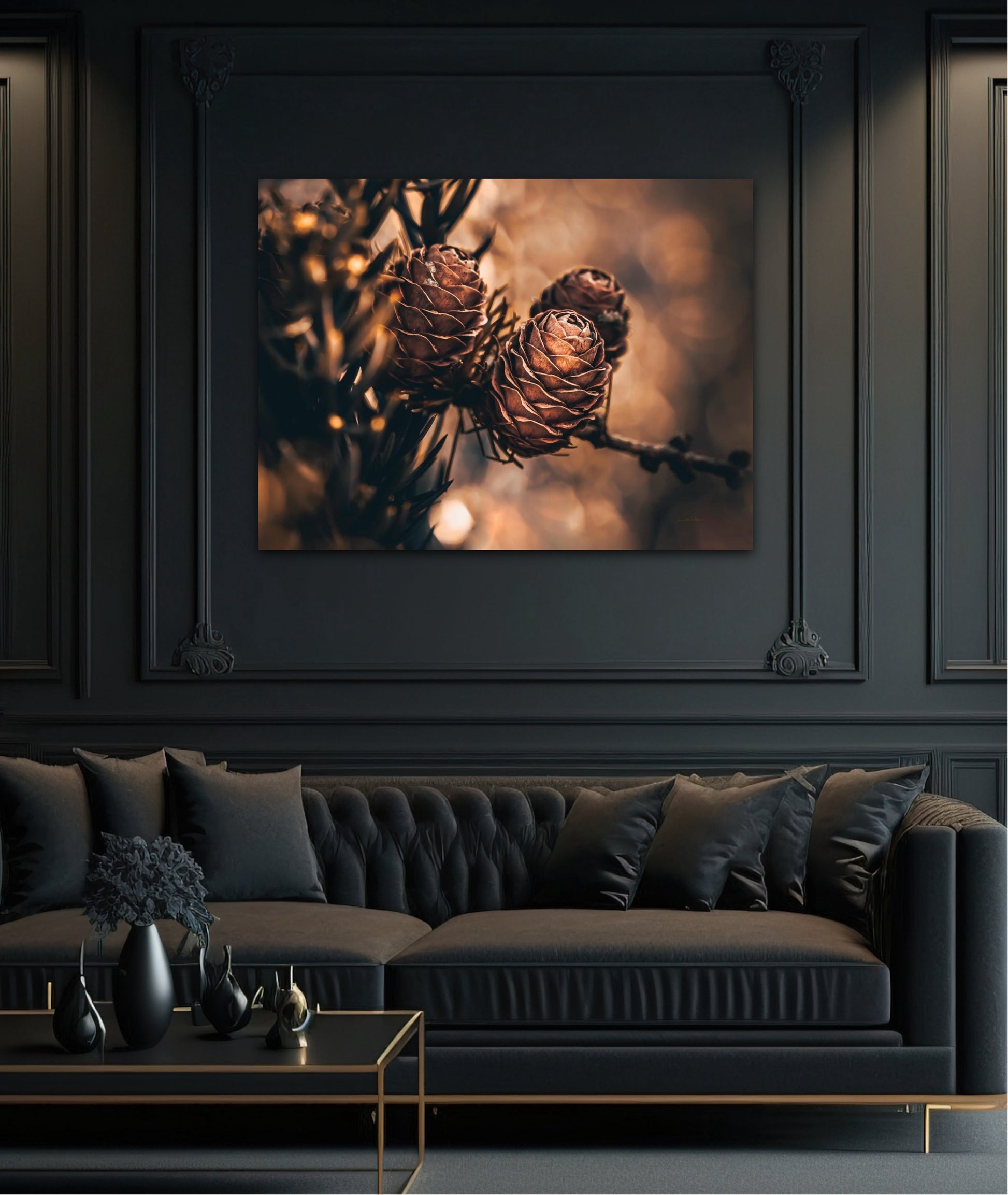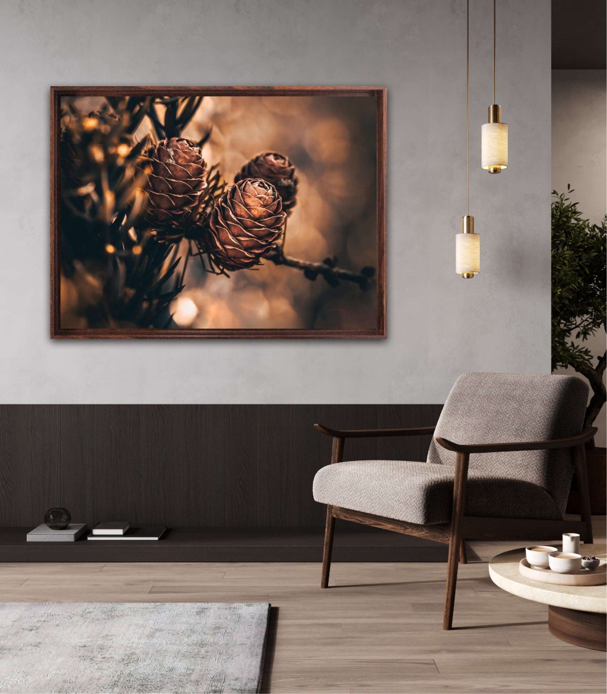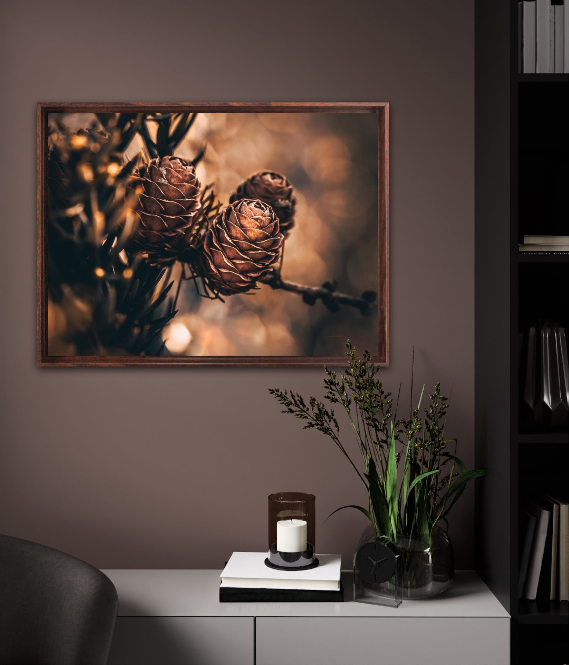 Beautiful photographic wall art of larch pine cones in golden brown and orange tones, with beautiful details and lovely light. The artwork has golden atmosphere that will make you feel warm and cosy.