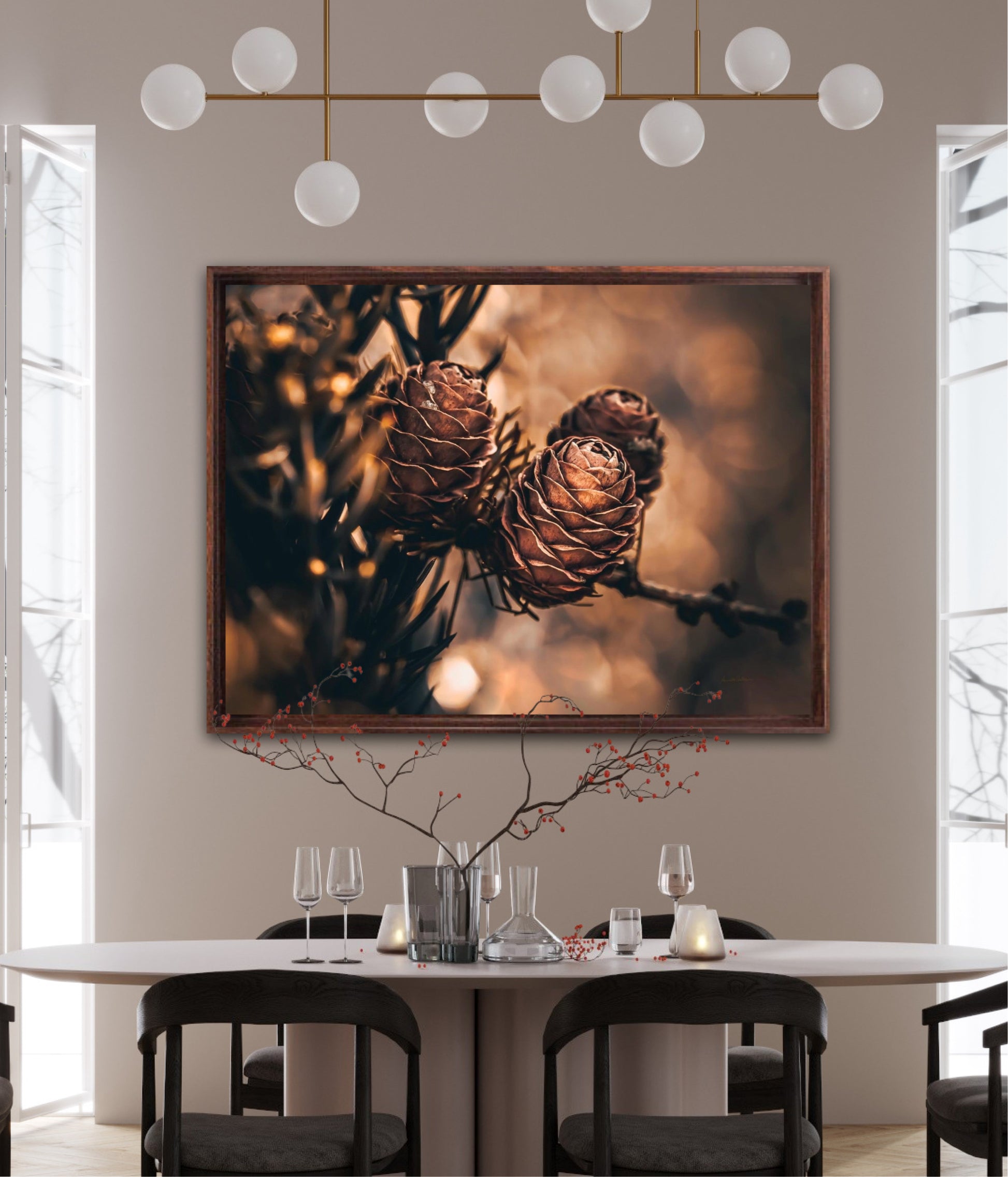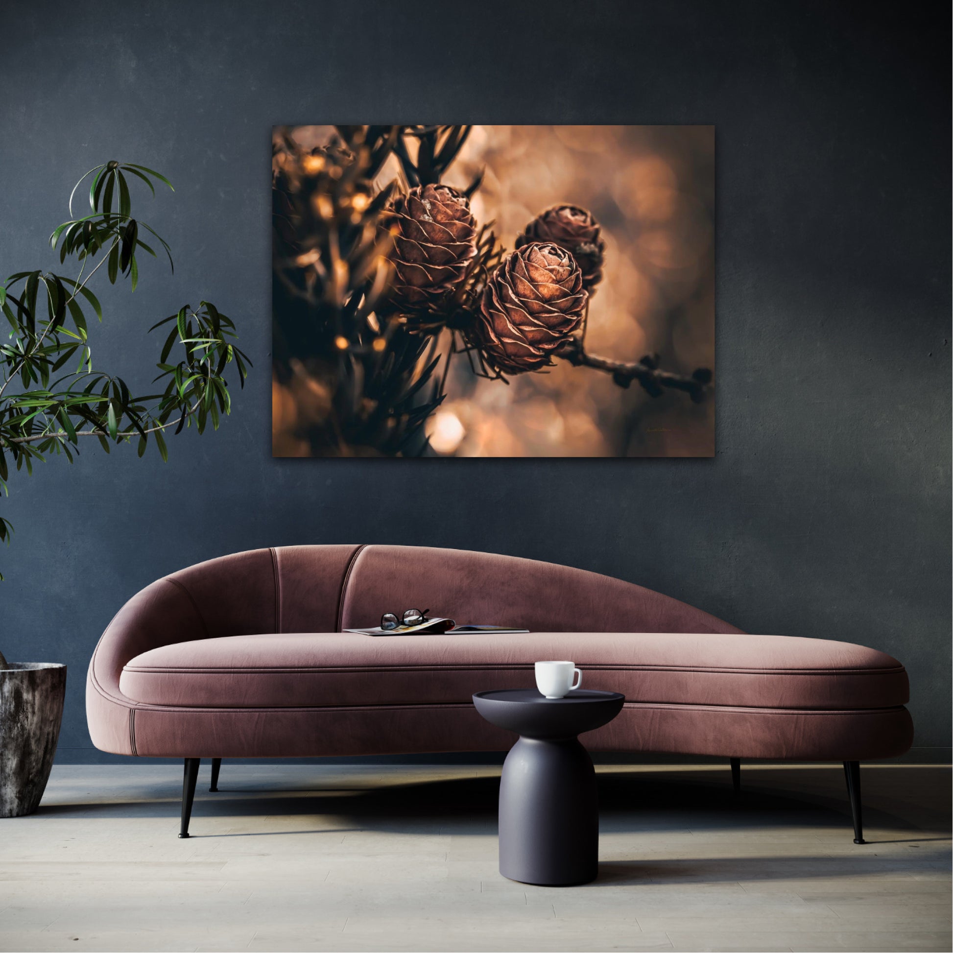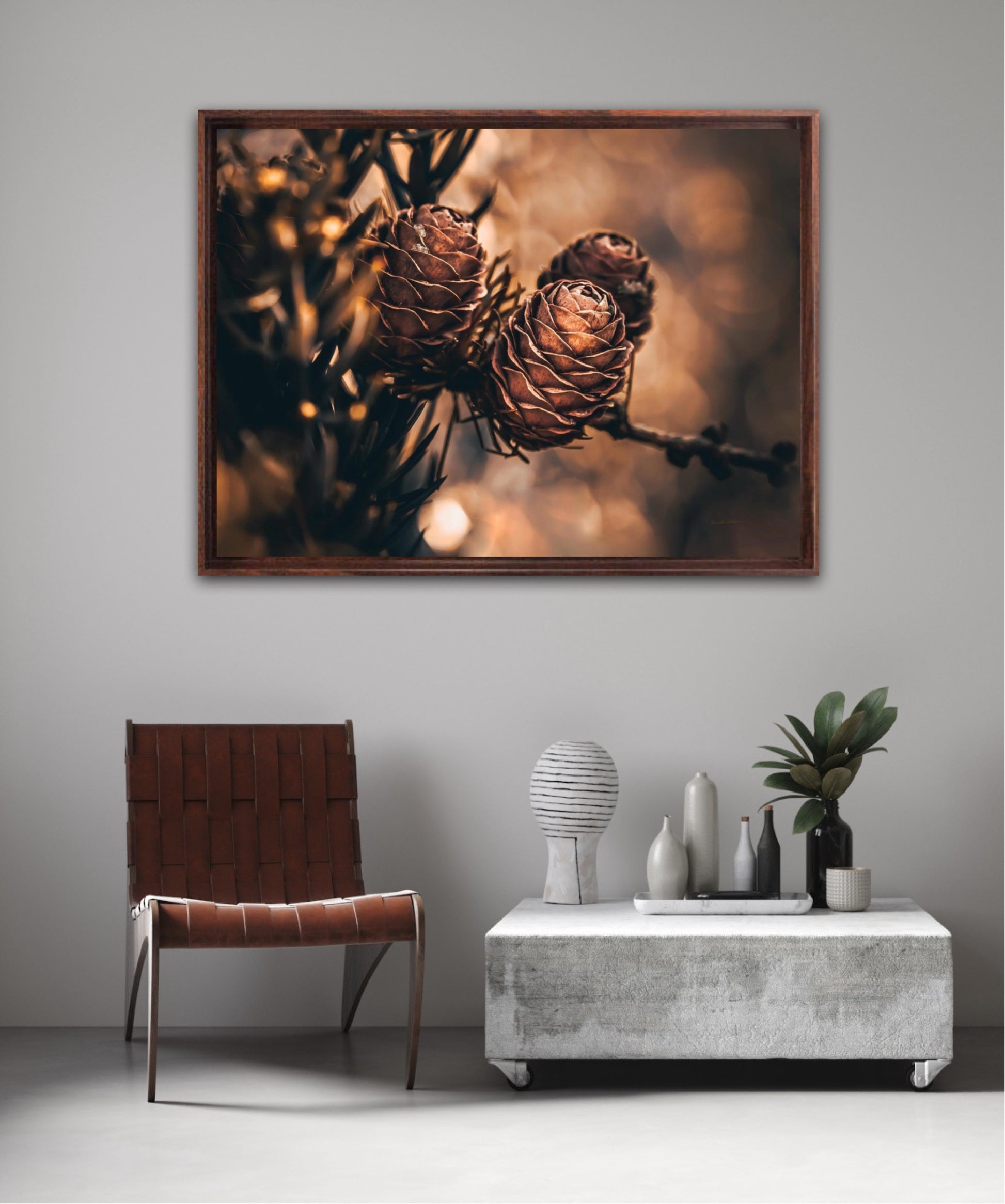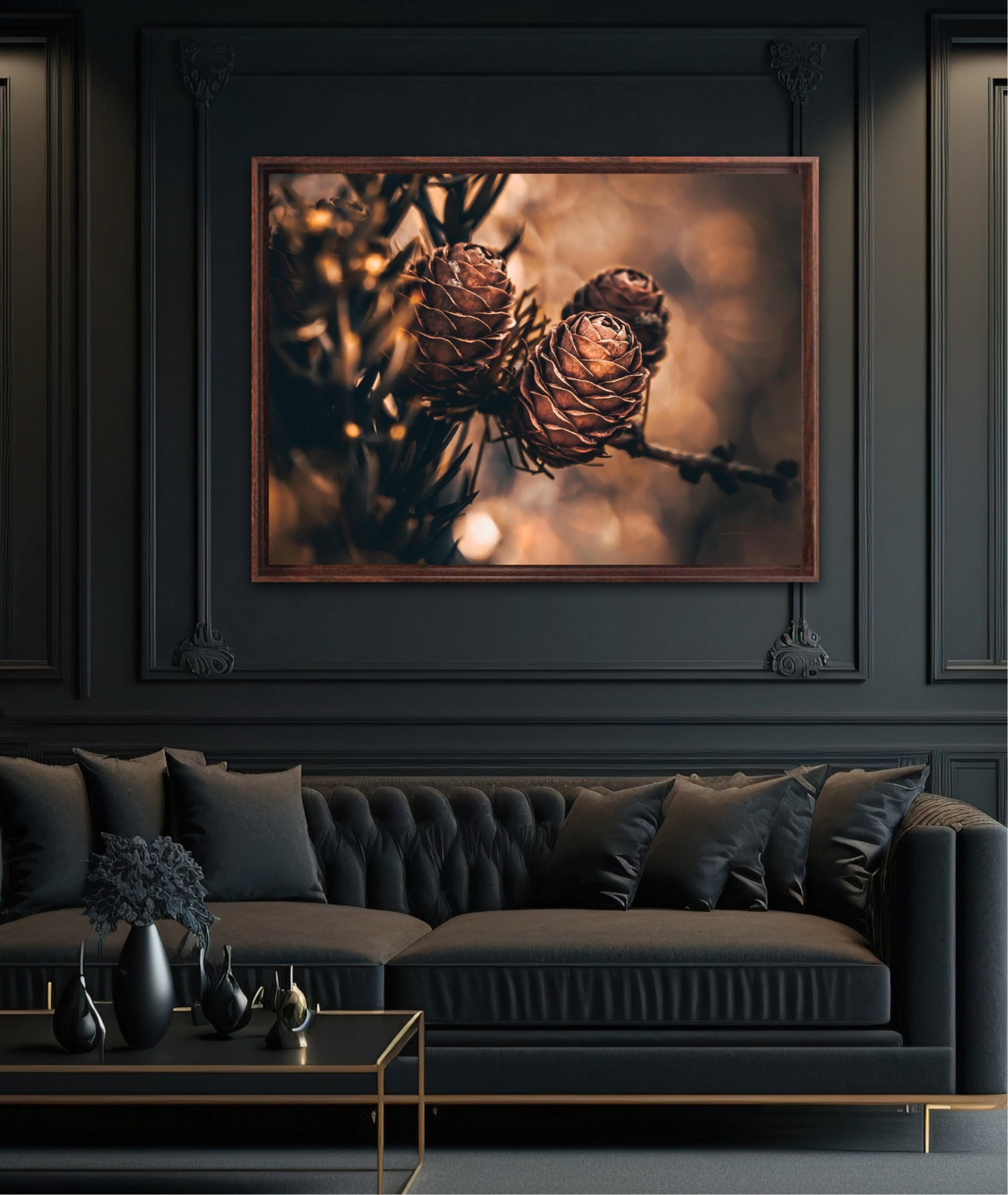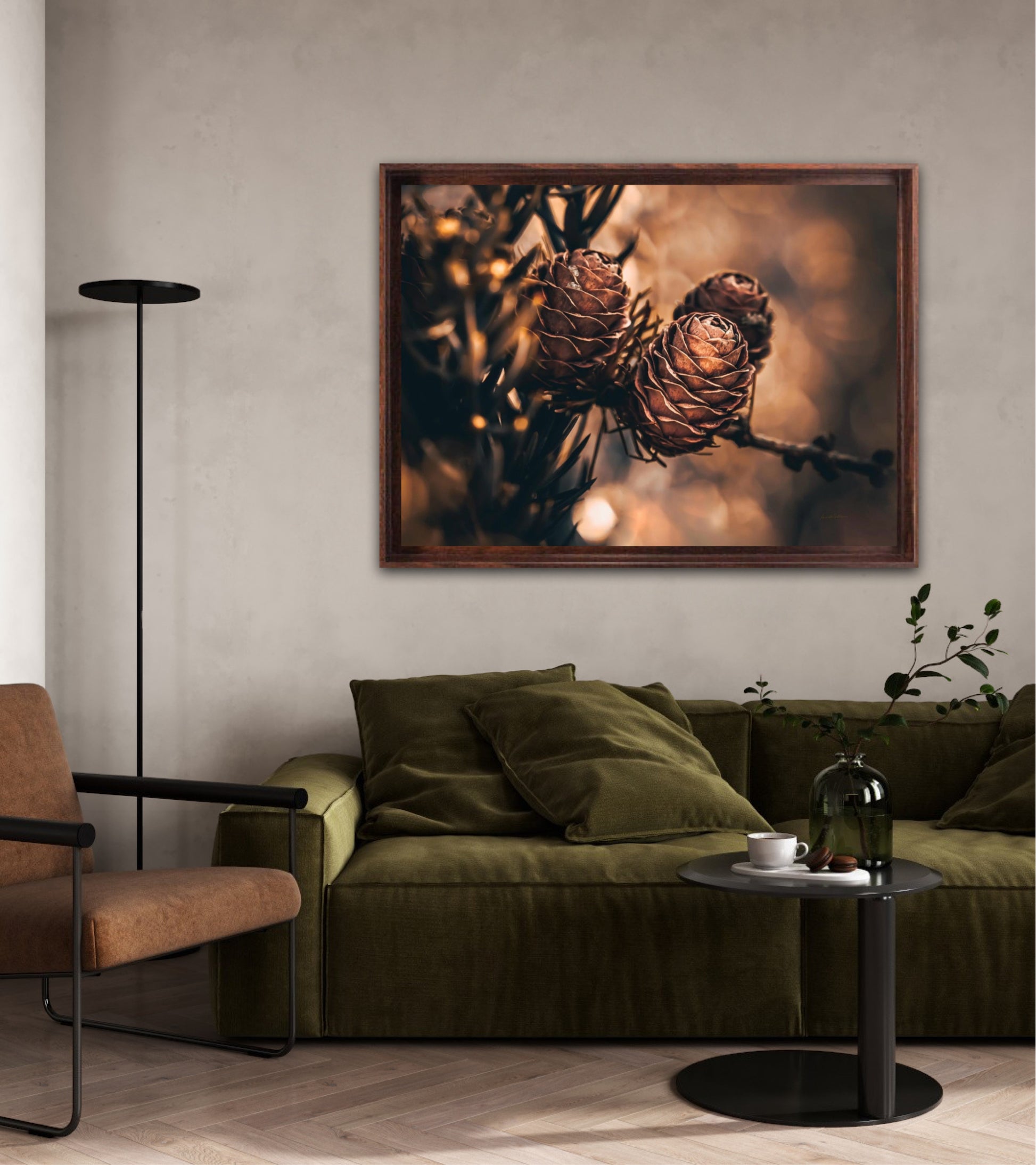 Beautiful photographic wall art of larch pine cones in golden brown and orange tones, with beautiful details and lovely light. The artwork has golden atmosphere that will make you feel warm and cosy.
