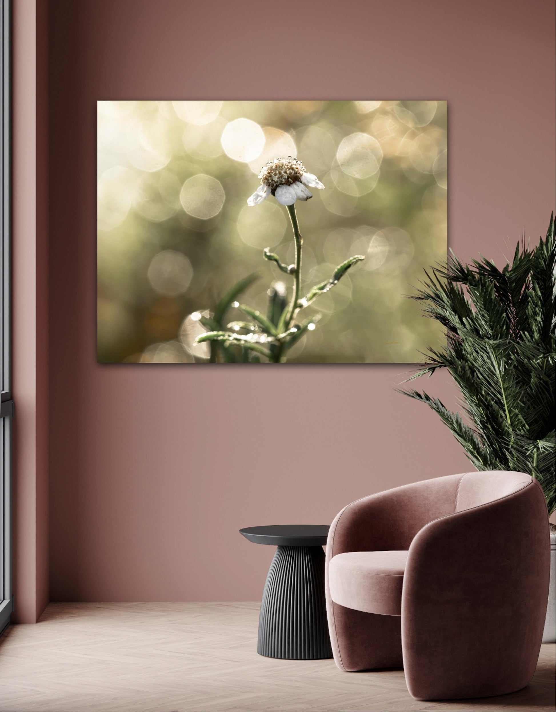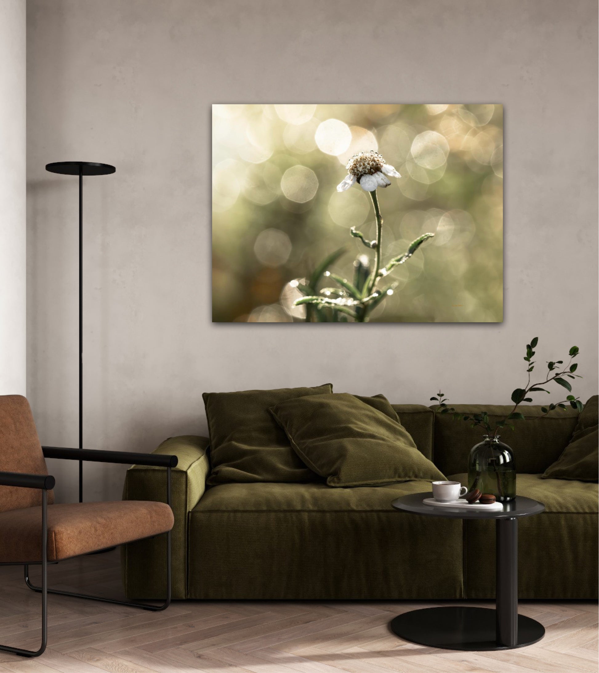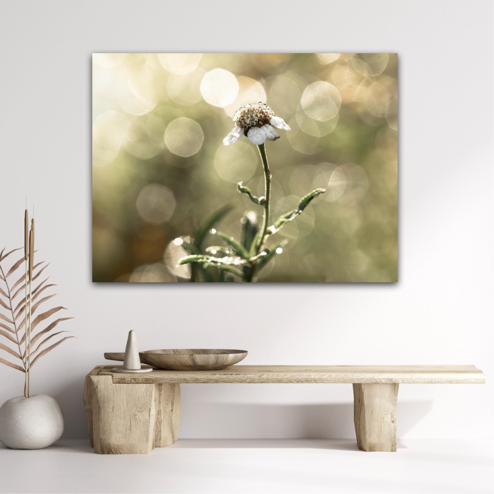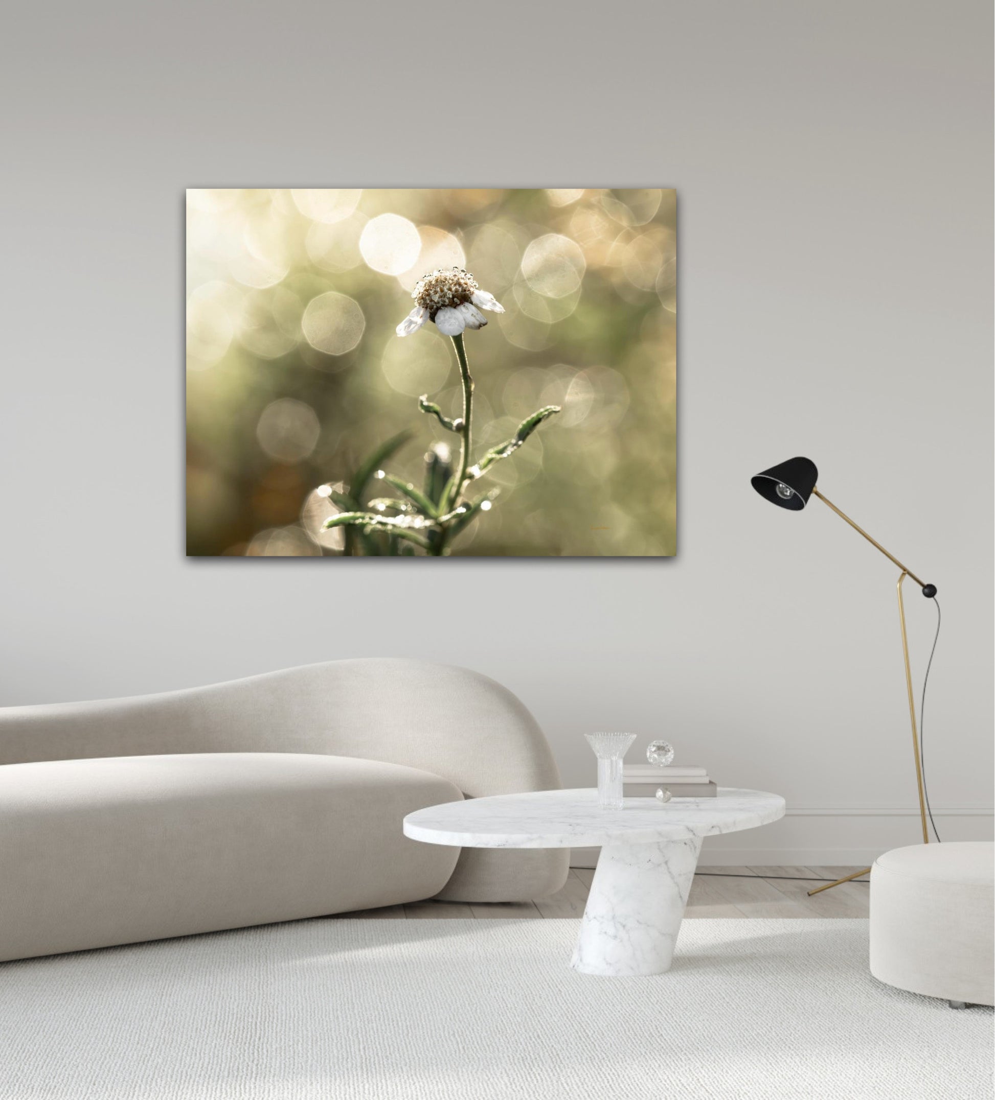 Beautiful photographic wall art of a white flower in light green golden tones, with beautiful details and lovely light. This picture will feel like the sun is shining in your home every day.