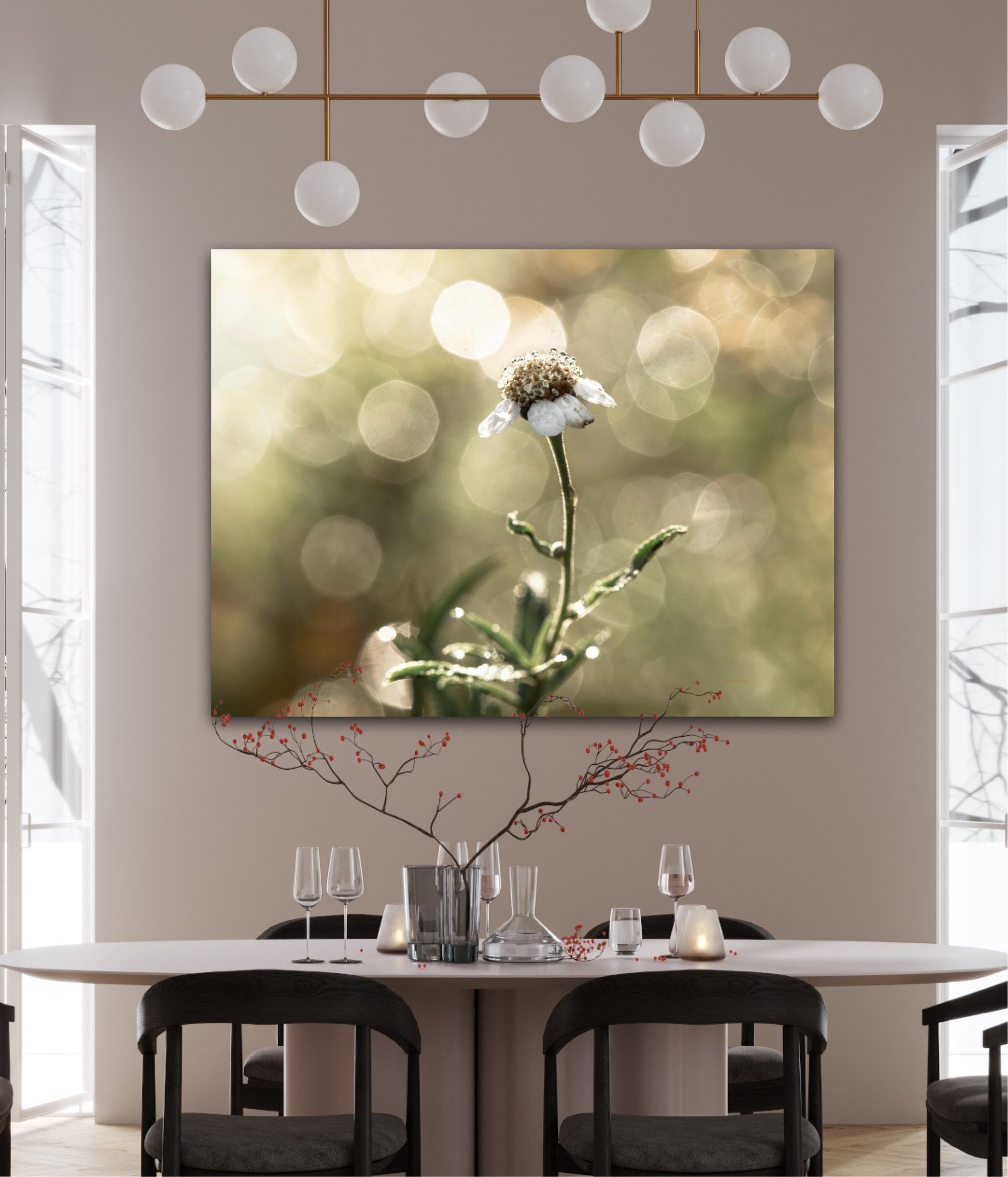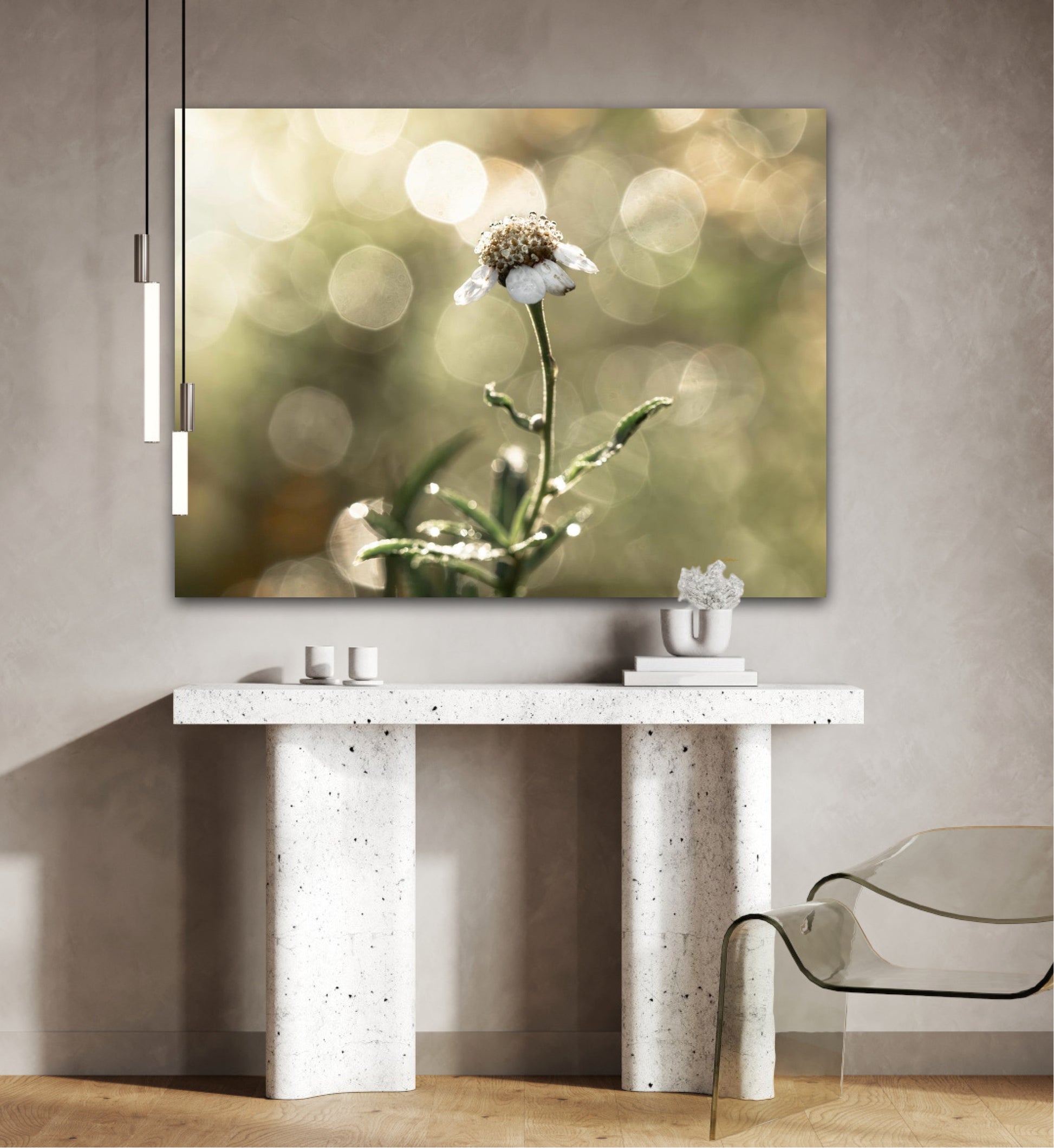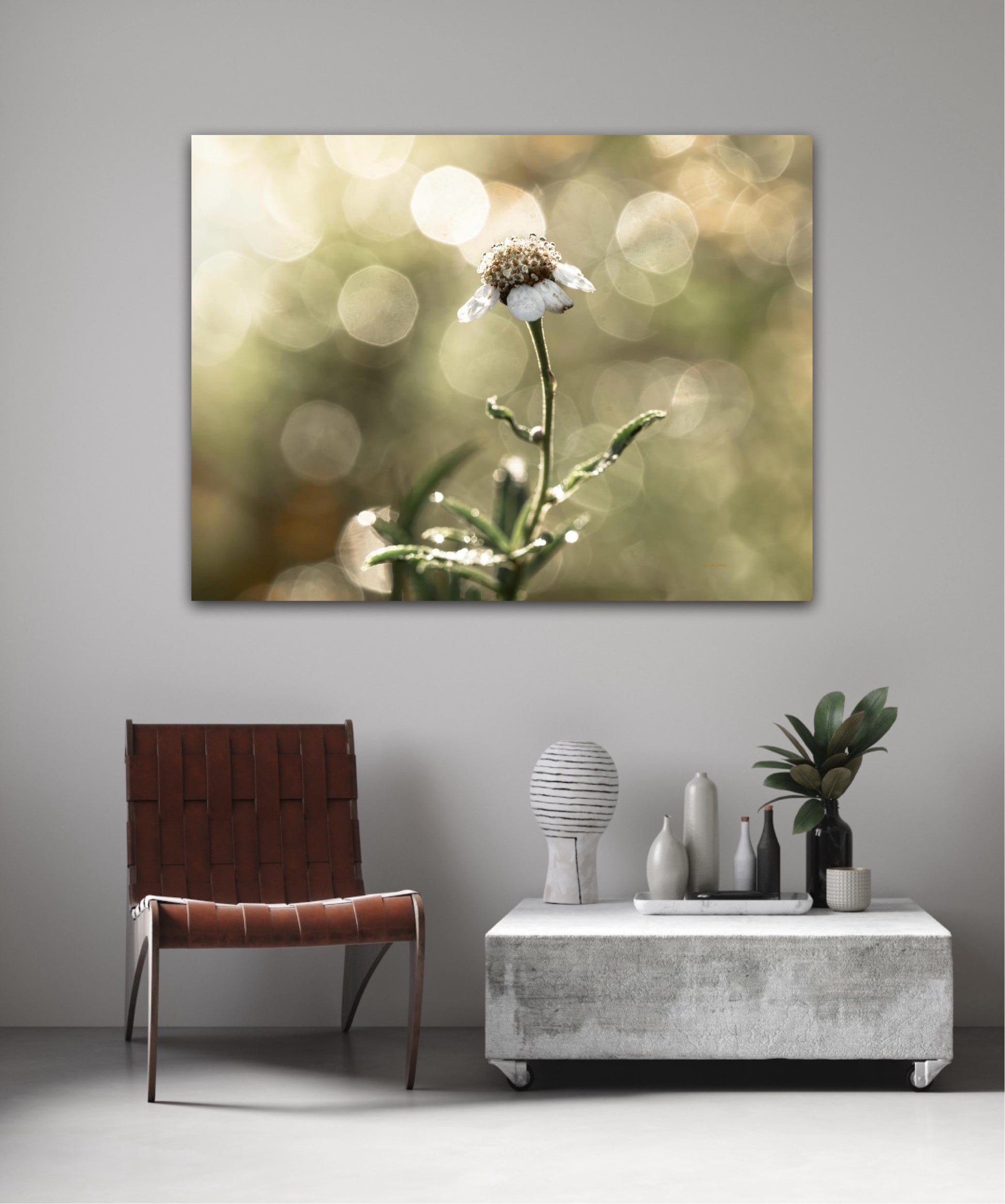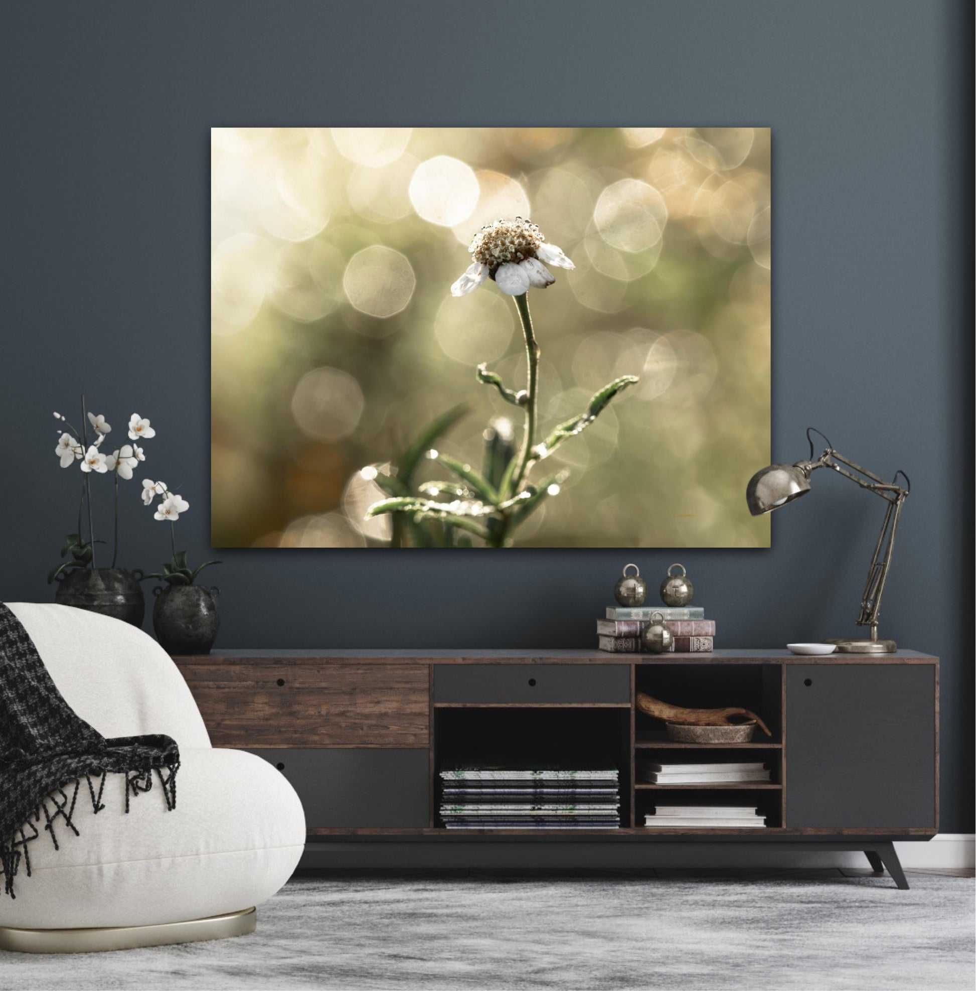 Beautiful photographic wall art of a white flower in light green golden tones, with beautiful details and lovely light. This picture will feel like the sun is shining in your home every day.
