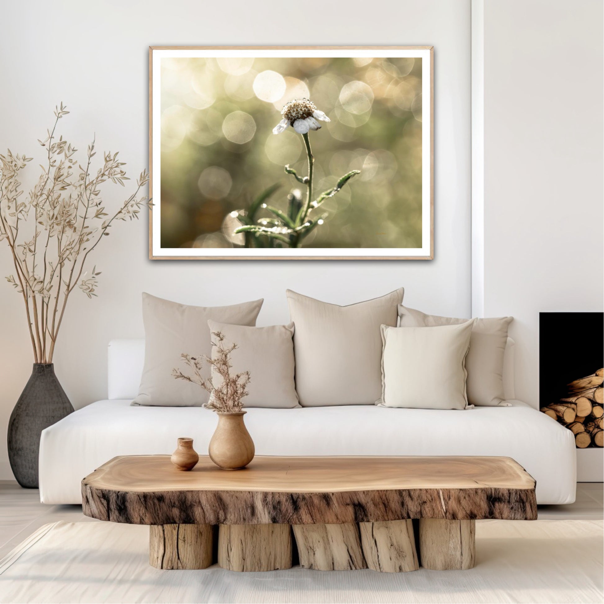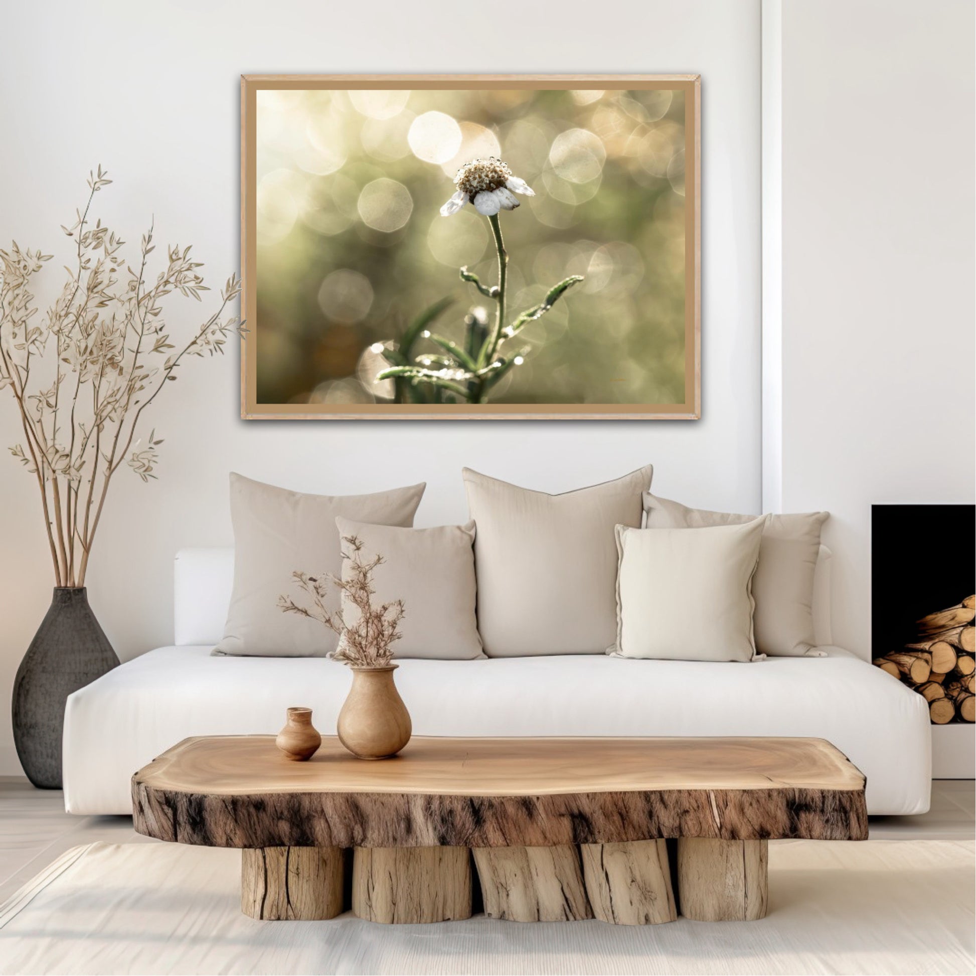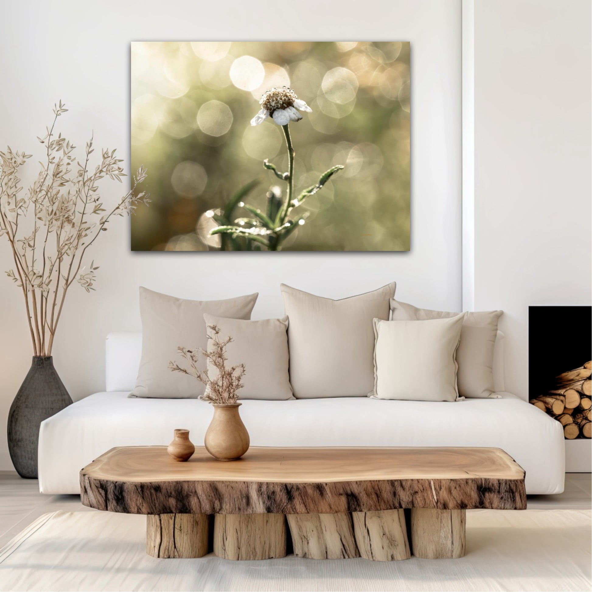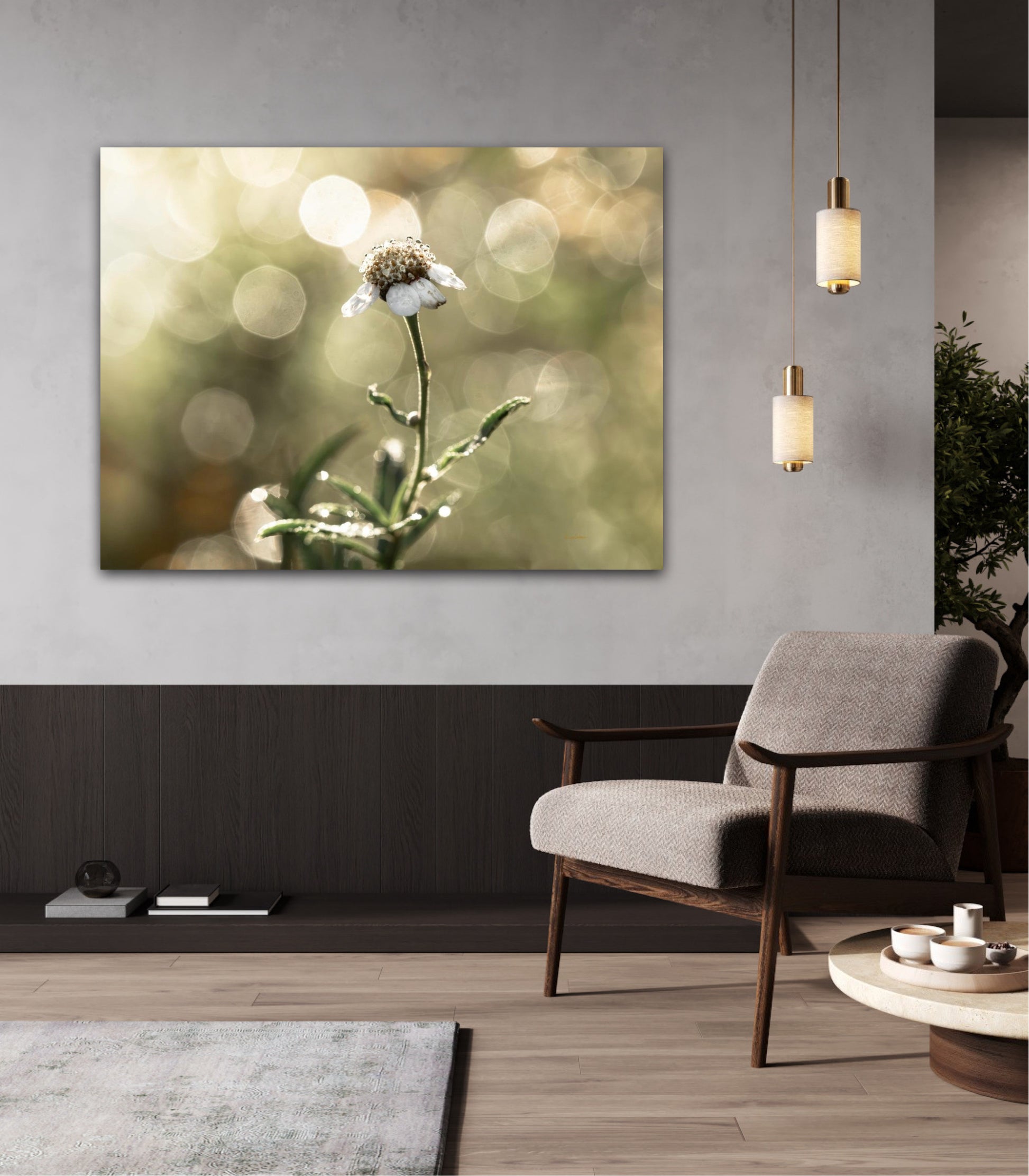Beautiful photographic wall art of a white flower in light green golden tones, with beautiful details and lovely light. This picture will feel like the sun is shining in your home every day.