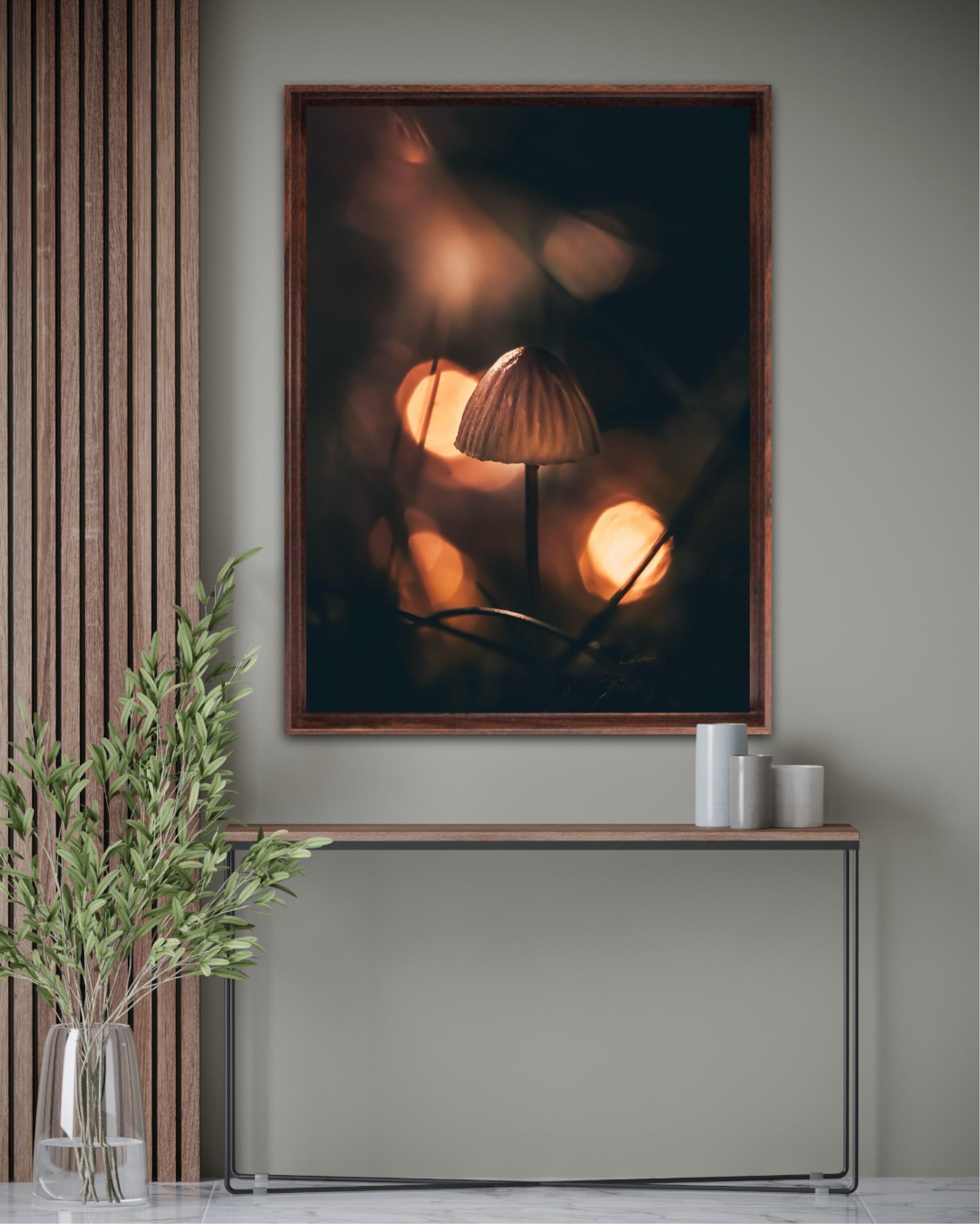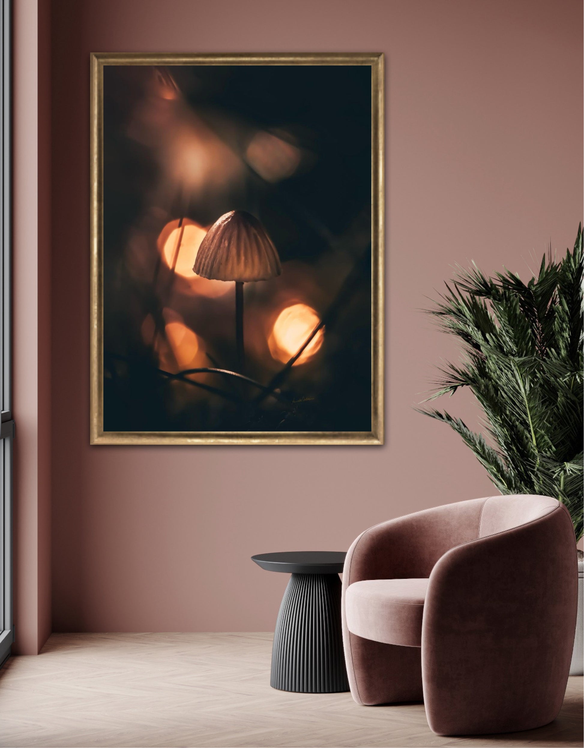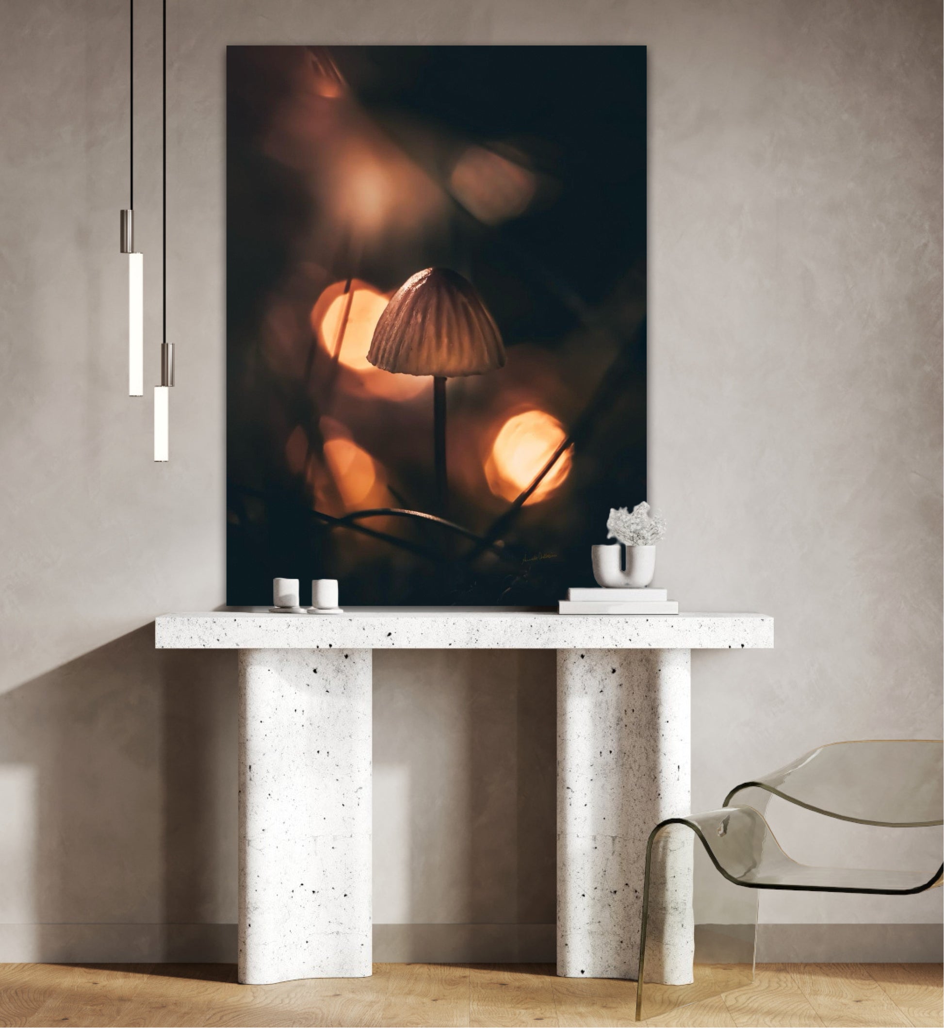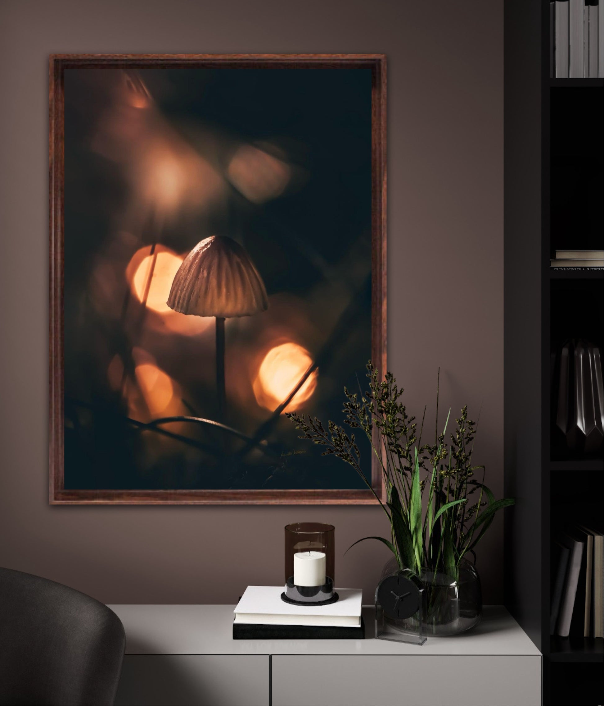 Beautiful photographic wall art of a gorgeous mushroom on a golden background. This is magic in a piece of art.