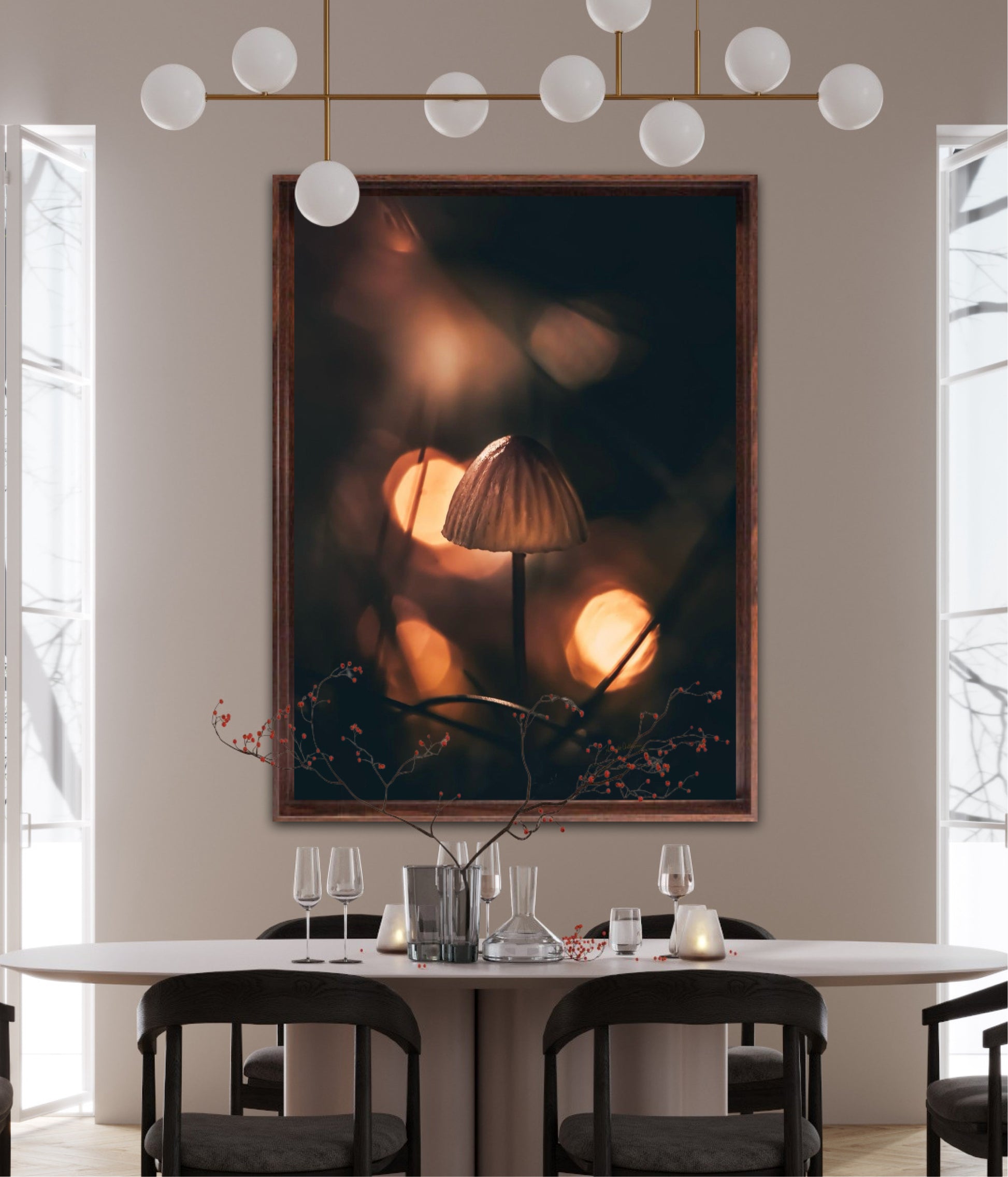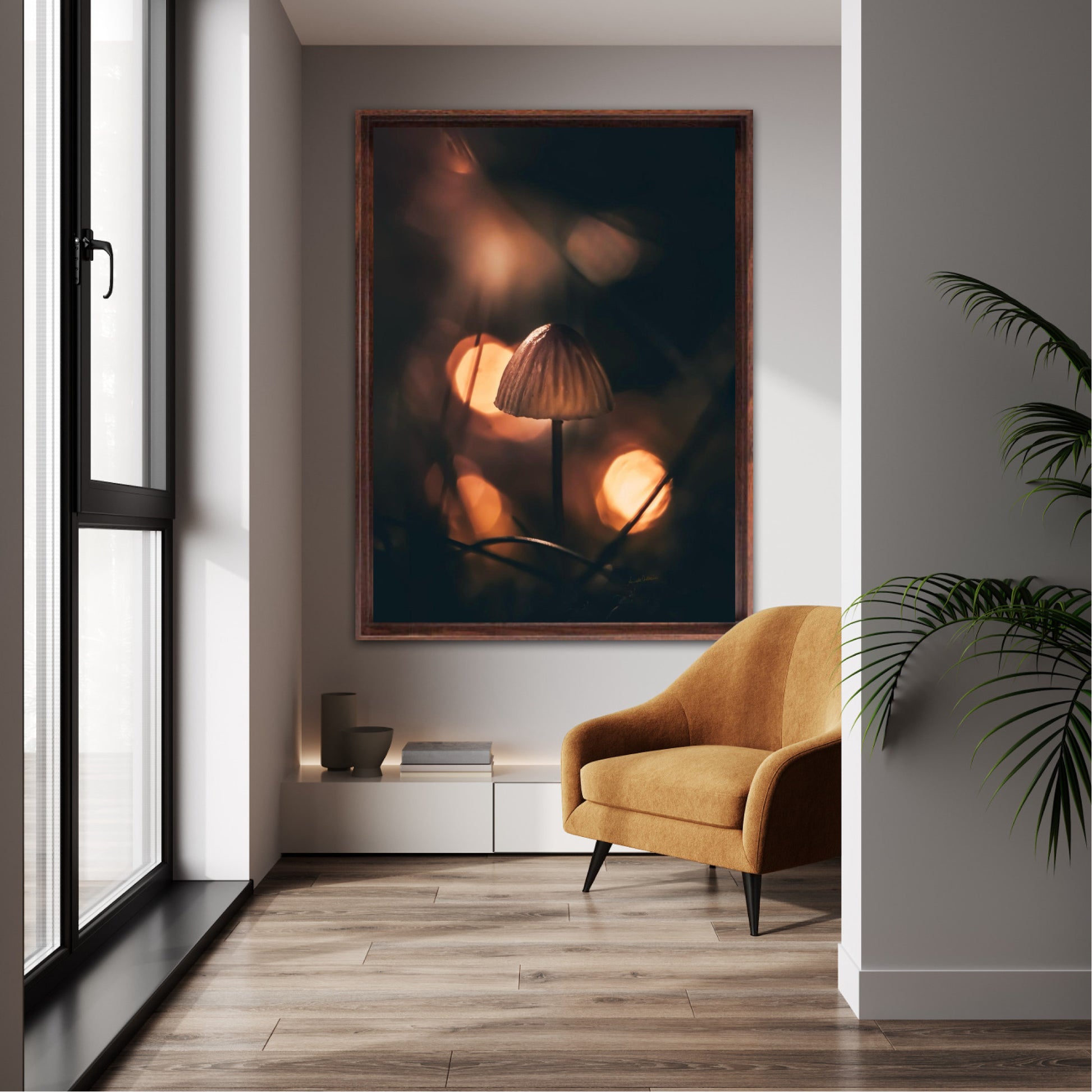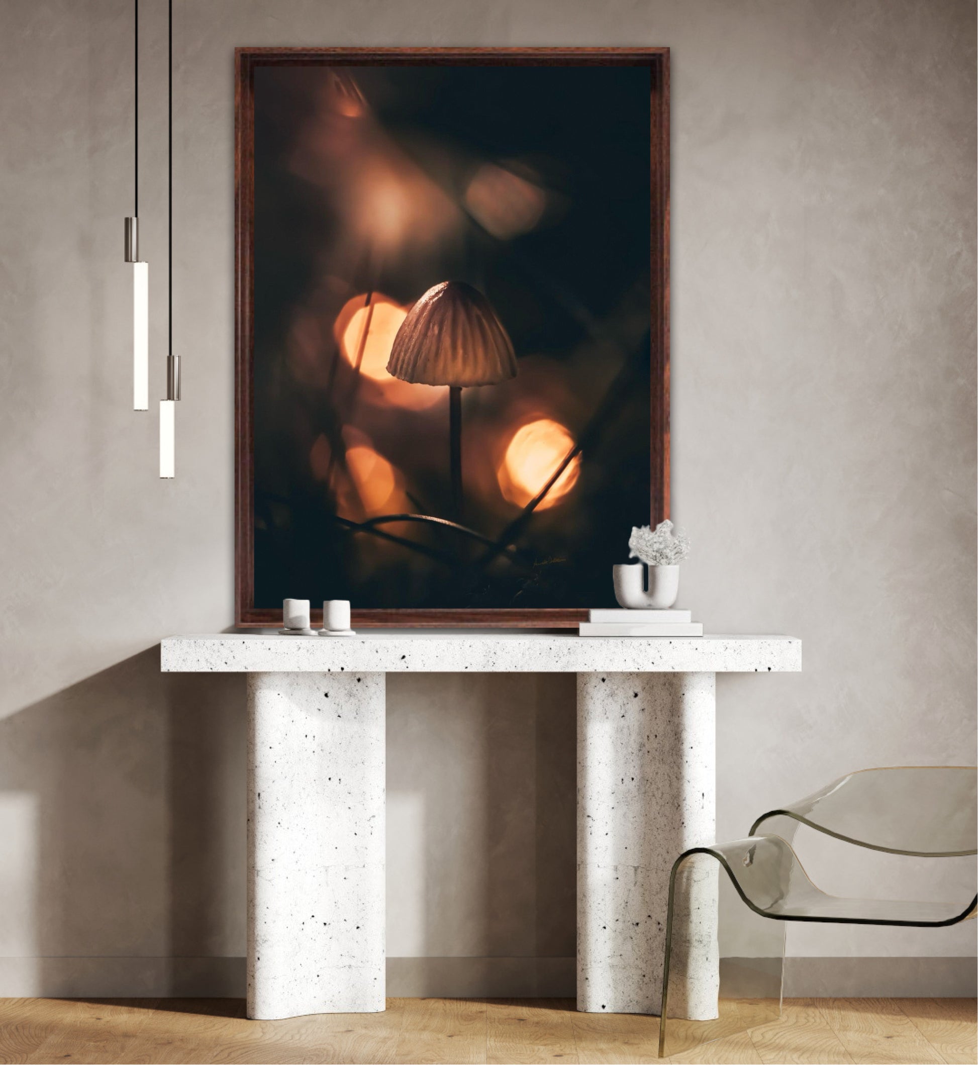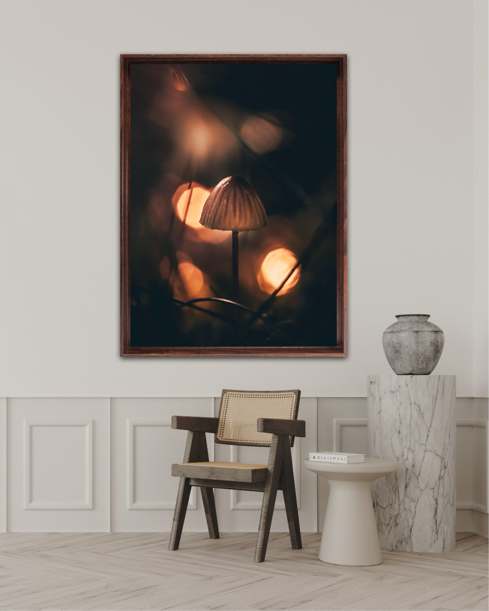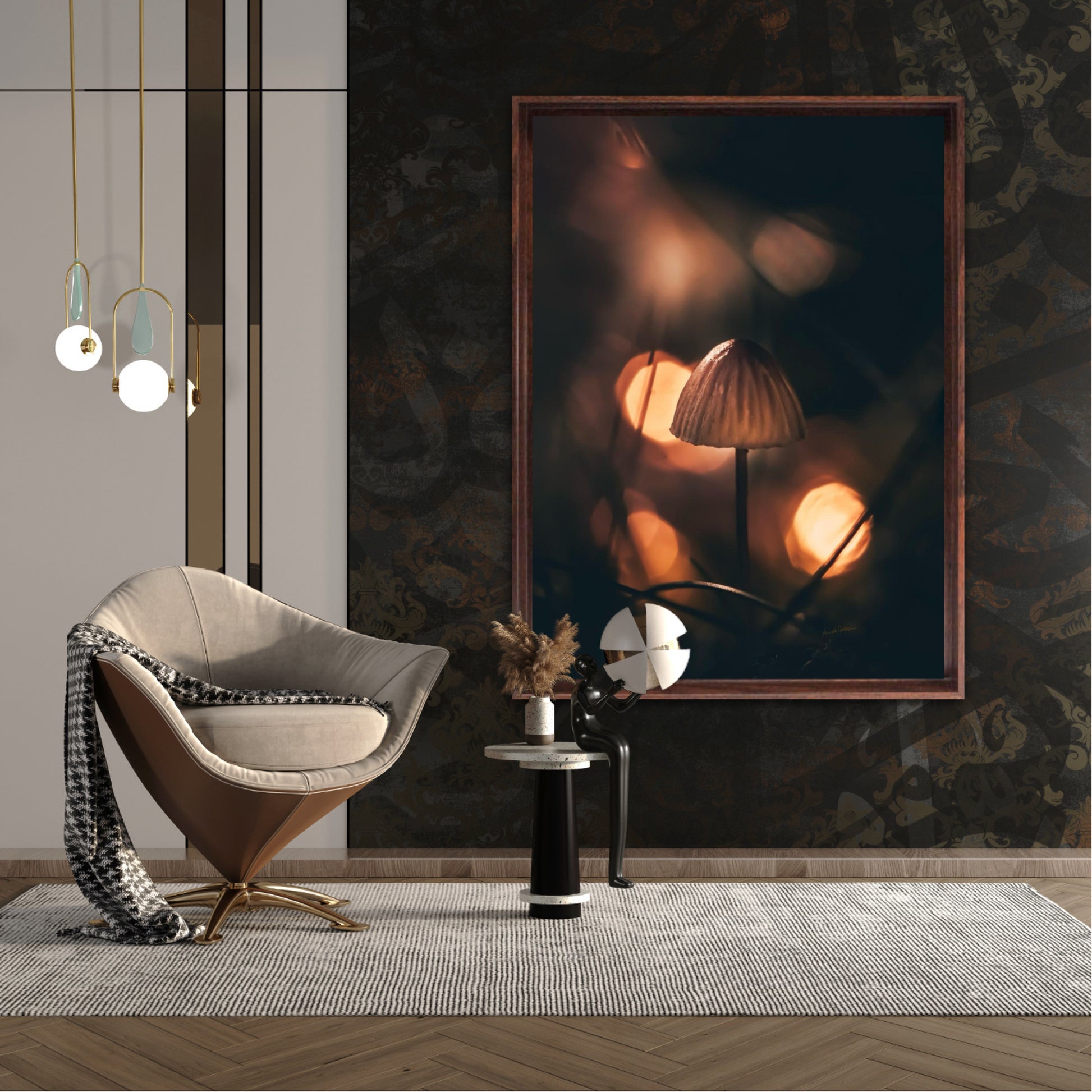 Beautiful photographic wall art of a gorgeous mushroom on a golden background. This is magic in a piece of art.