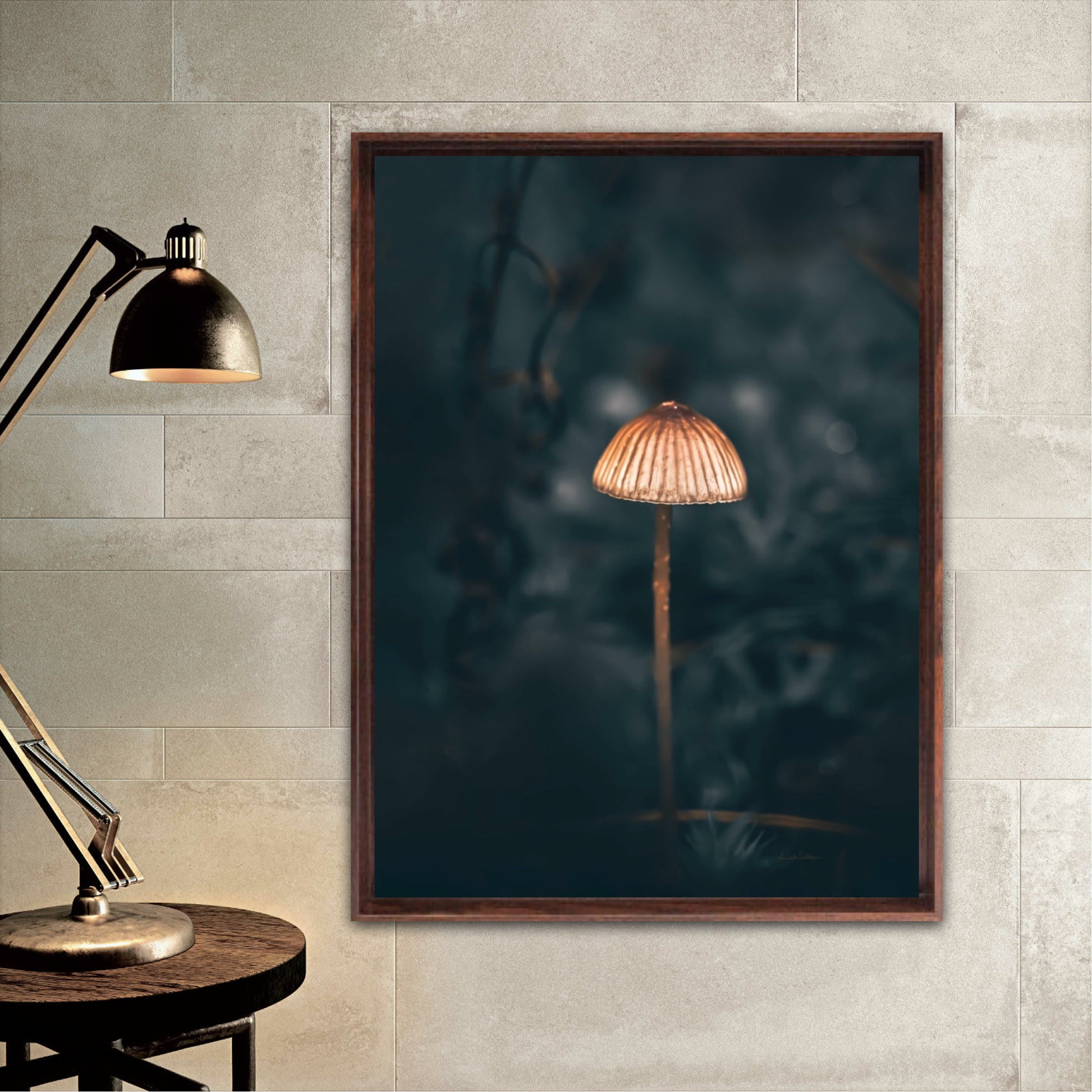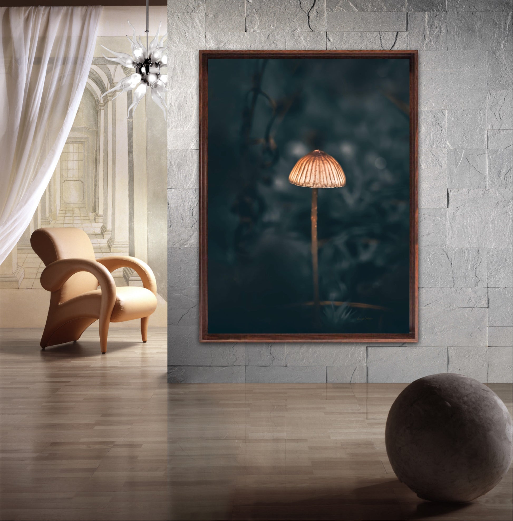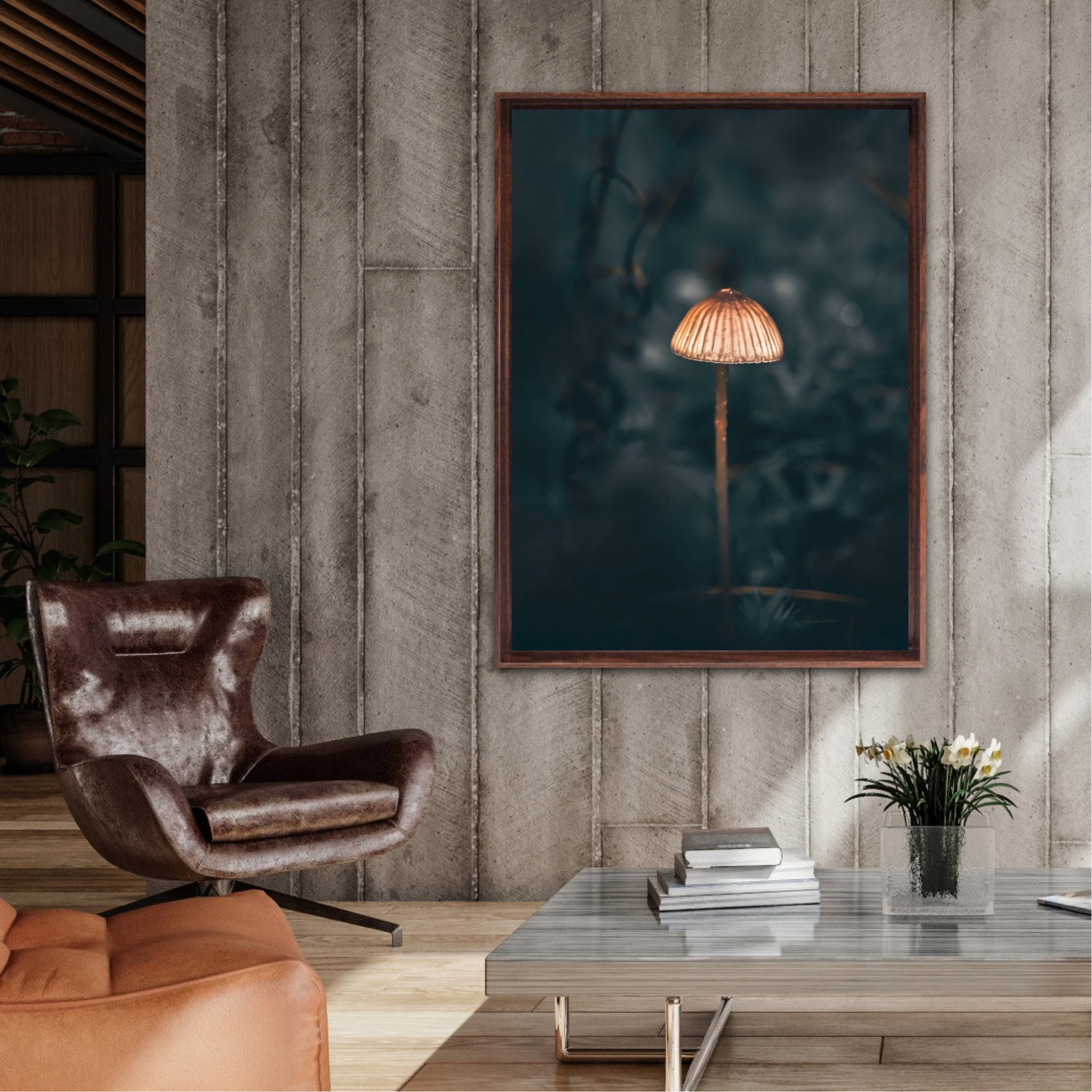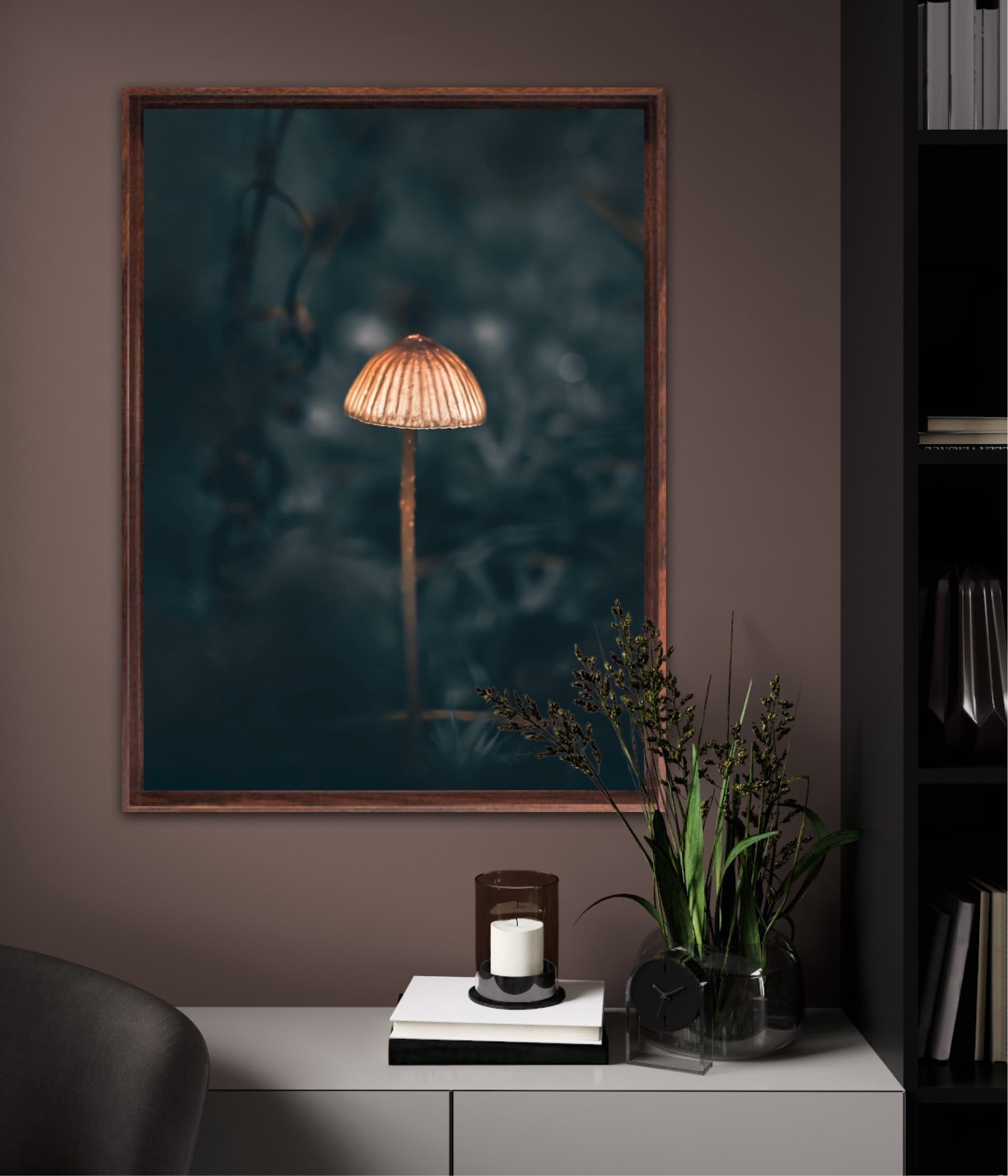 Beautiful photographic wall art of a simple mushroom in brown tones against a dark blue-grey background. This motif is emotional and feeling. What do you feel? Get a lovely and expressive art on your wall today with this beautiful motif.