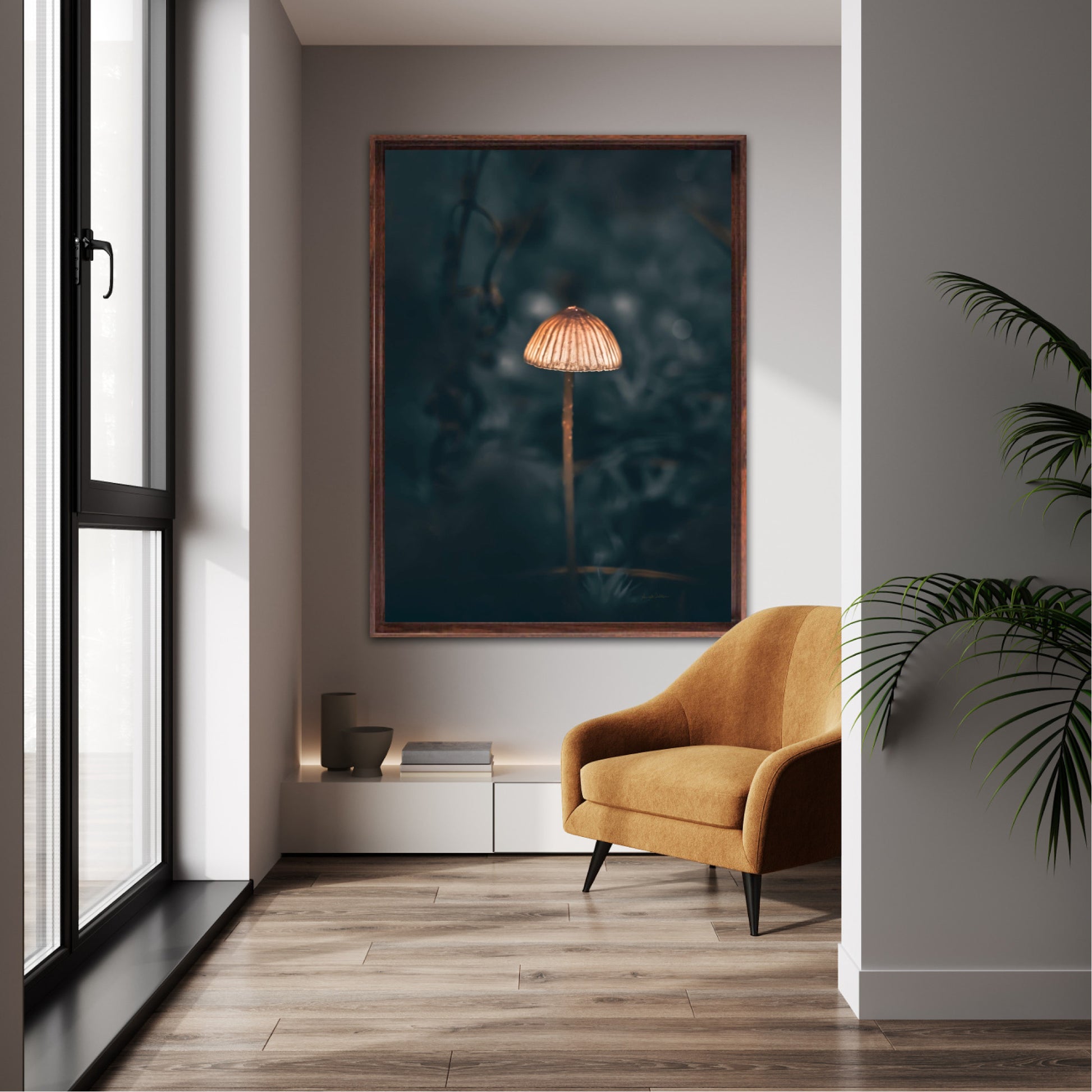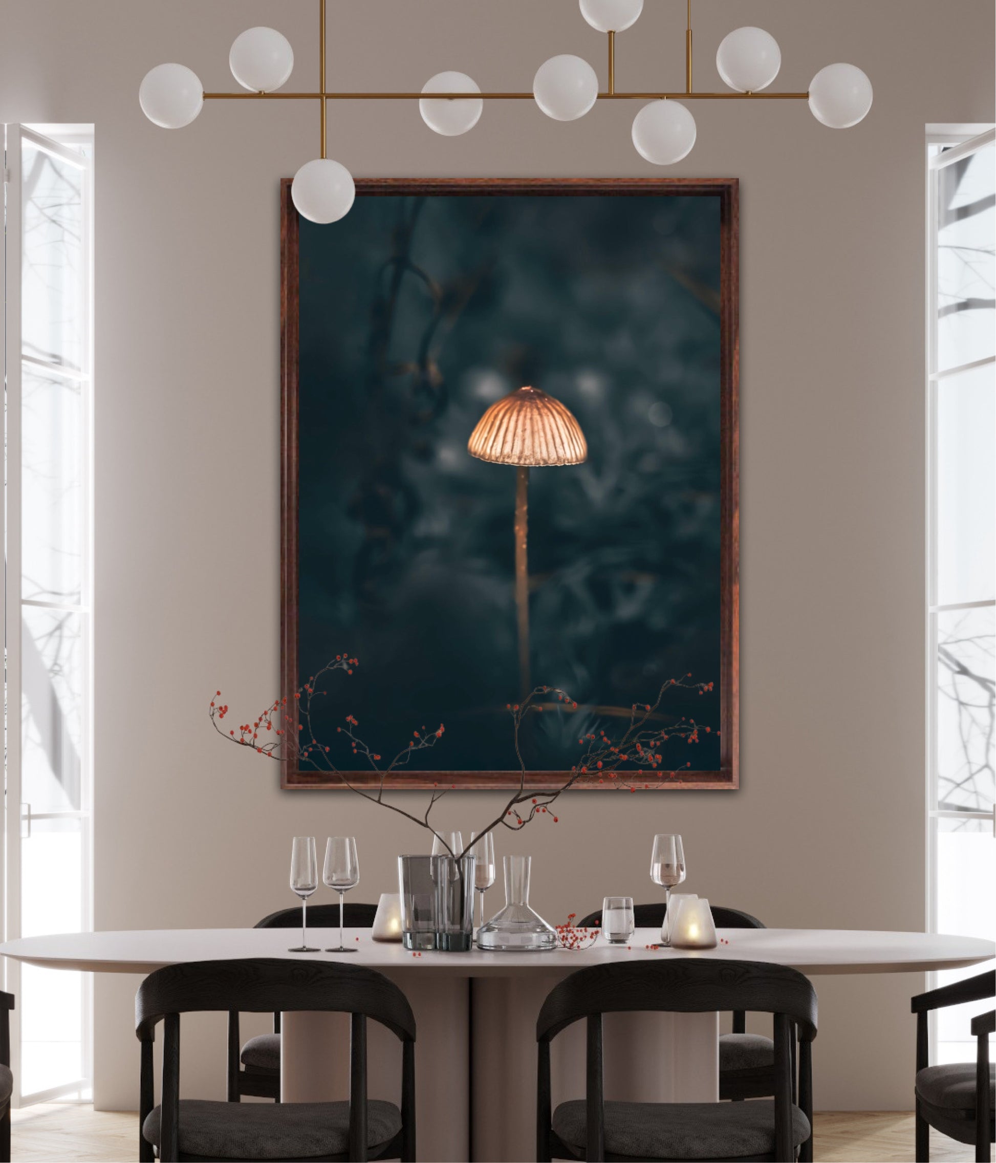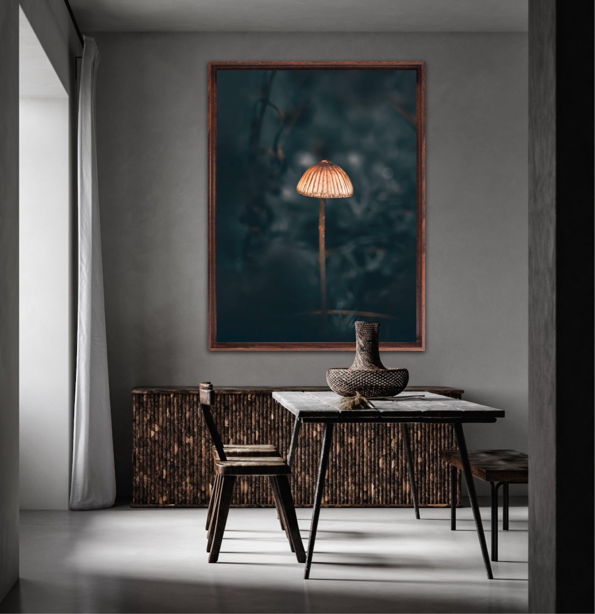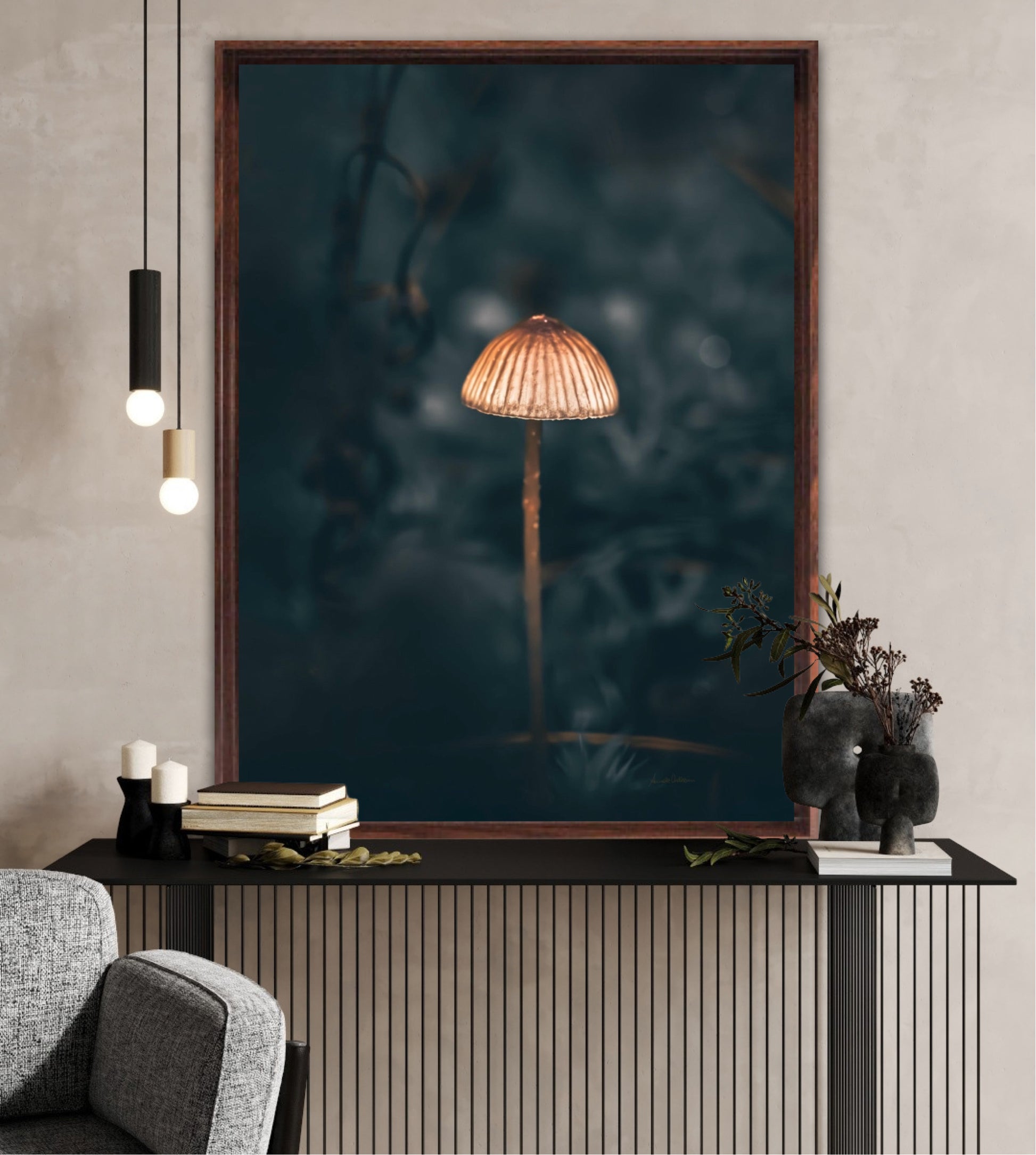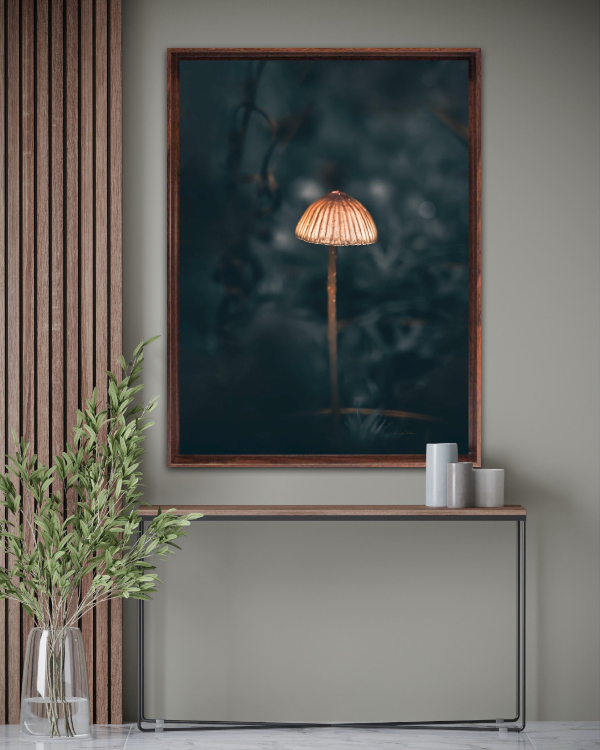 Beautiful photographic wall art of a simple mushroom in brown tones against a dark blue-grey background. This motif is emotional and feeling. What do you feel? Get a lovely and expressive art on your wall today with this beautiful motif.