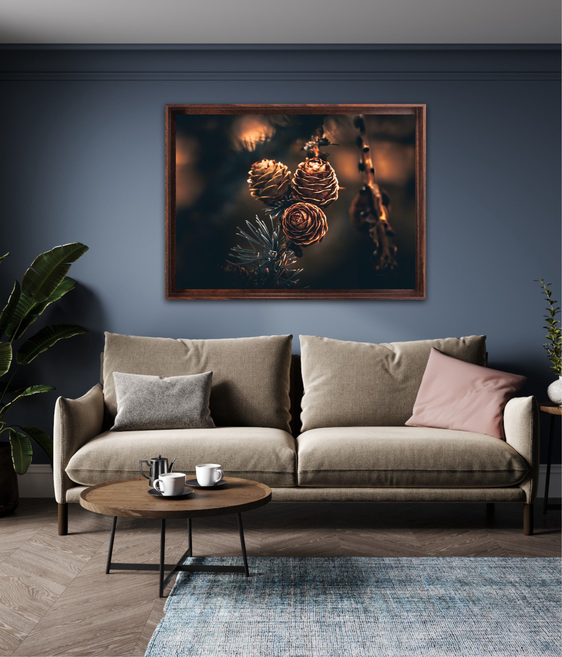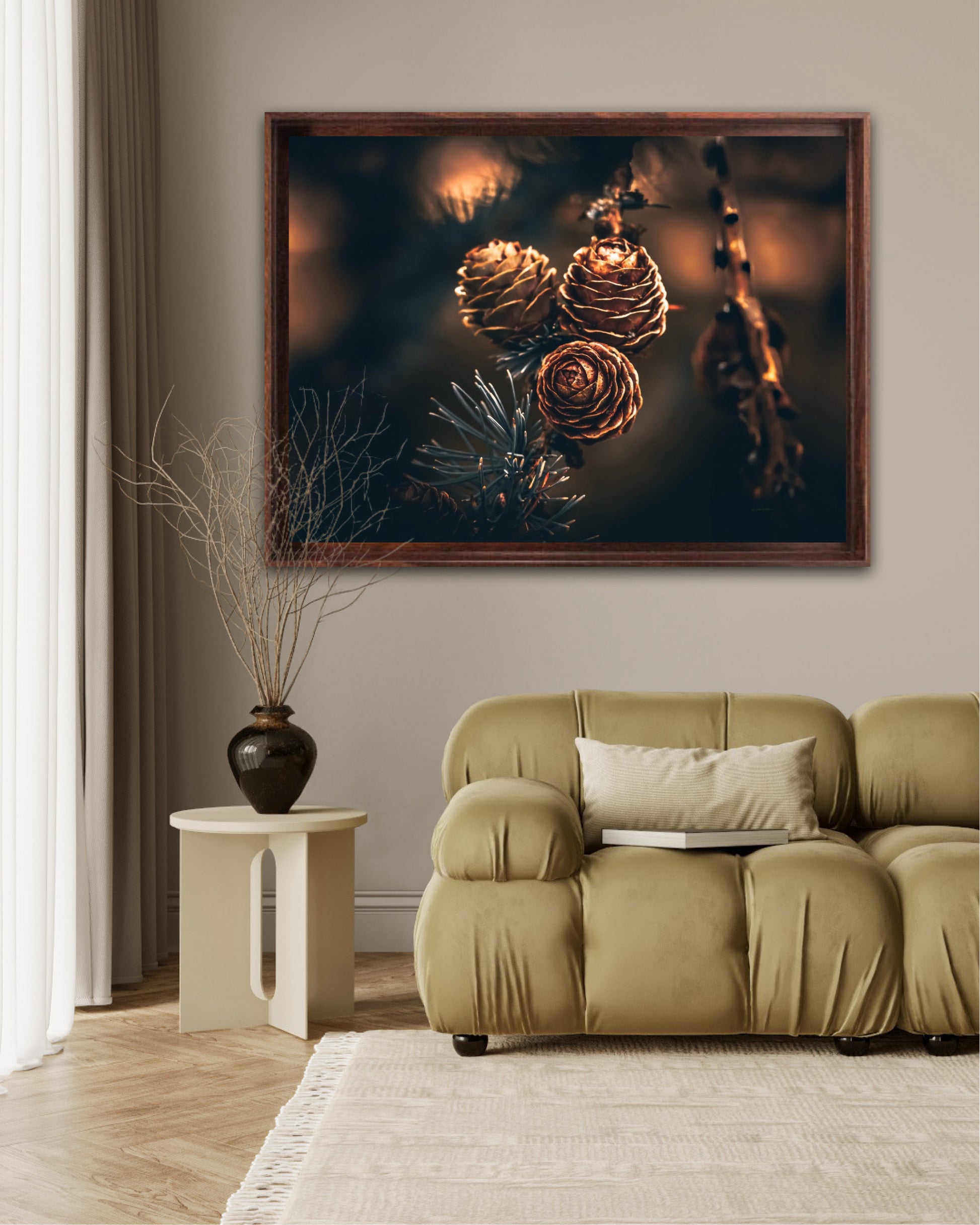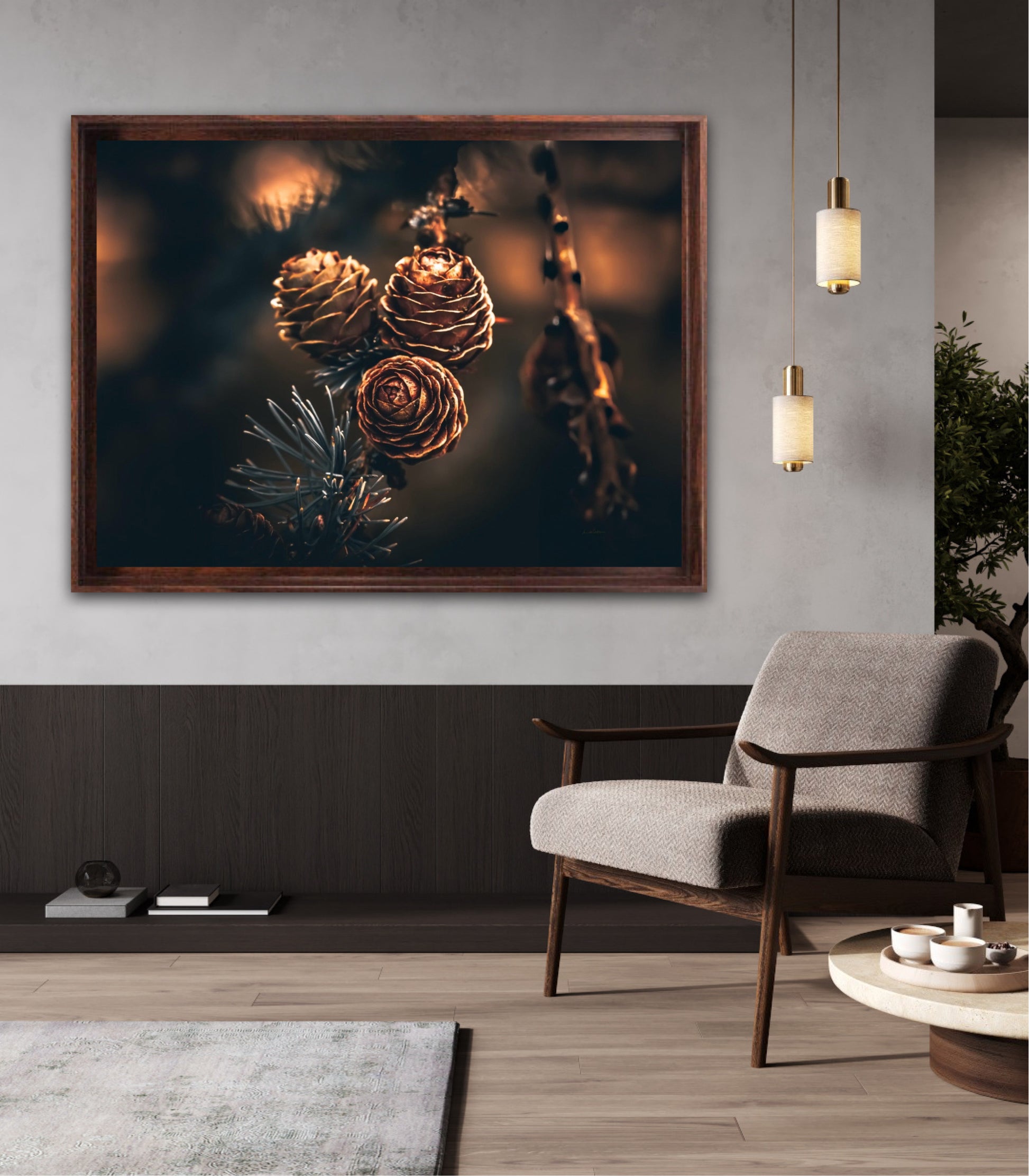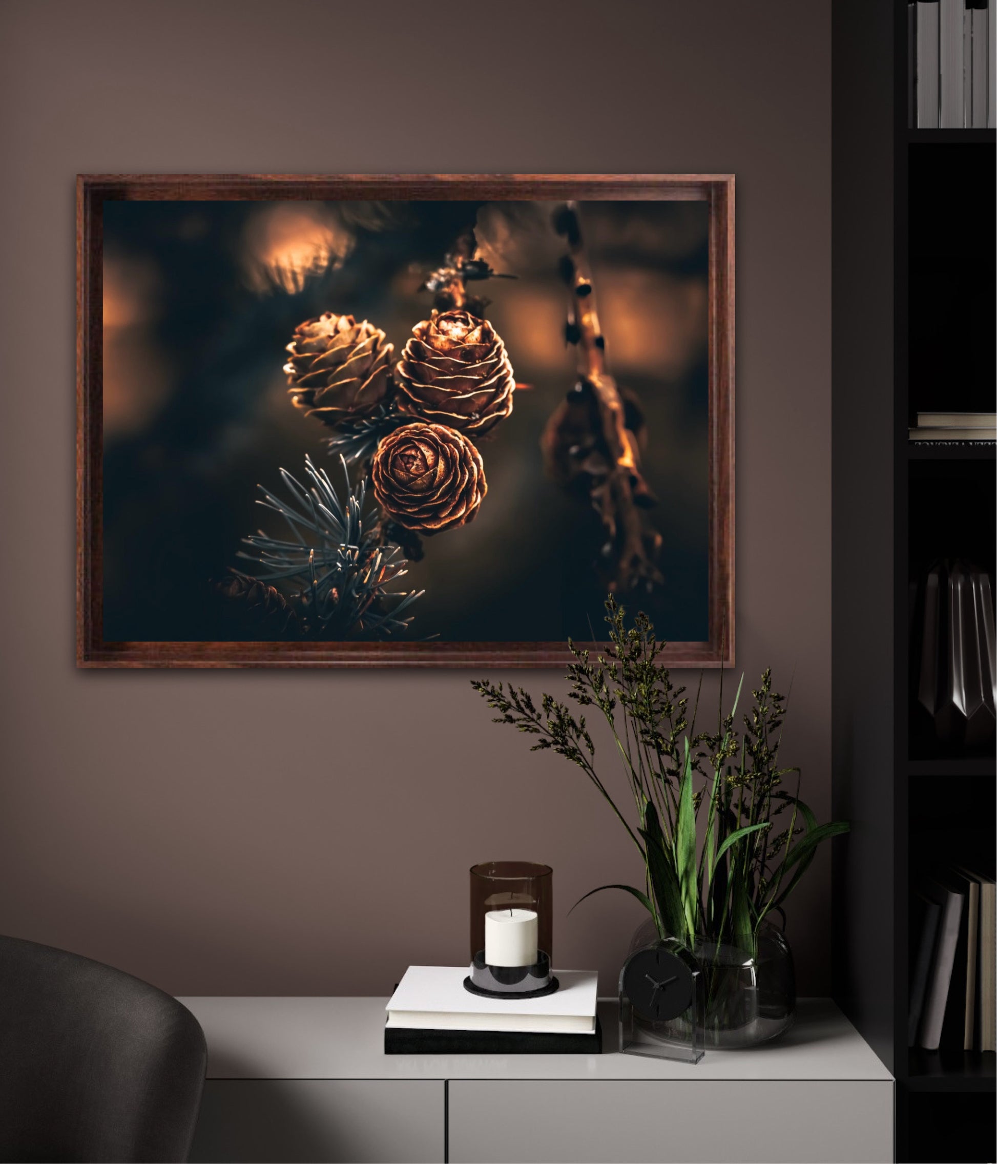 Beautiful photographic wall art of three pinecones in warm, golden tones. Get a wall art that gives hygge and warm atmosphere.