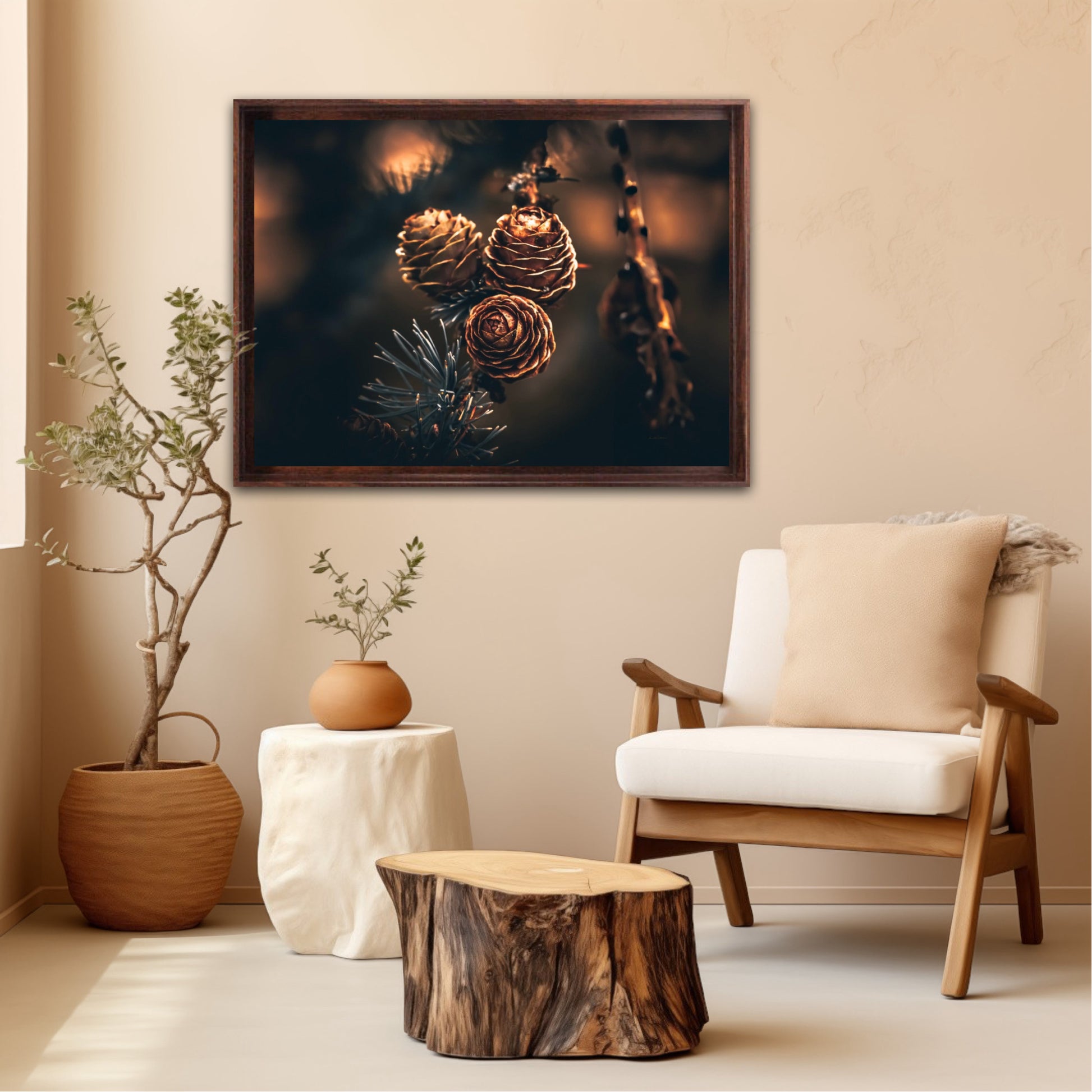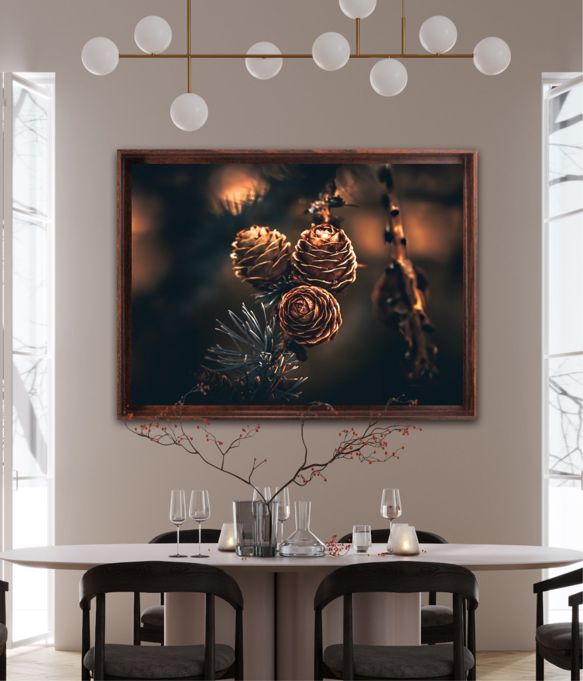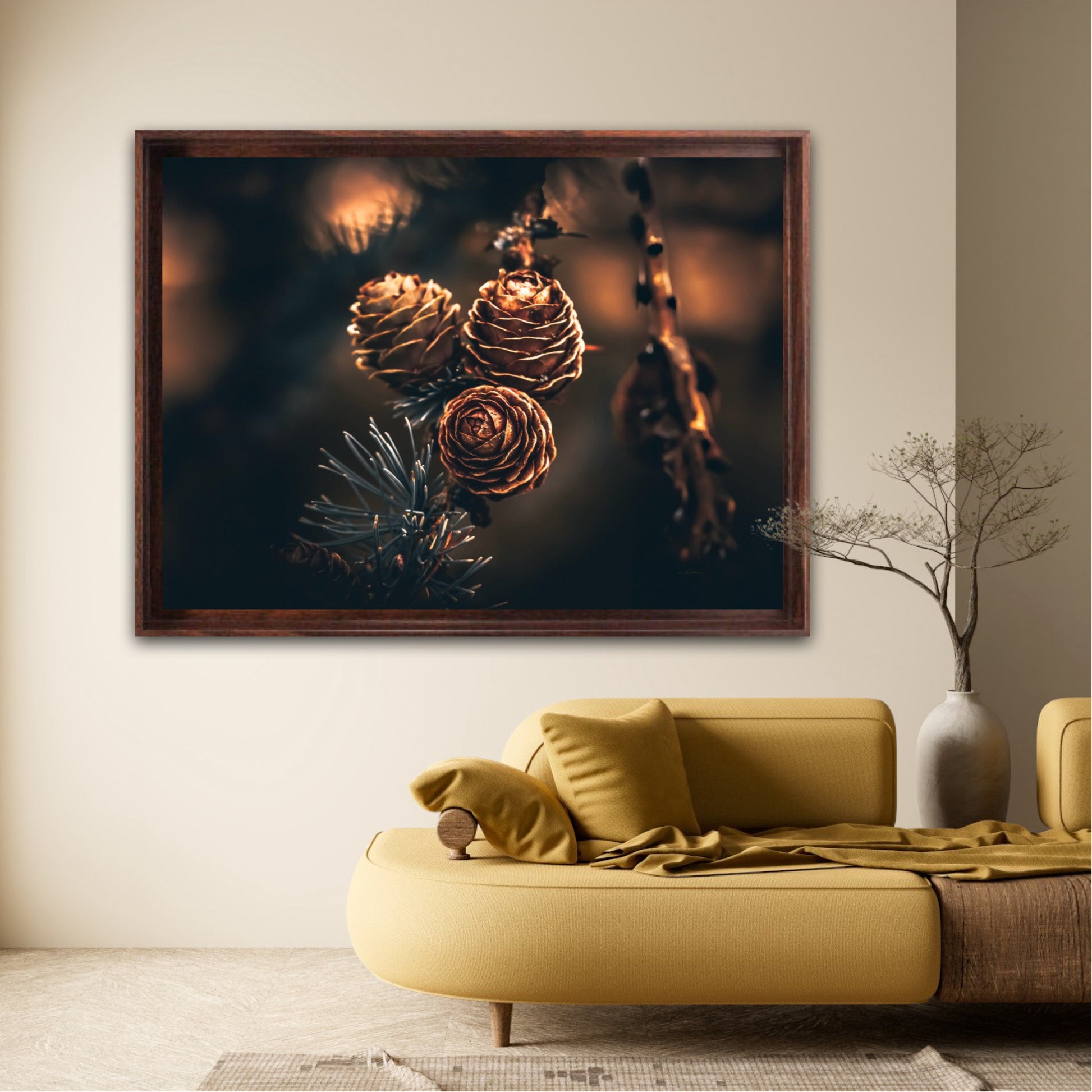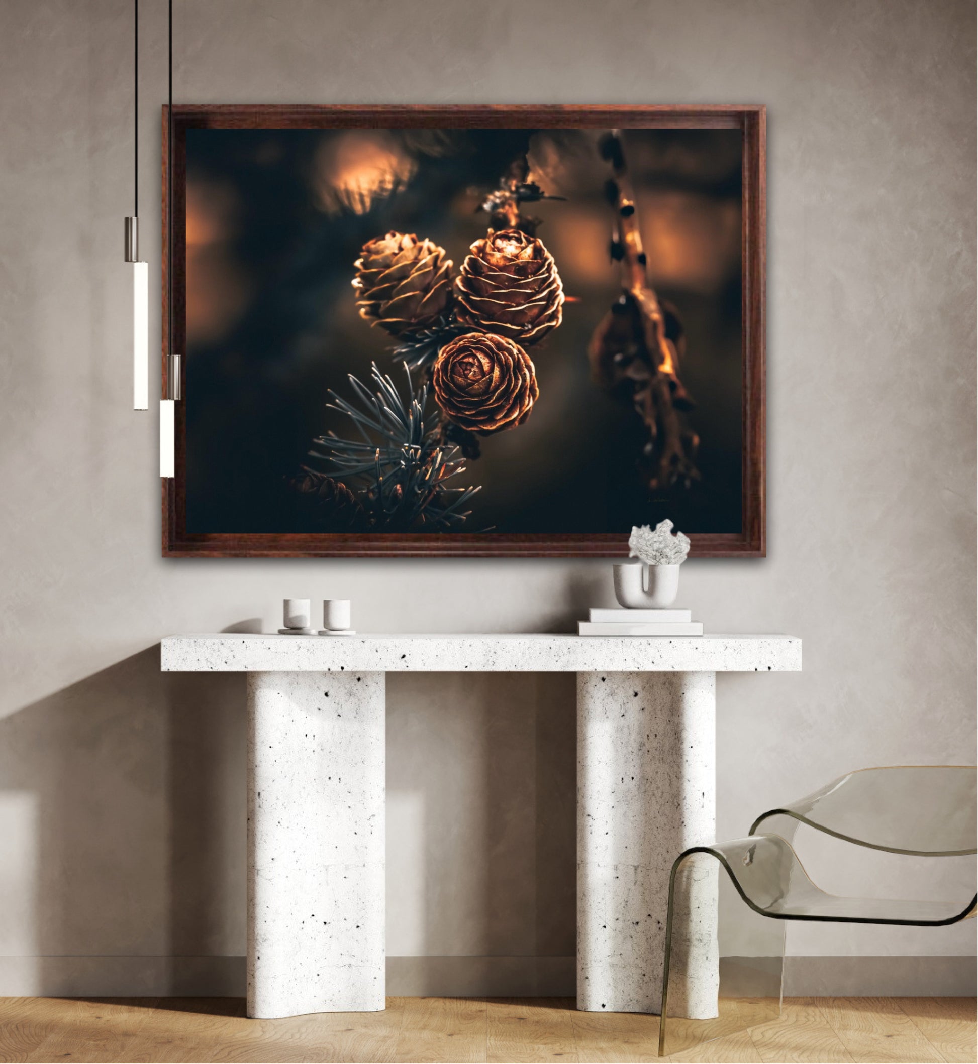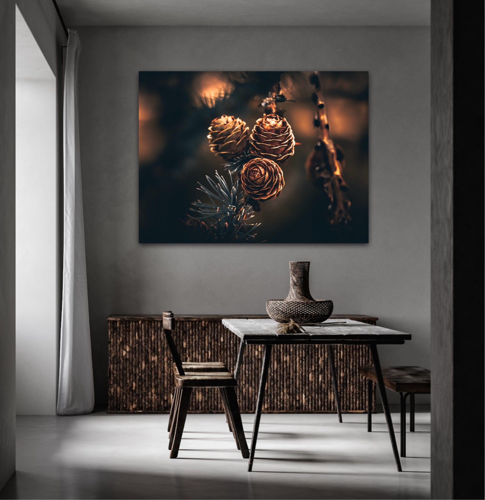 Beautiful photographic wall art of three pinecones in warm, golden tones. Get a wall art that gives hygge and warm atmosphere.
