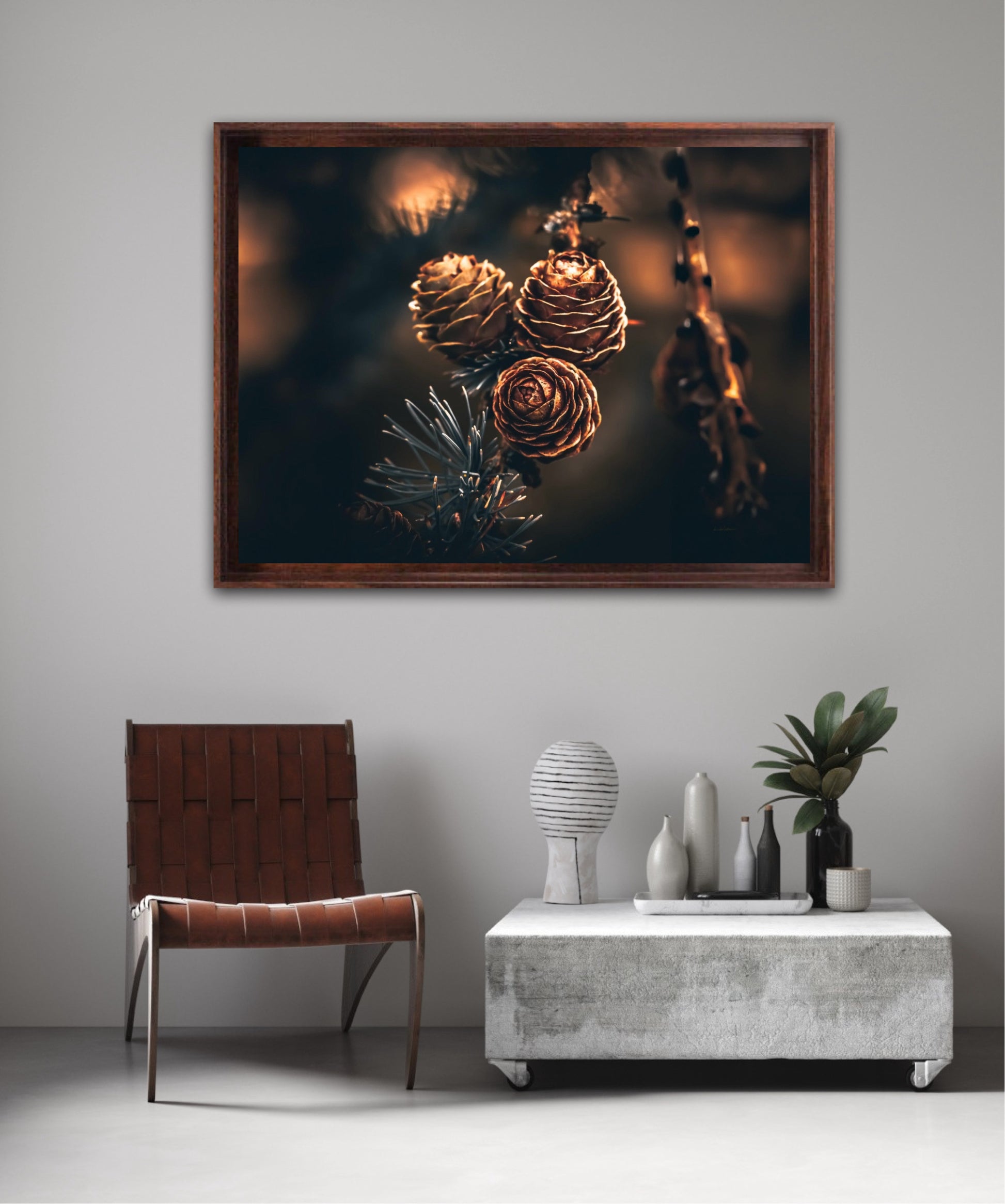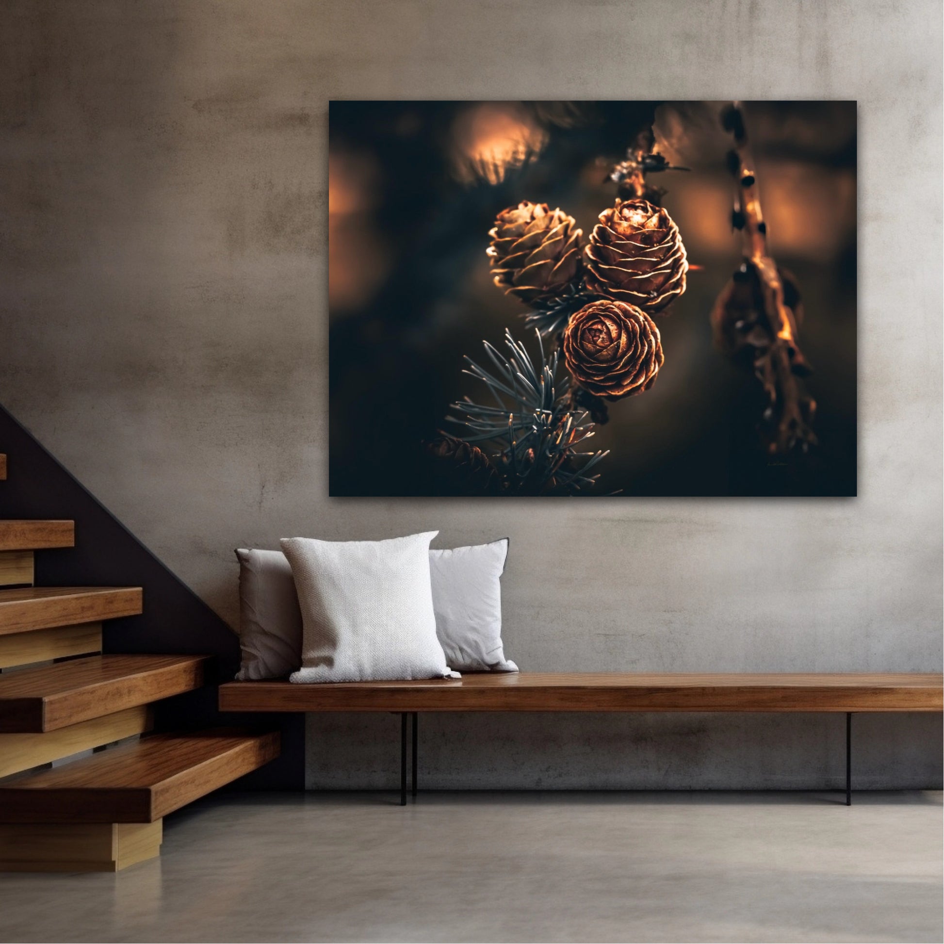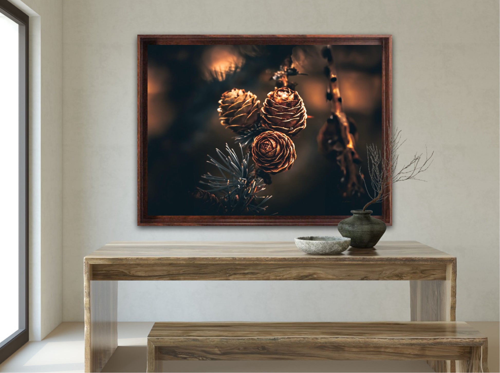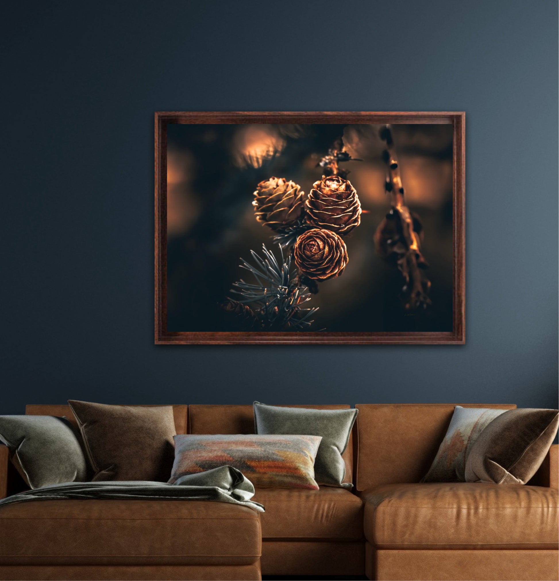Beautiful photographic wall art of three pinecones in warm, golden tones. Get a wall art that gives hygge and warm atmosphere.