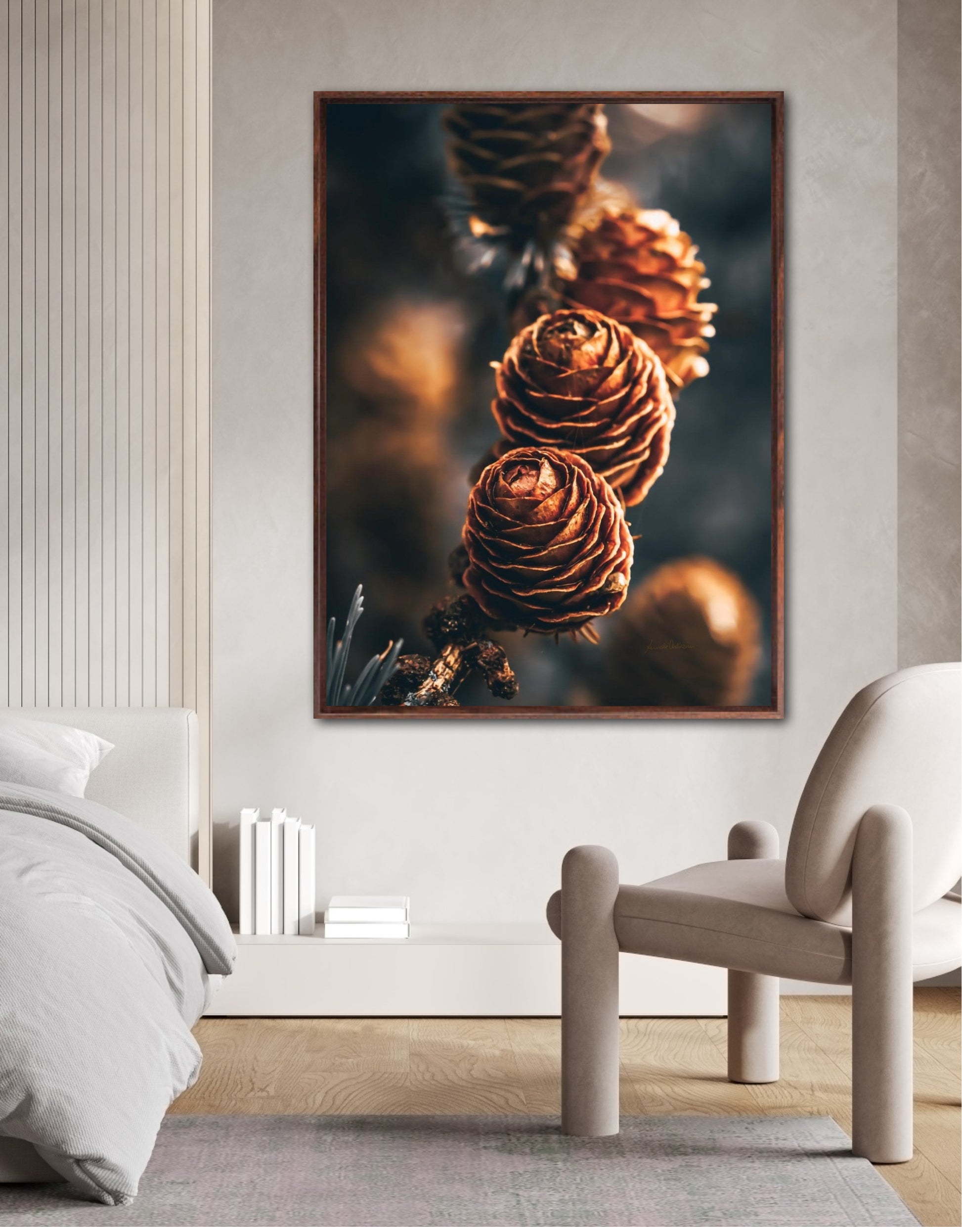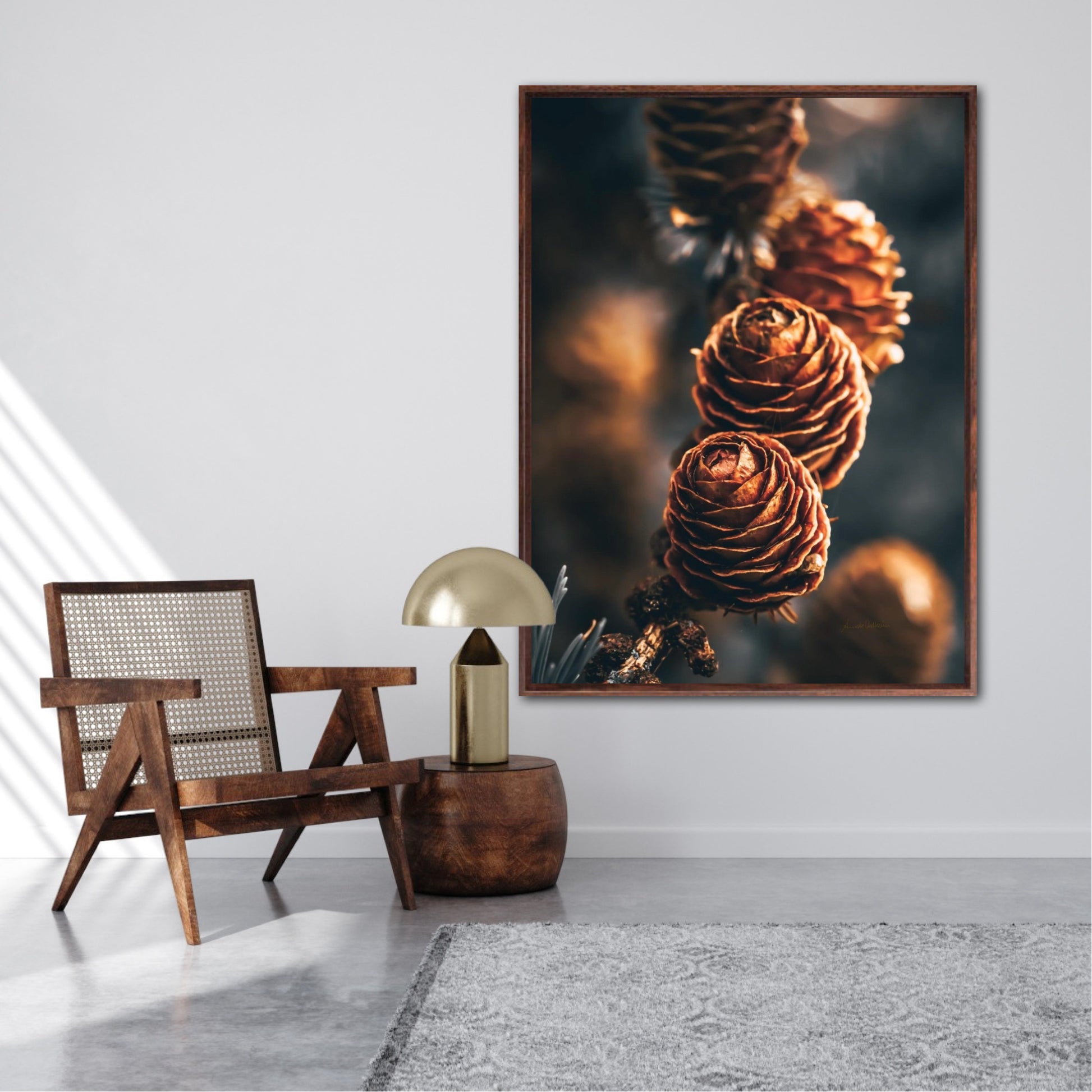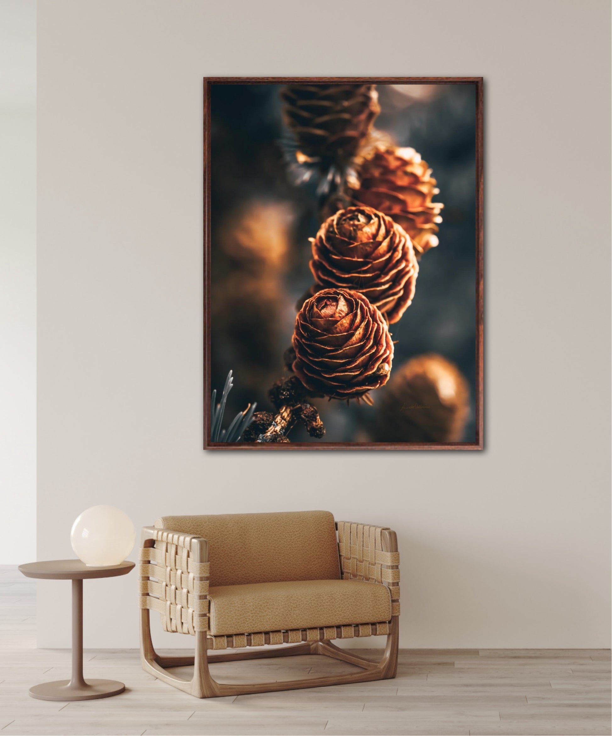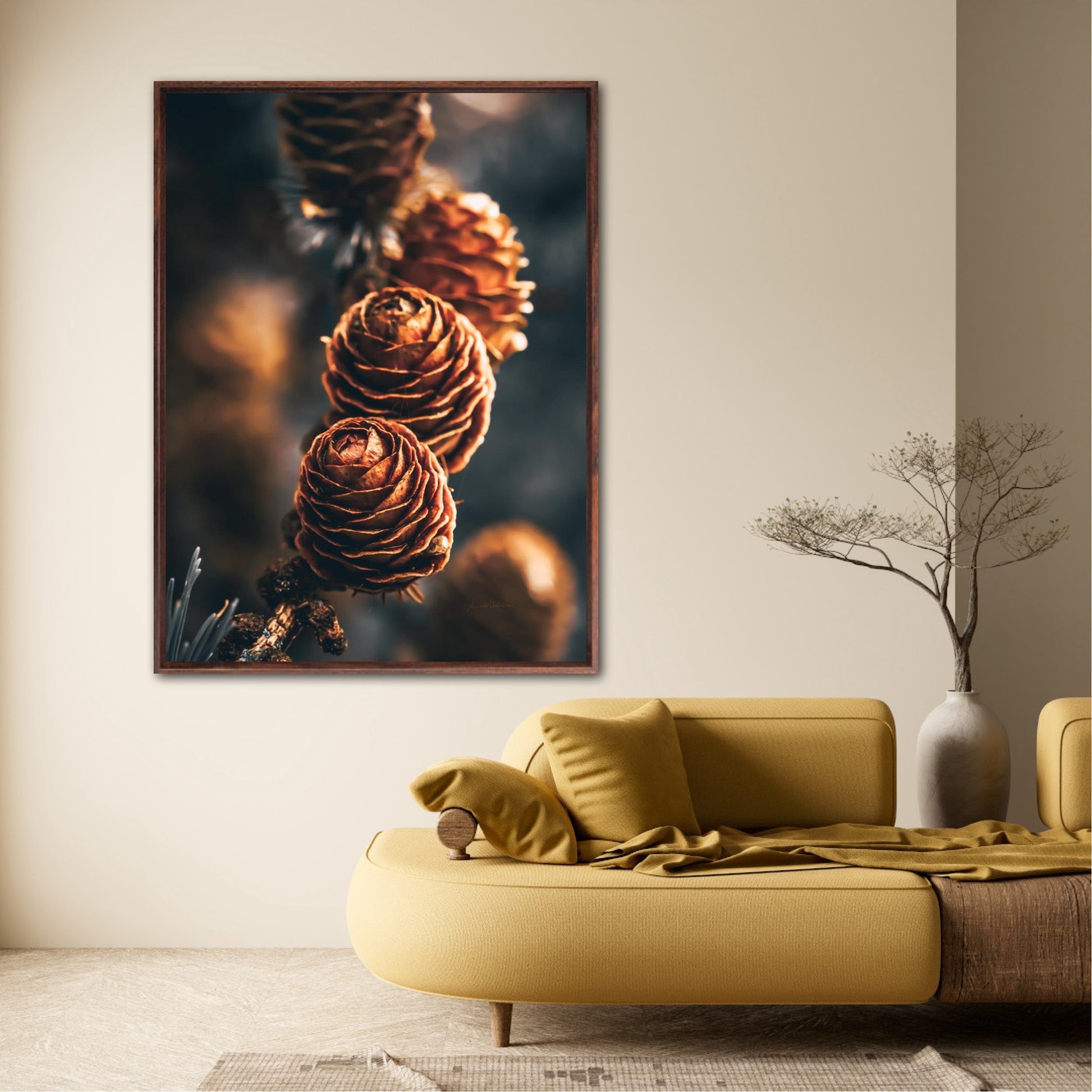 Beautiful photographic wall art of a three pinecones in golden light tones, with beautiful details and dramatic light. This artwork will make you feel grounded and at piece.