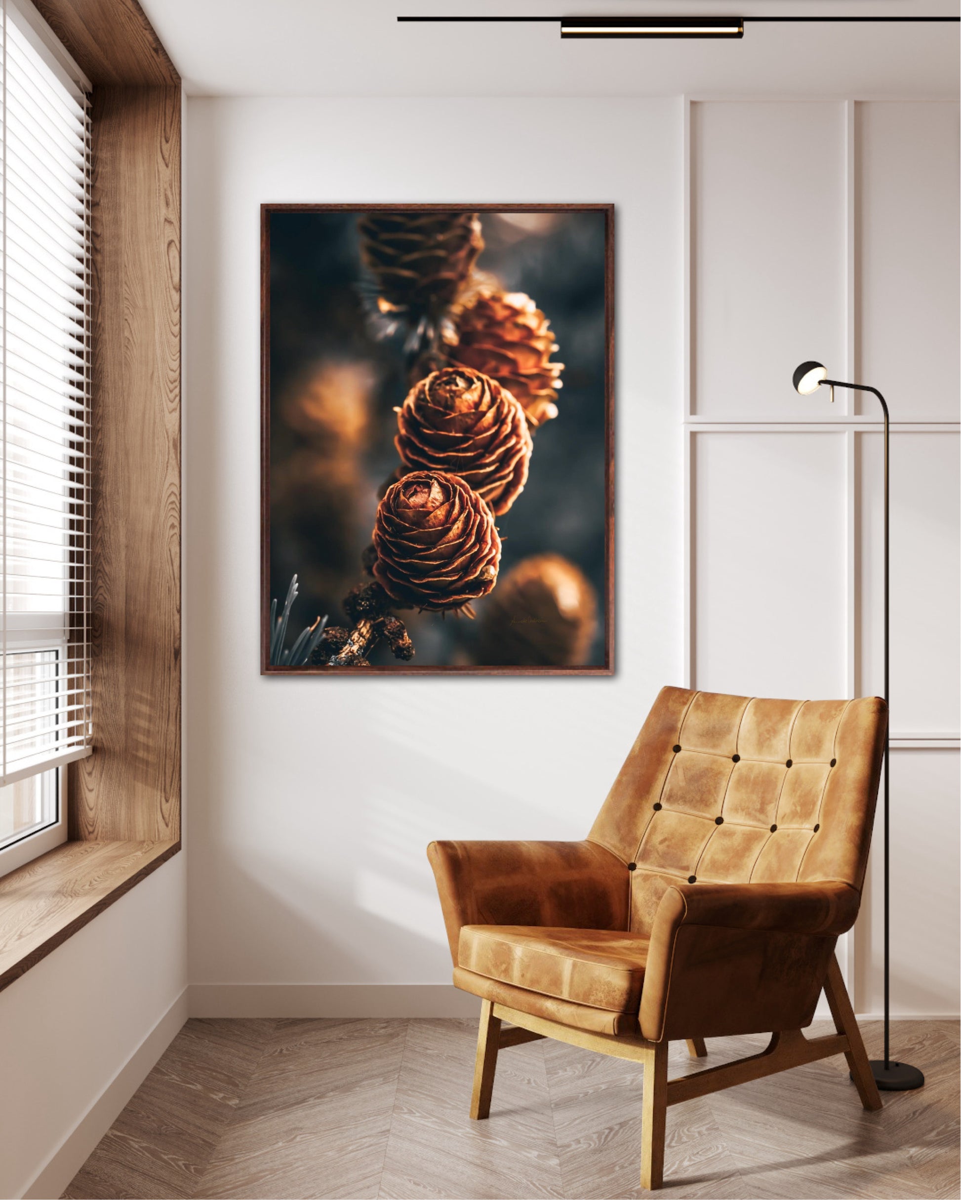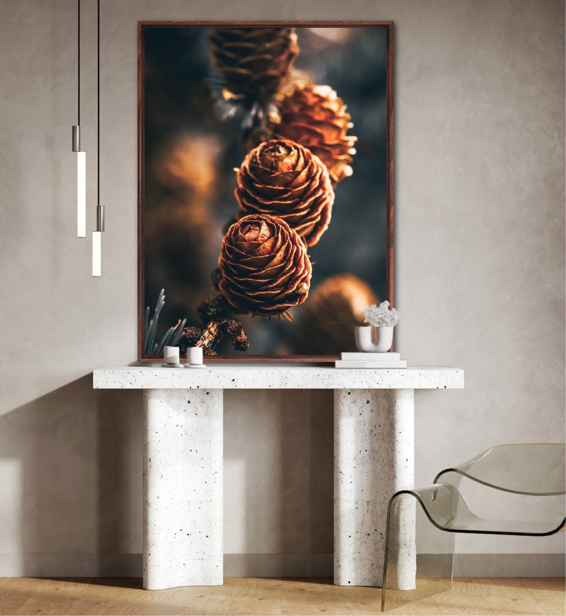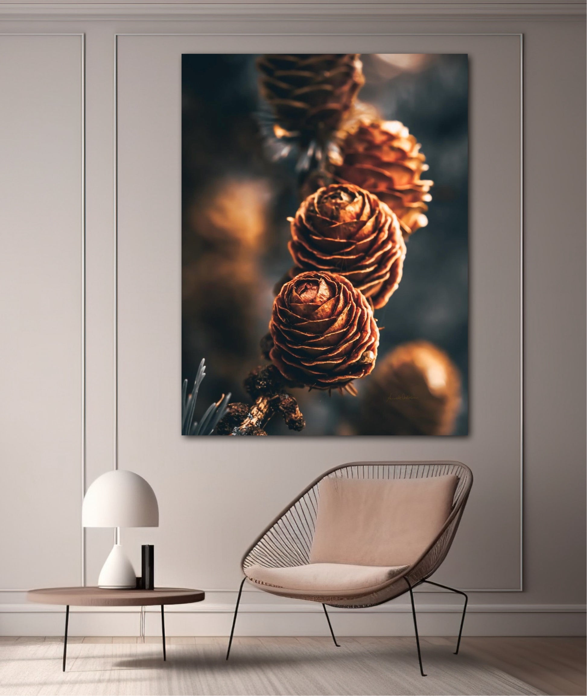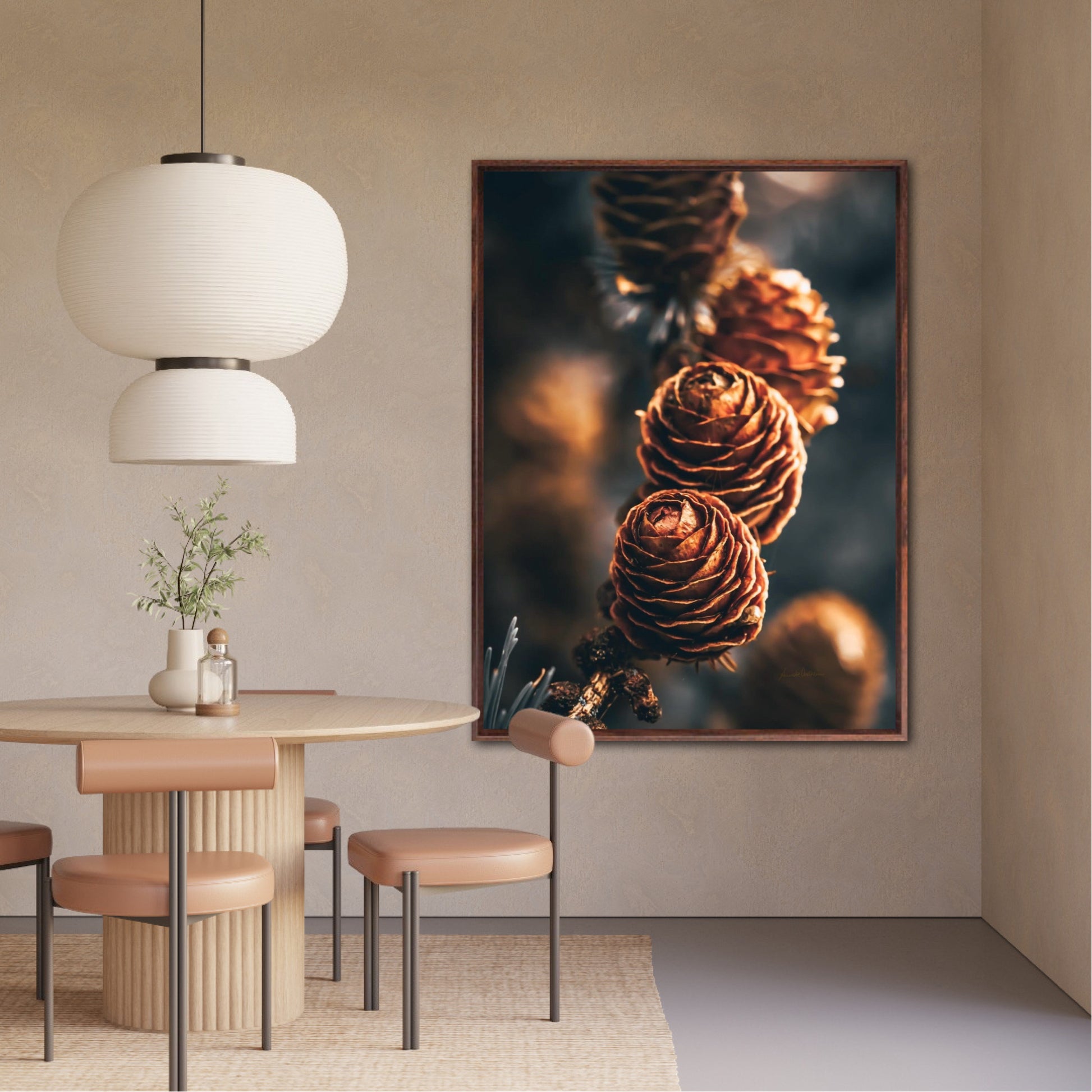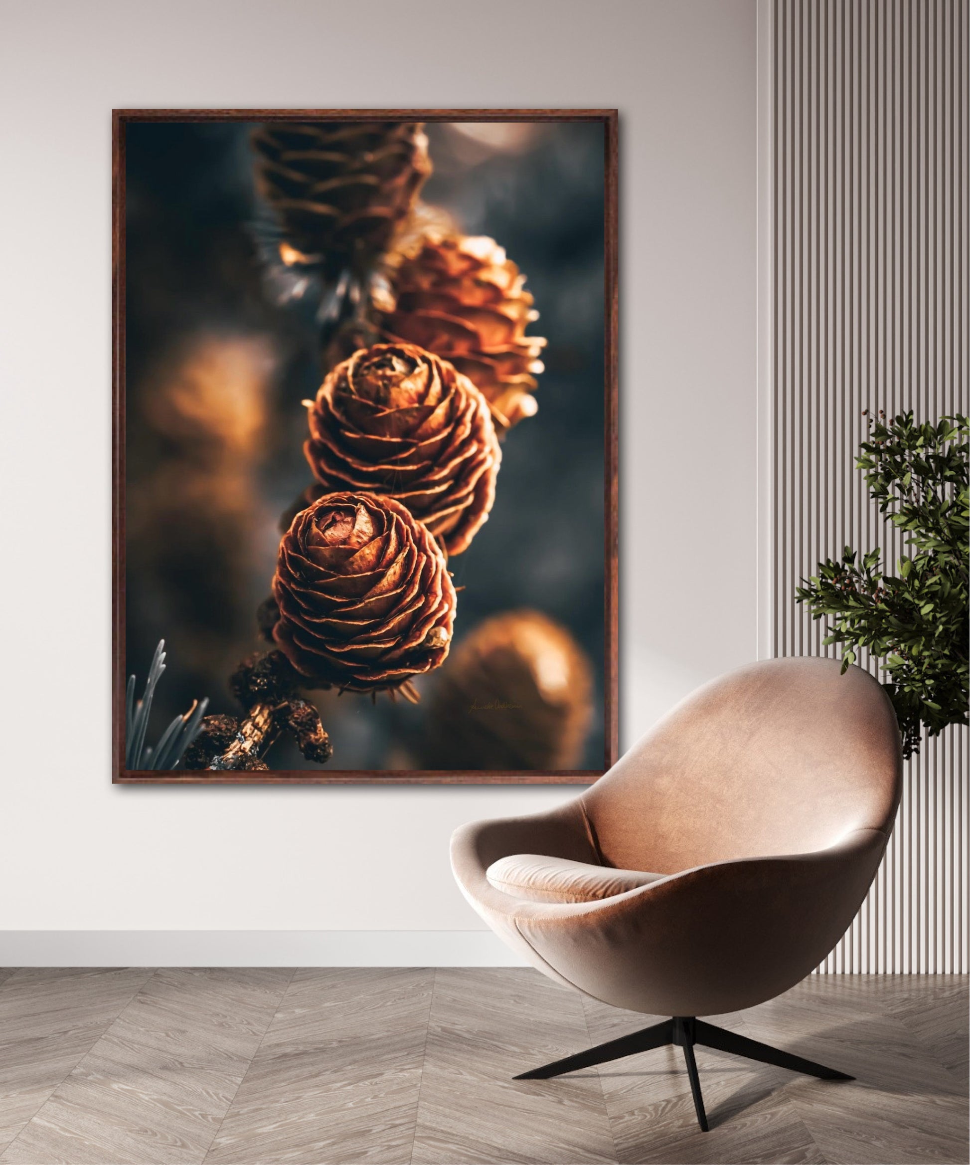 Beautiful photographic wall art of a three pinecones in golden light tones, with beautiful details and dramatic light. This artwork will make you feel grounded and at piece.