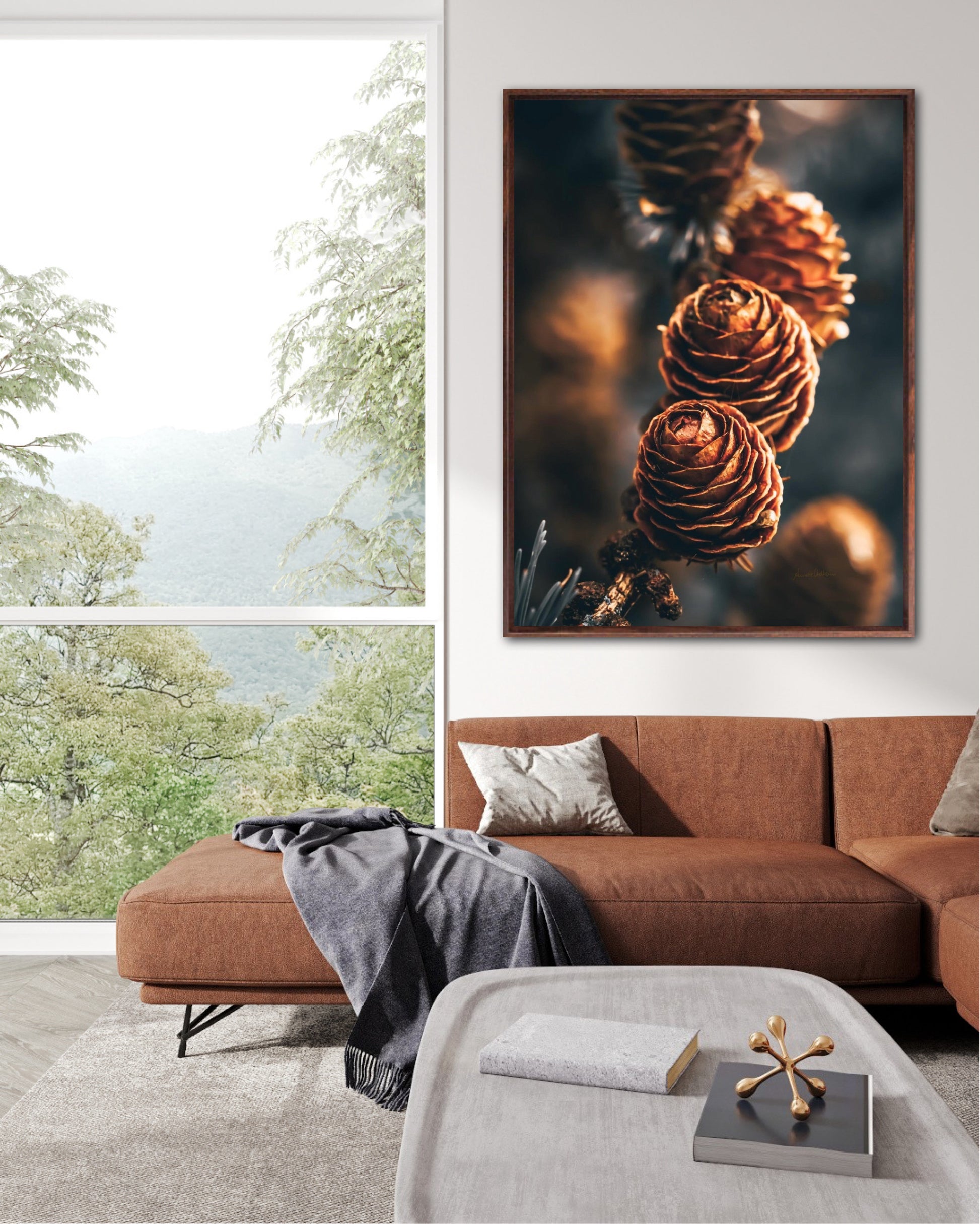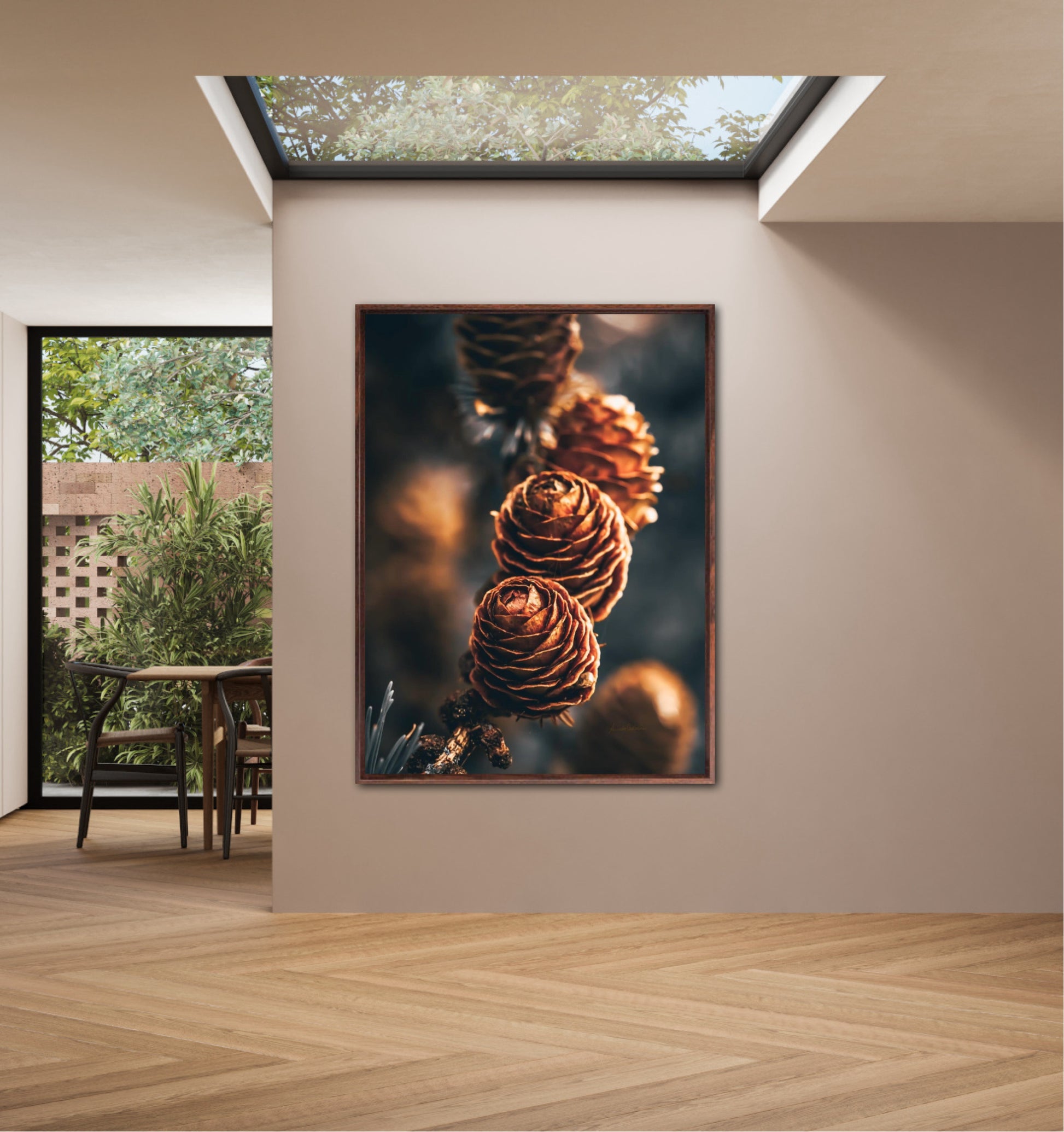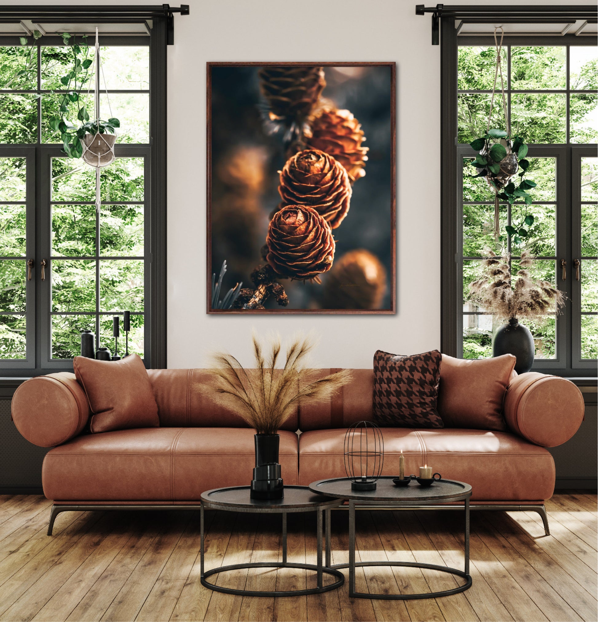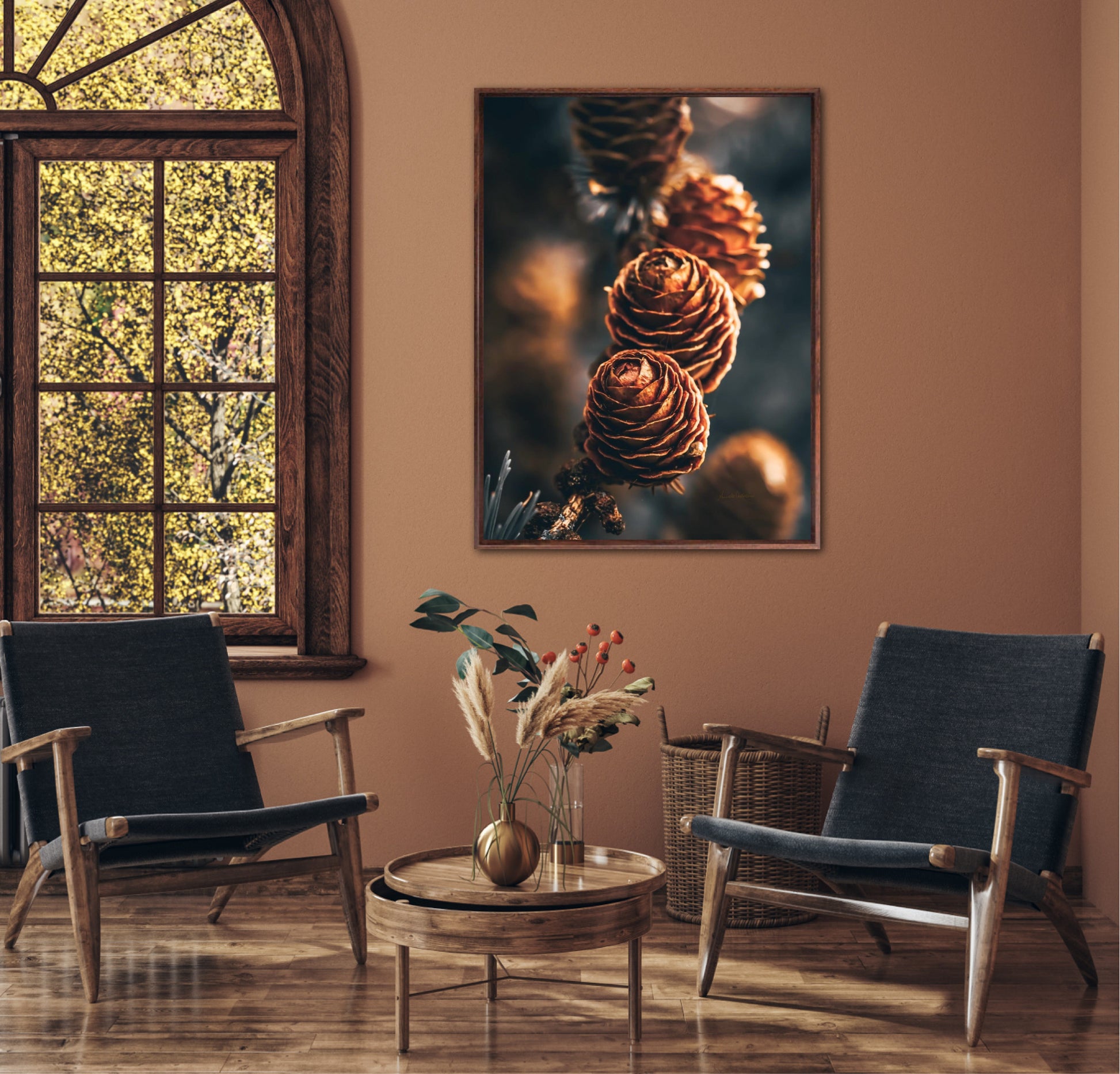 Beautiful photographic wall art of a three pinecones in golden light tones, with beautiful details and dramatic light. This artwork will make you feel grounded and at piece.