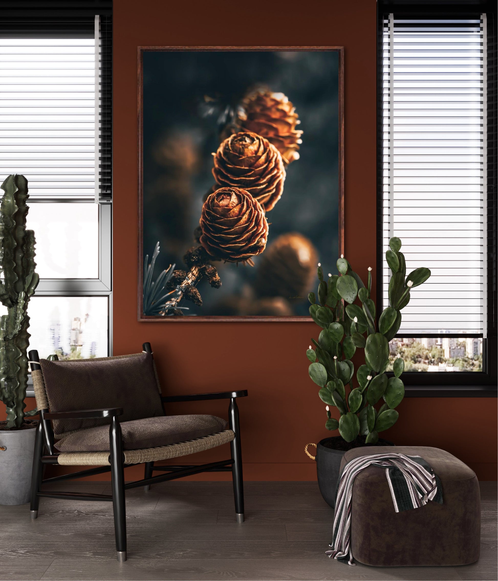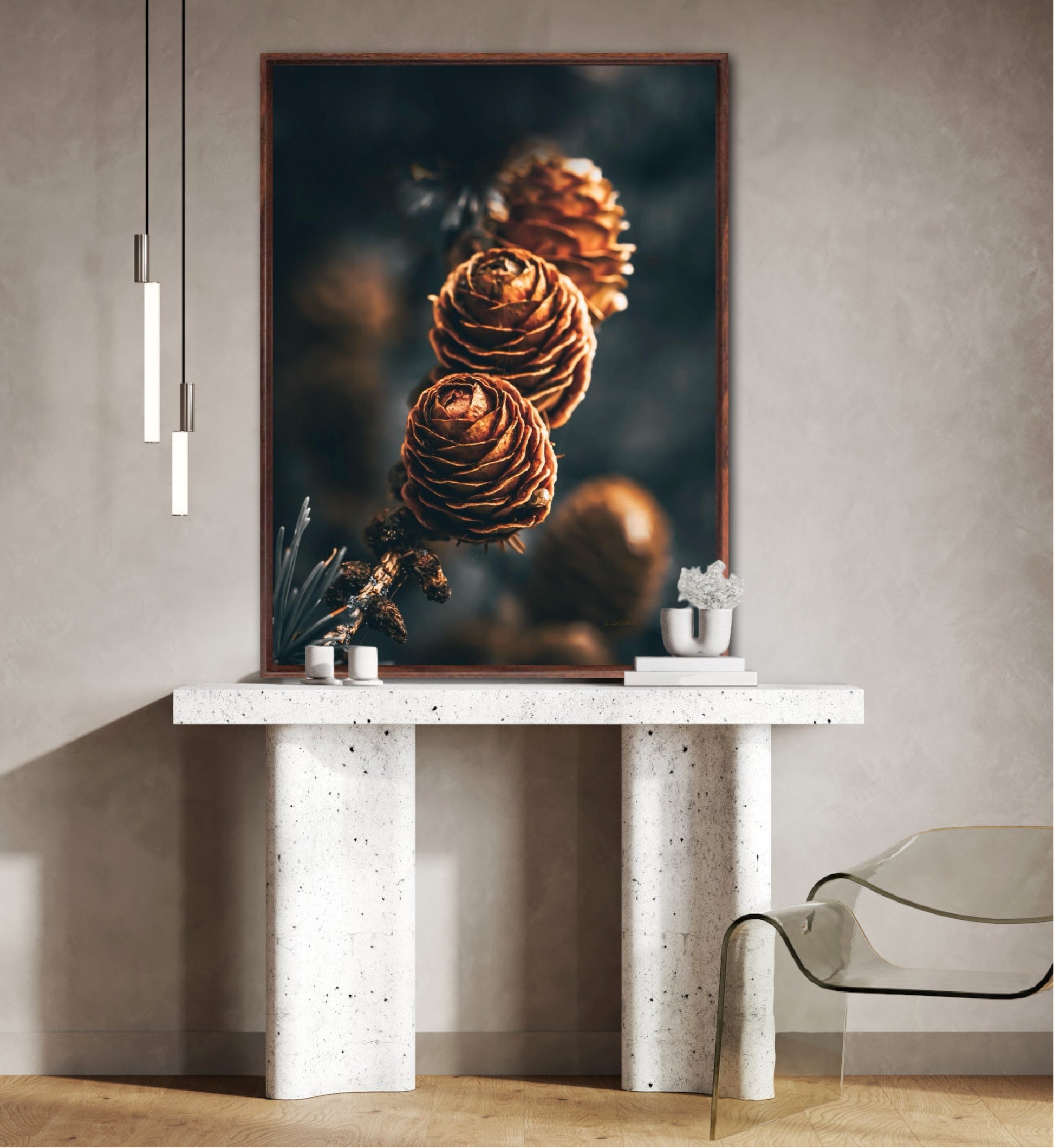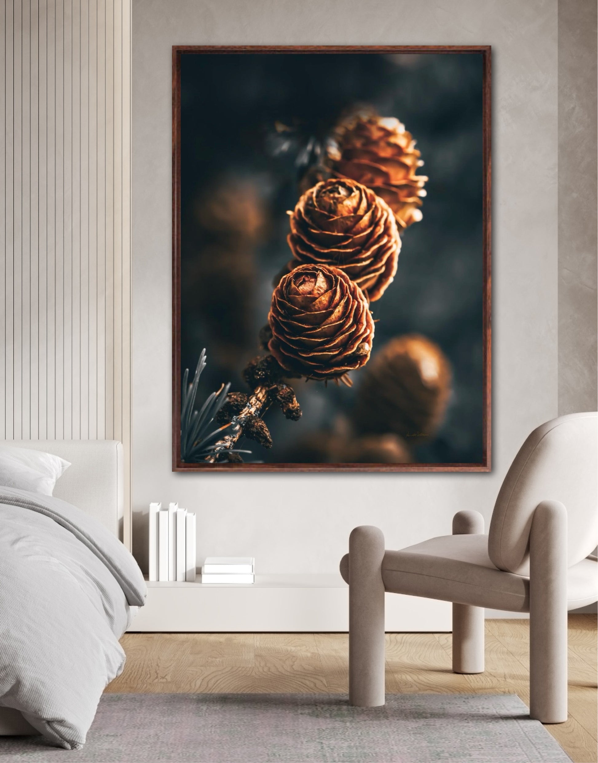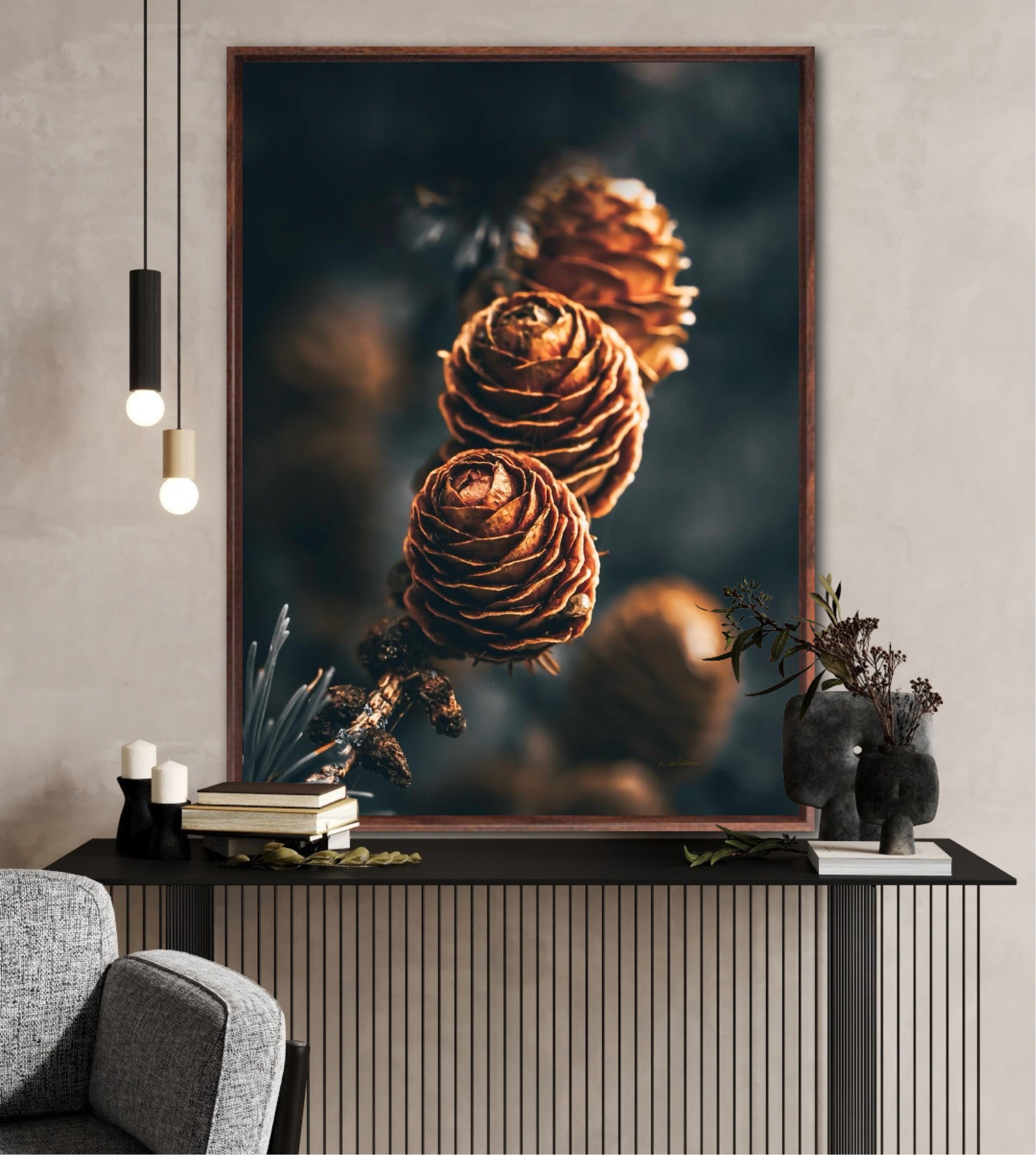 Beautiful photographic wall art of a three pinecones in golden light tones, with beautiful details and dramatic light. This artwork will make you feel grounded and at piece.