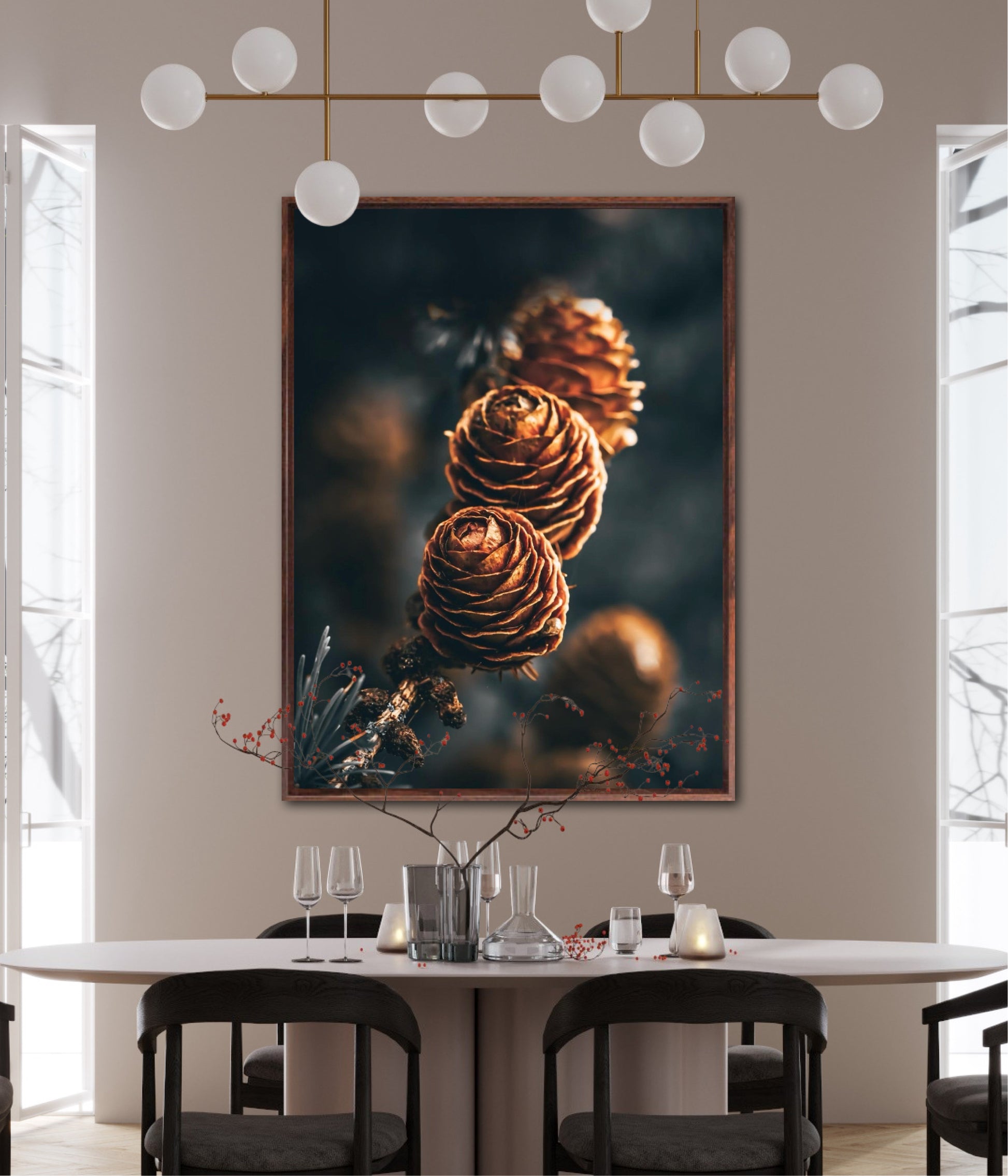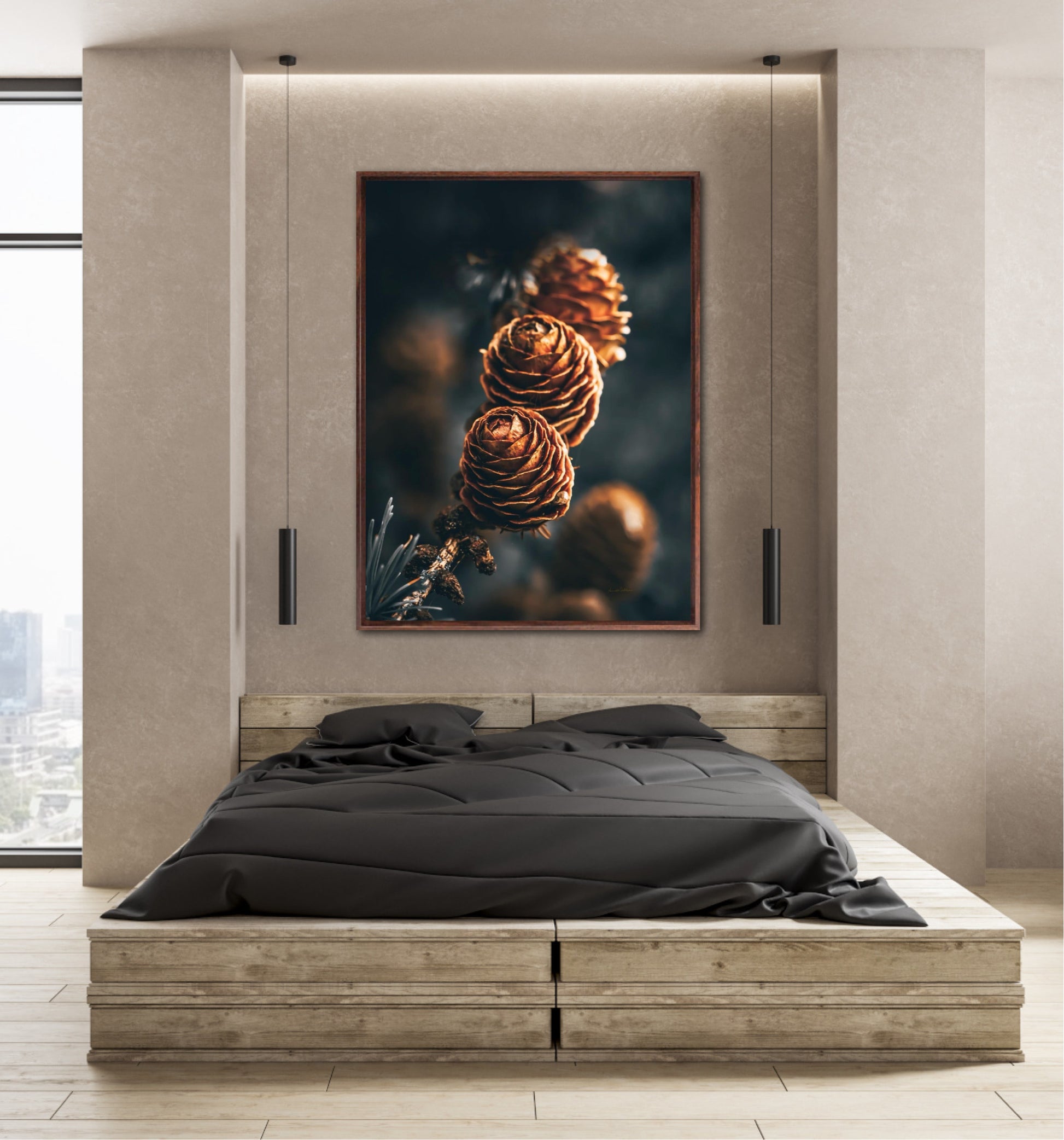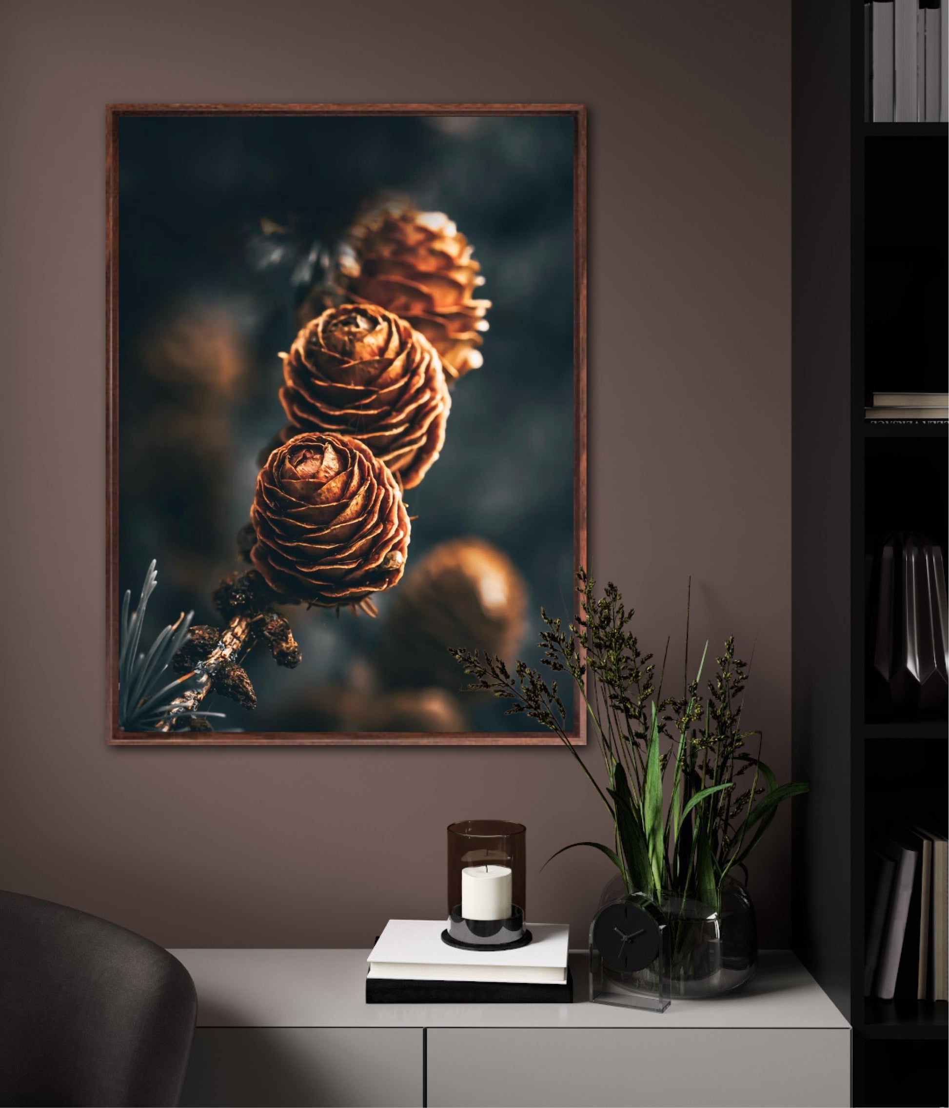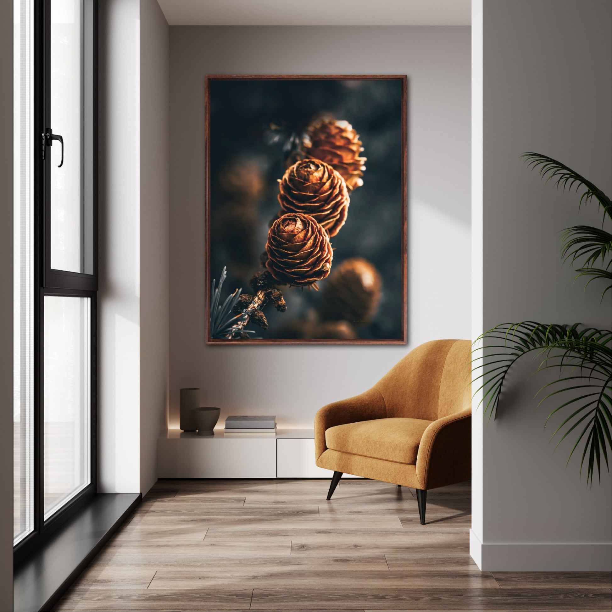 Beautiful photographic wall art of a three pinecones in golden light tones, with beautiful details and dramatic light. This artwork will make you feel grounded and at piece.