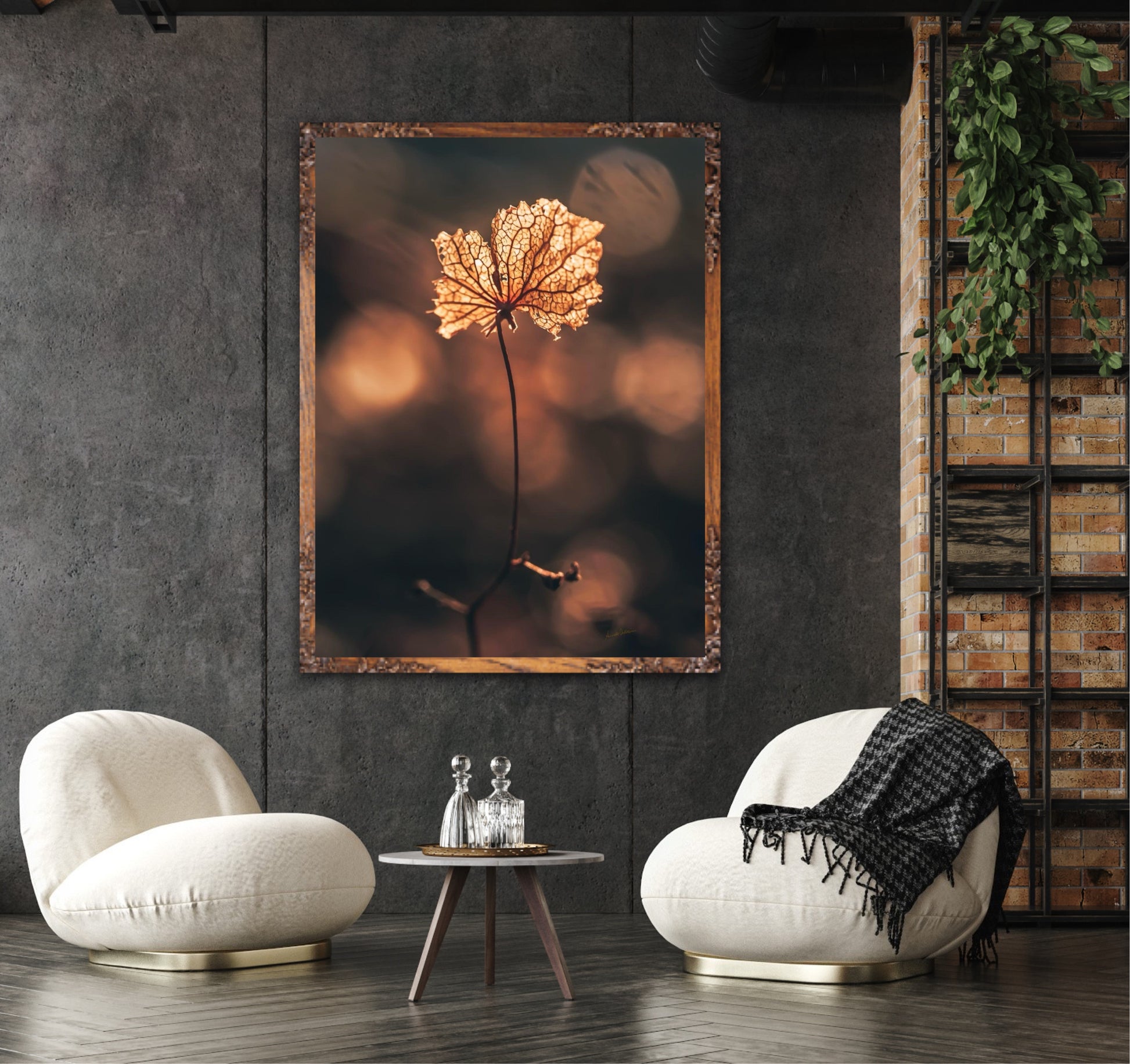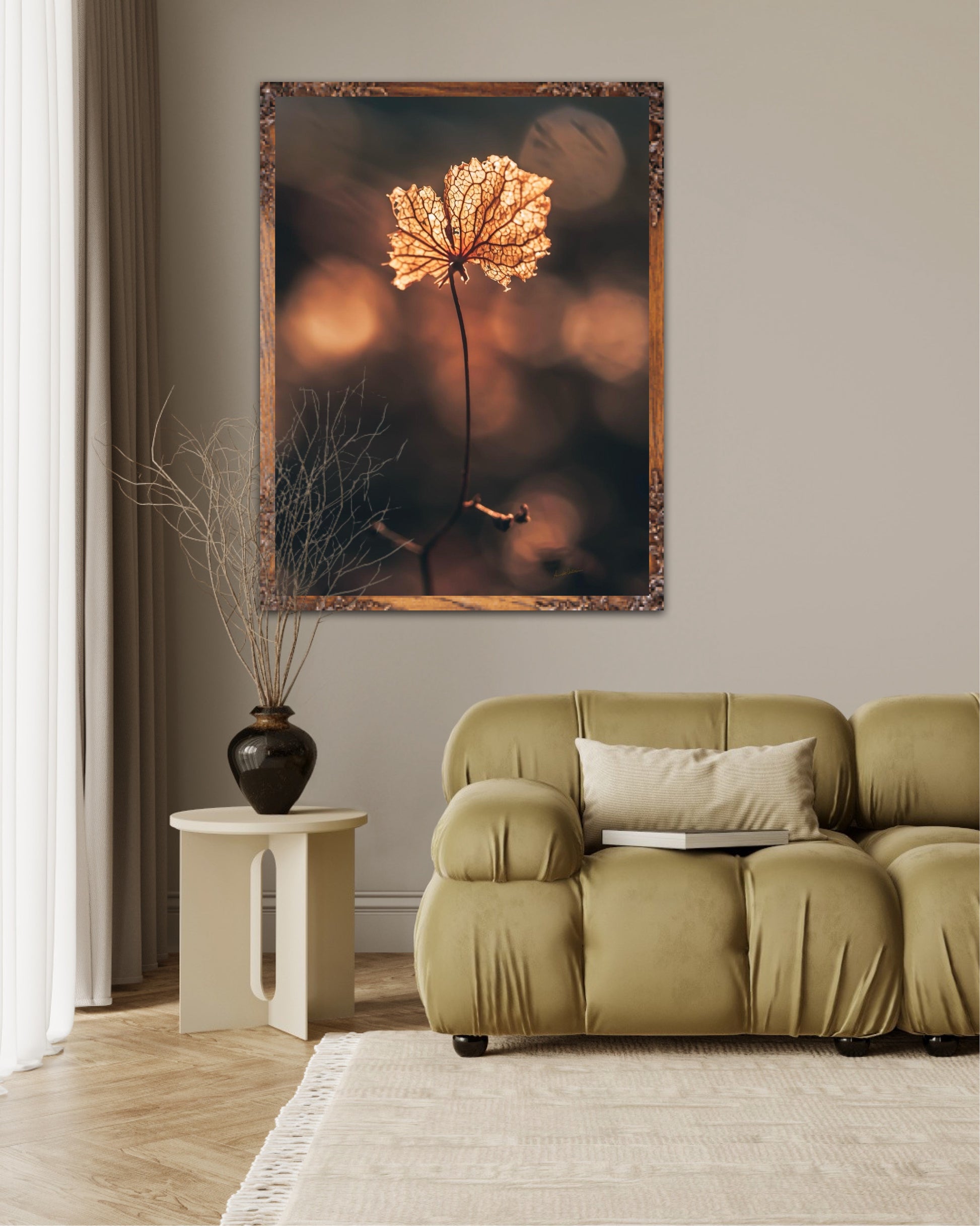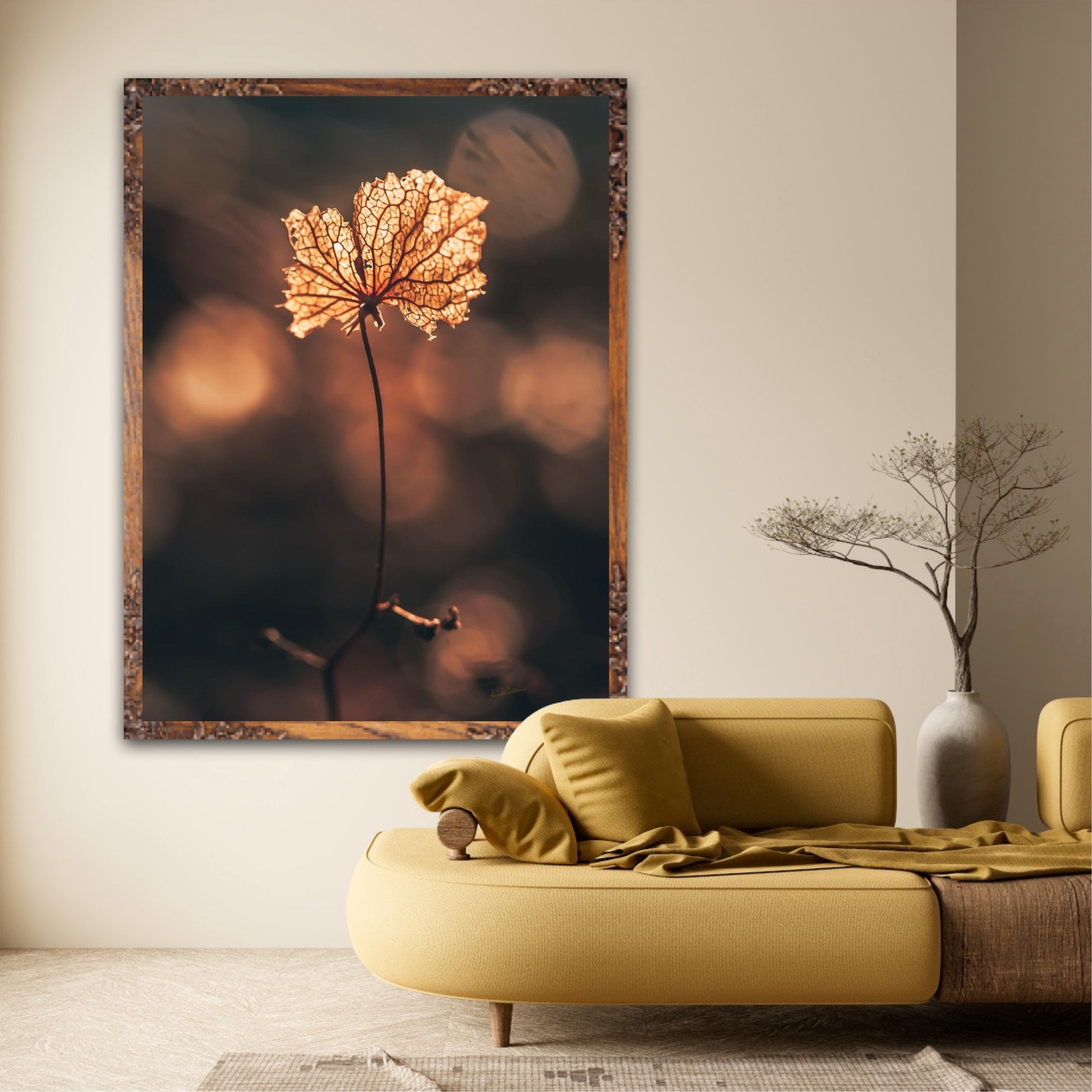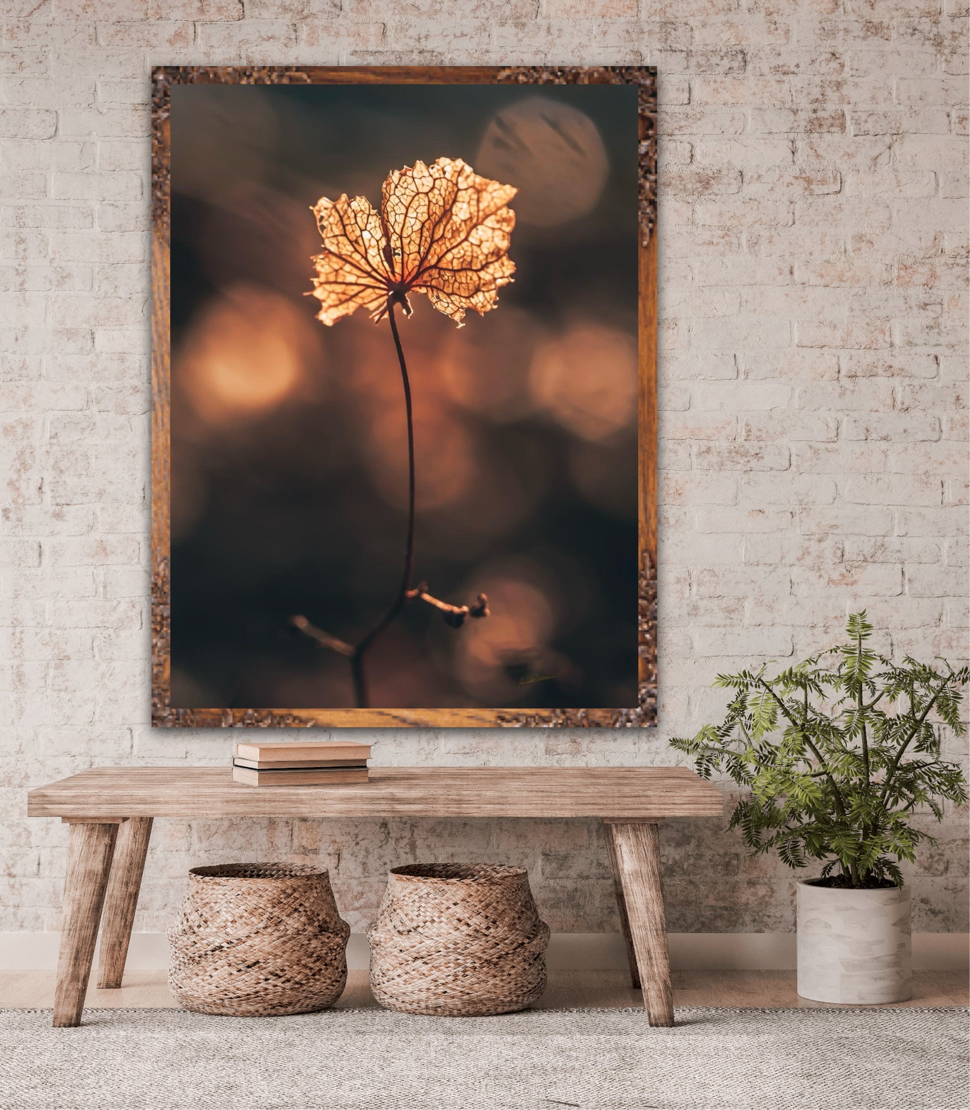 Beautiful photographic wall art of a dried Hydrangea in a wonderful and emotional posture, in warm golden light. This artwork will make you feel grounded and at peace.