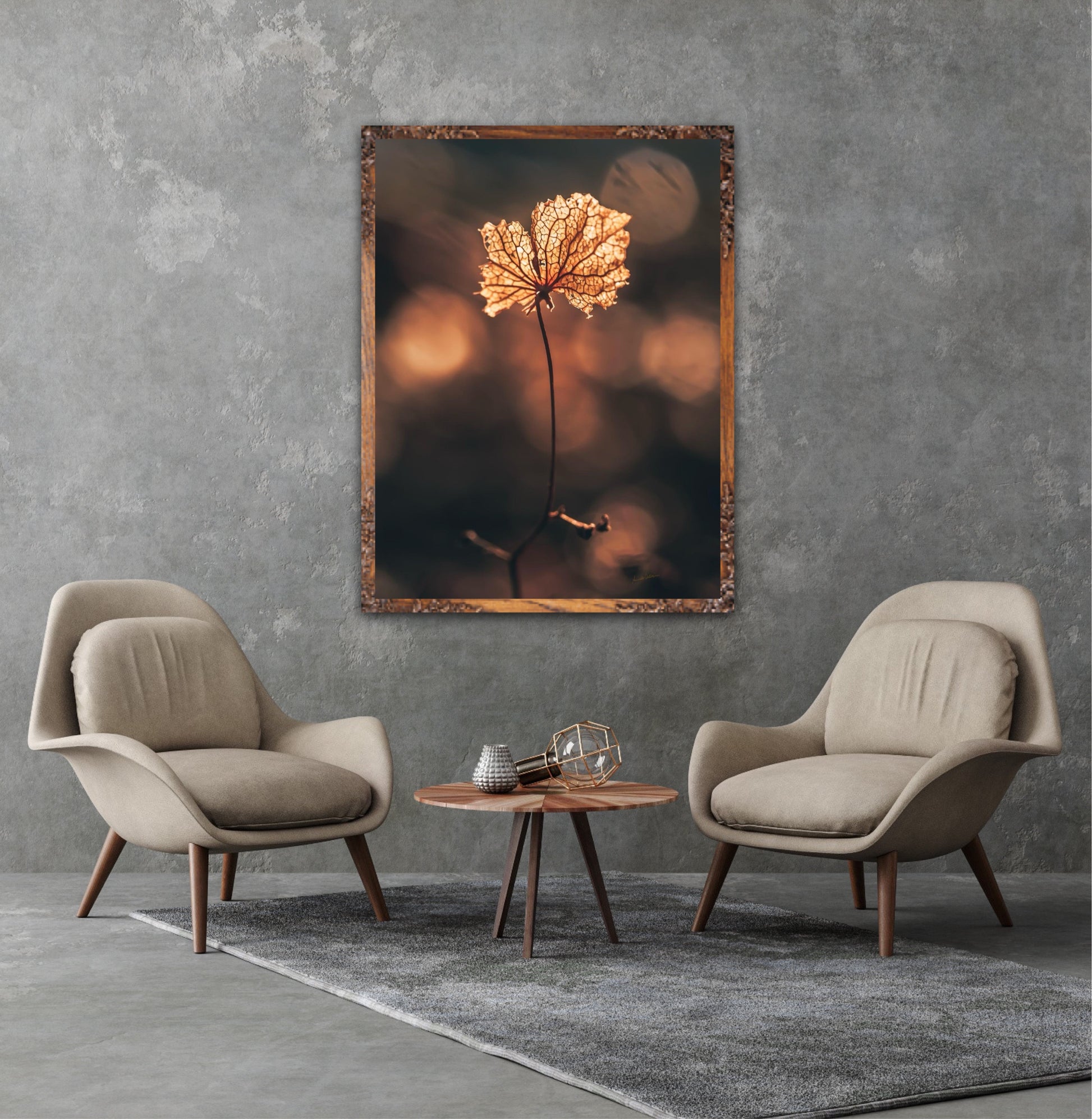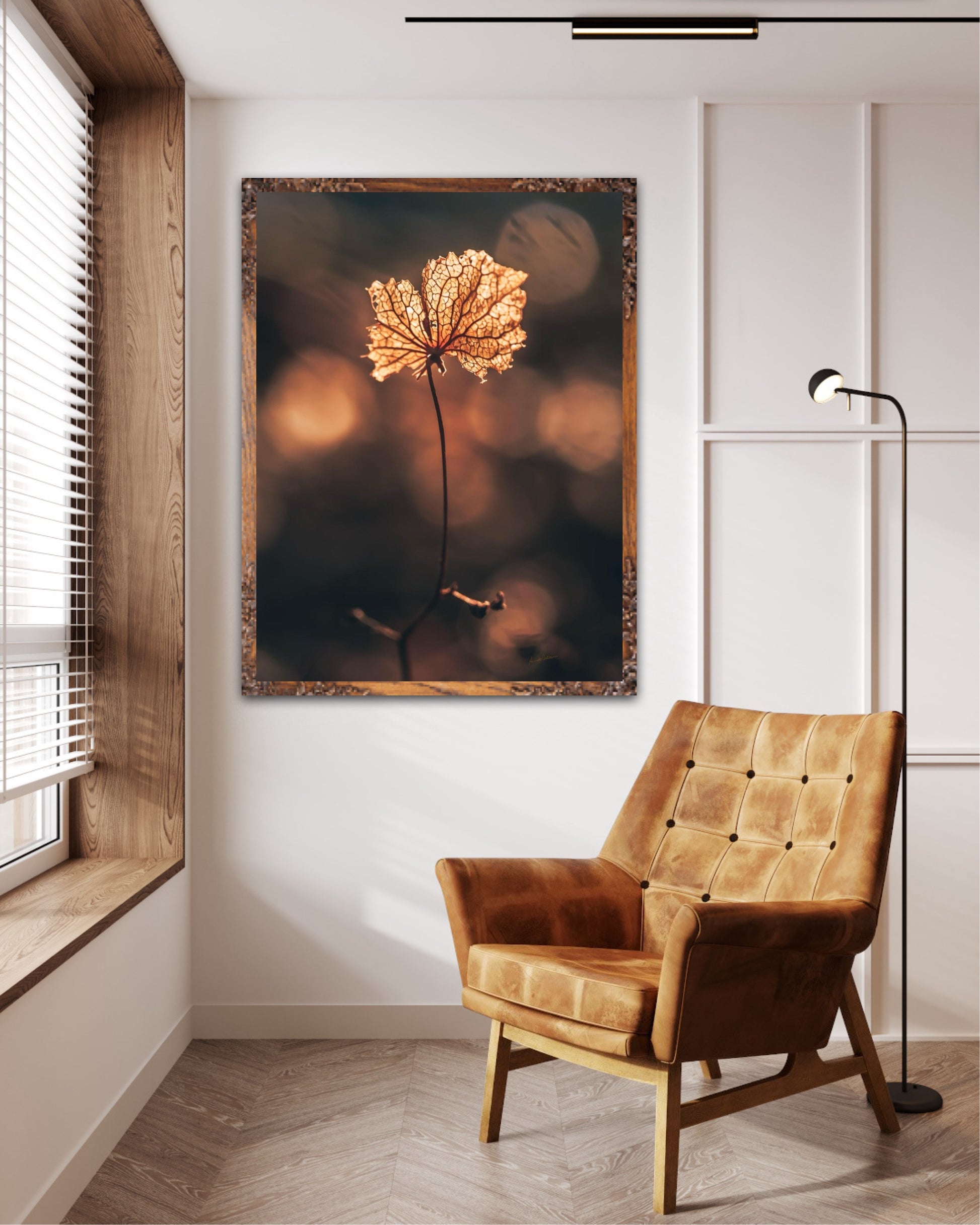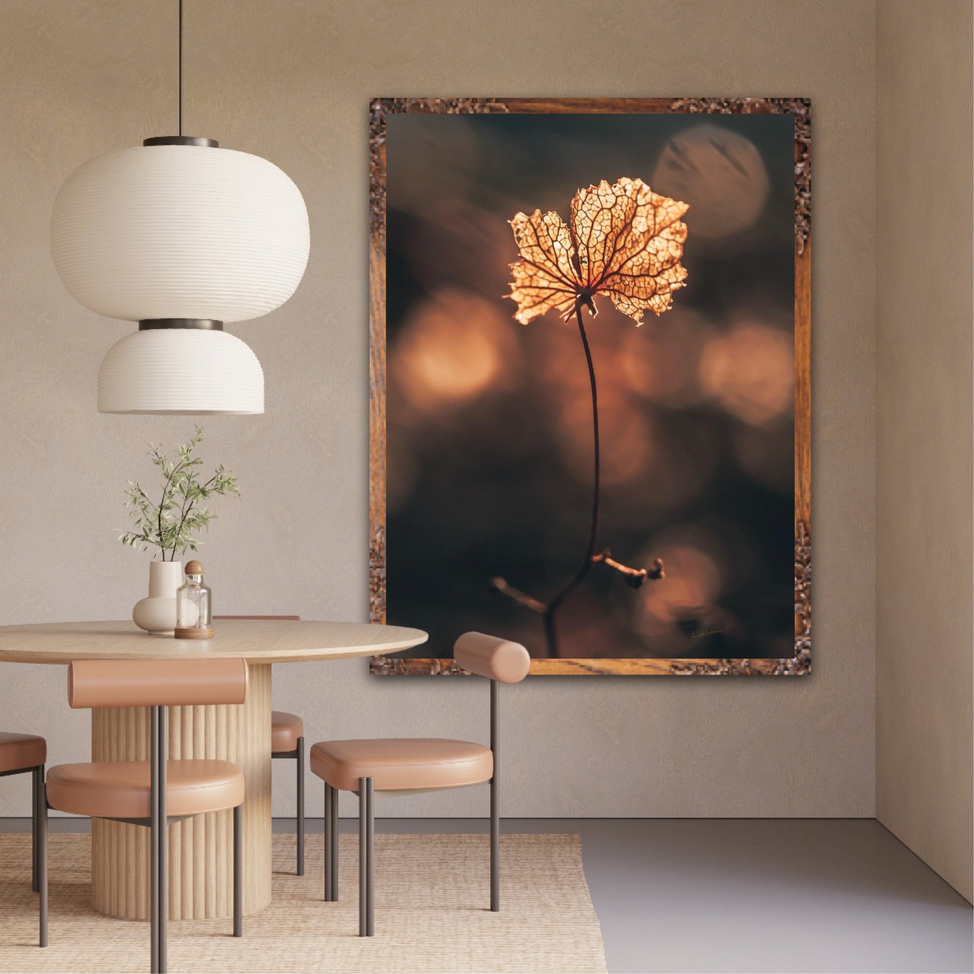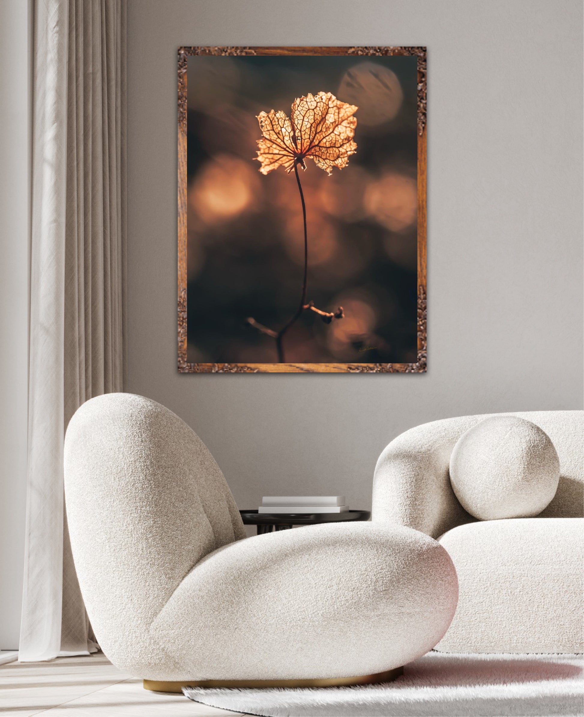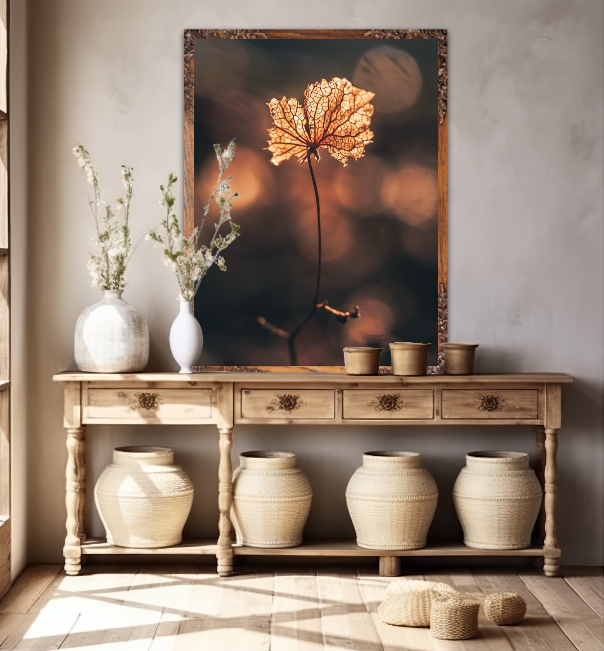 Beautiful photographic wall art of a dried Hydrangea in a wonderful and emotional posture, in warm golden light. This artwork will make you feel grounded and at peace.