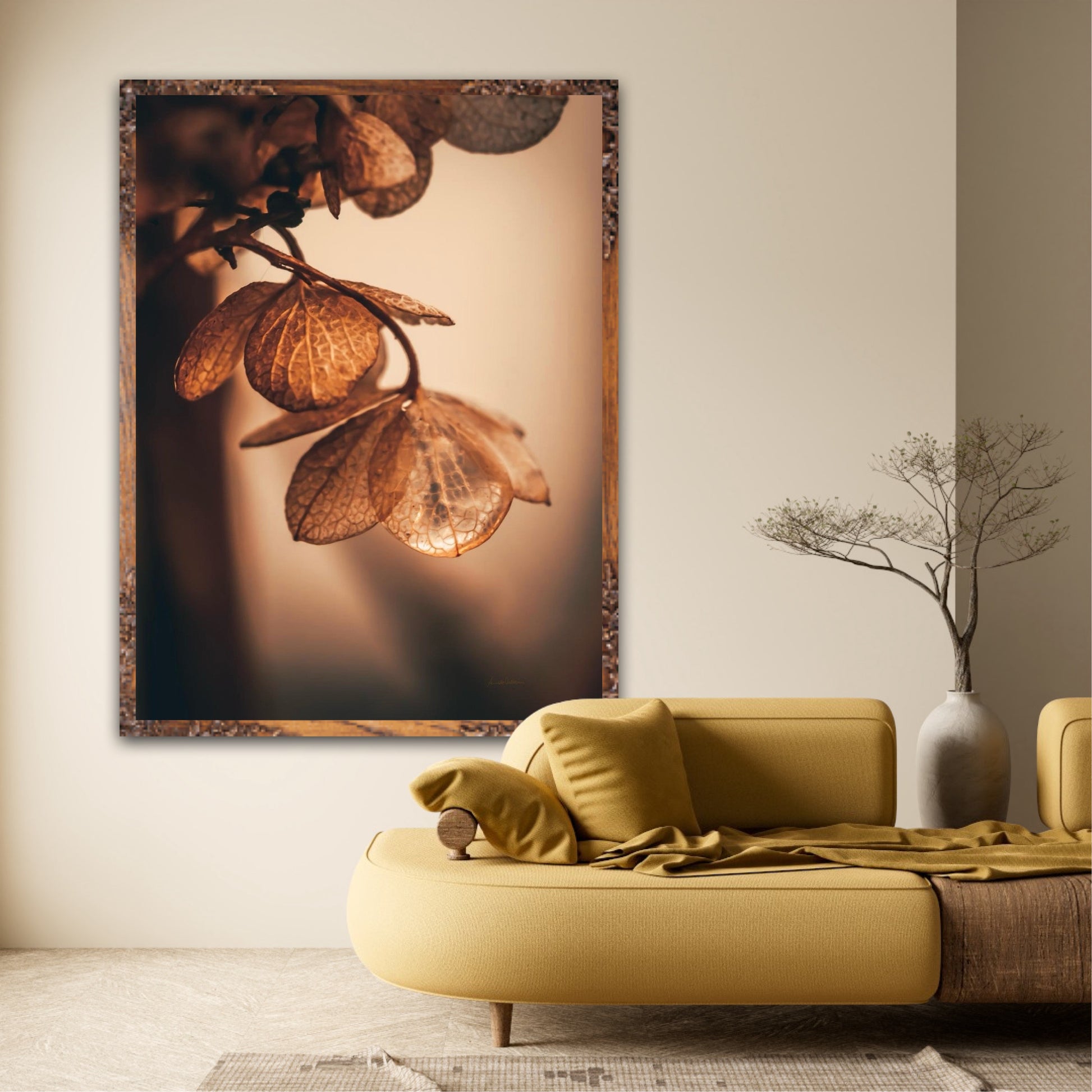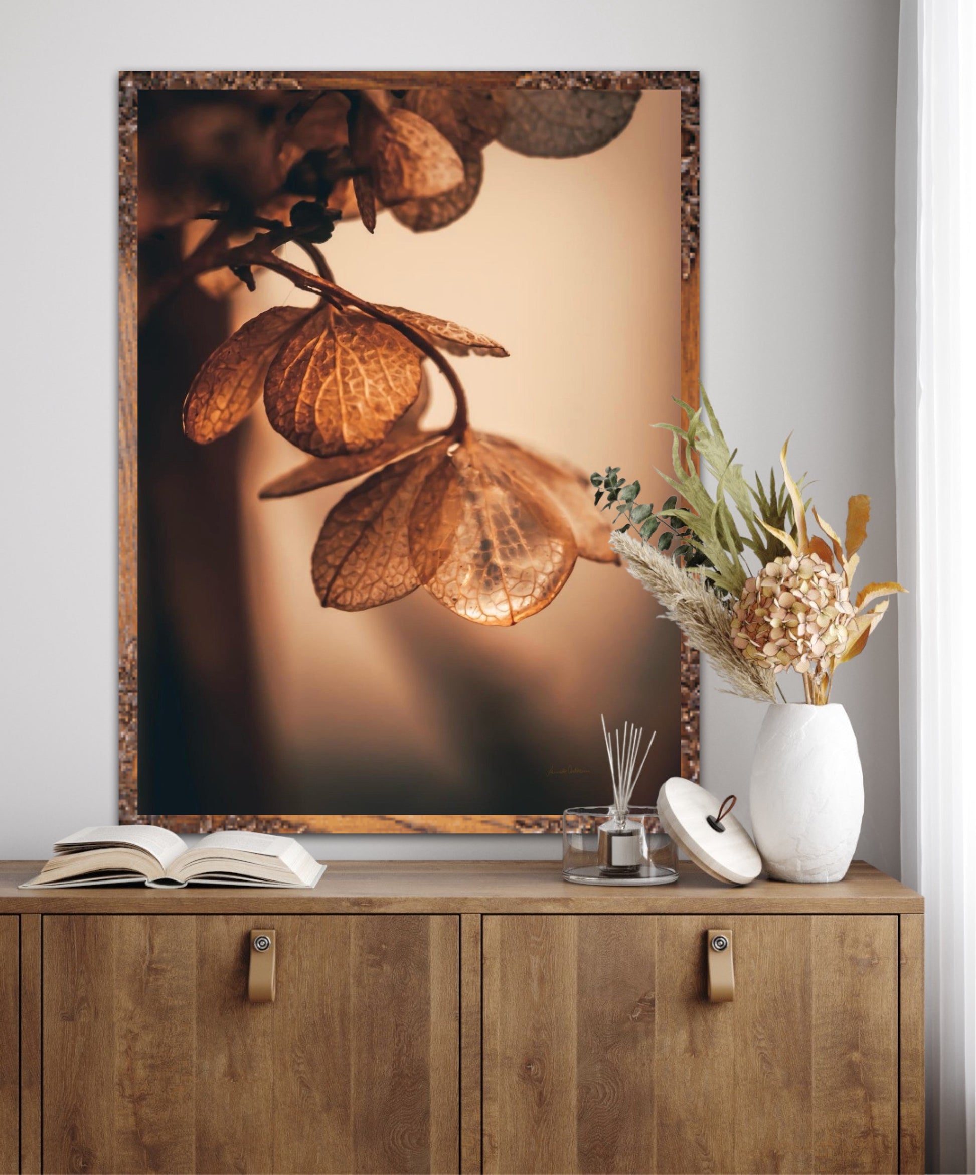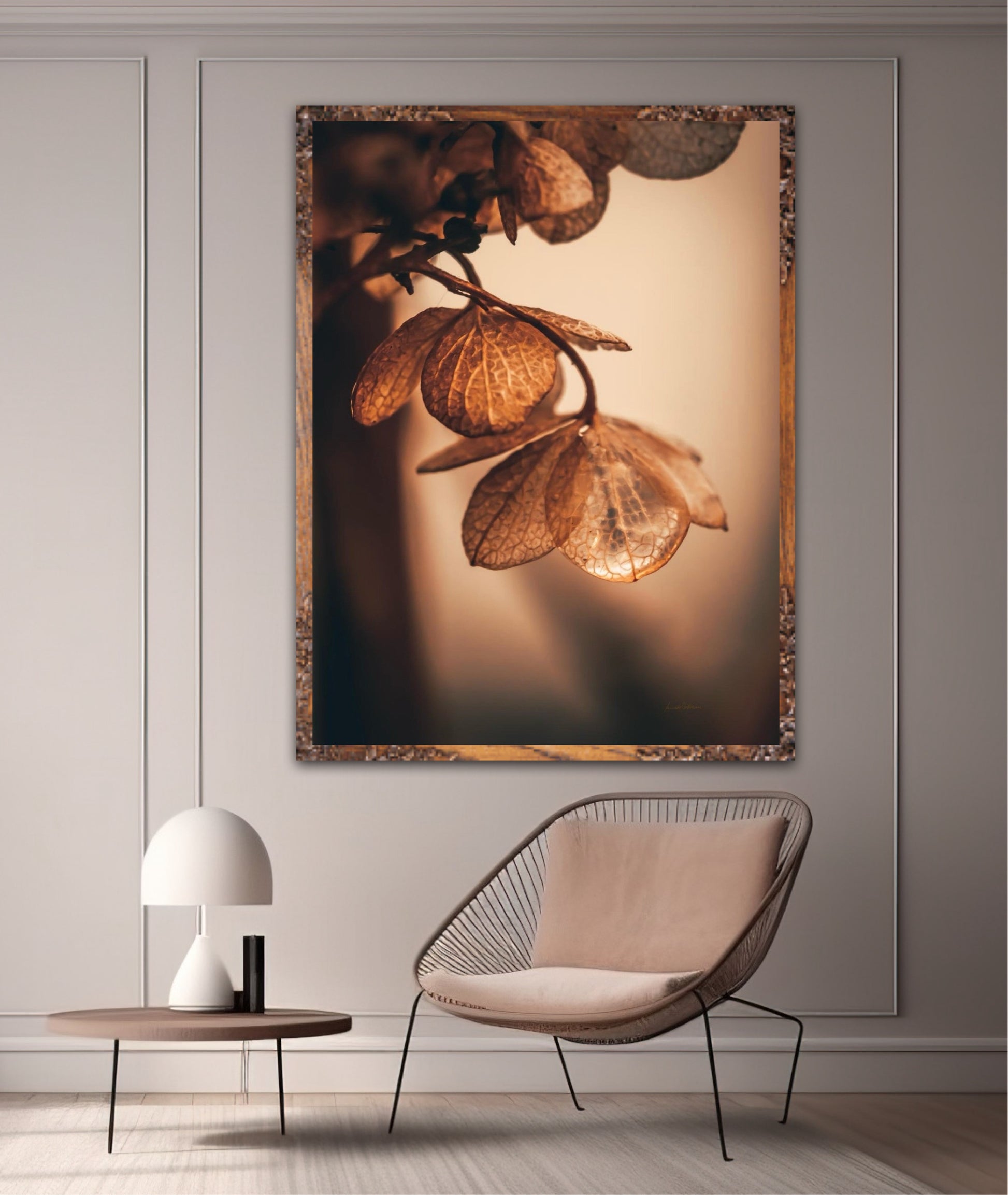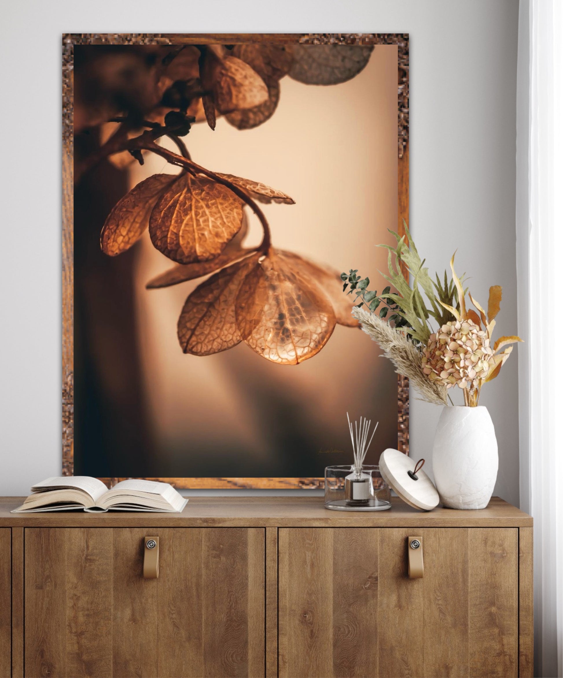 Beautiful photographic wall art of dried hydrangea leafs close up in beautiful soft light brown tones, on a dynamic and light background. This artwork will bring you peace and serenity.