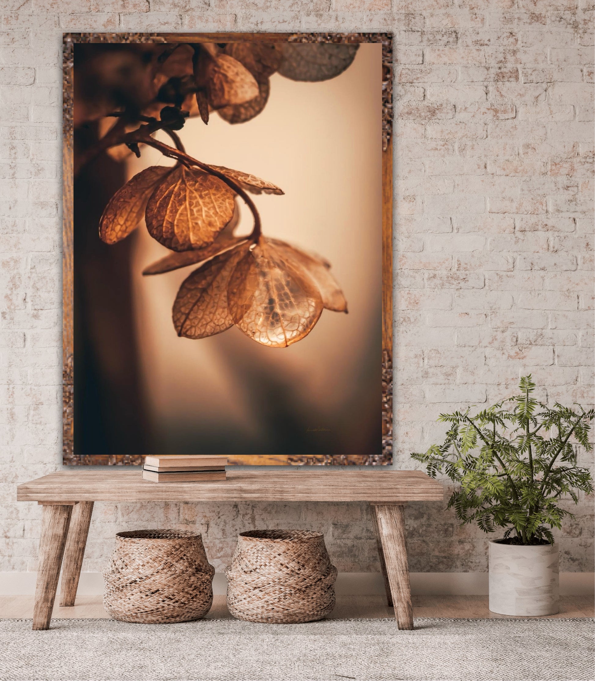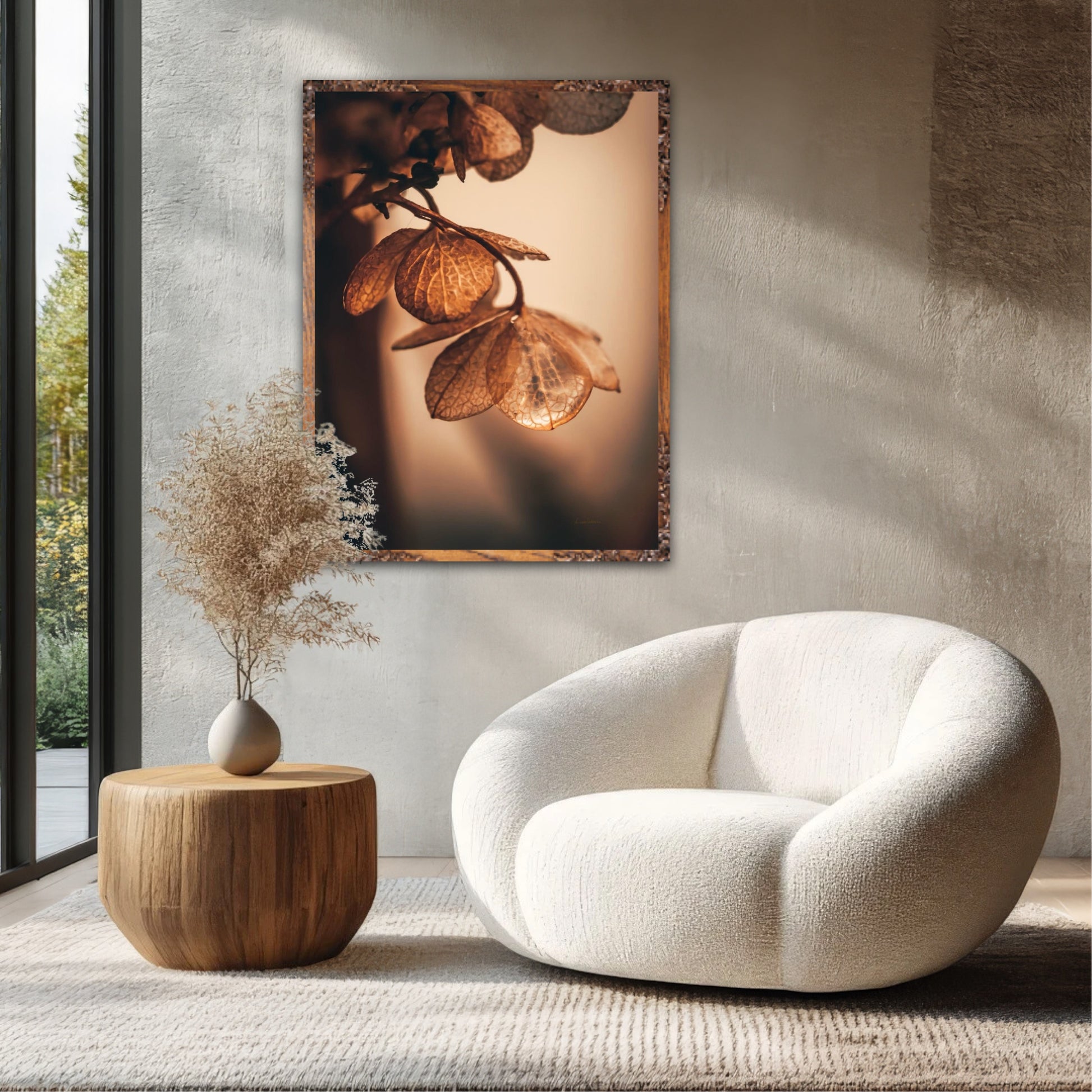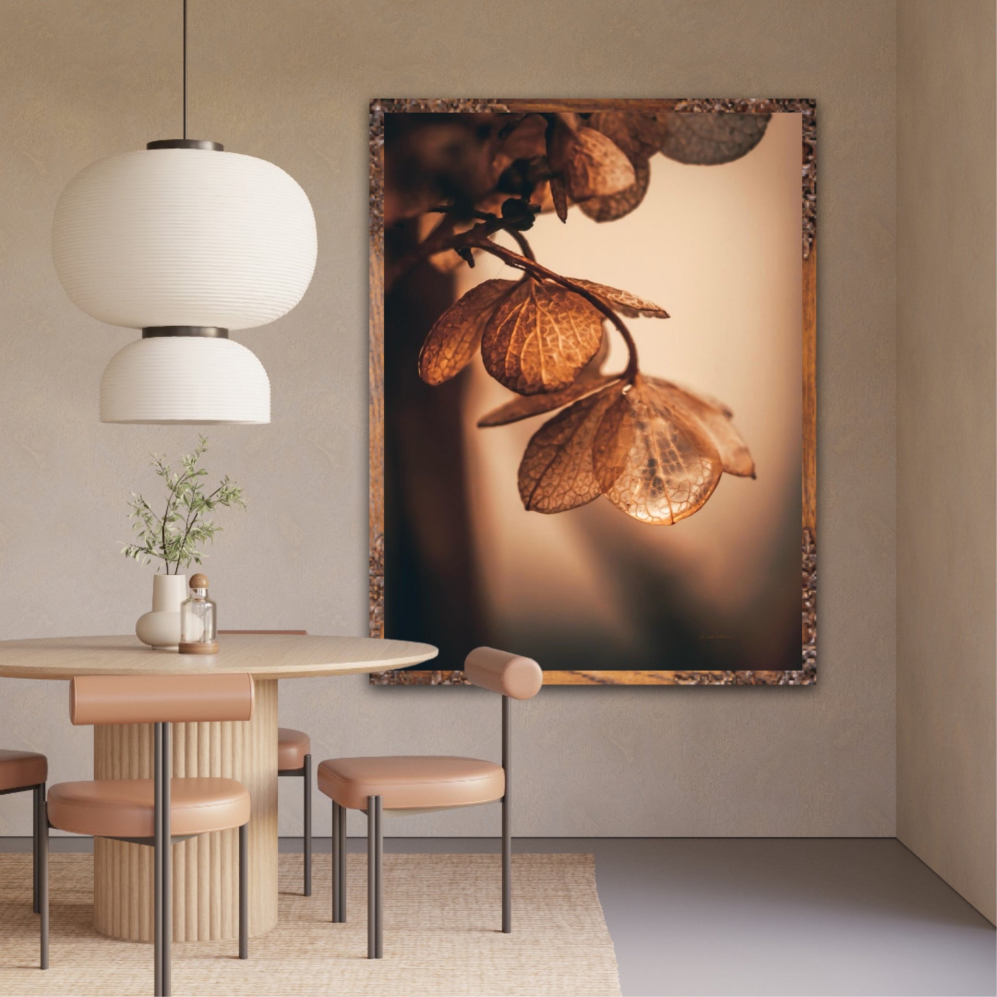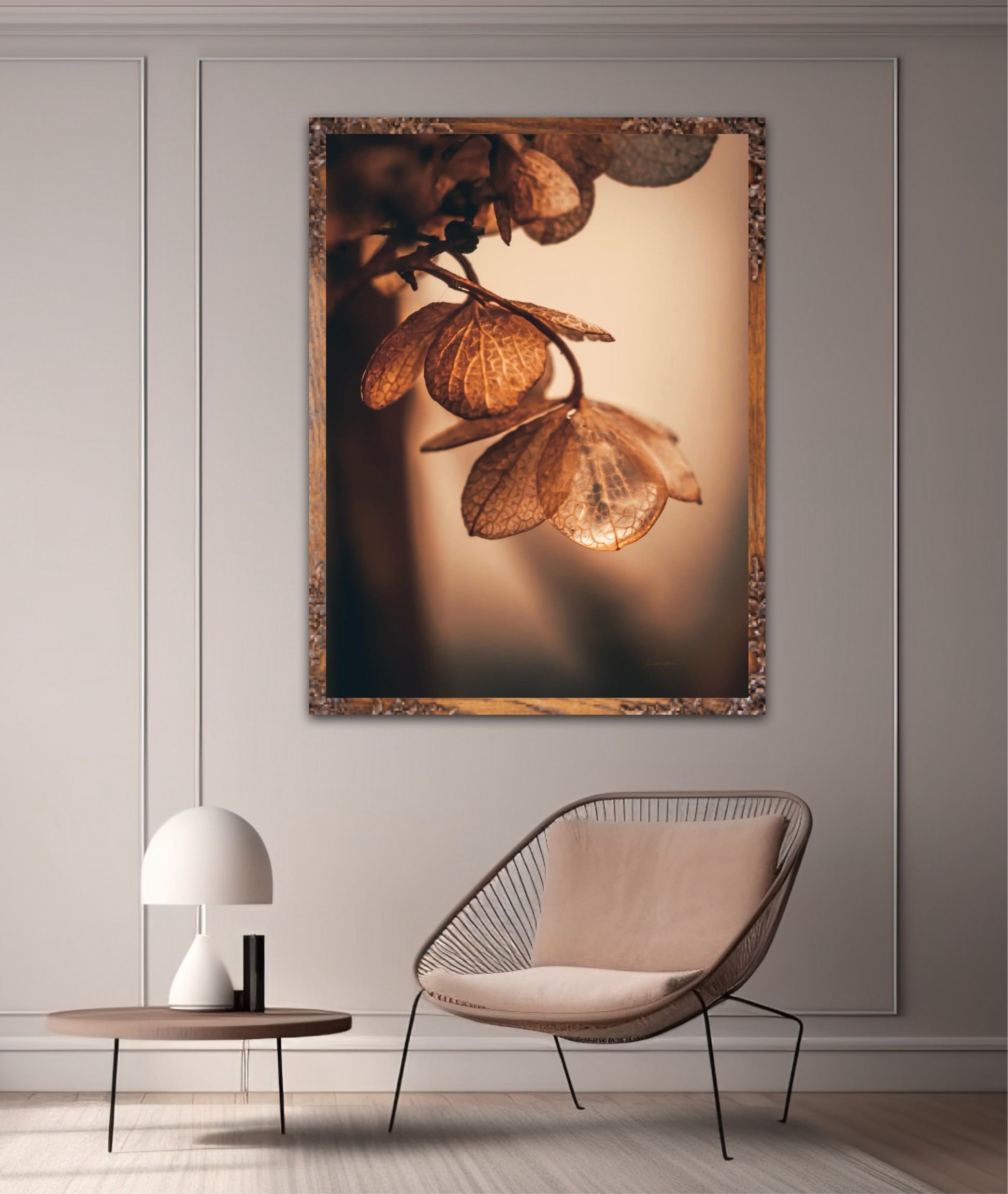 Beautiful photographic wall art of dried hydrangea leafs close up in beautiful soft light brown tones, on a dynamic and light background. This artwork will bring you peace and serenity.