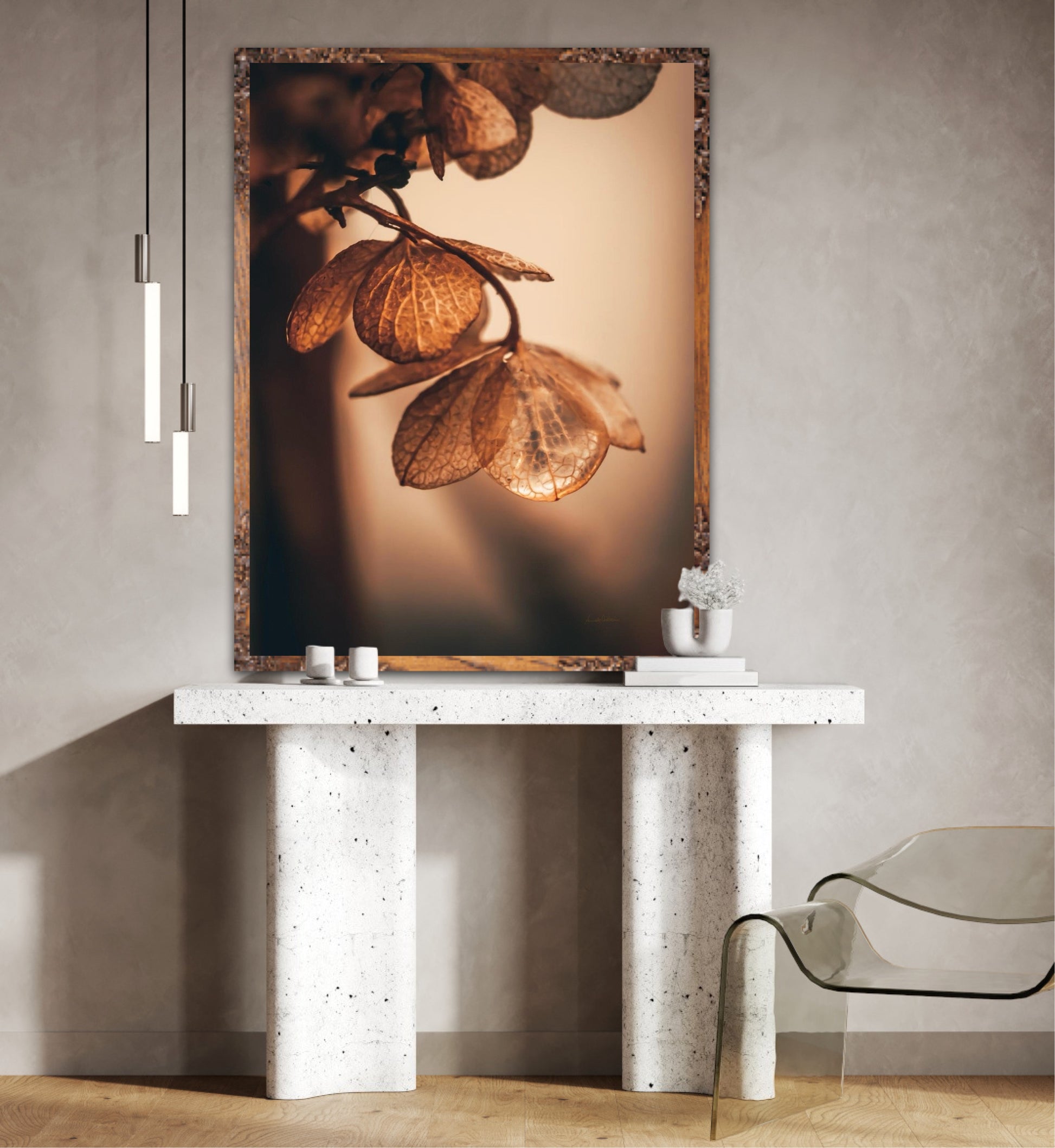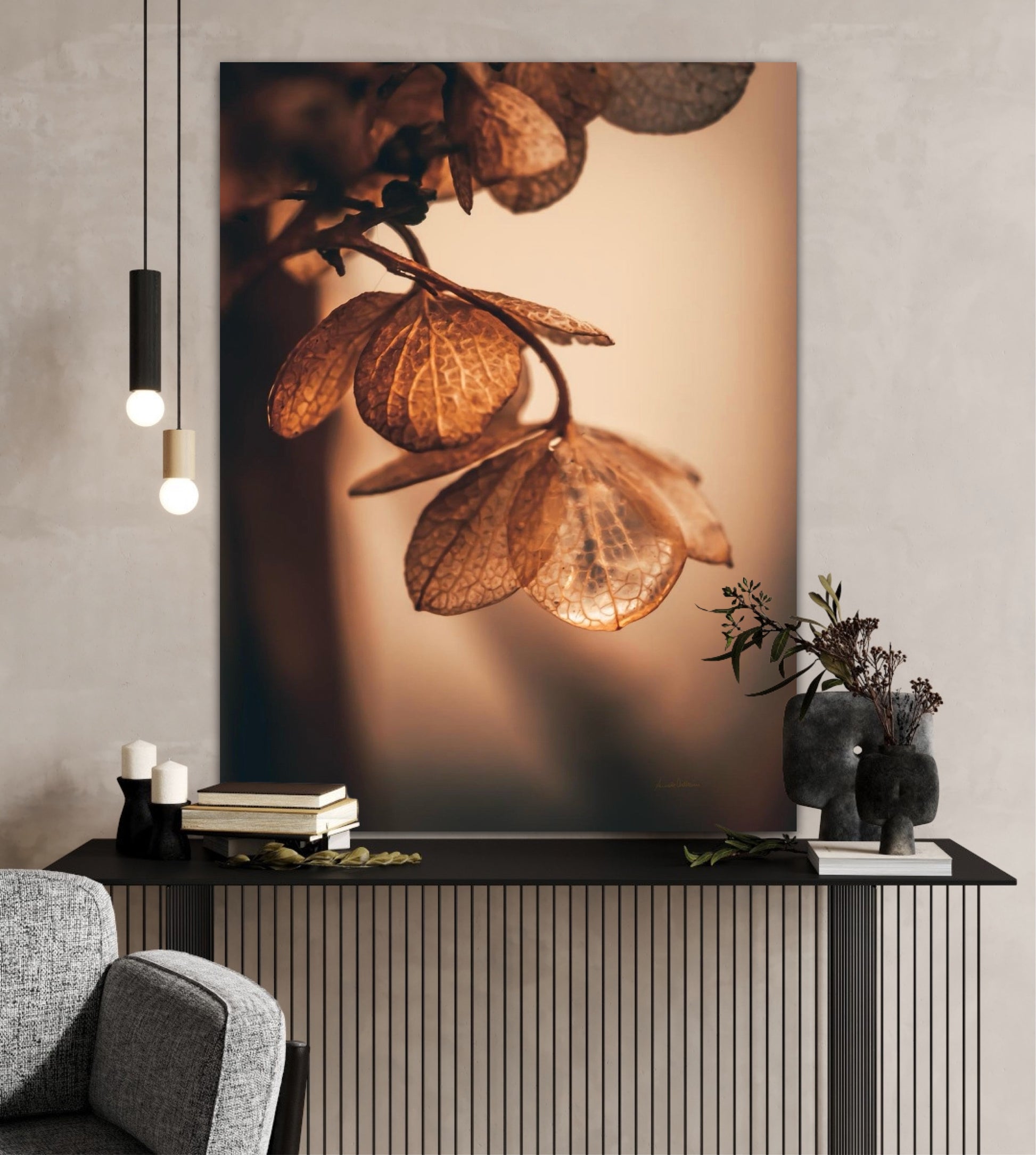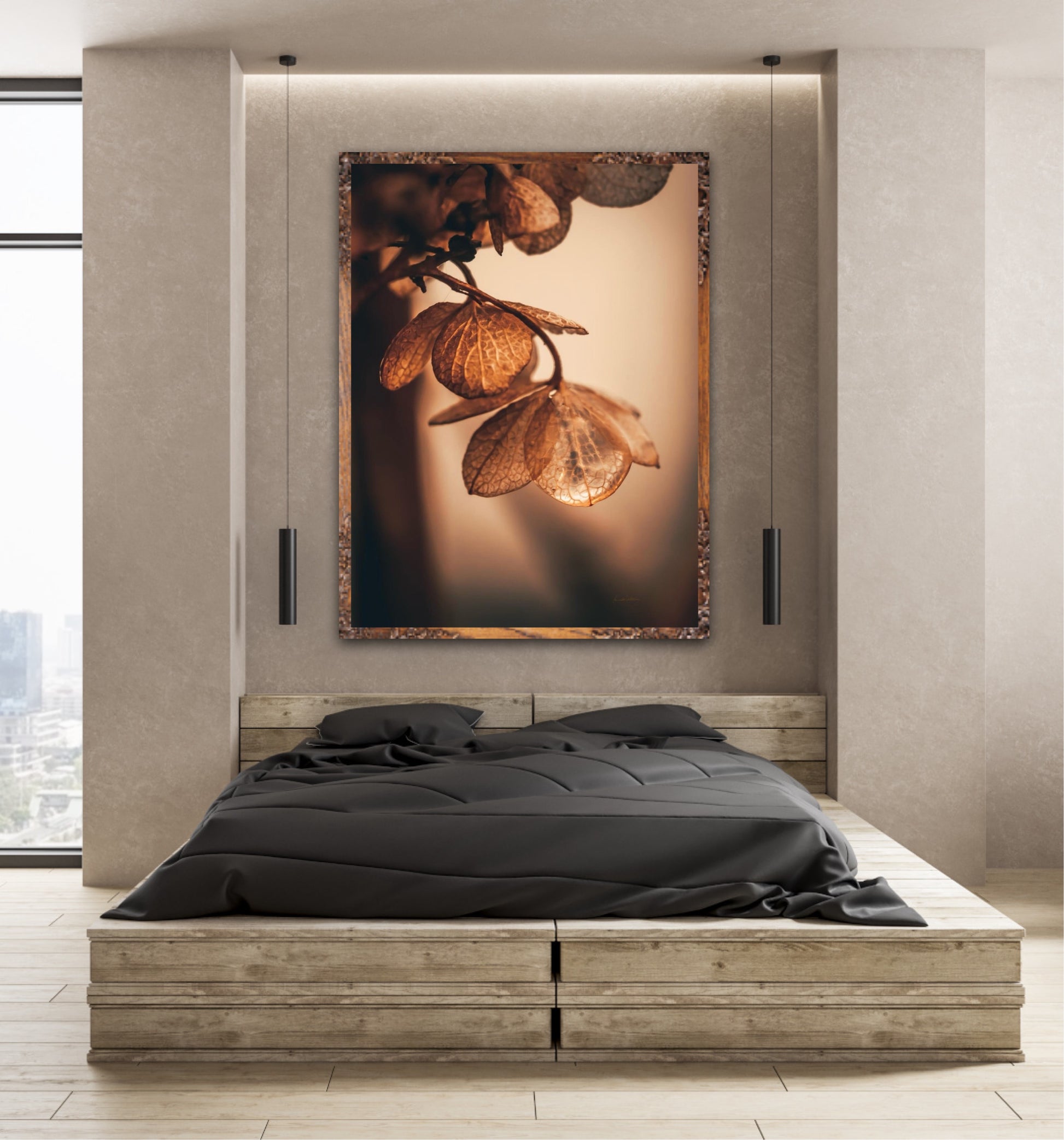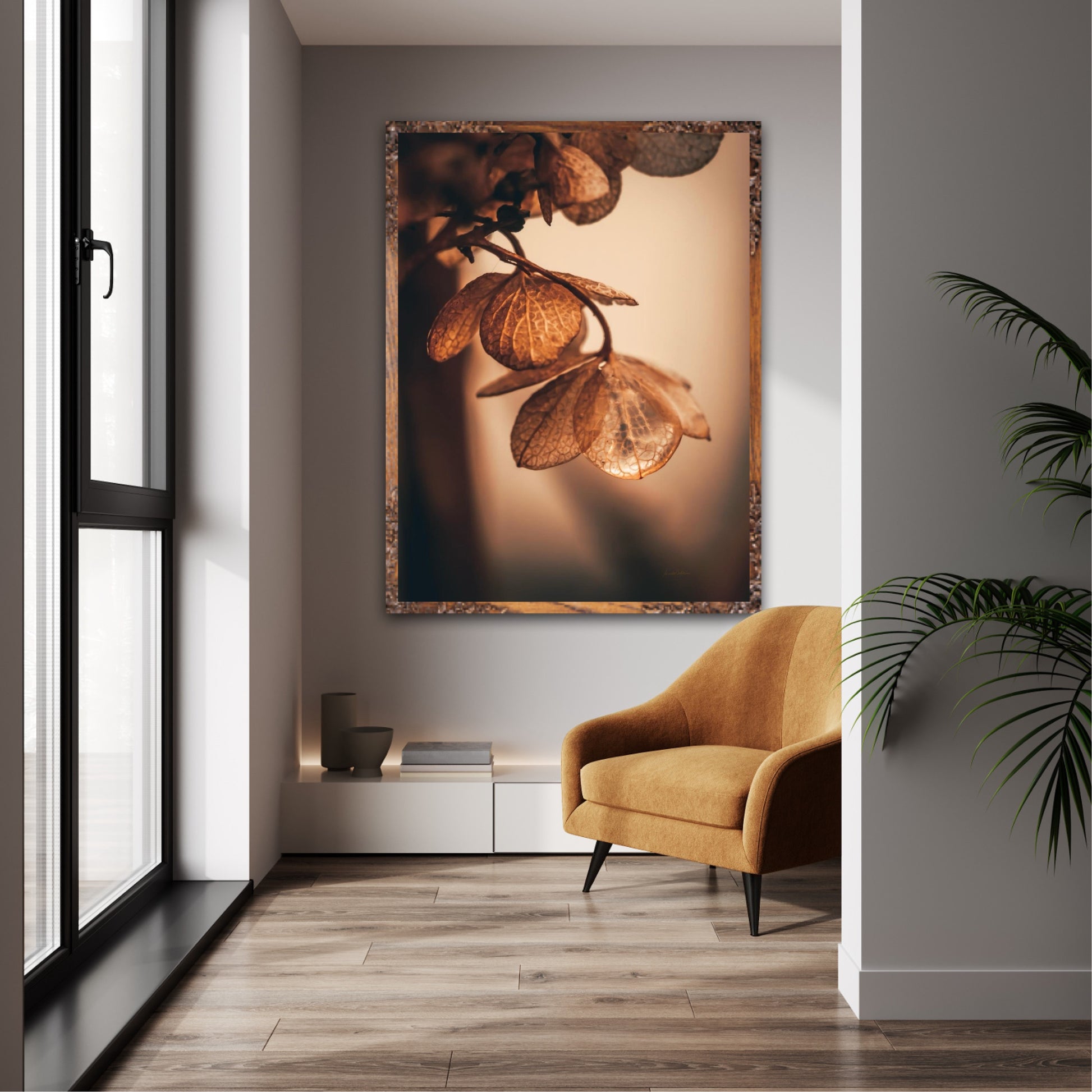 Beautiful photographic wall art of dried hydrangea leafs close up in beautiful soft light brown tones, on a dynamic and light background. This artwork will bring you peace and serenity.