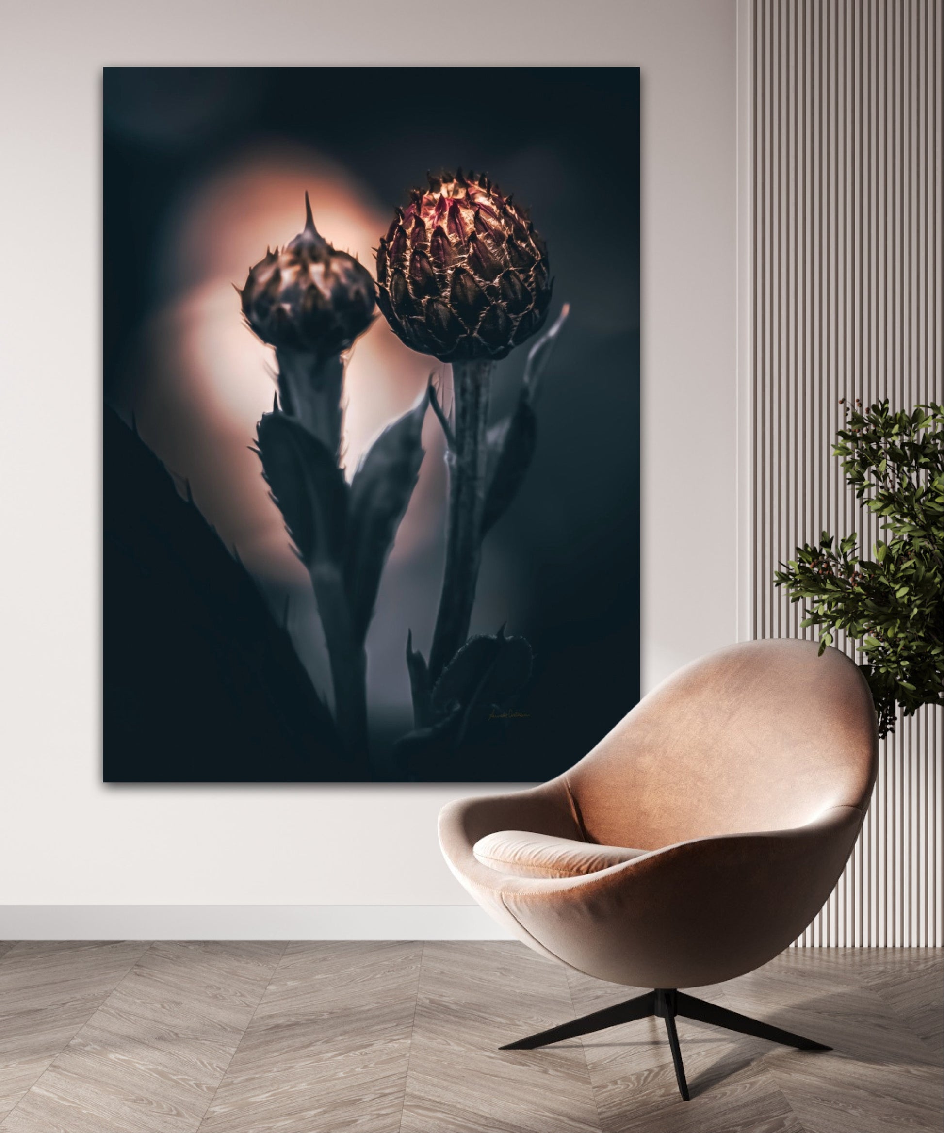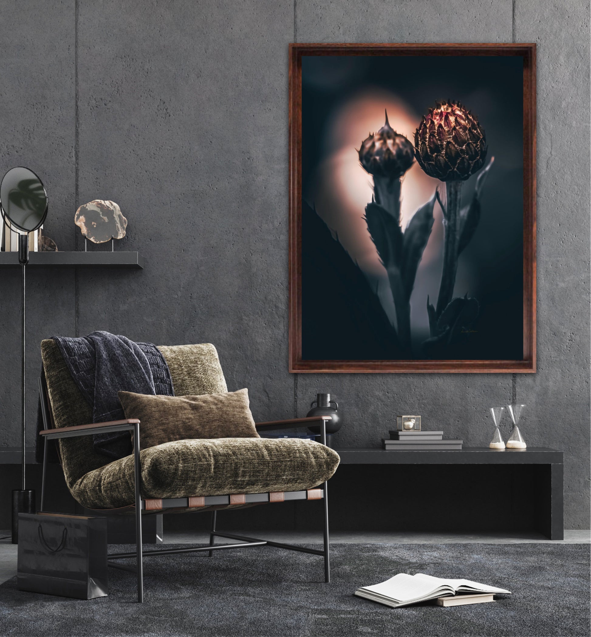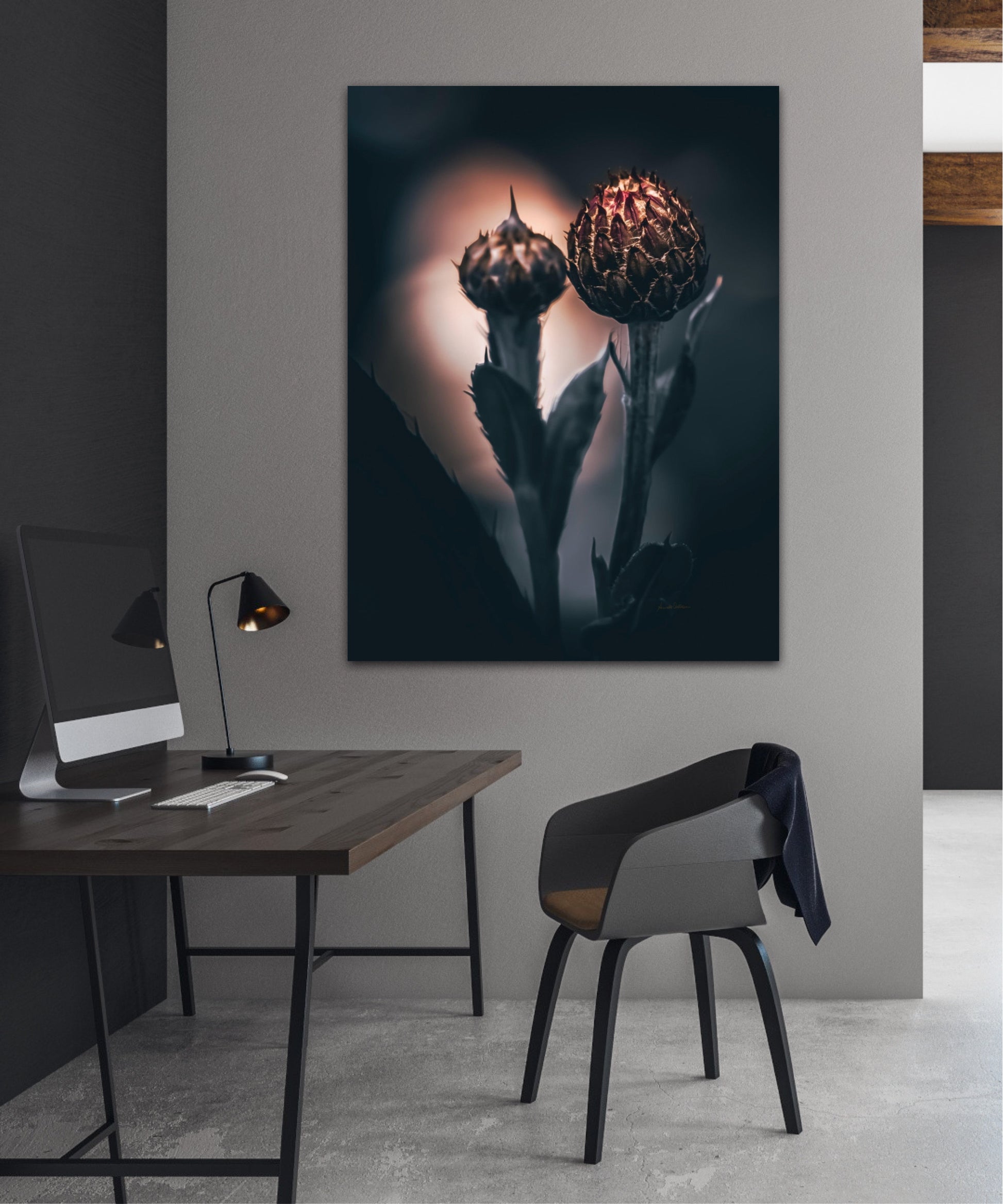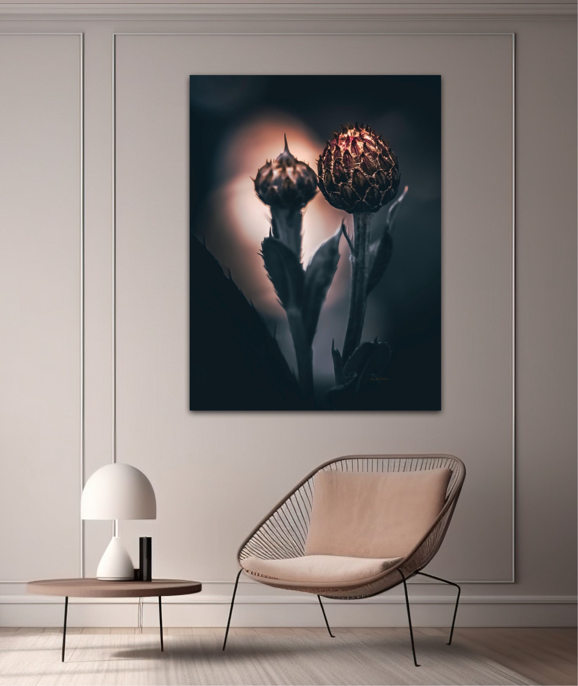 Beautiful photographic wall art of a gorgeous warm deep red-lilac thistle on a dark background. This art piece will warm your heart.