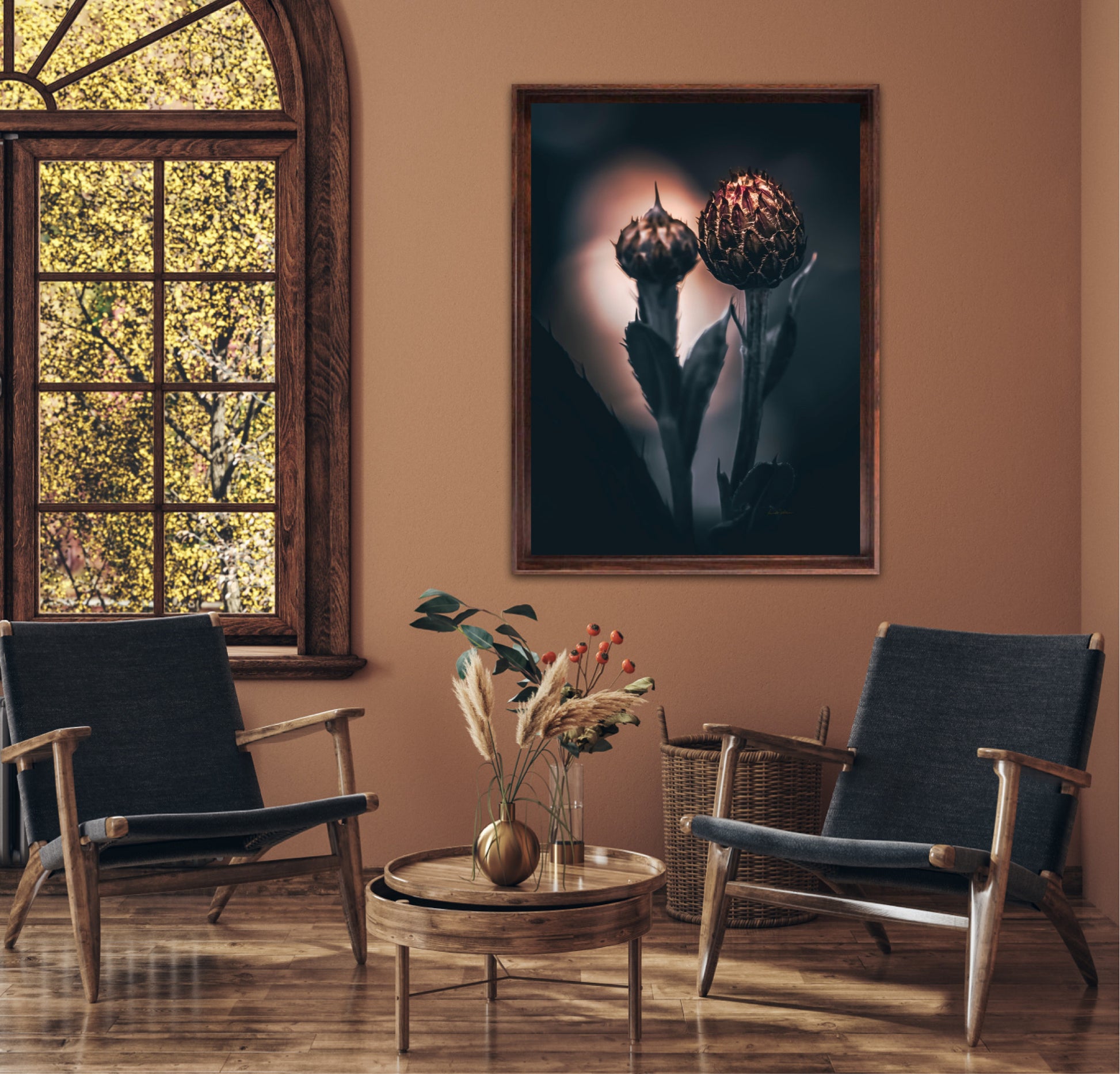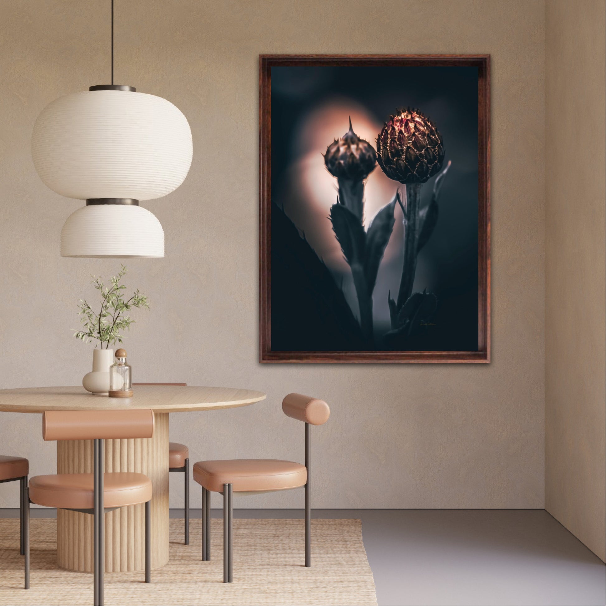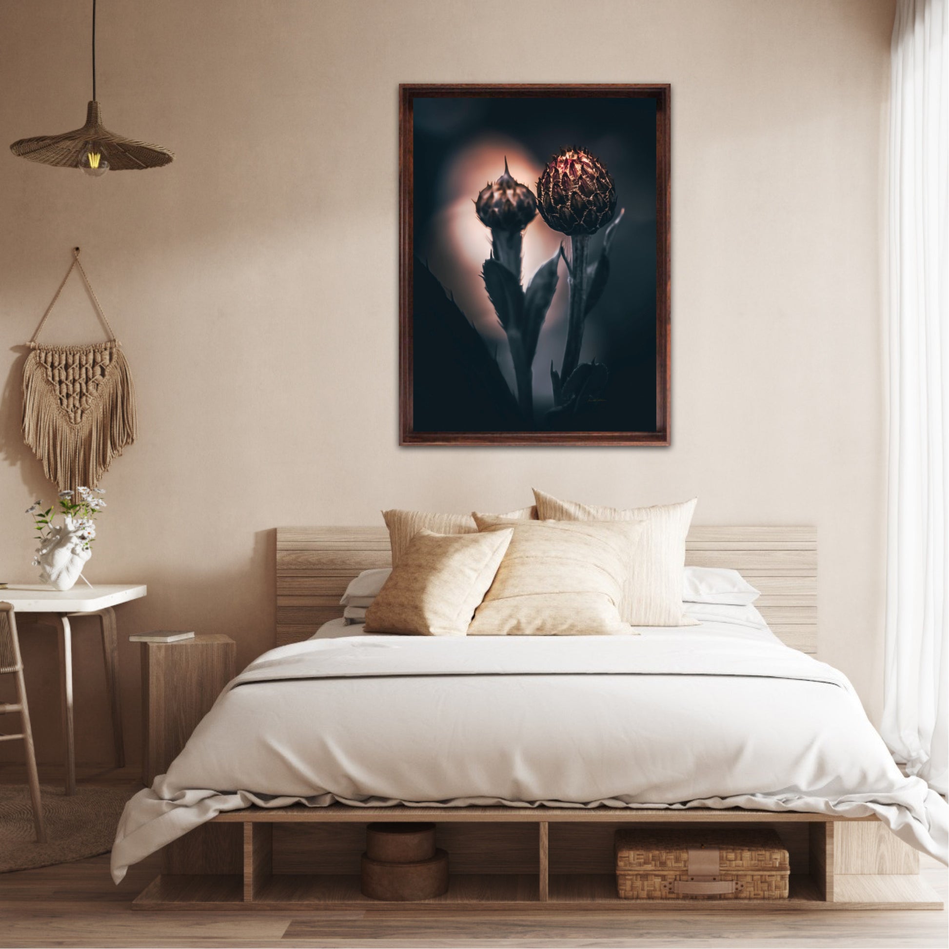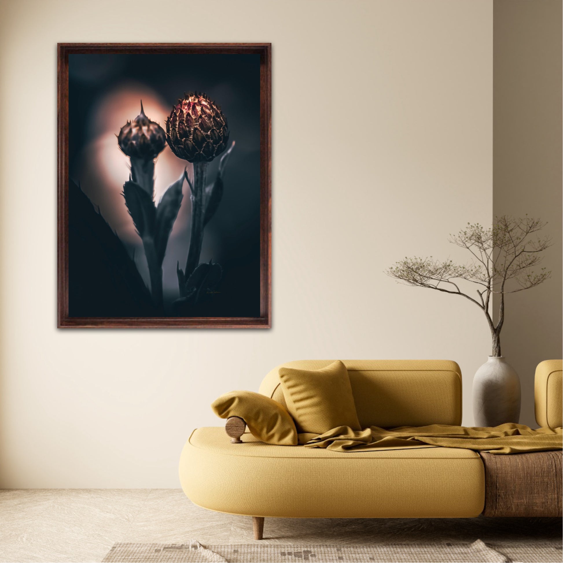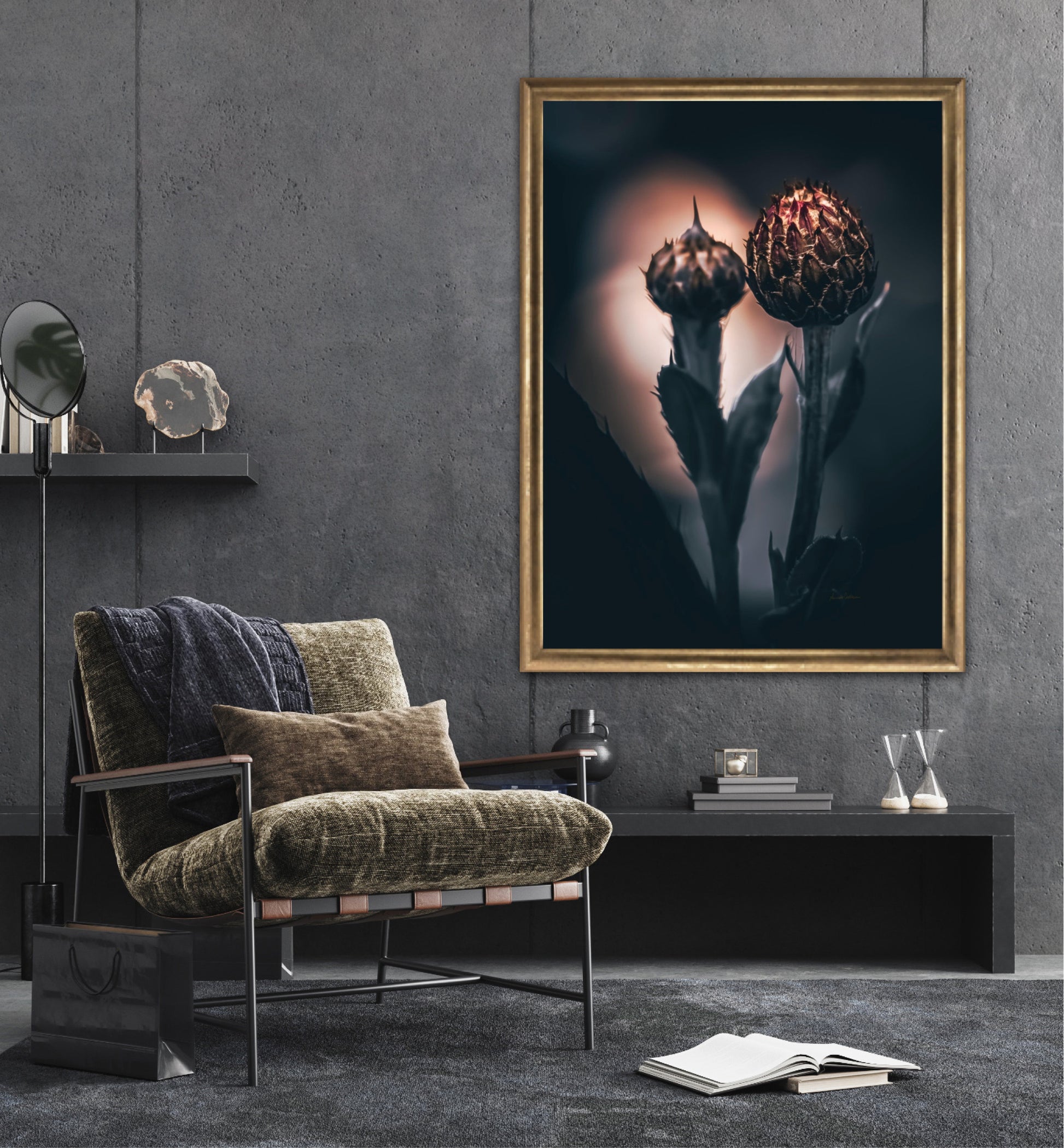 Beautiful photographic wall art of a gorgeous warm deep red-lilac thistle on a dark background. This art piece will warm your heart.