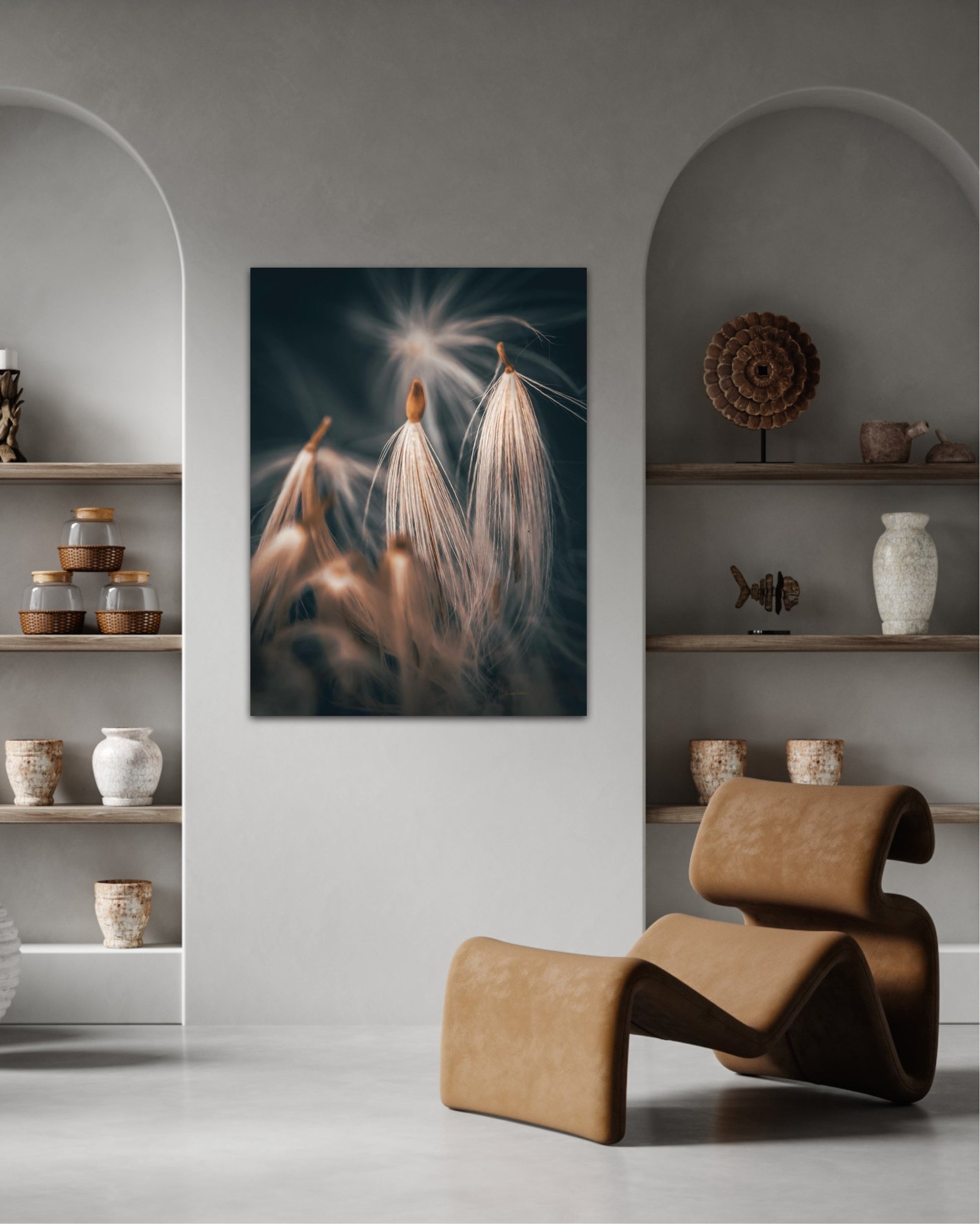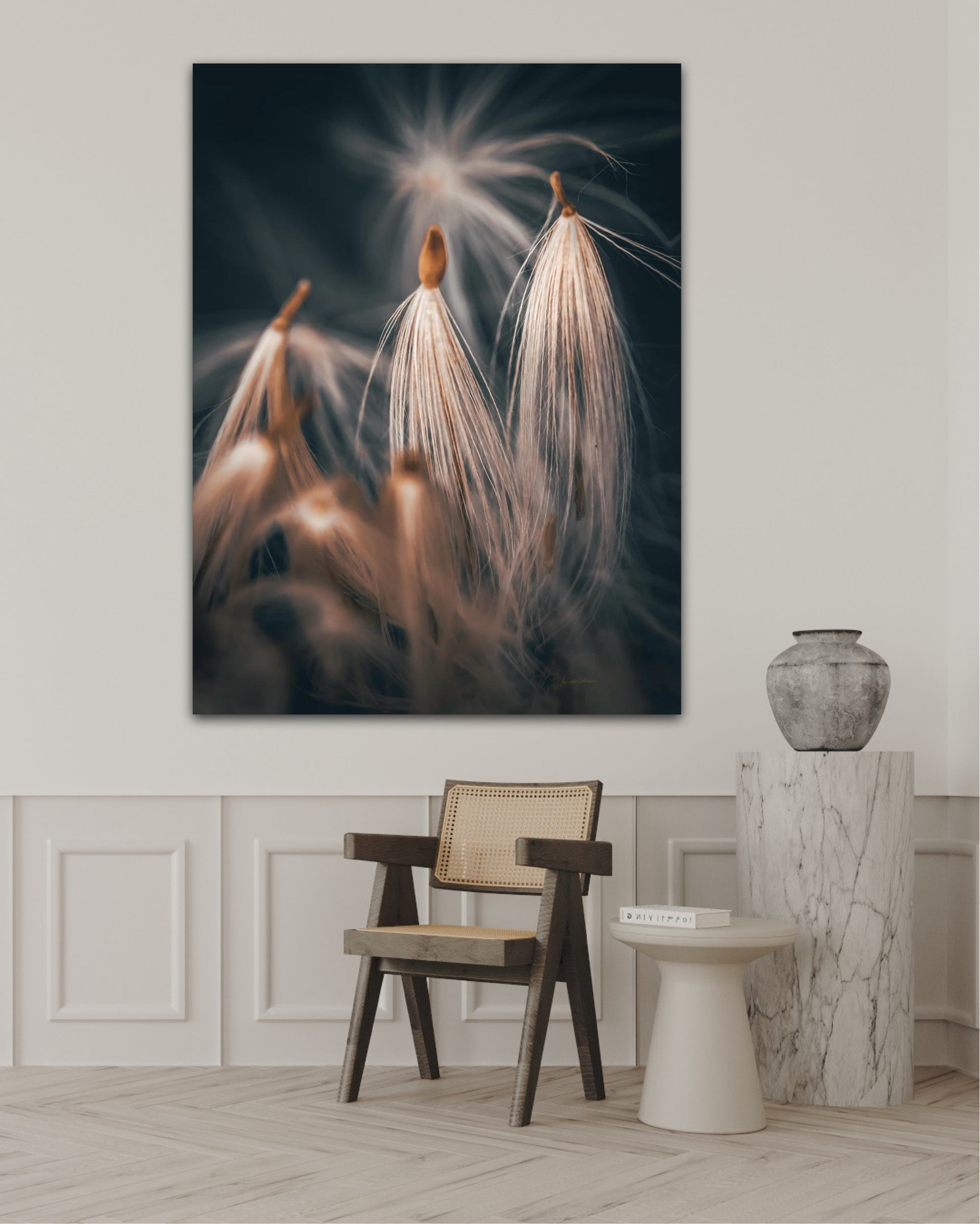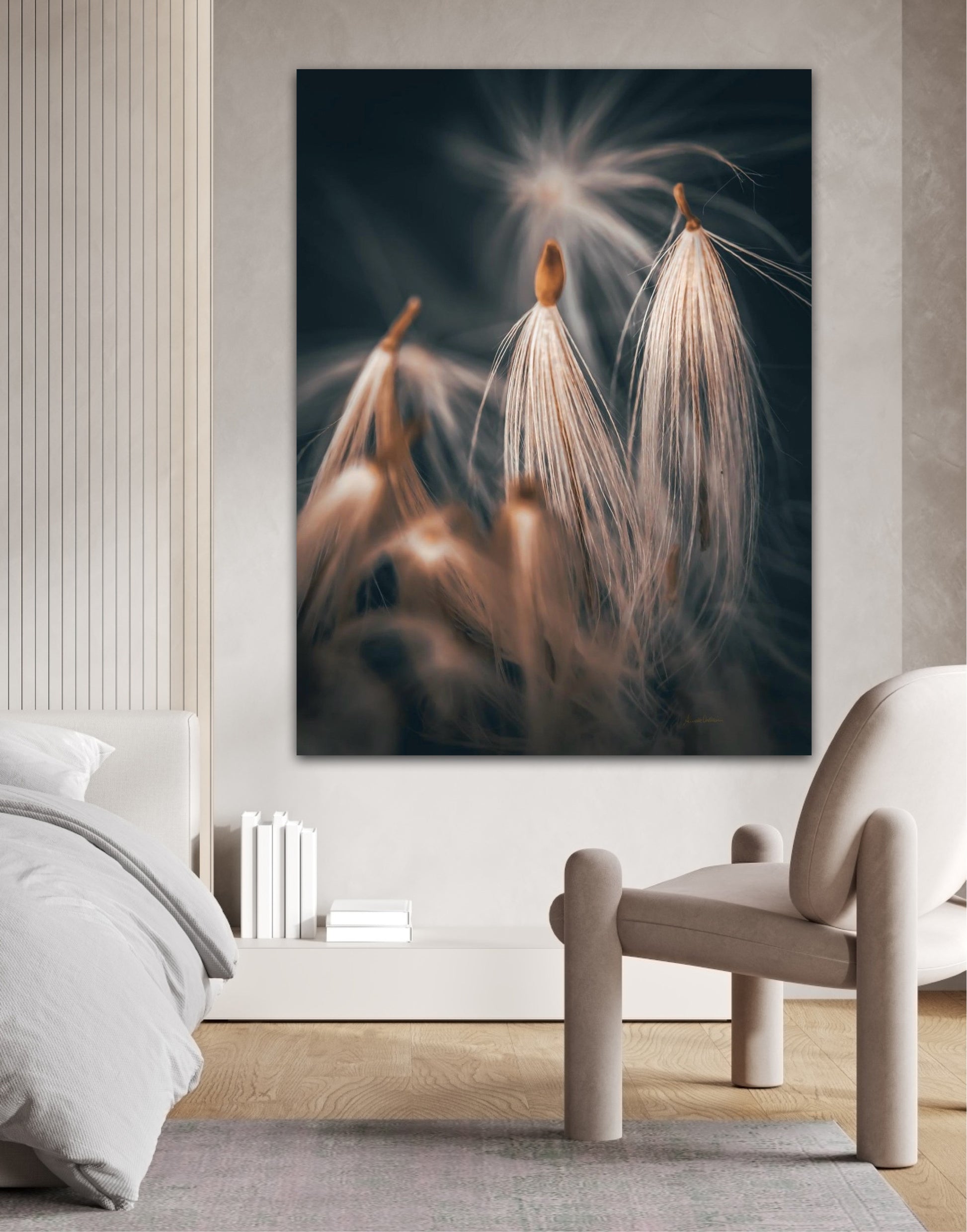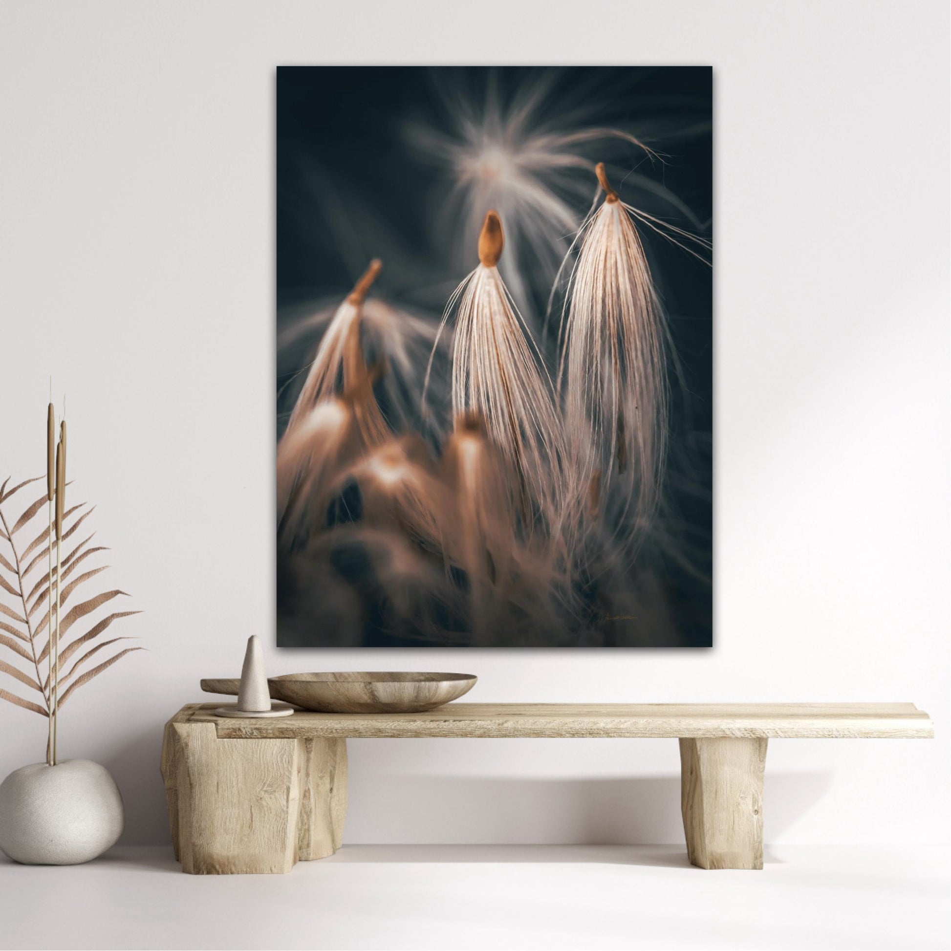 Beautiful photographic wall art of dandelion seeds close-up in lovely warm tones on a blue-gray background. Get a special and beautiful image on your wall too.