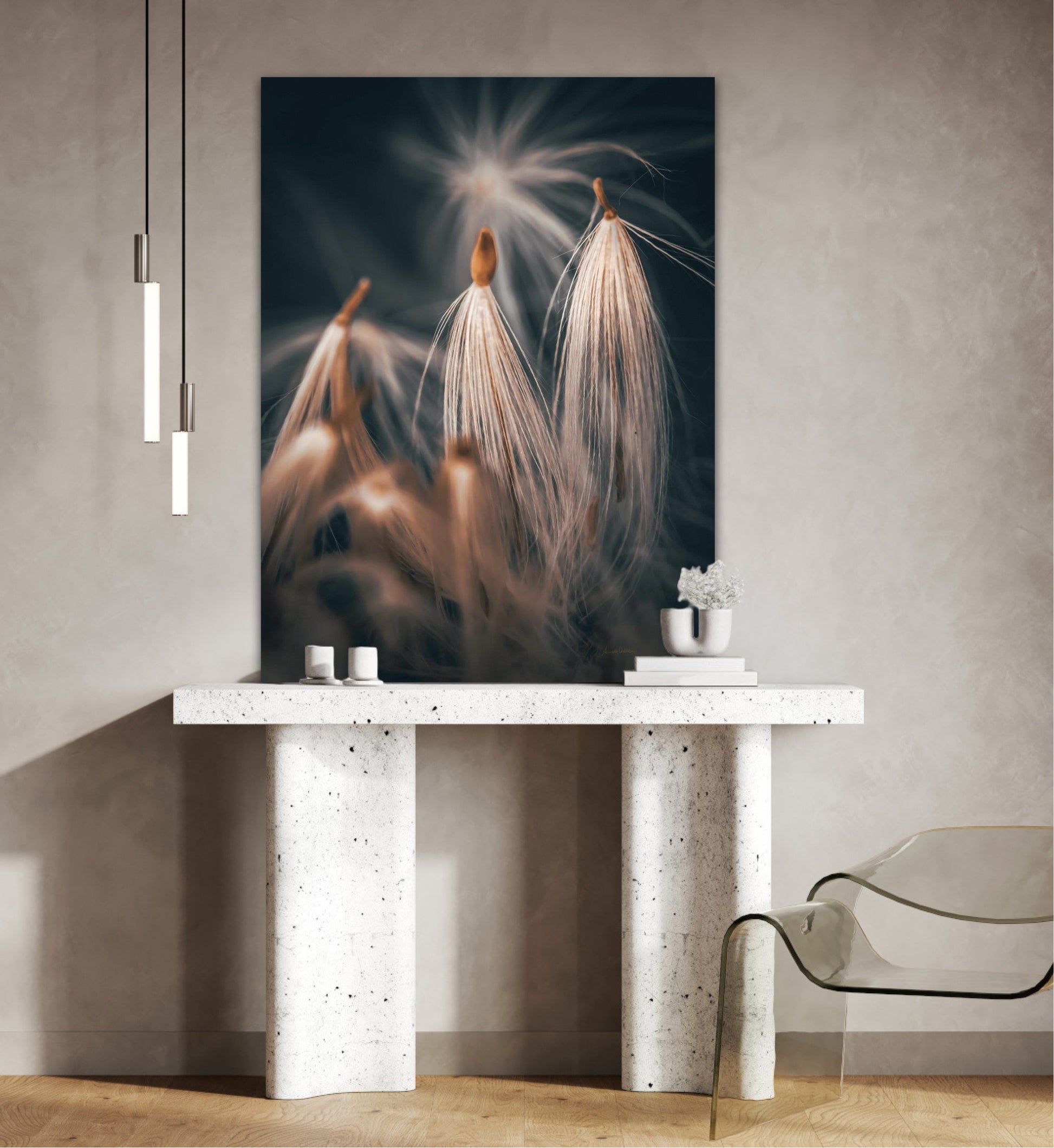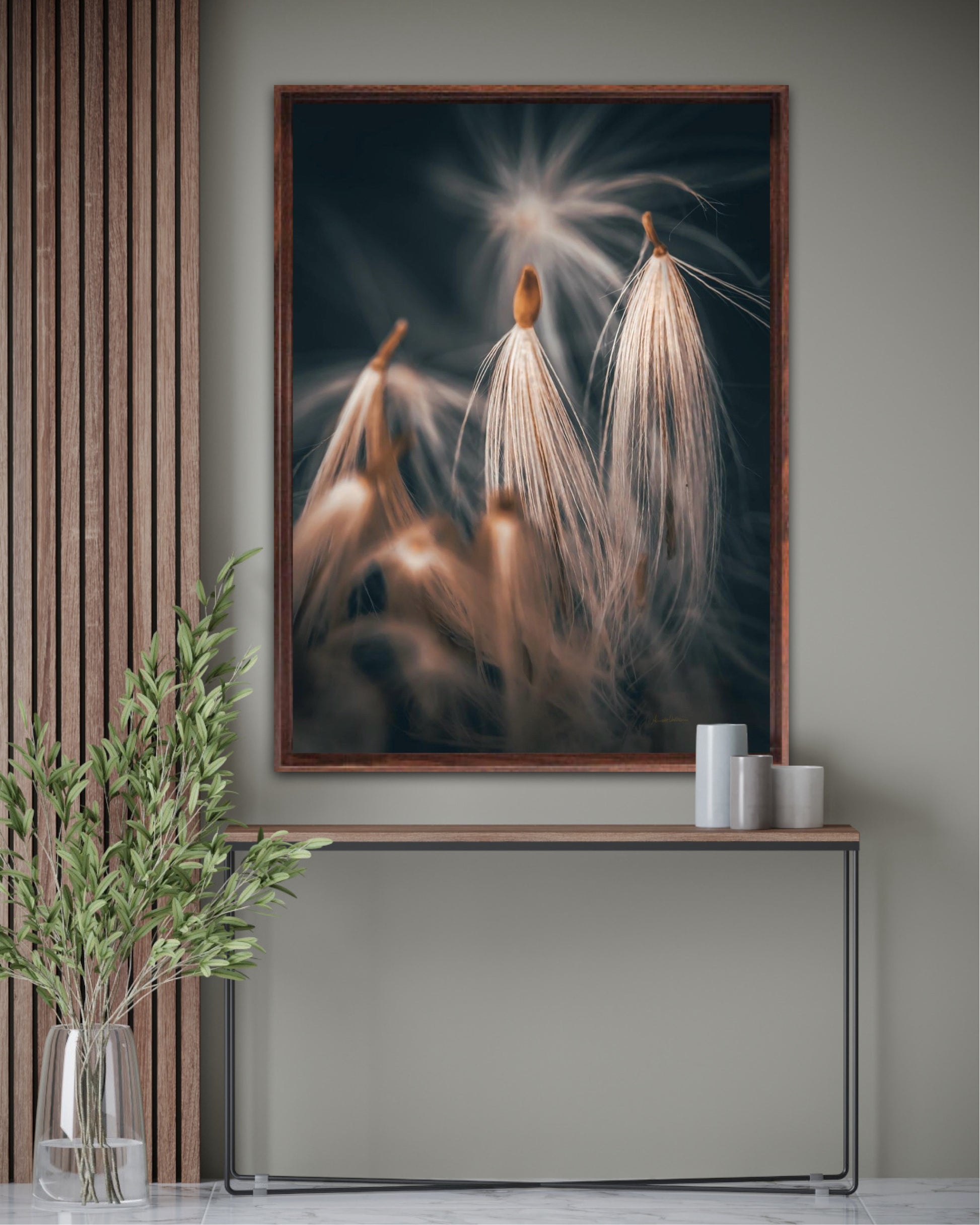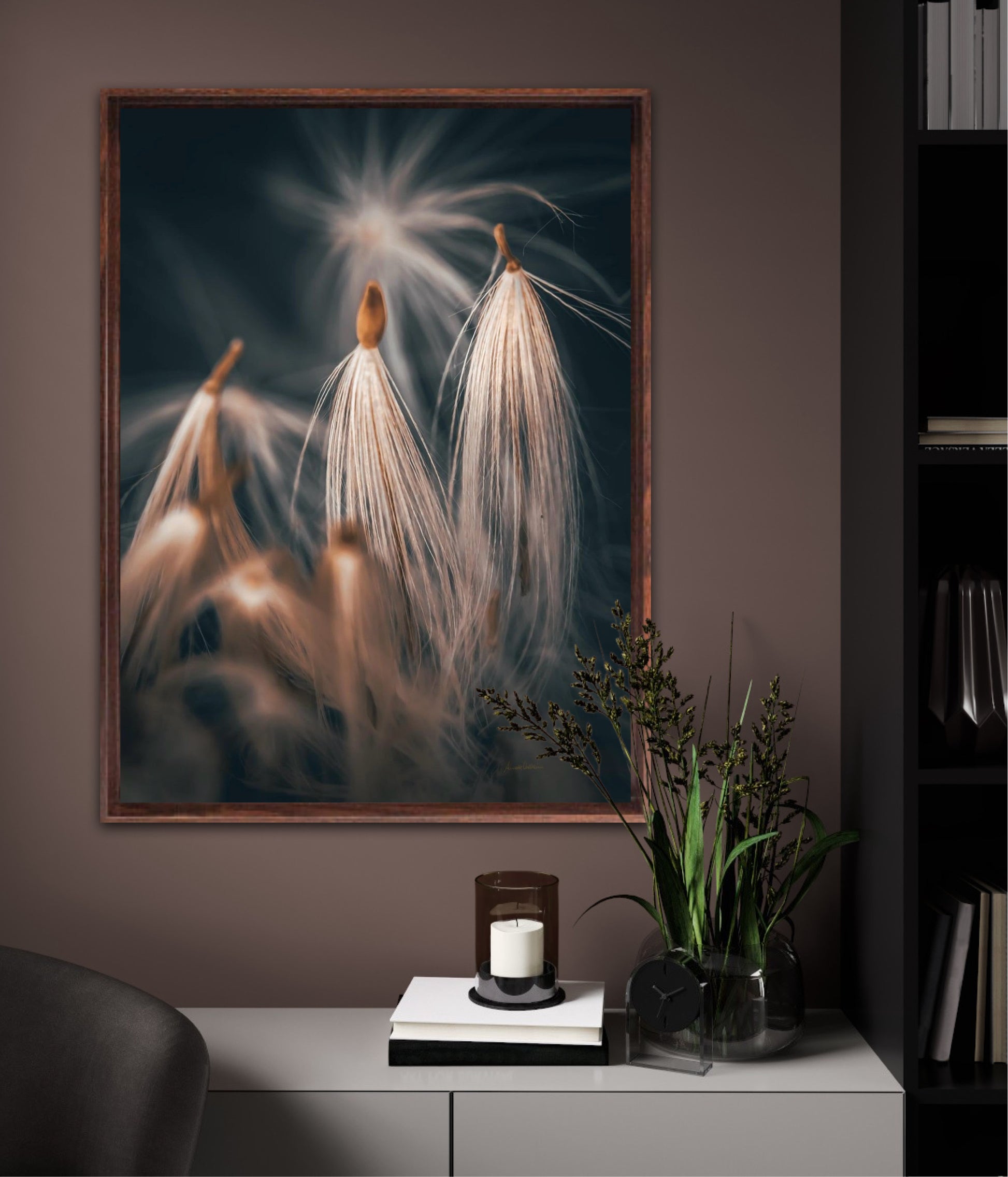 Beautiful photographic wall art of dandelion seeds close-up in lovely warm tones on a blue-gray background. Get a special and beautiful image on your wall too.