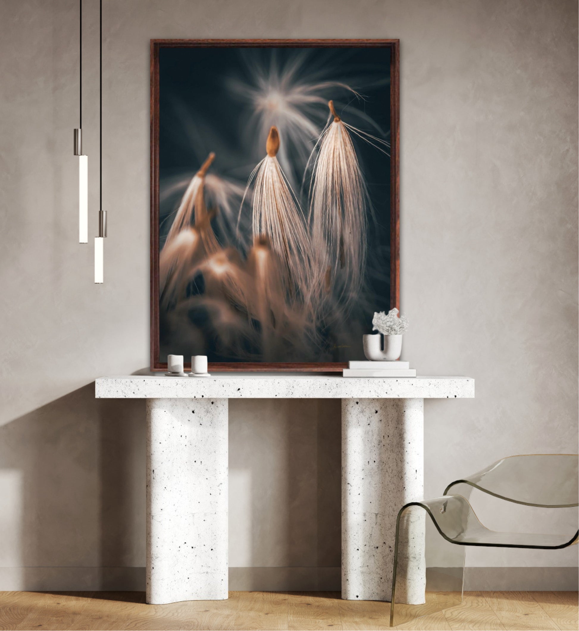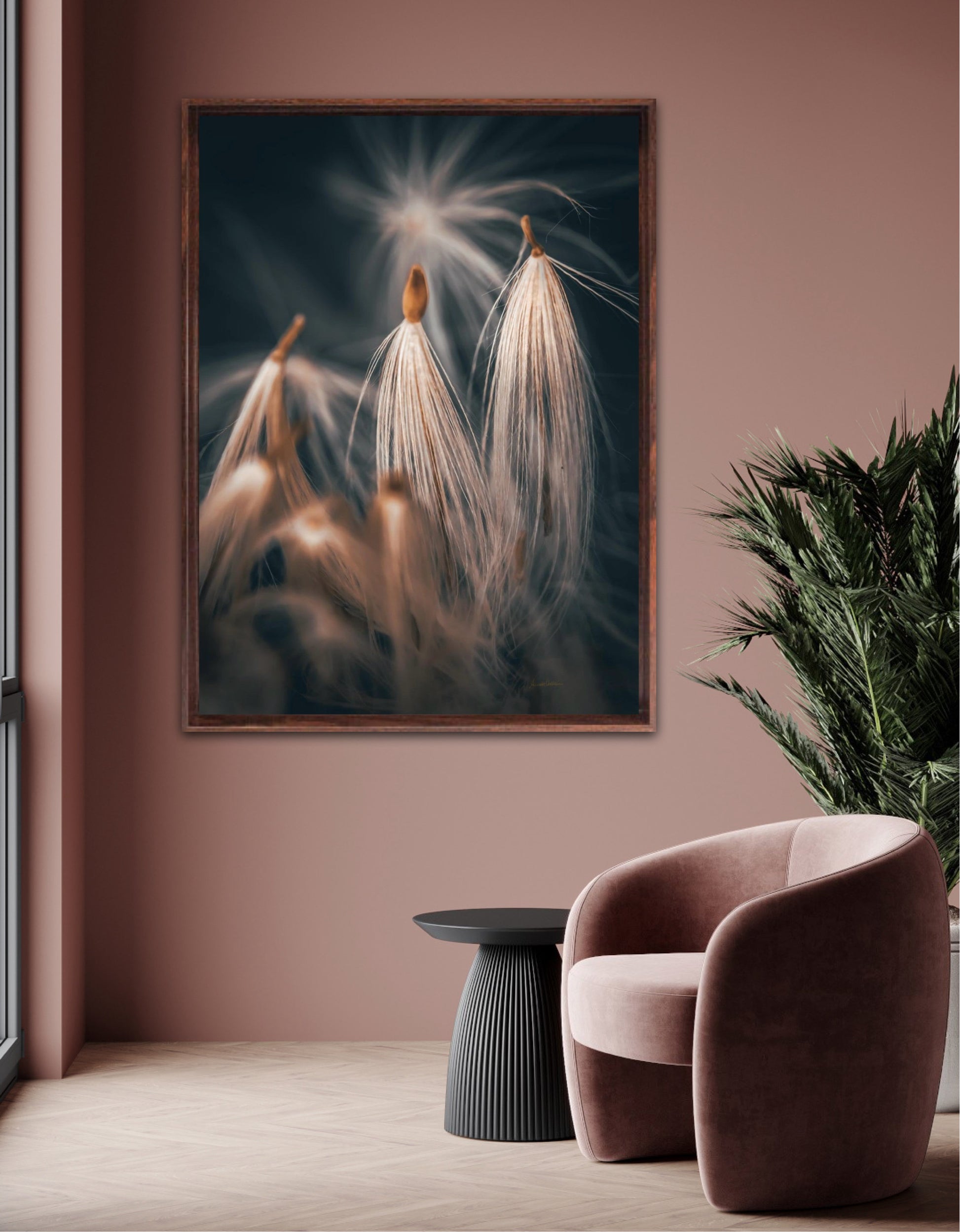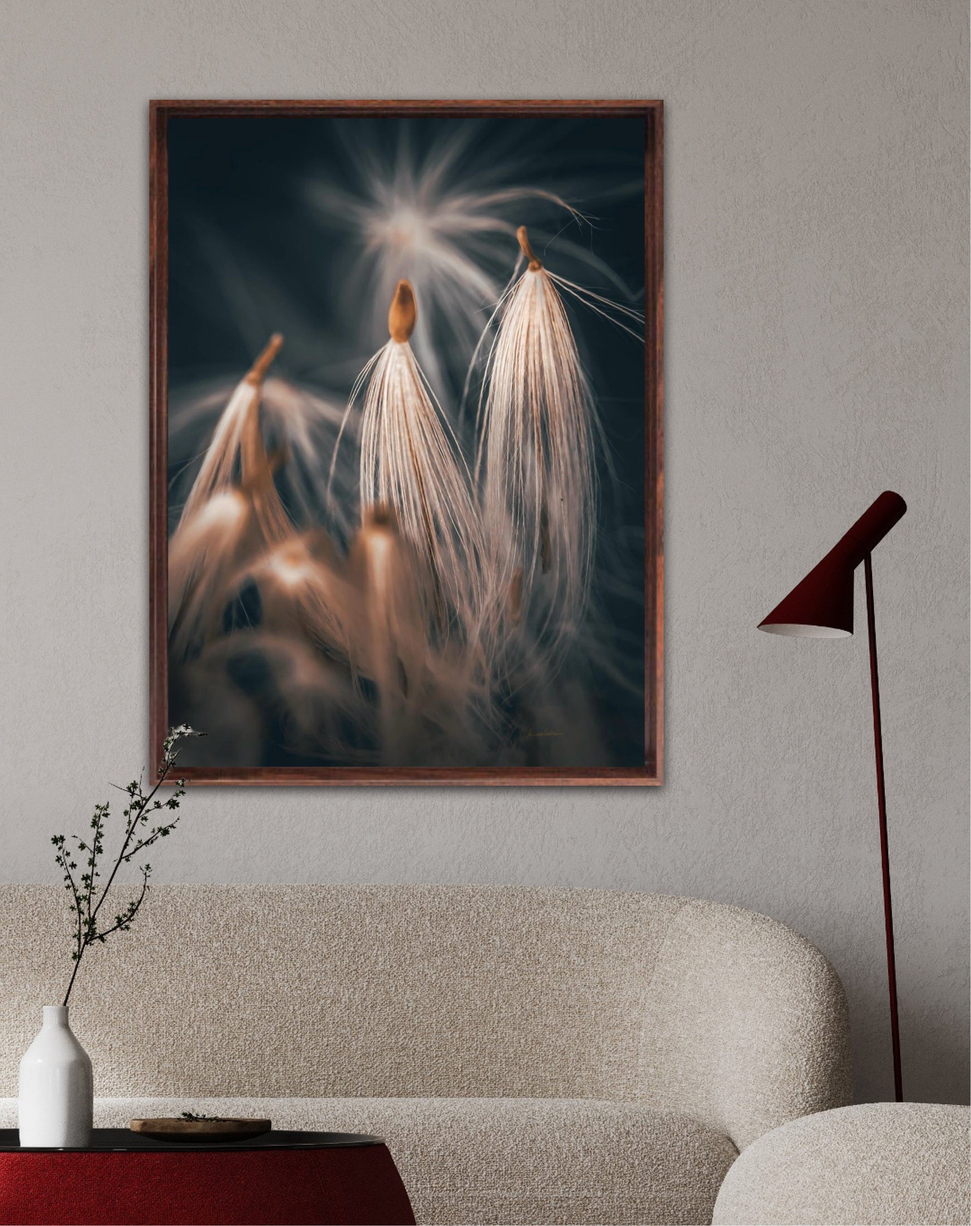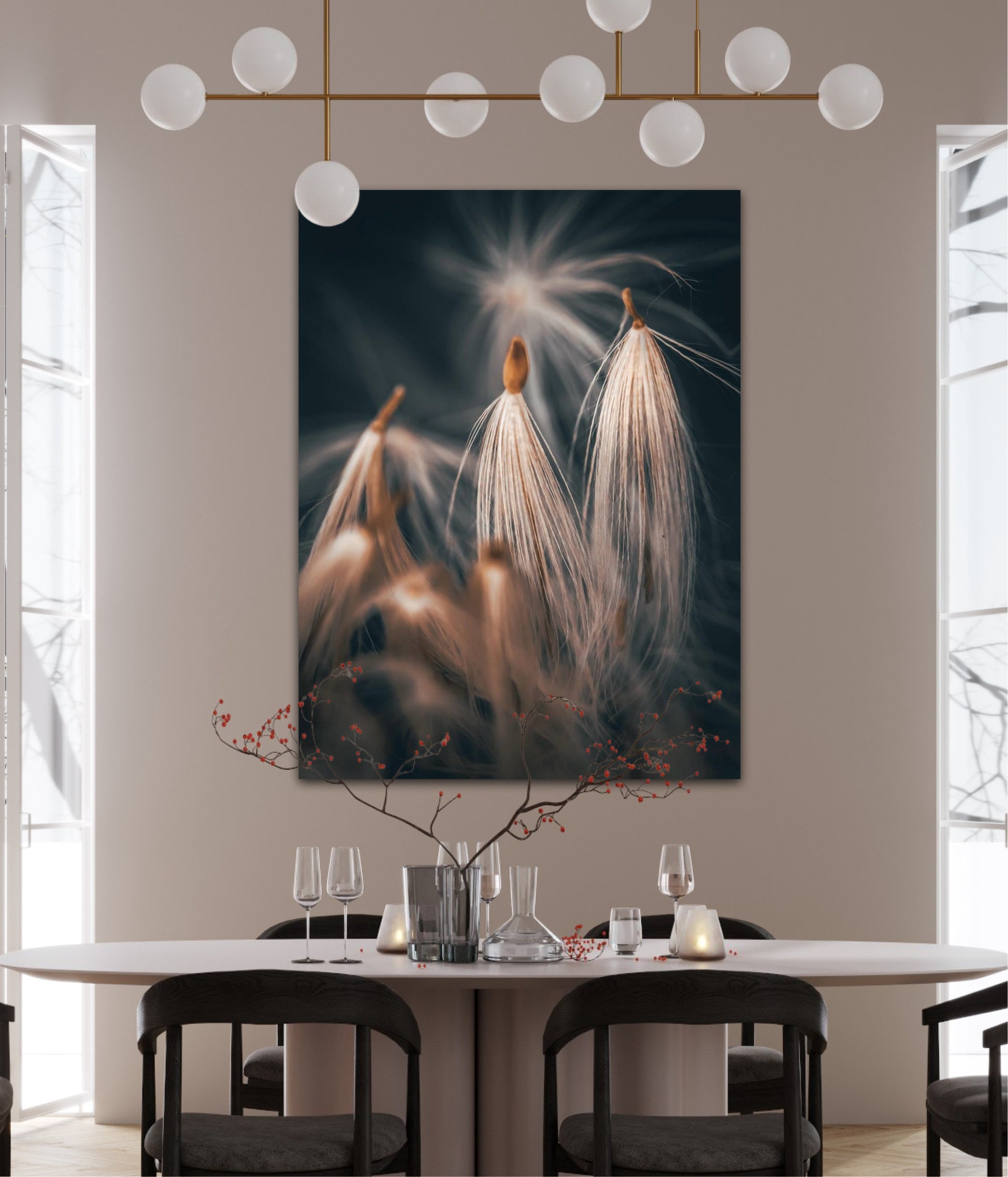 Beautiful photographic wall art of dandelion seeds close-up in lovely warm tones on a blue-gray background. Get a special and beautiful image on your wall too.