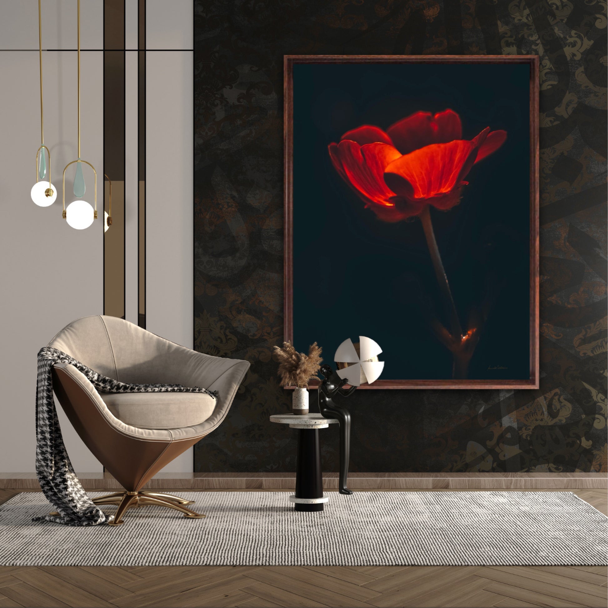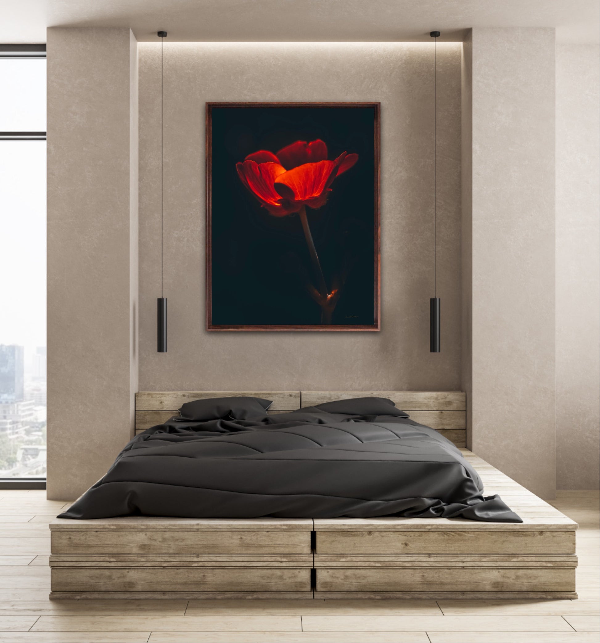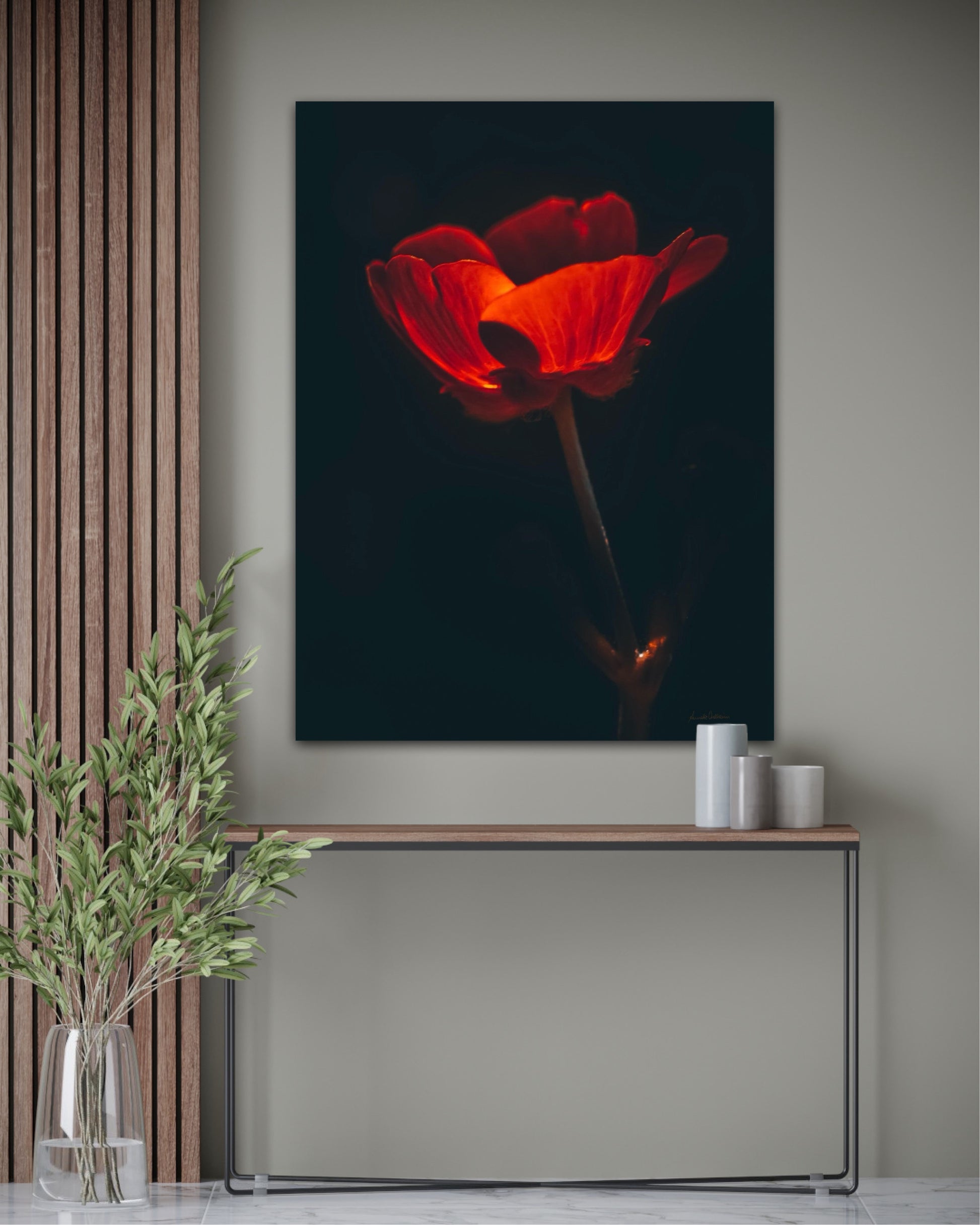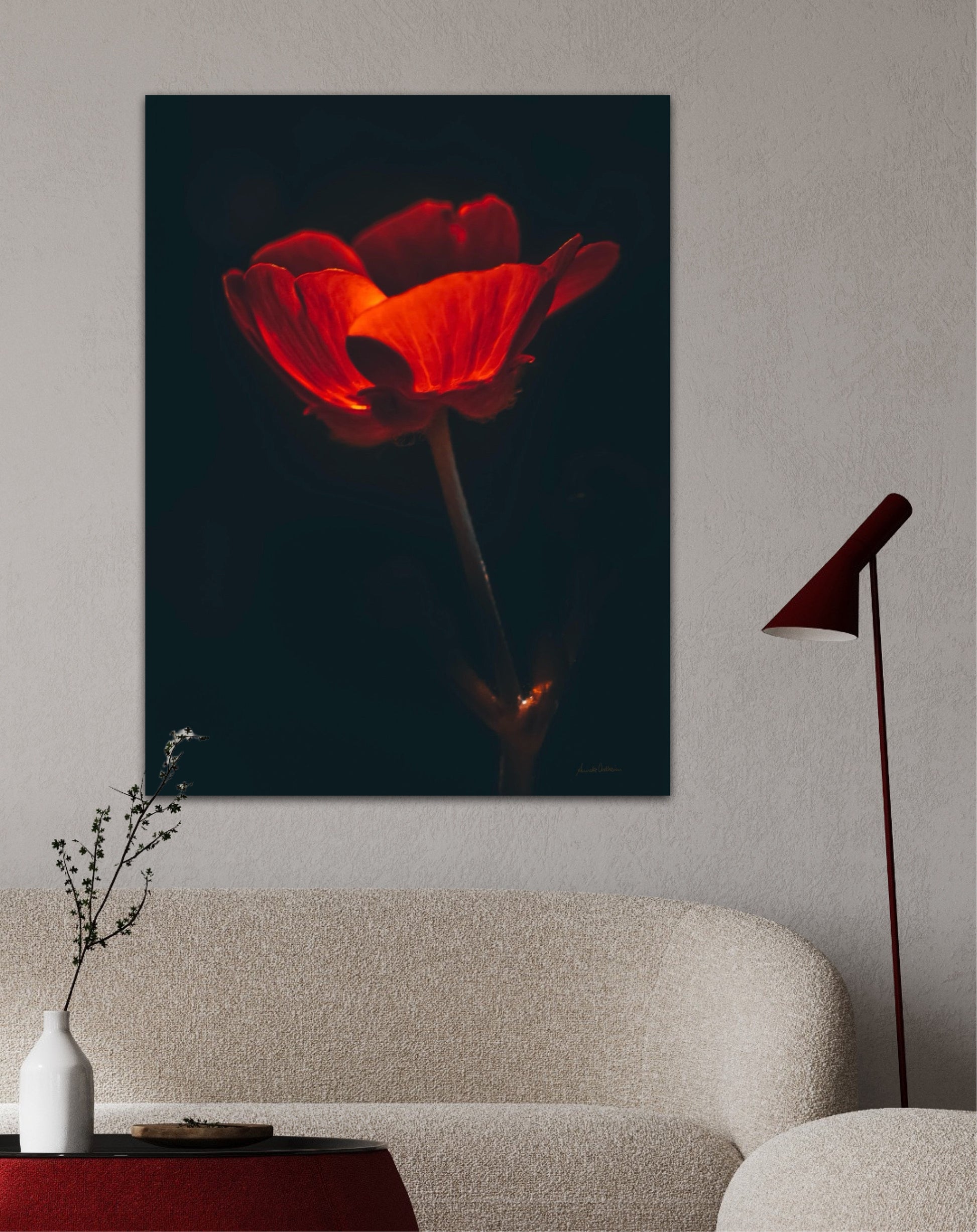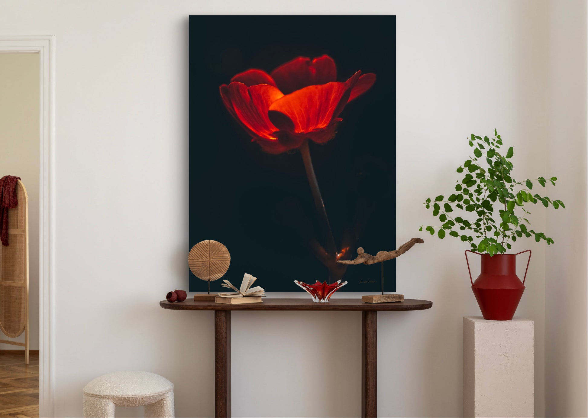 Beautiful photographic wall art of a flower in deep red tones on a black background.