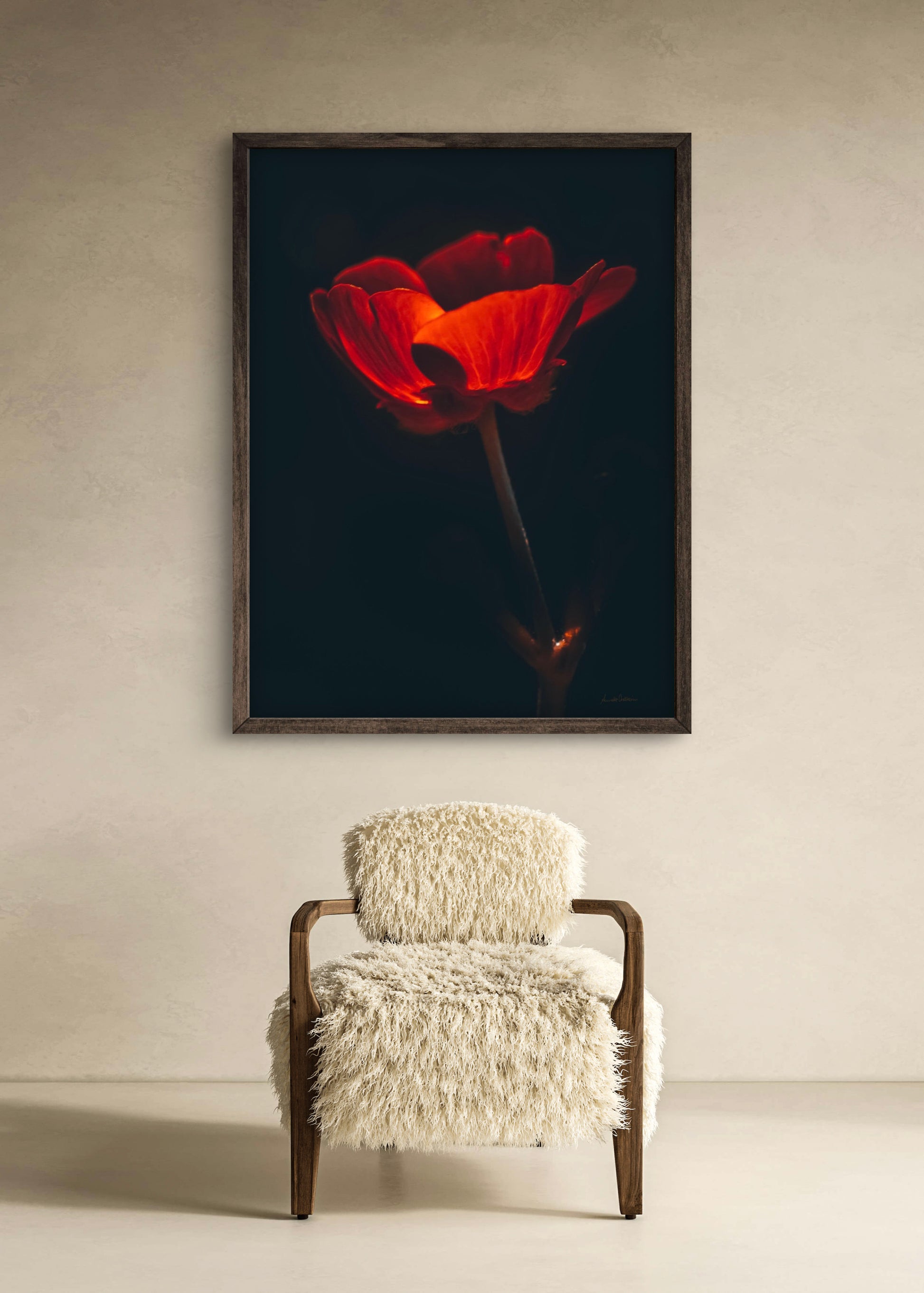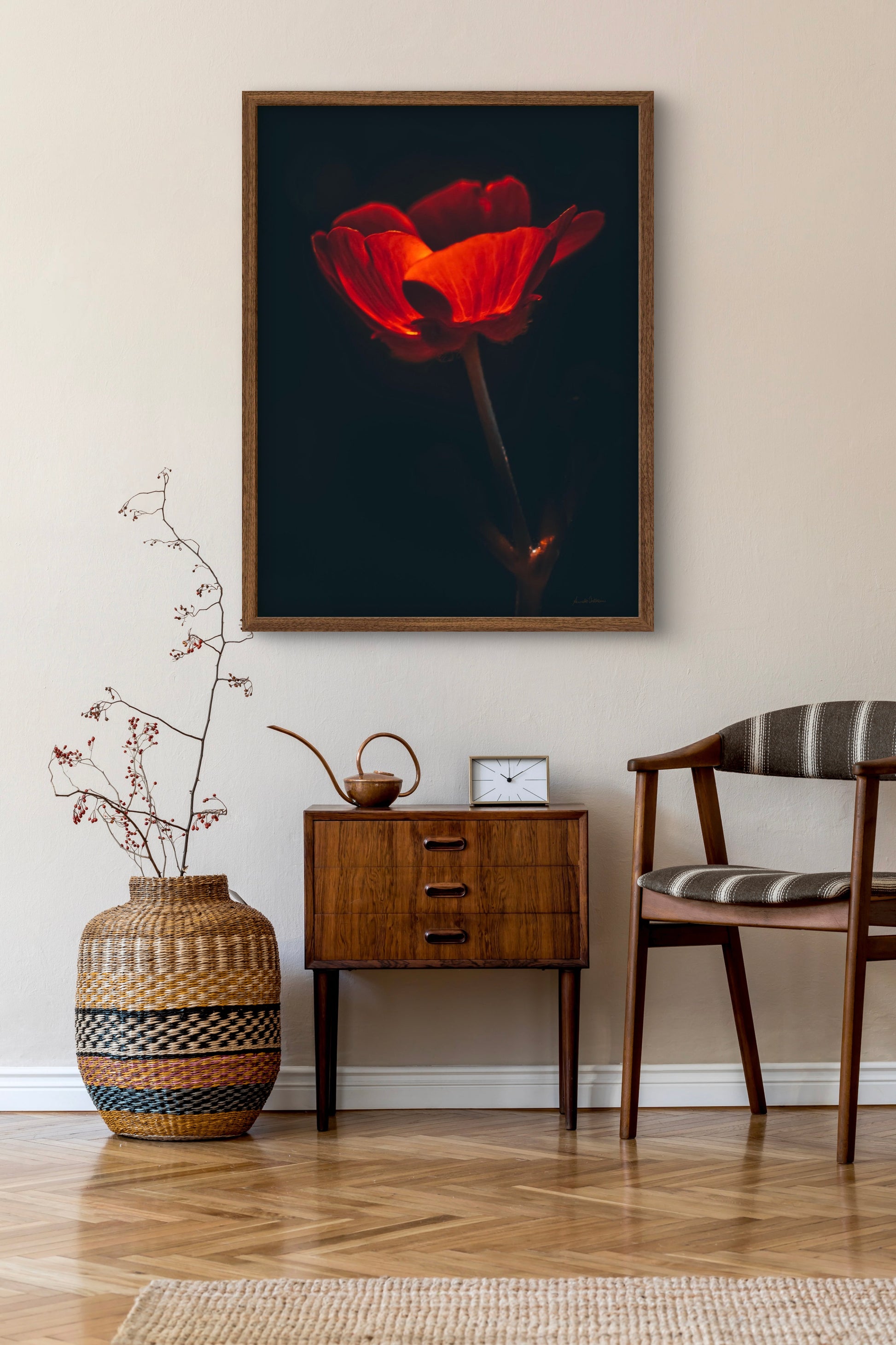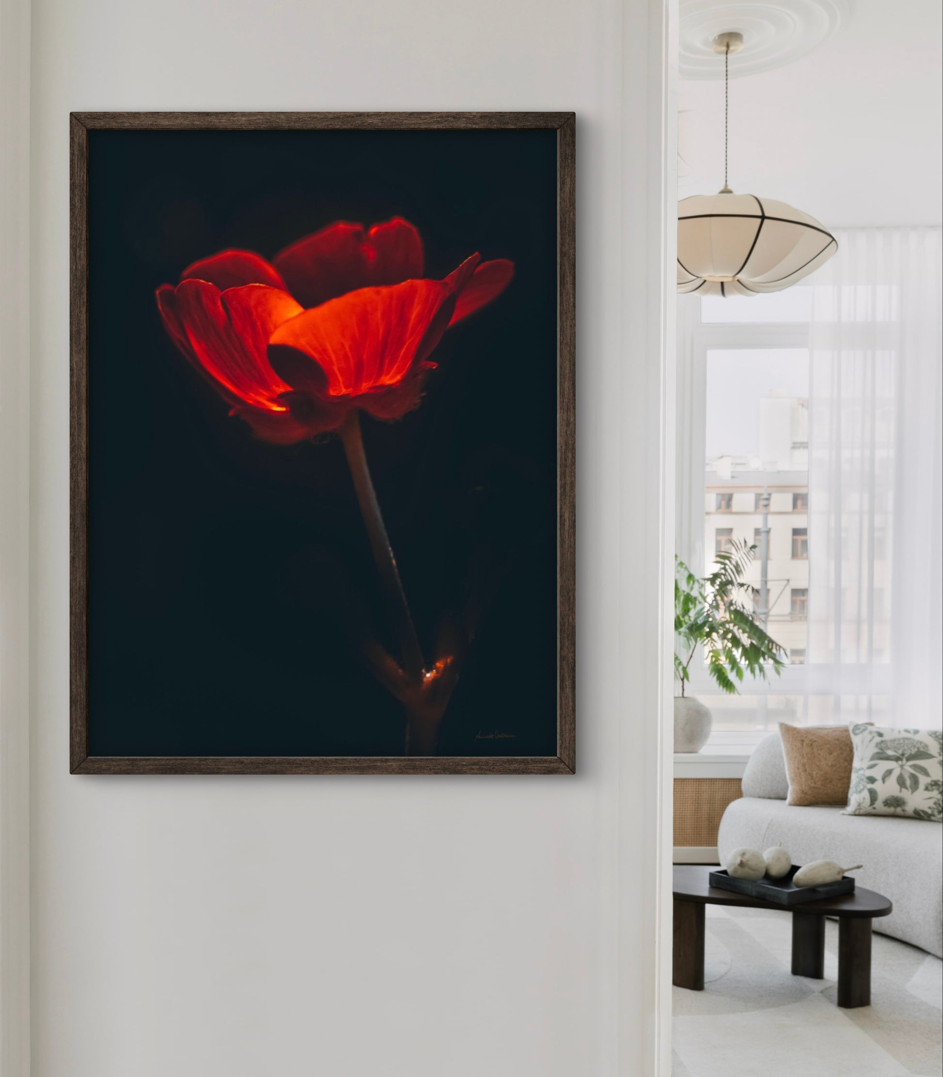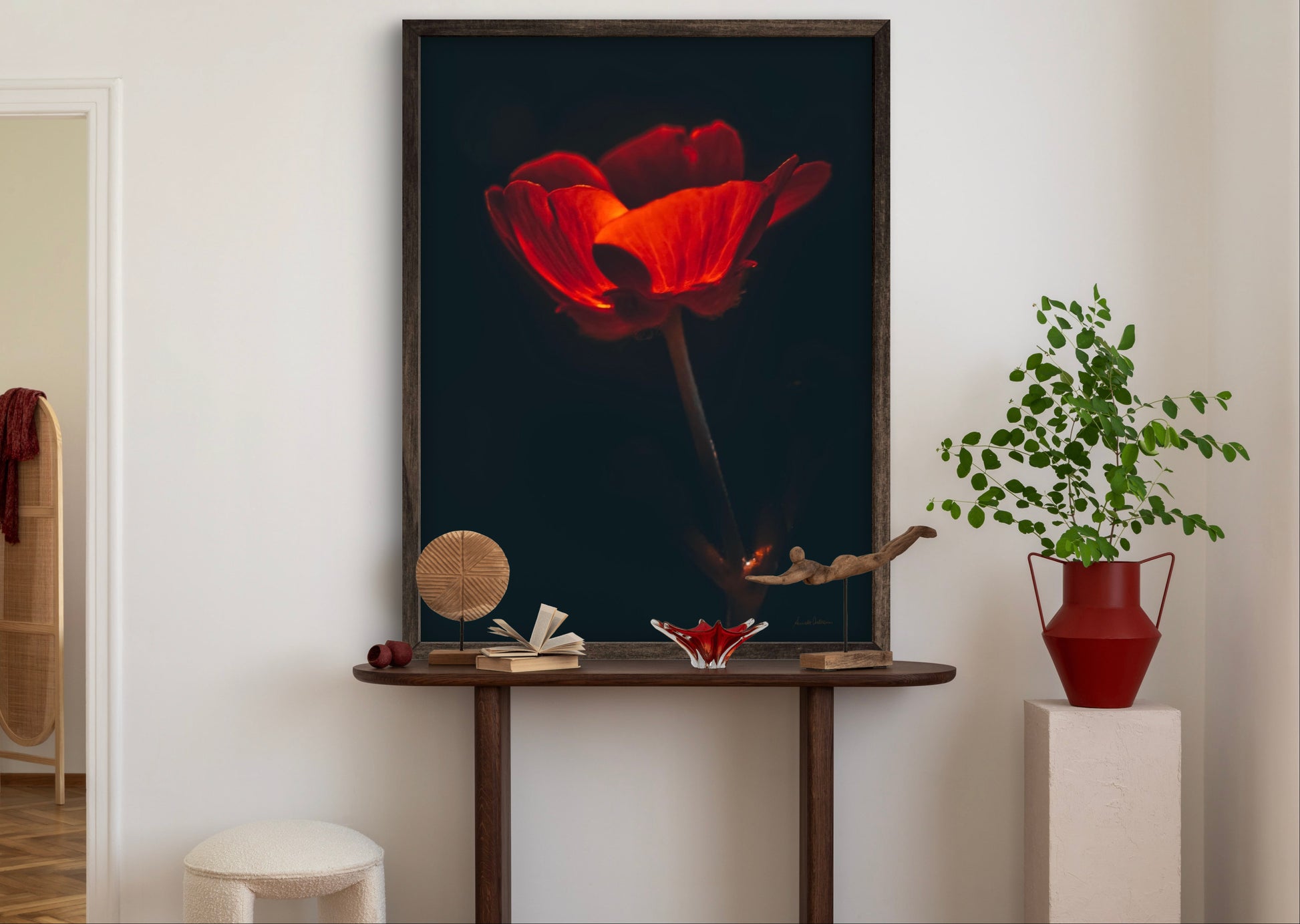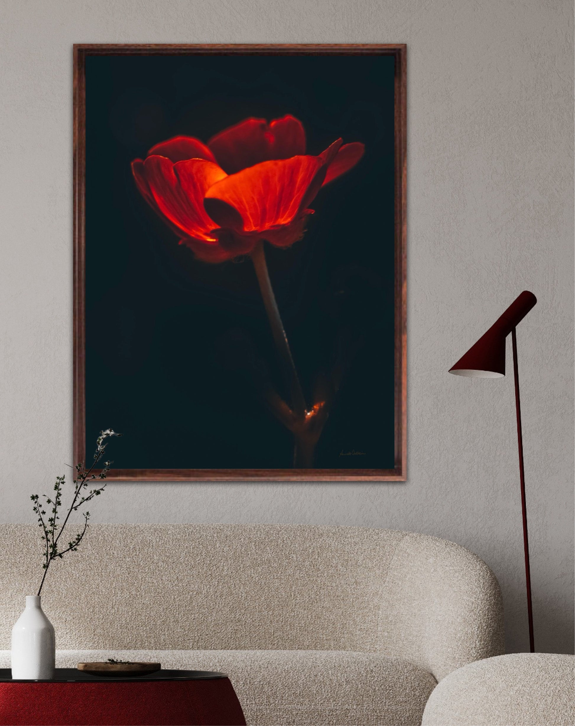 Beautiful photographic wall art of a flower in deep red tones on a black background.