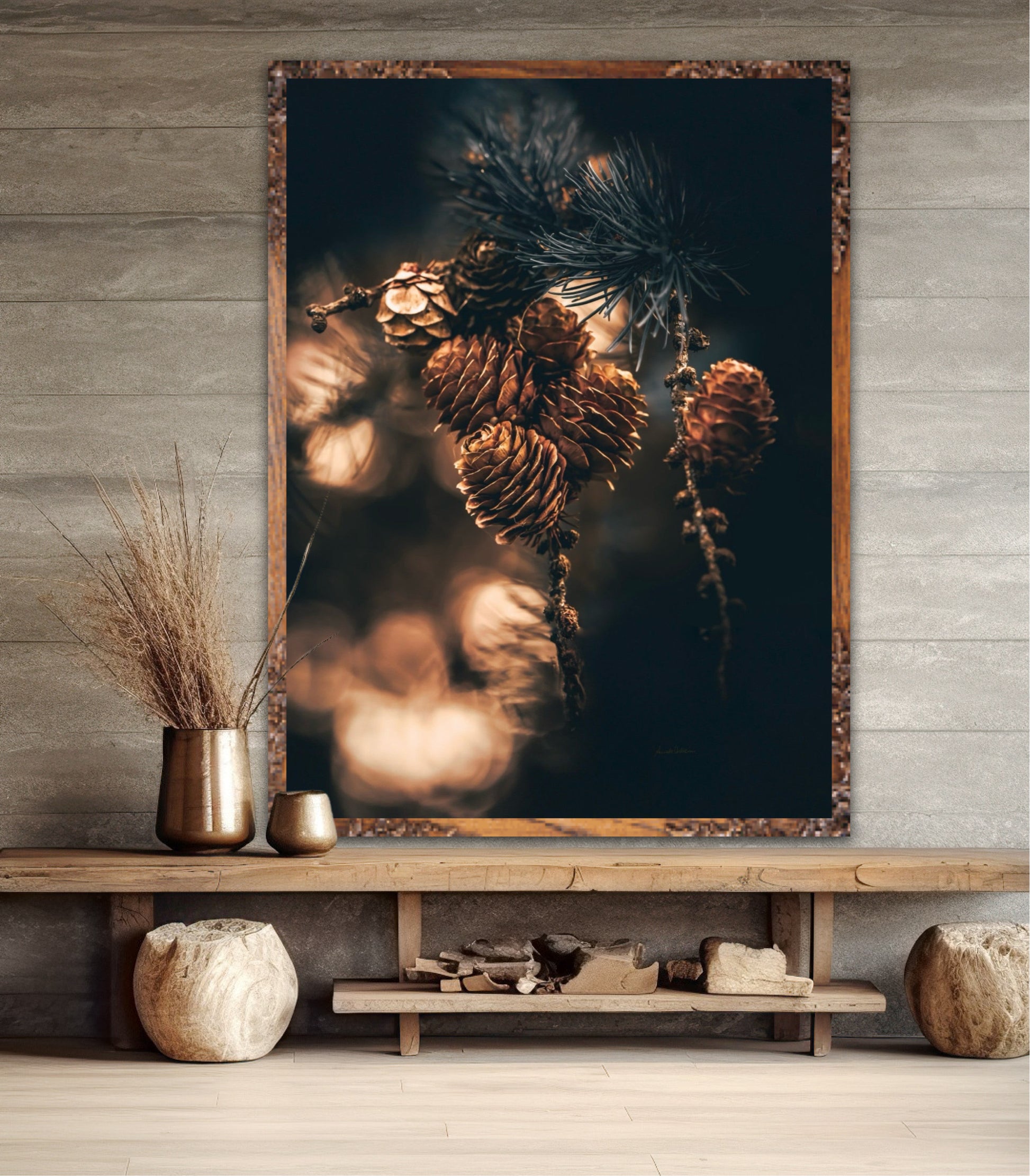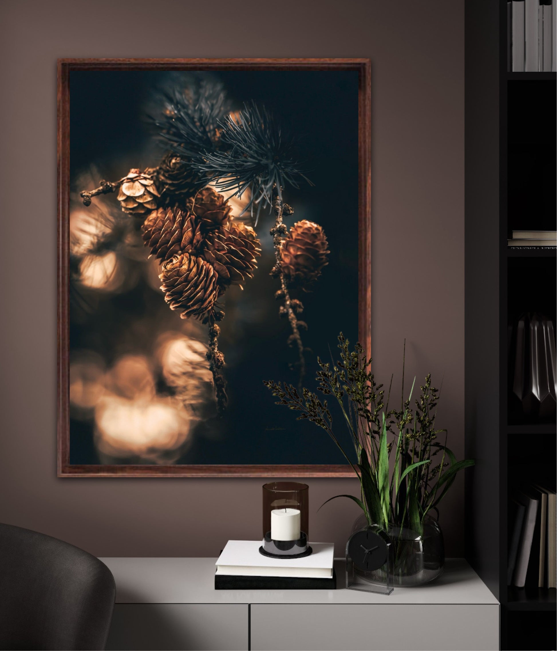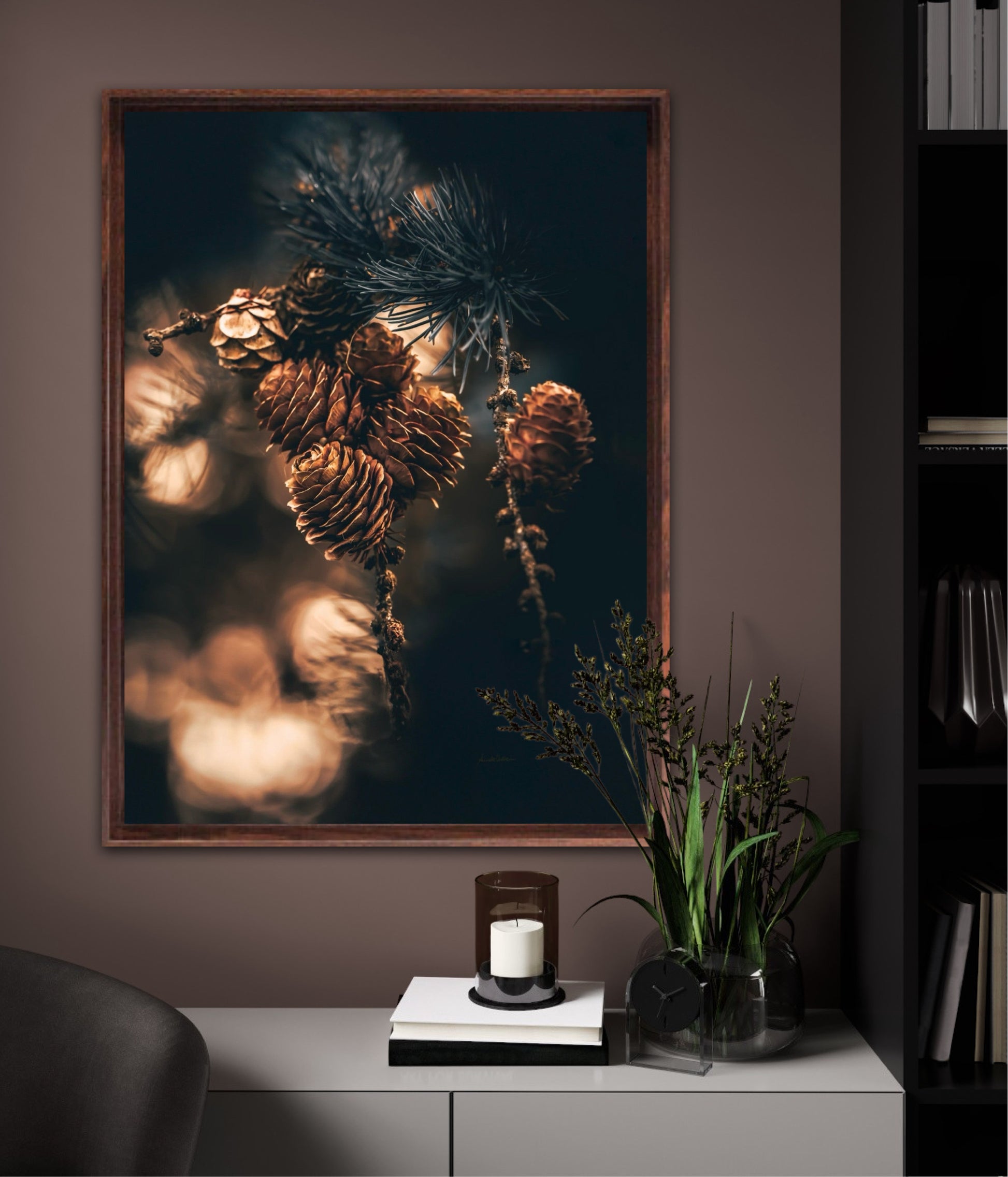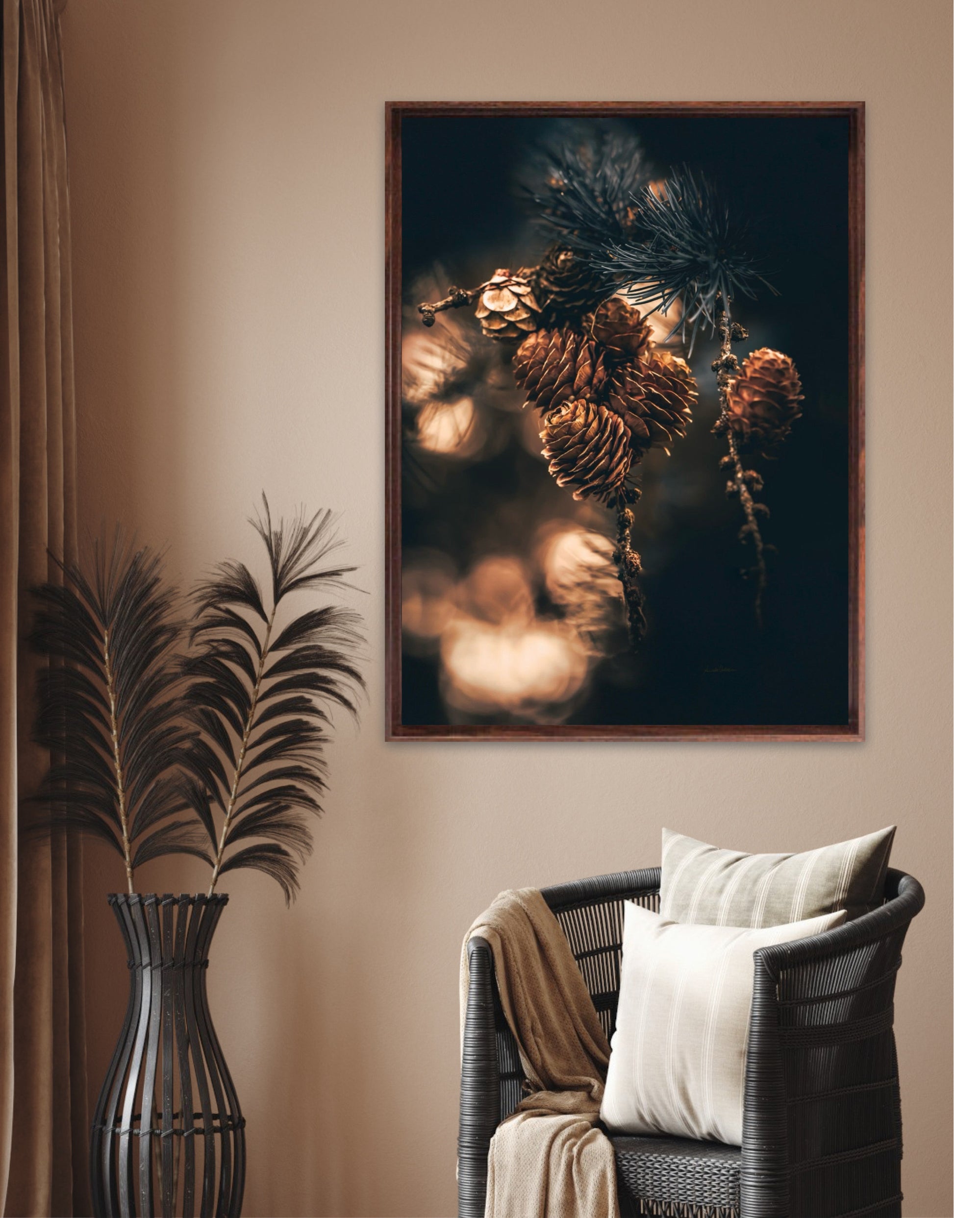 Beautiful photographic wall art of larch cones in lovely warm golden tones. Get a warming and mood-creating art piece on your wall too.