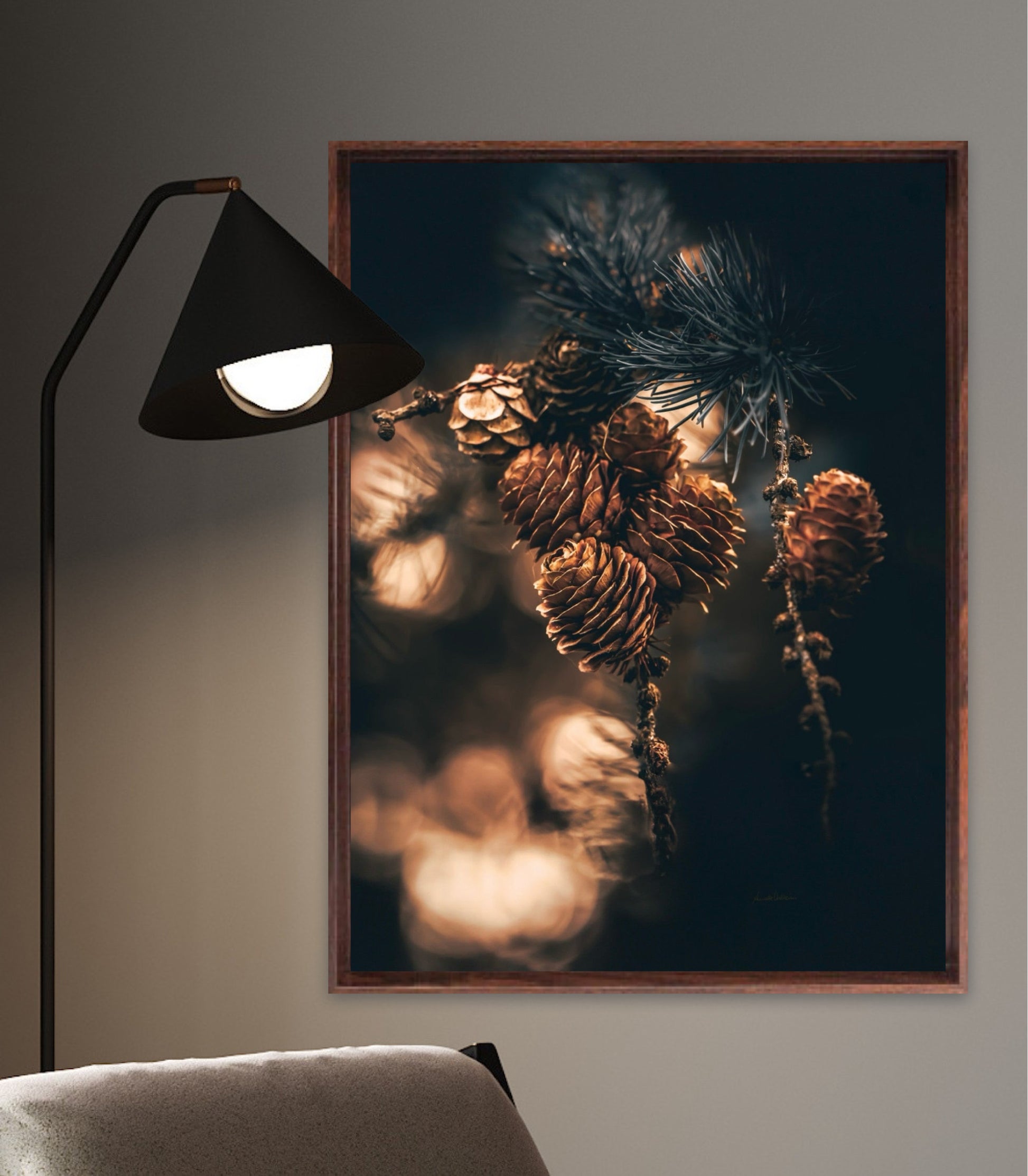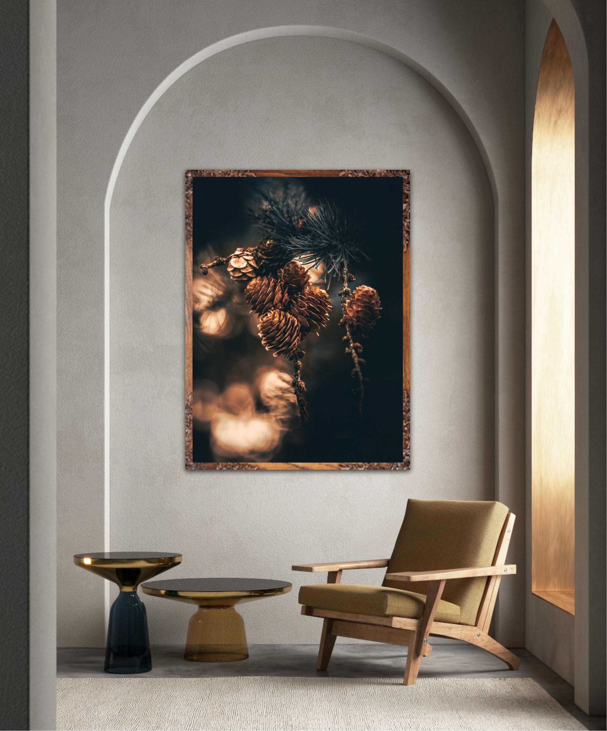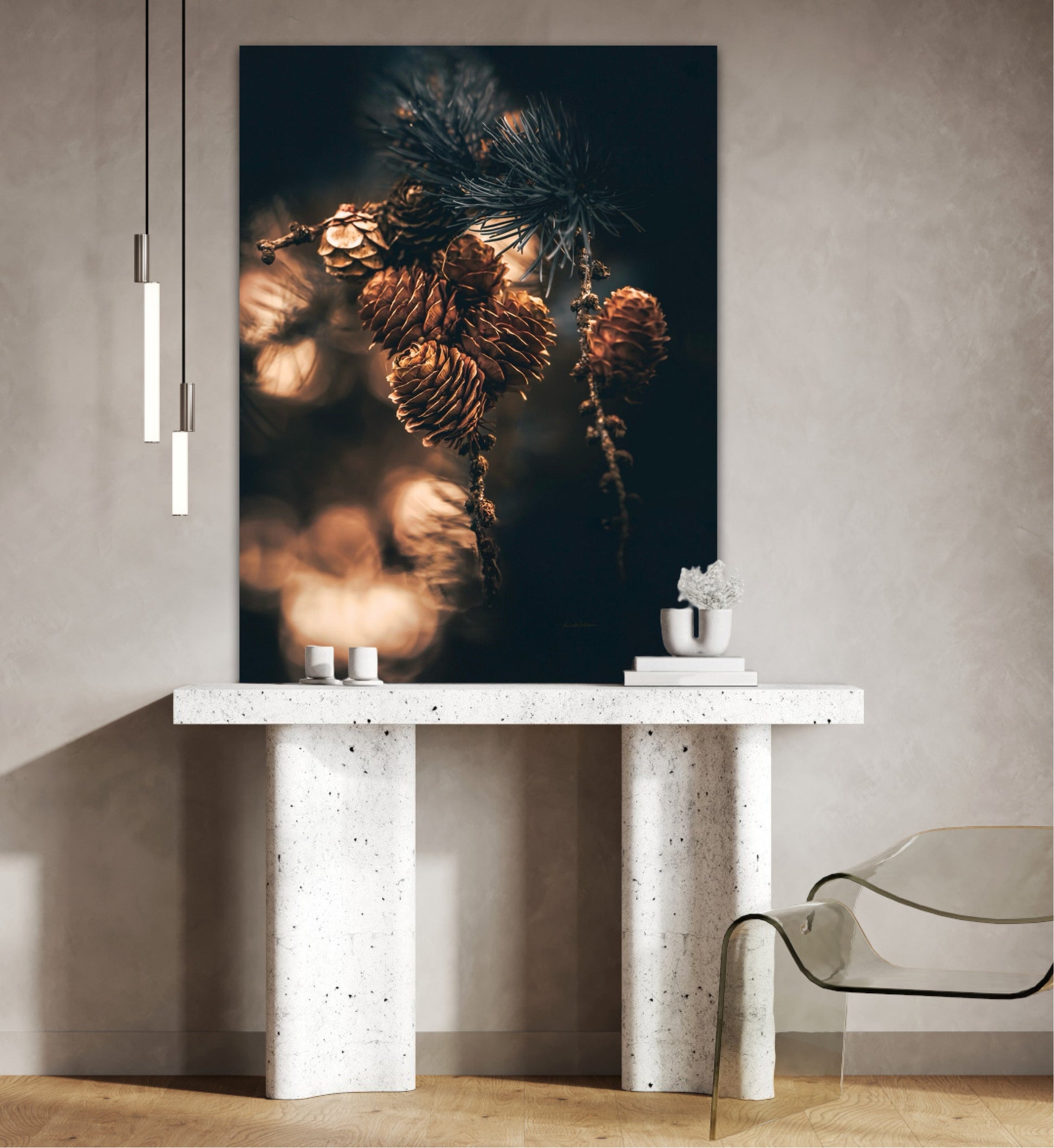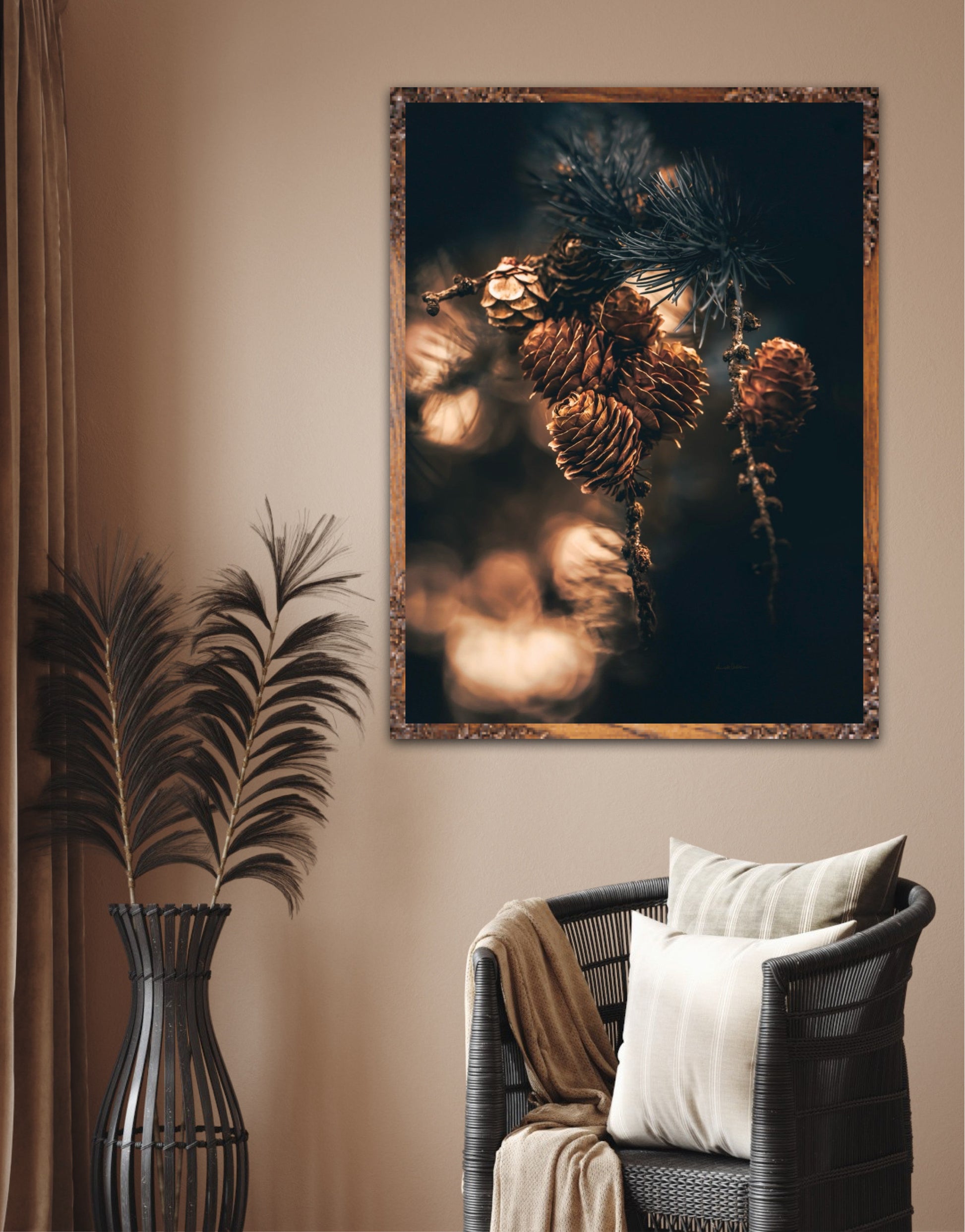 Beautiful photographic wall art of larch cones in lovely warm golden tones. Get a warming and mood-creating art piece on your wall too.