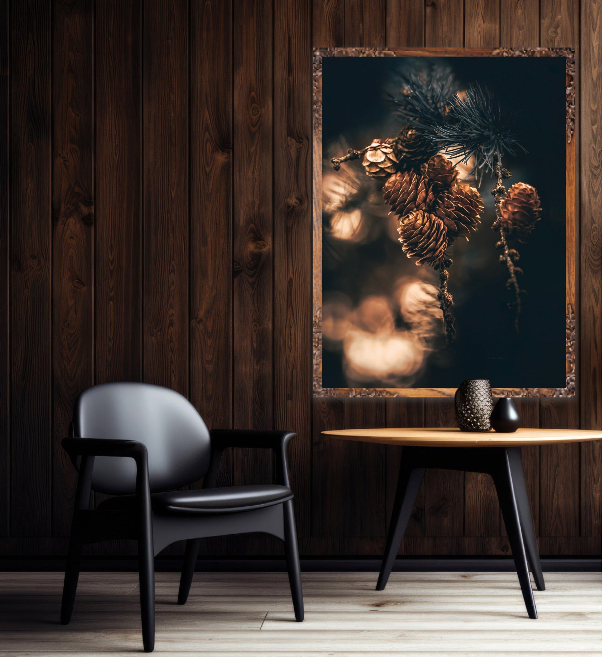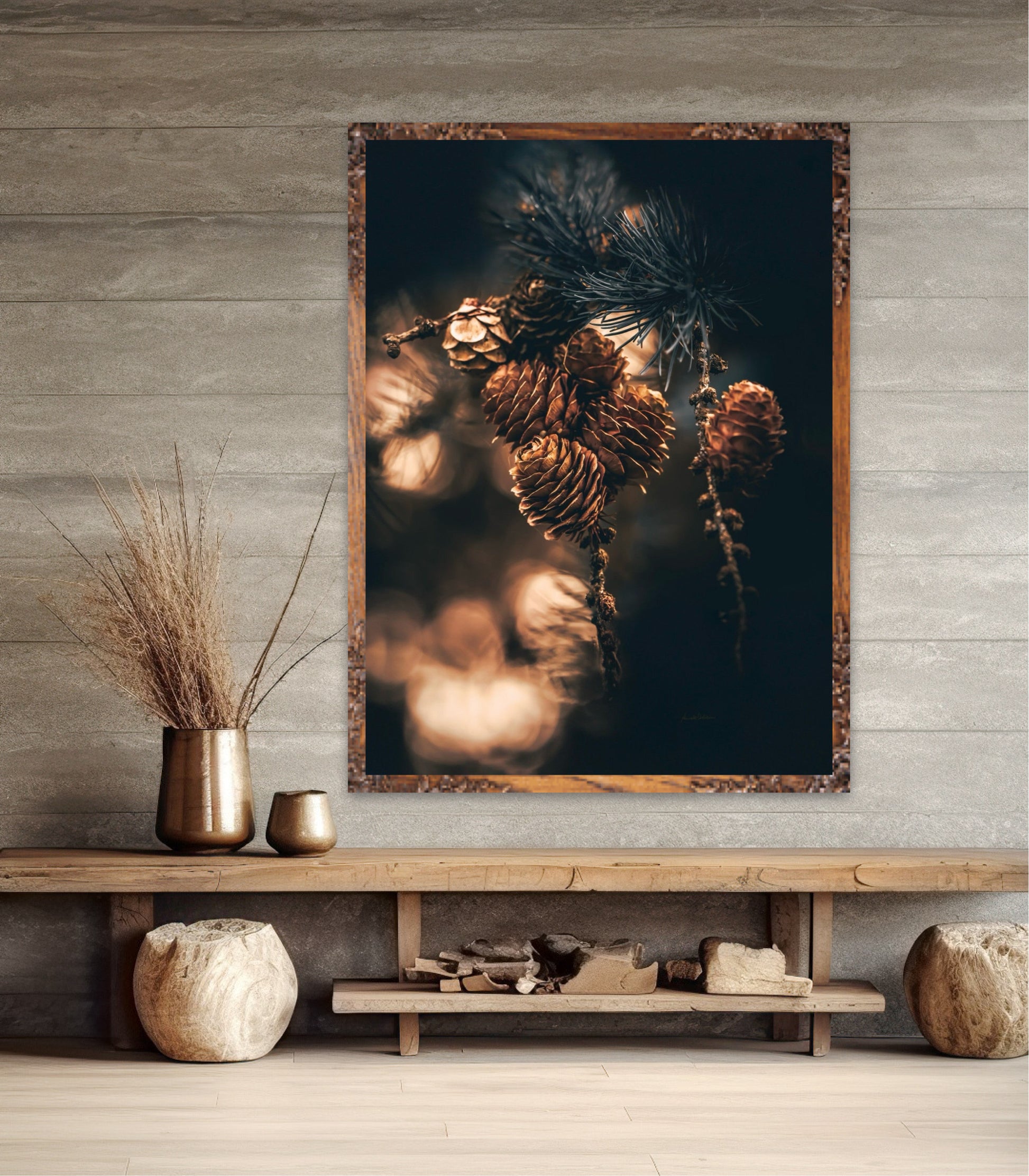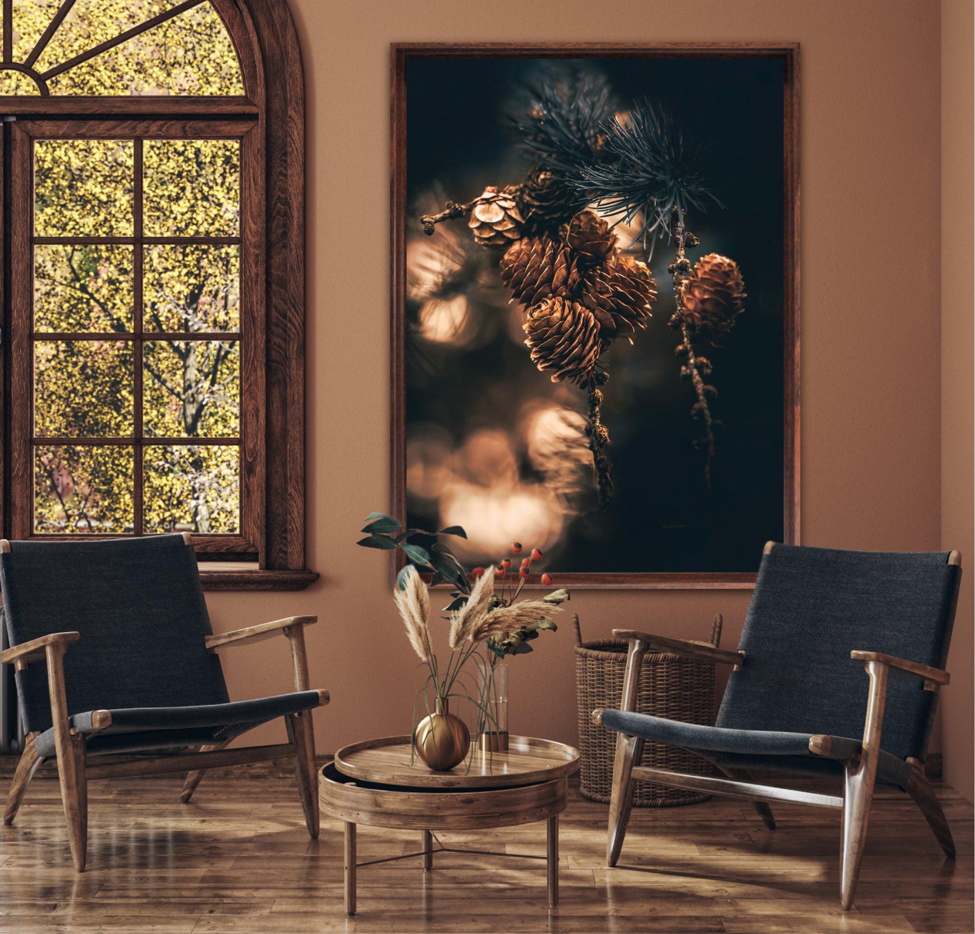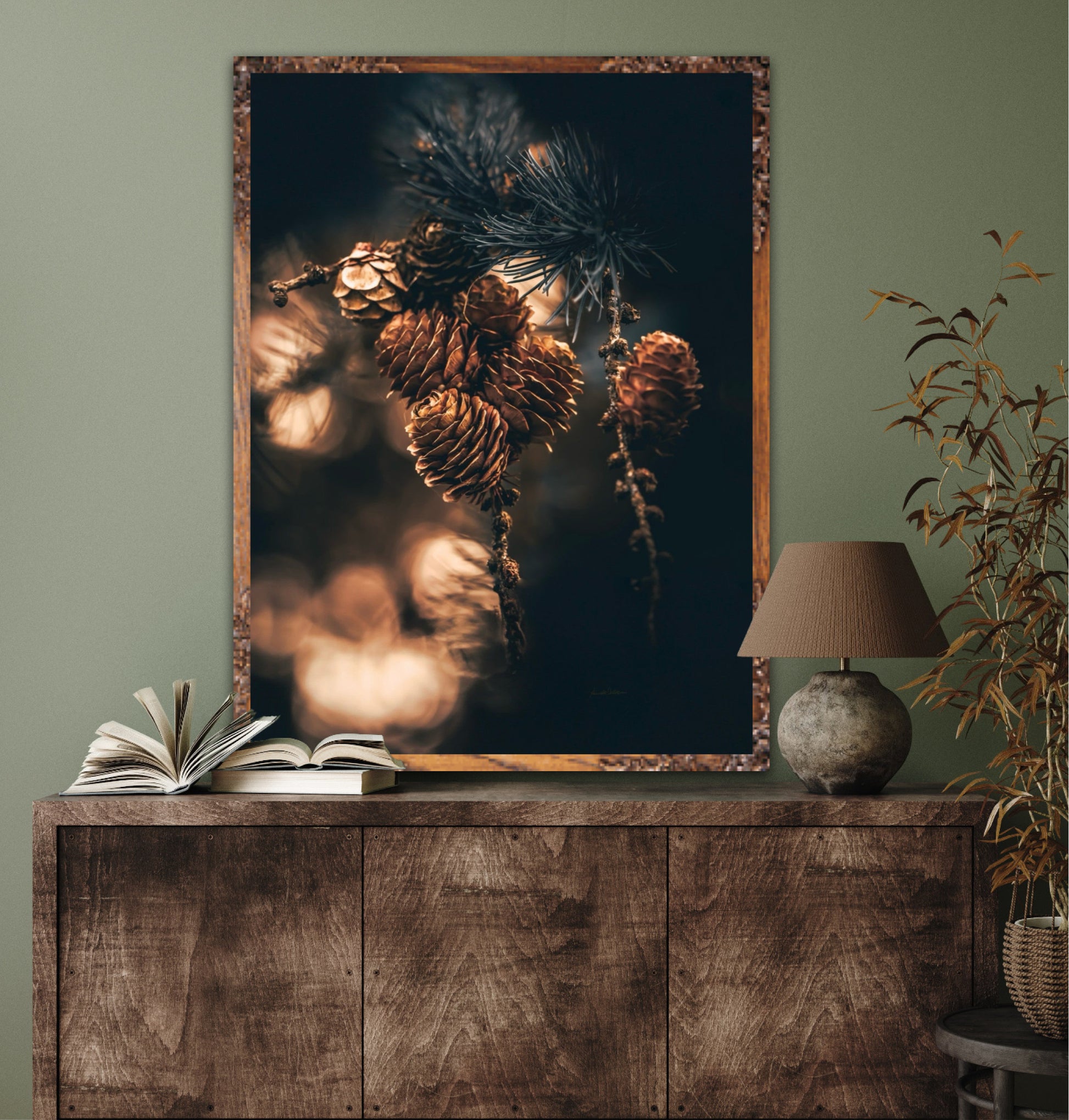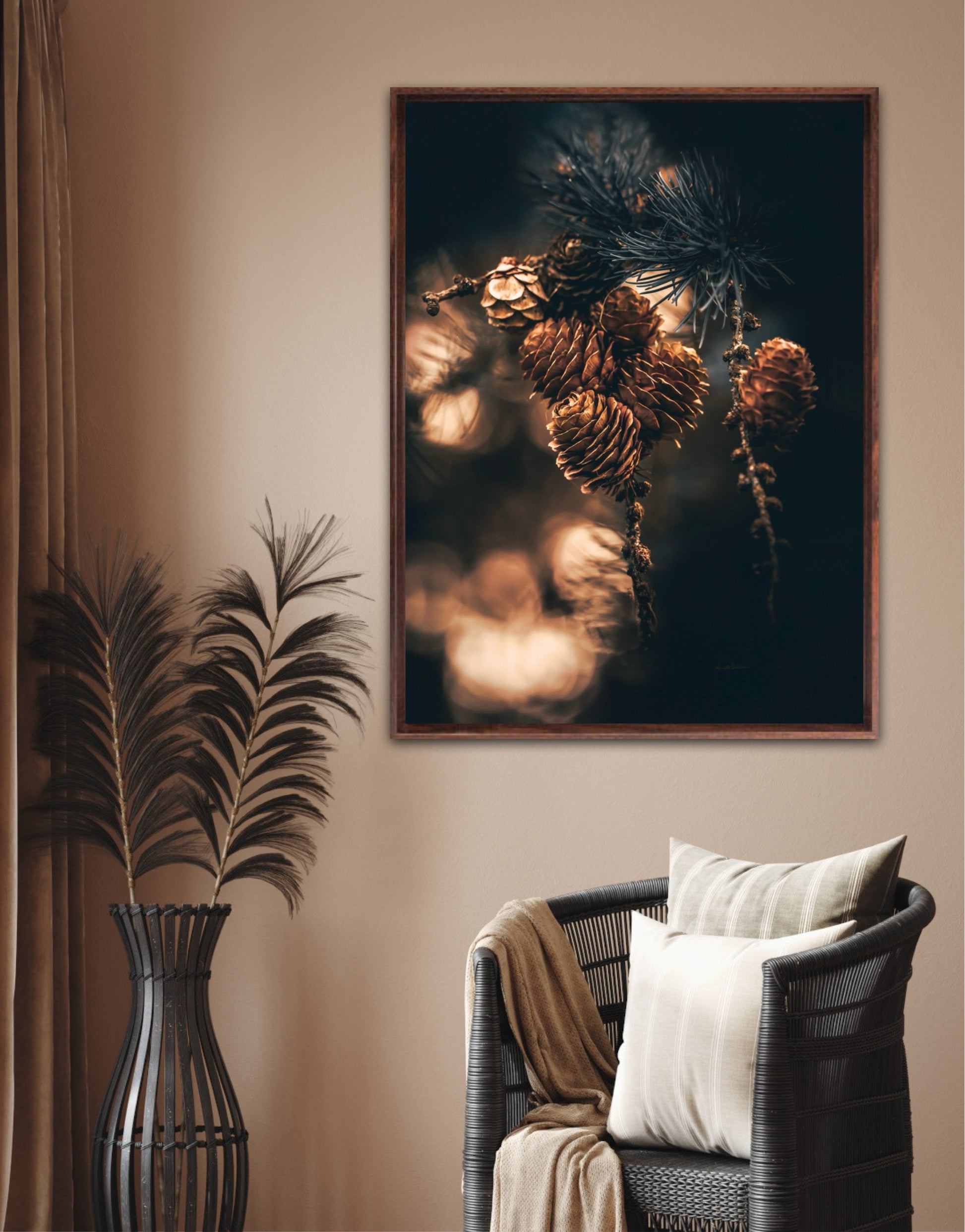 Beautiful photographic wall art of larch cones in lovely warm golden tones. Get a warming and mood-creating art piece on your wall too.