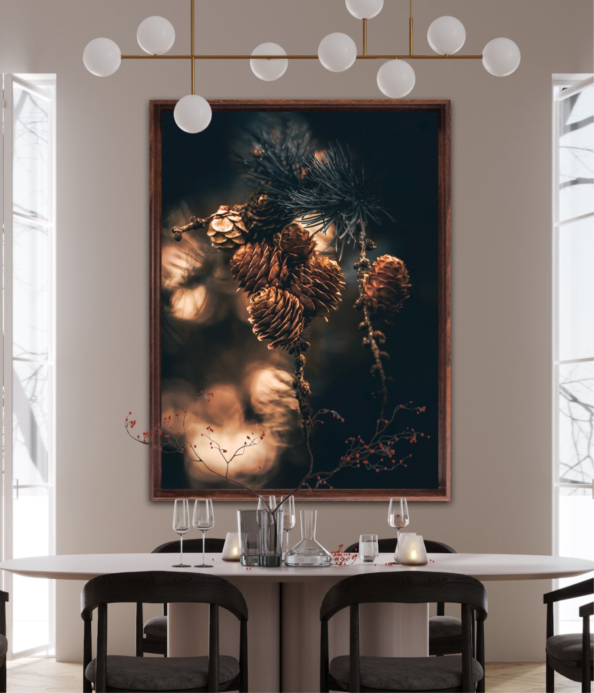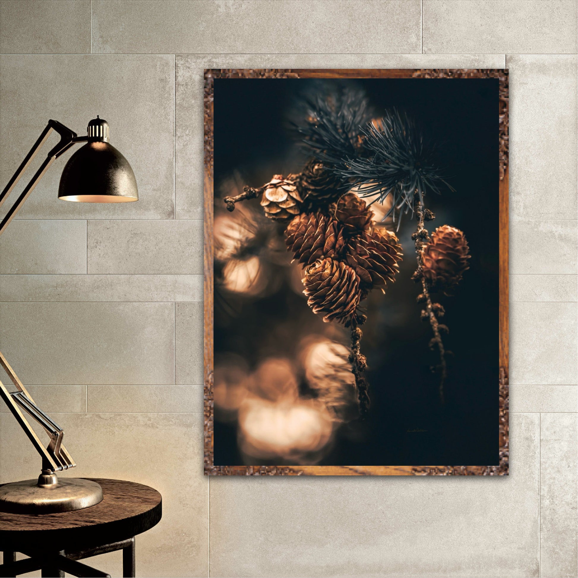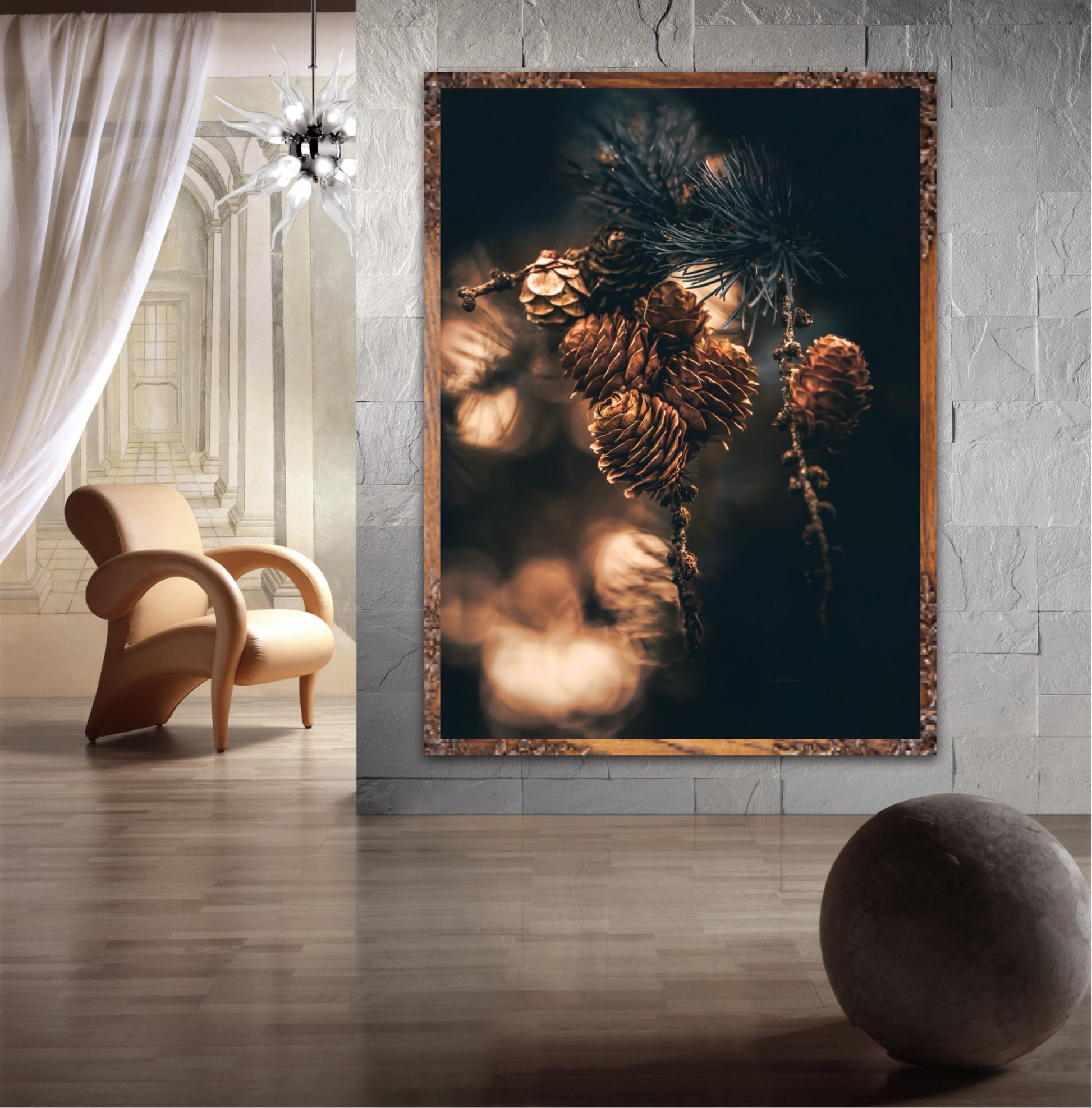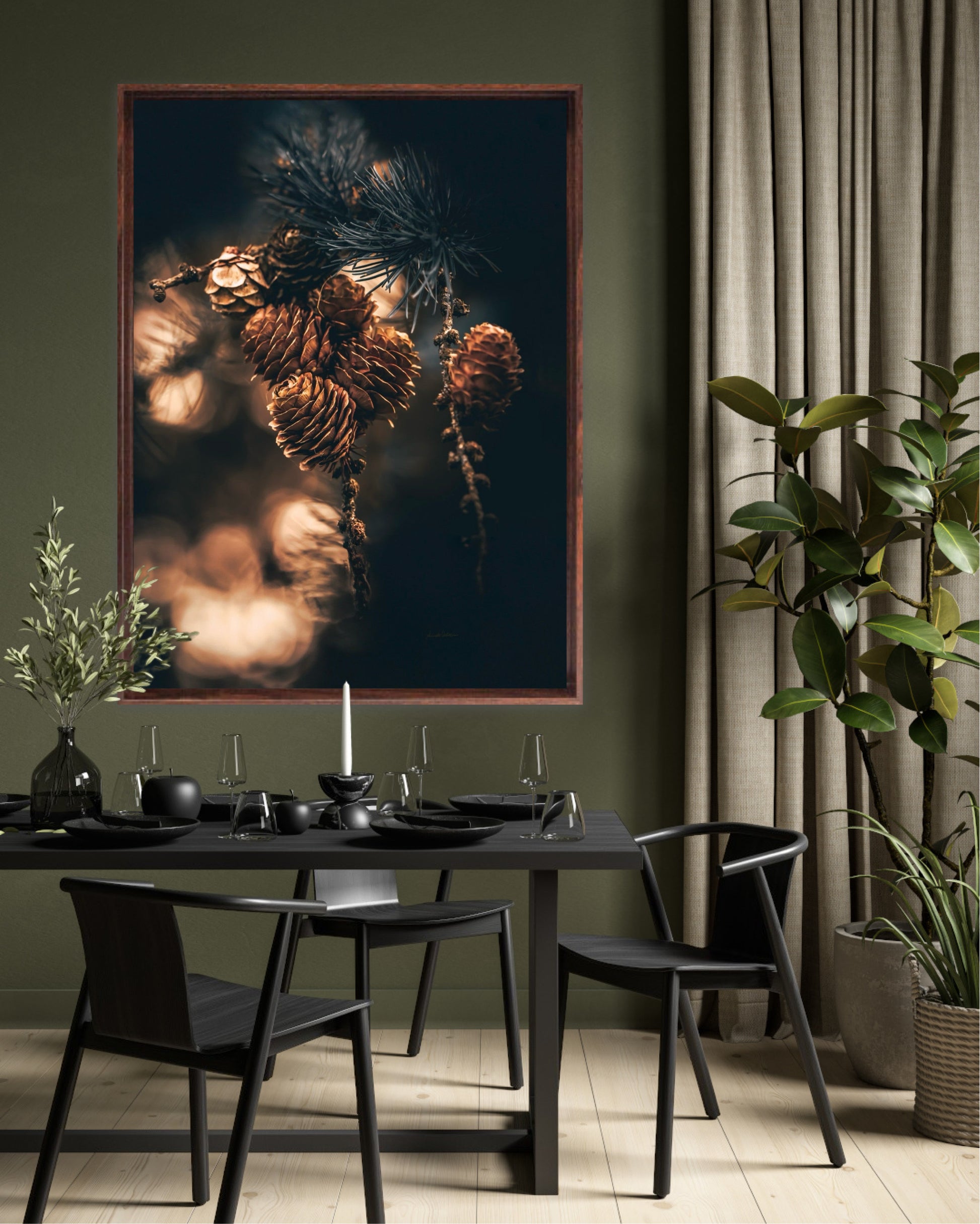 Beautiful photographic wall art of larch cones in lovely warm golden tones. Get a warming and mood-creating art piece on your wall too.
