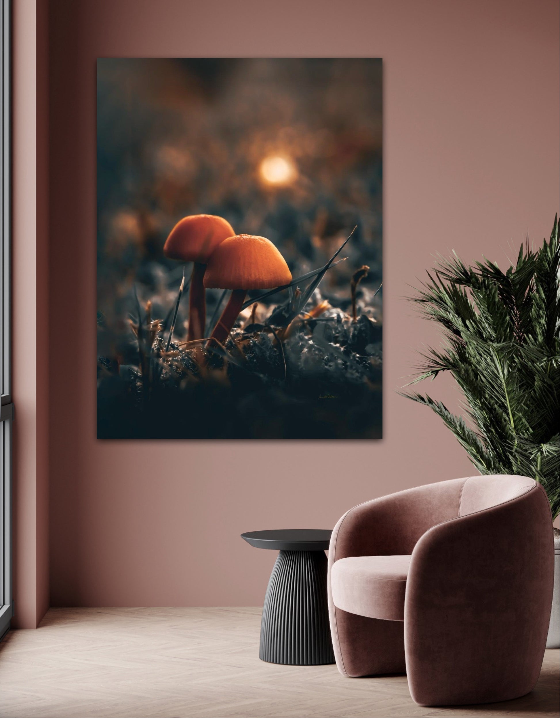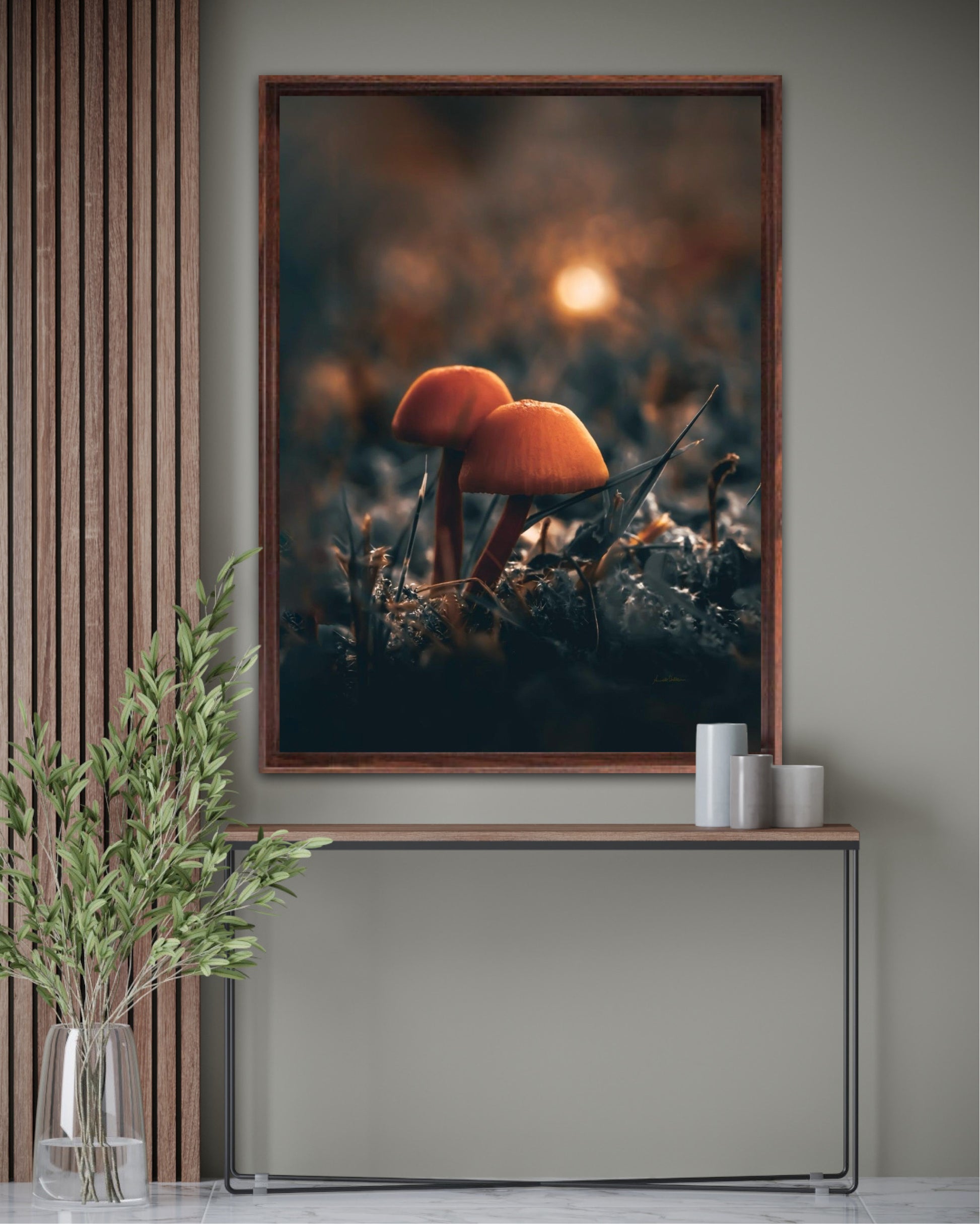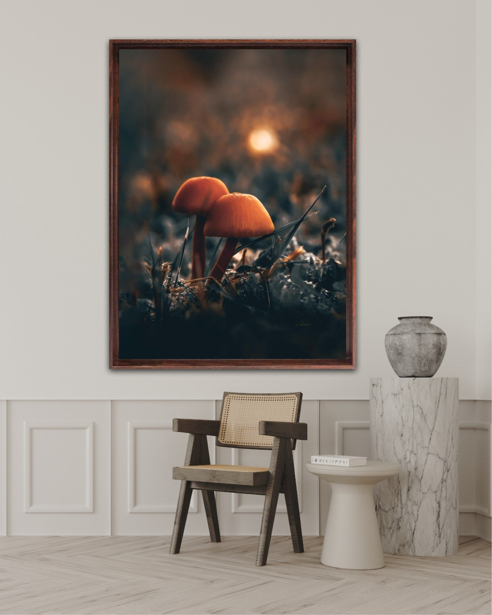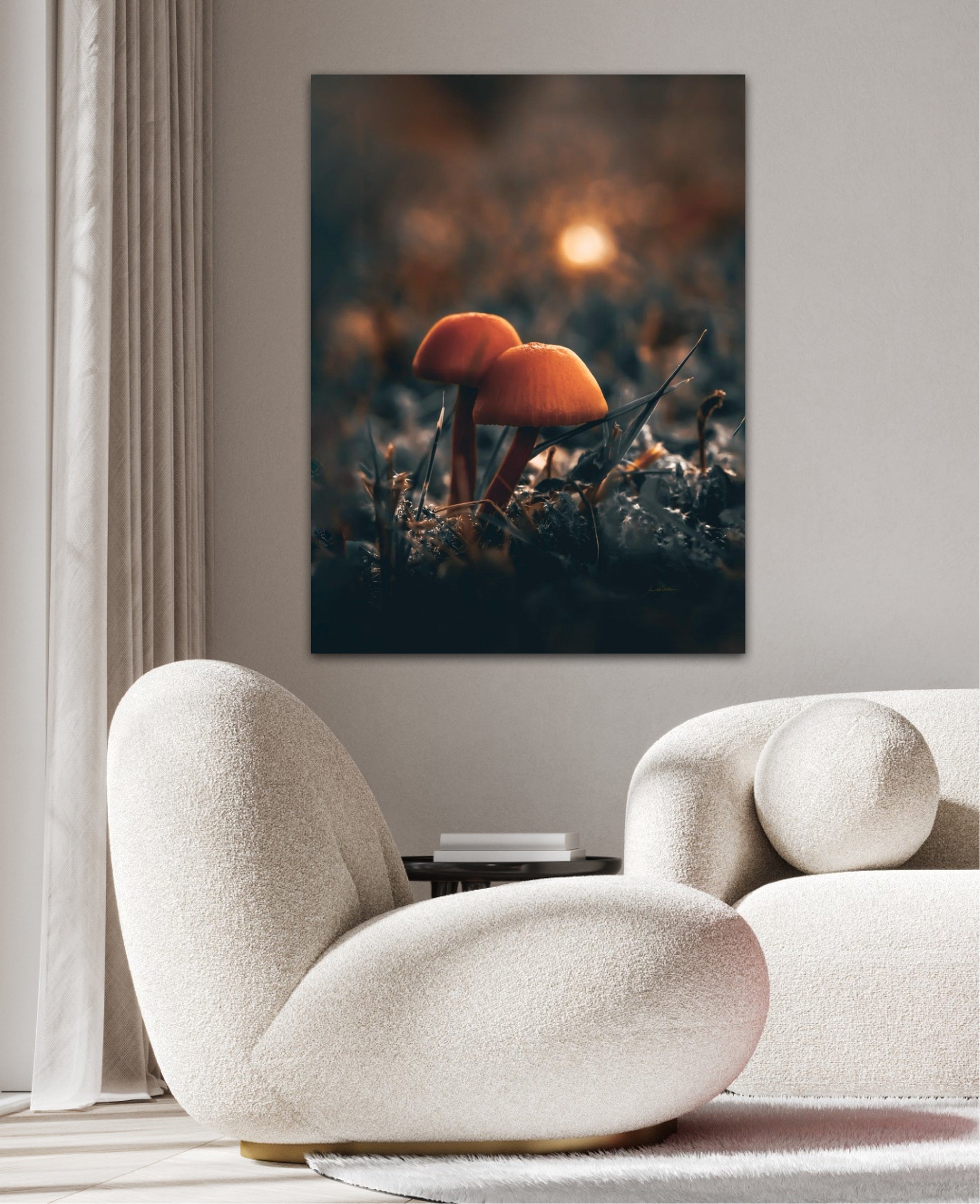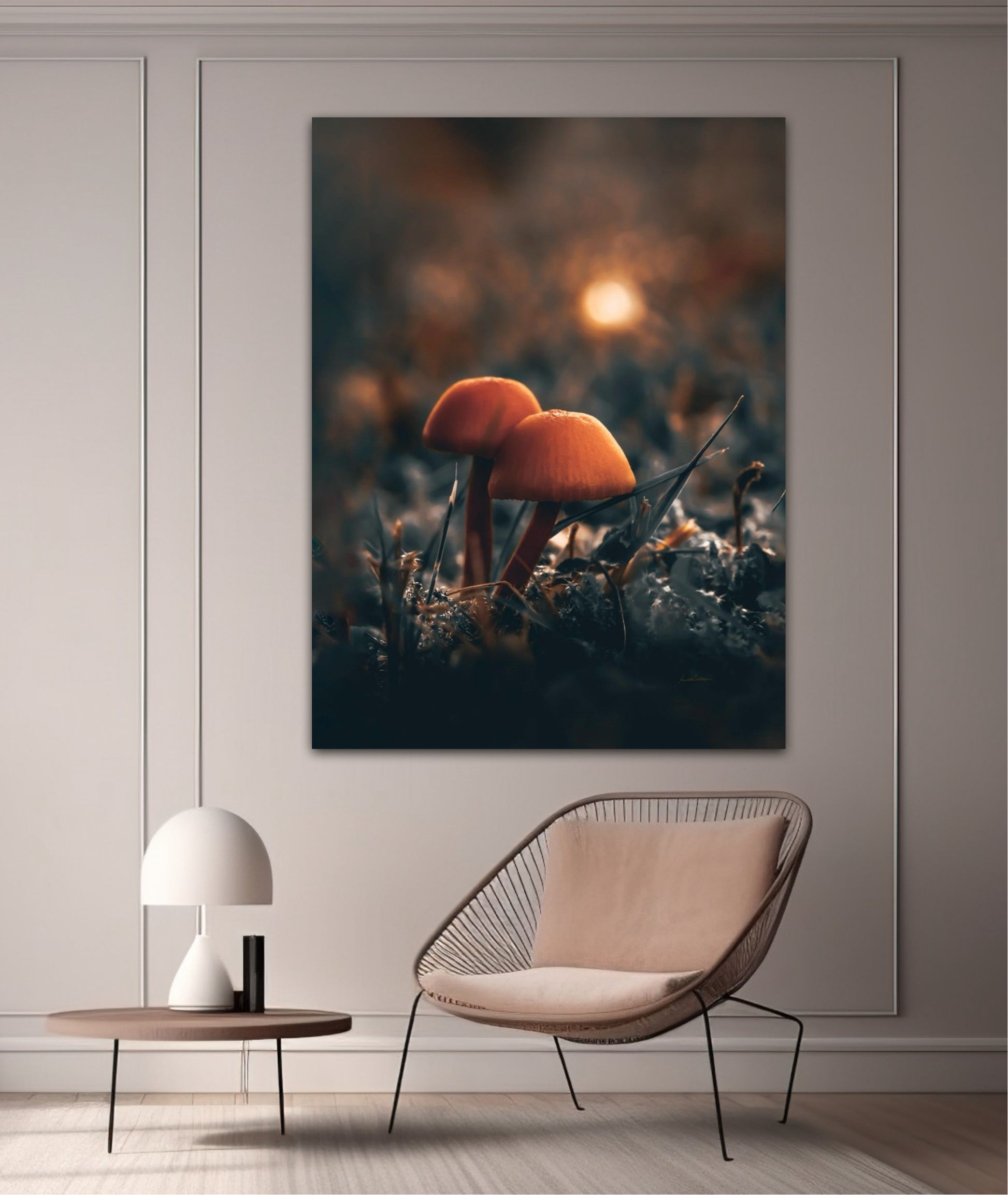 Beautiful photographic wall art of two mushrooms together in the grass, with stunning light in the background. This artwork has a lovely mood and will give your home that amazing cozy feel.