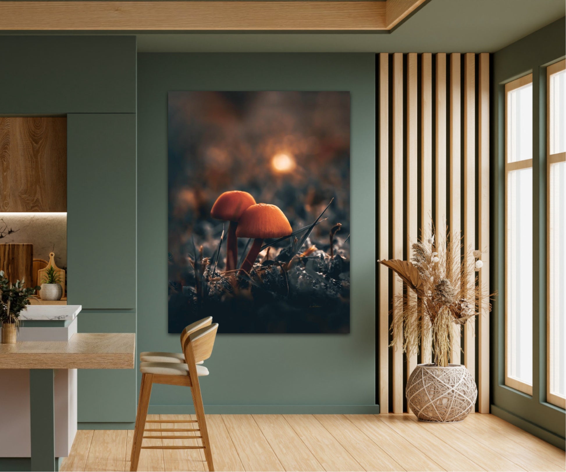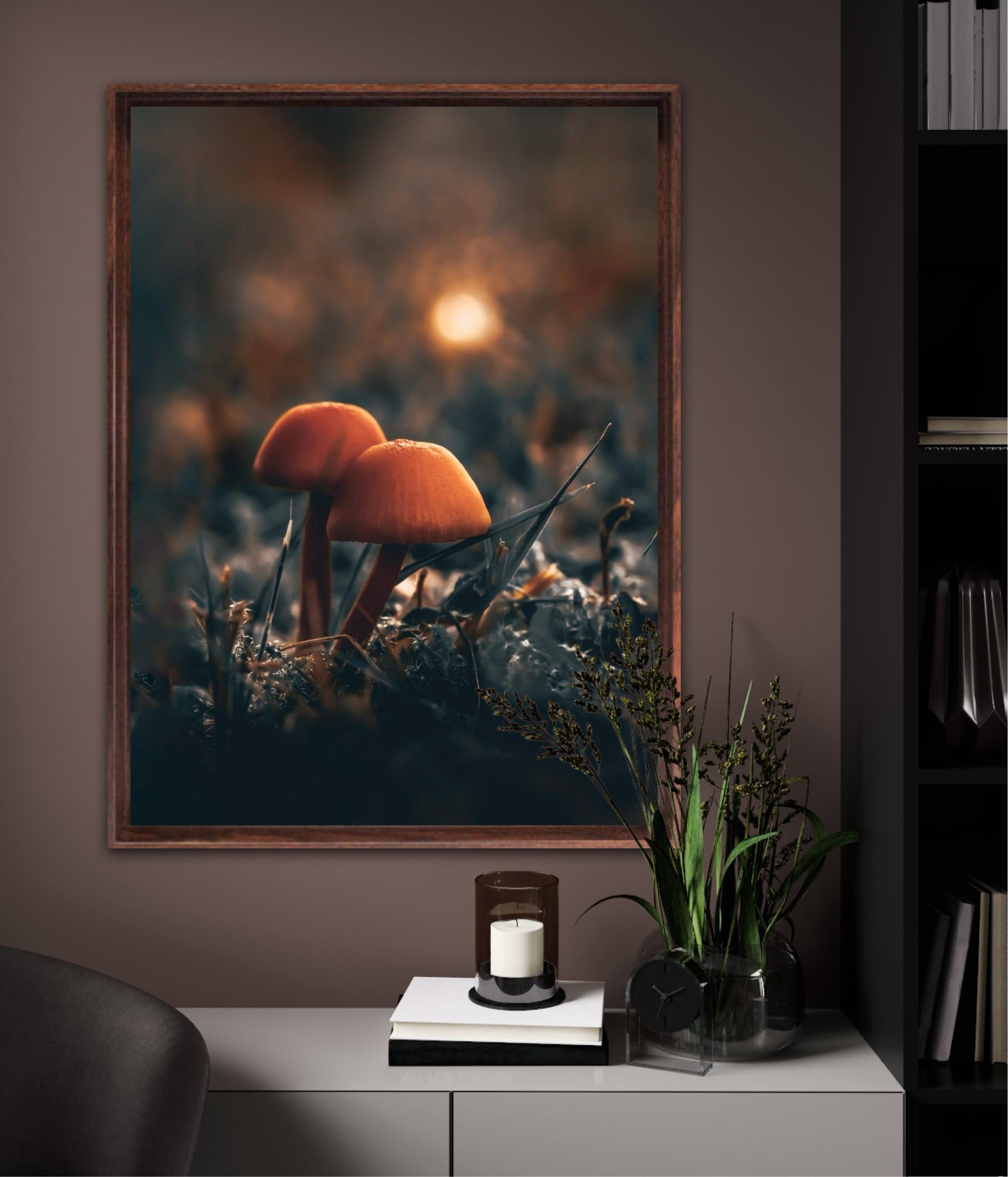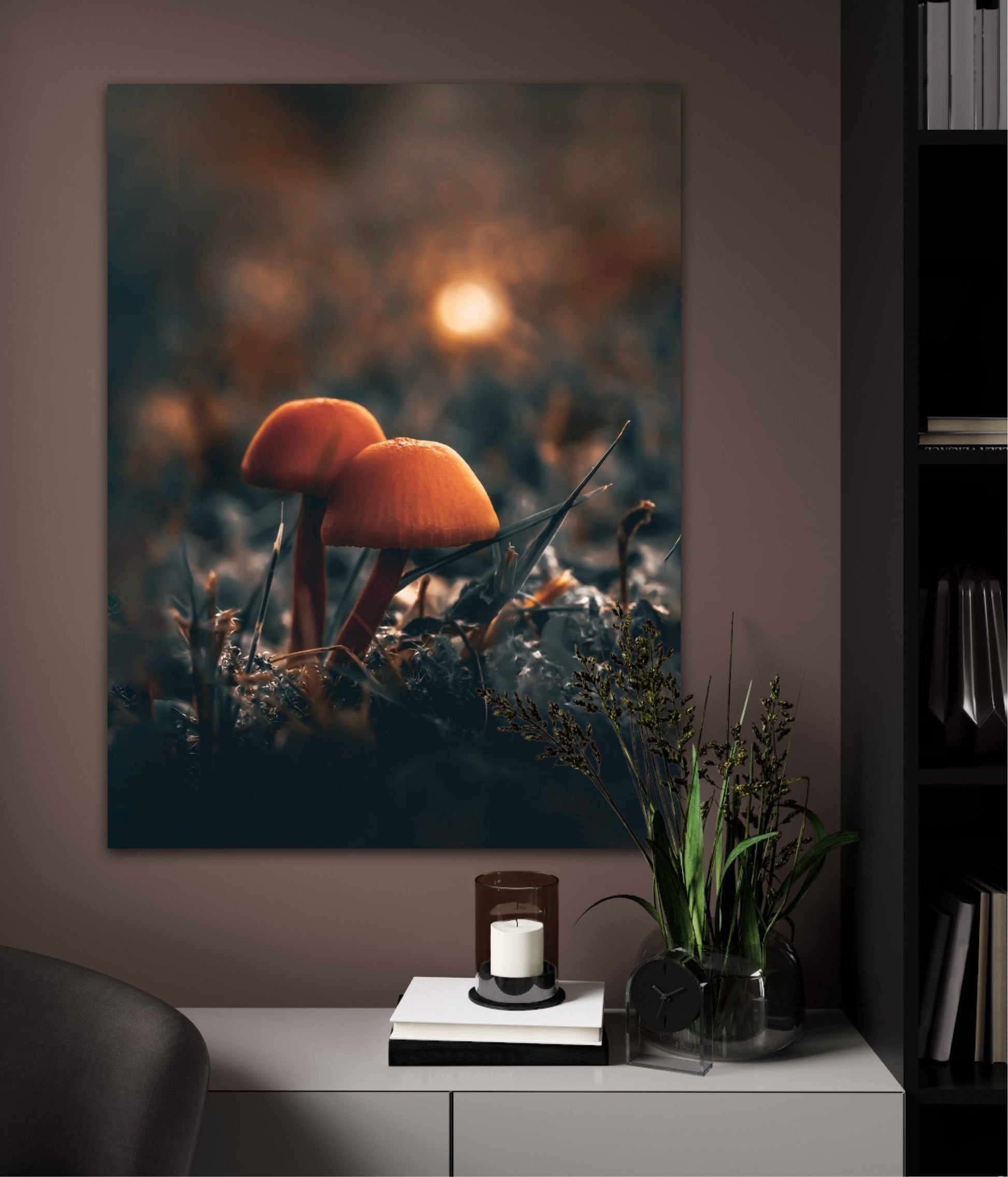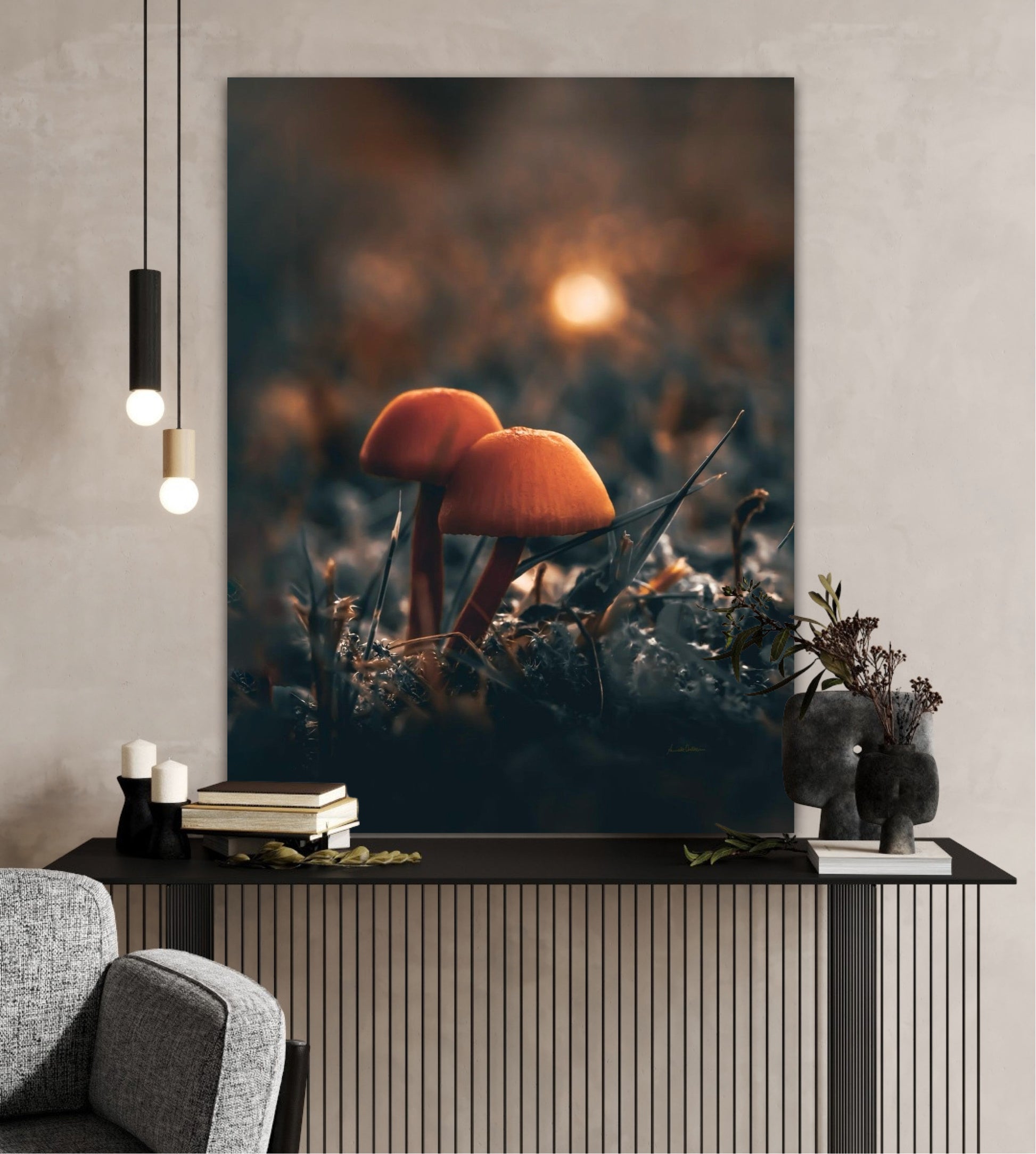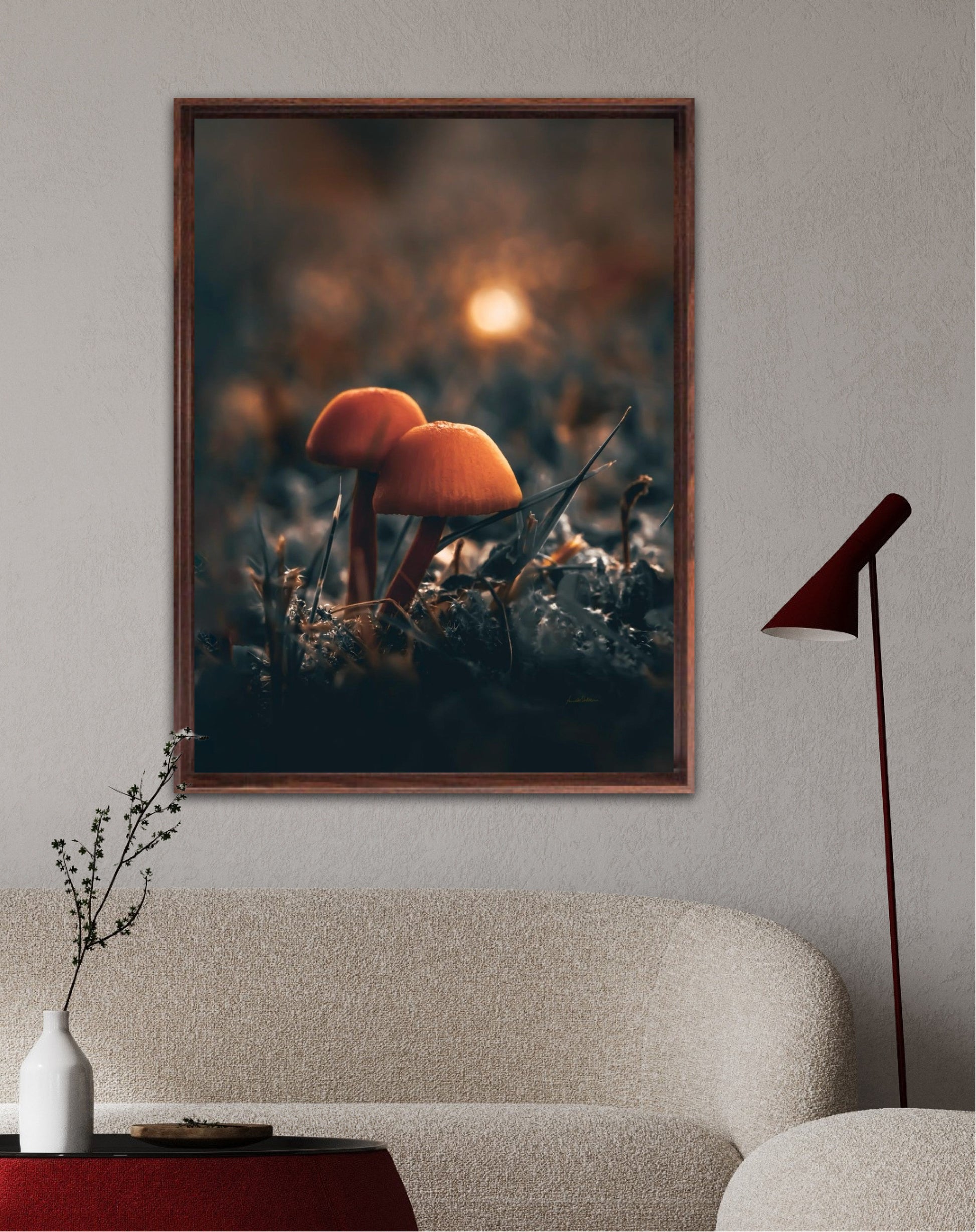 Beautiful photographic wall art of two mushrooms together in the grass, with stunning light in the background. This artwork has a lovely mood and will give your home that amazing cozy feel.