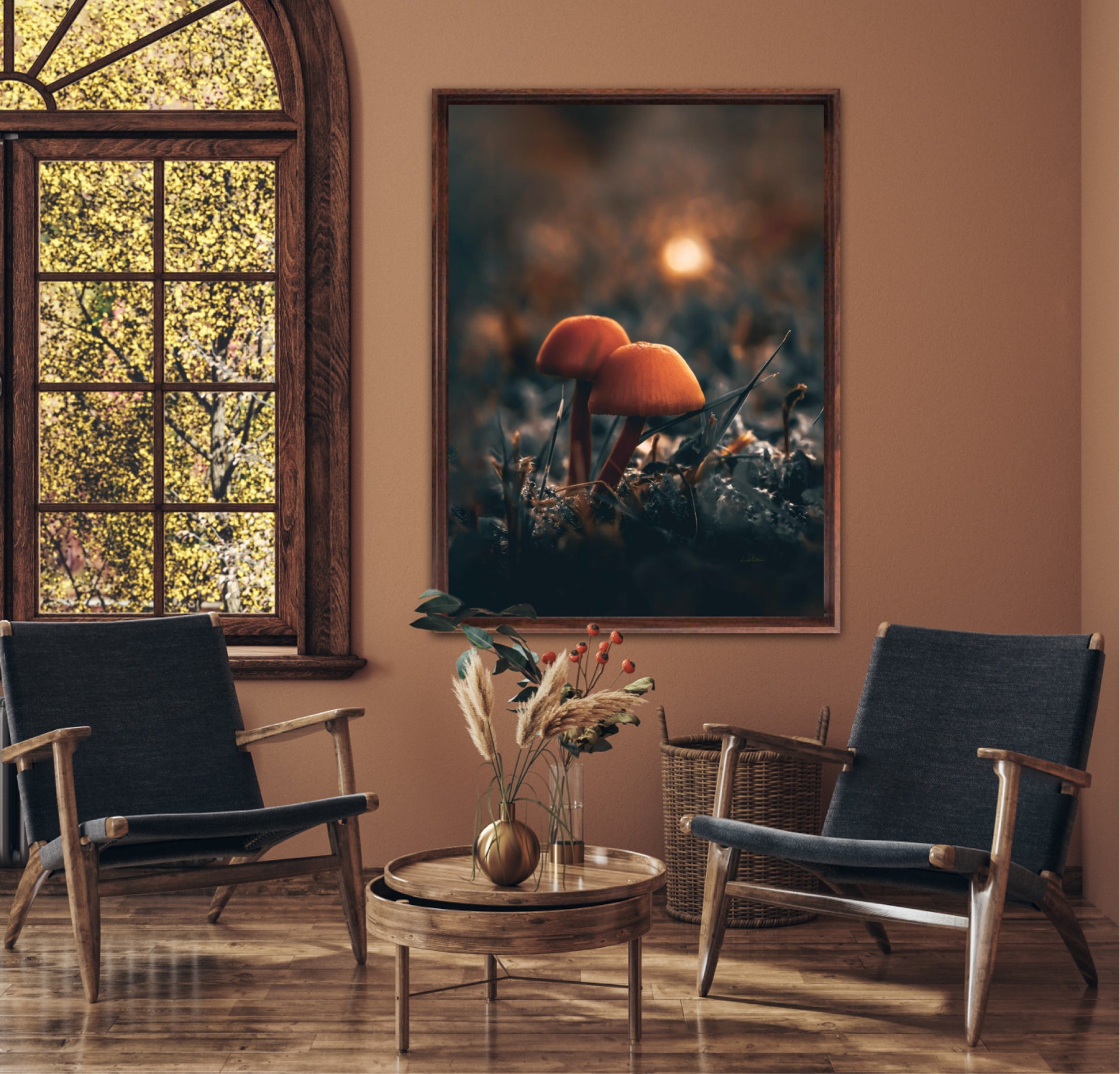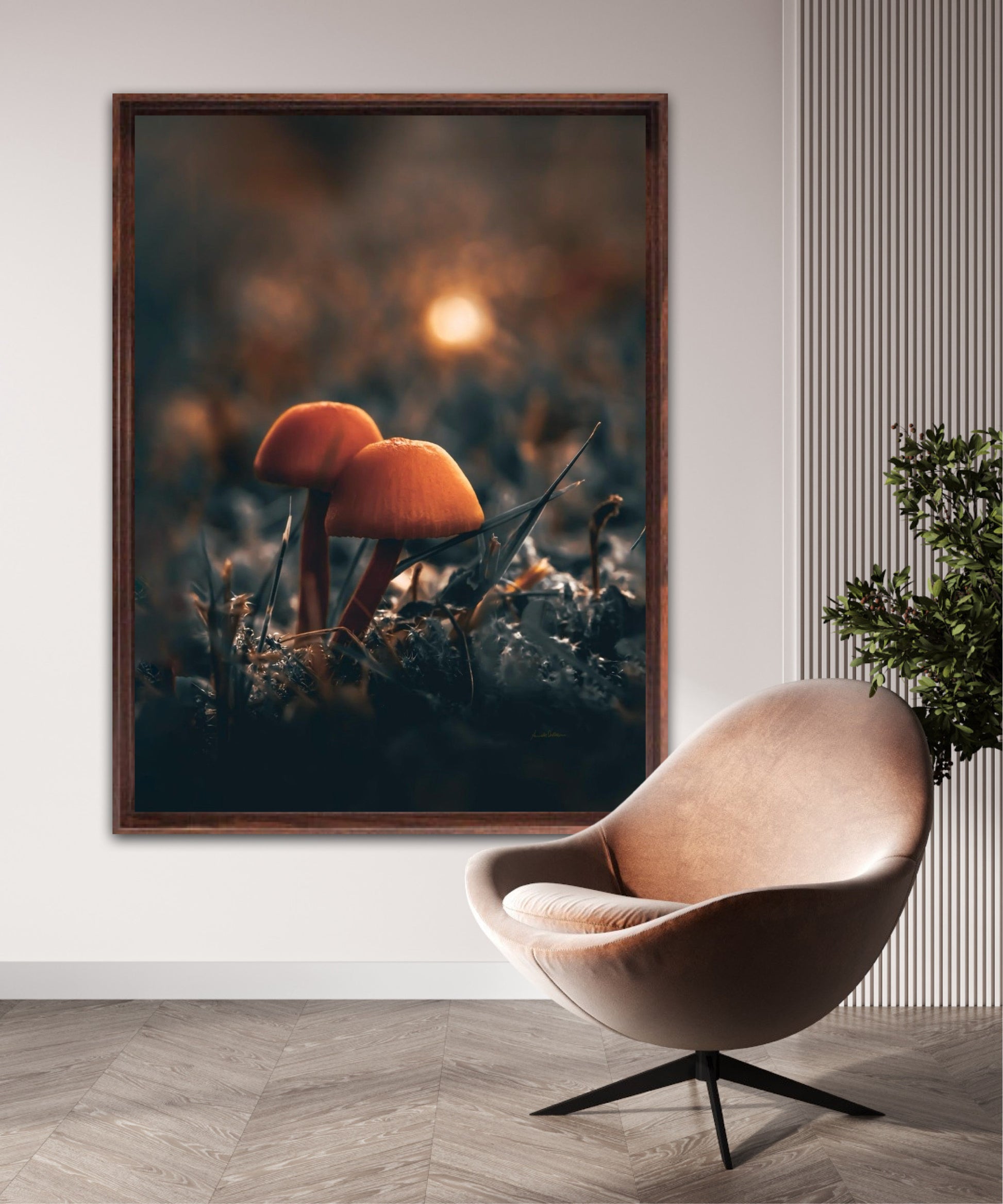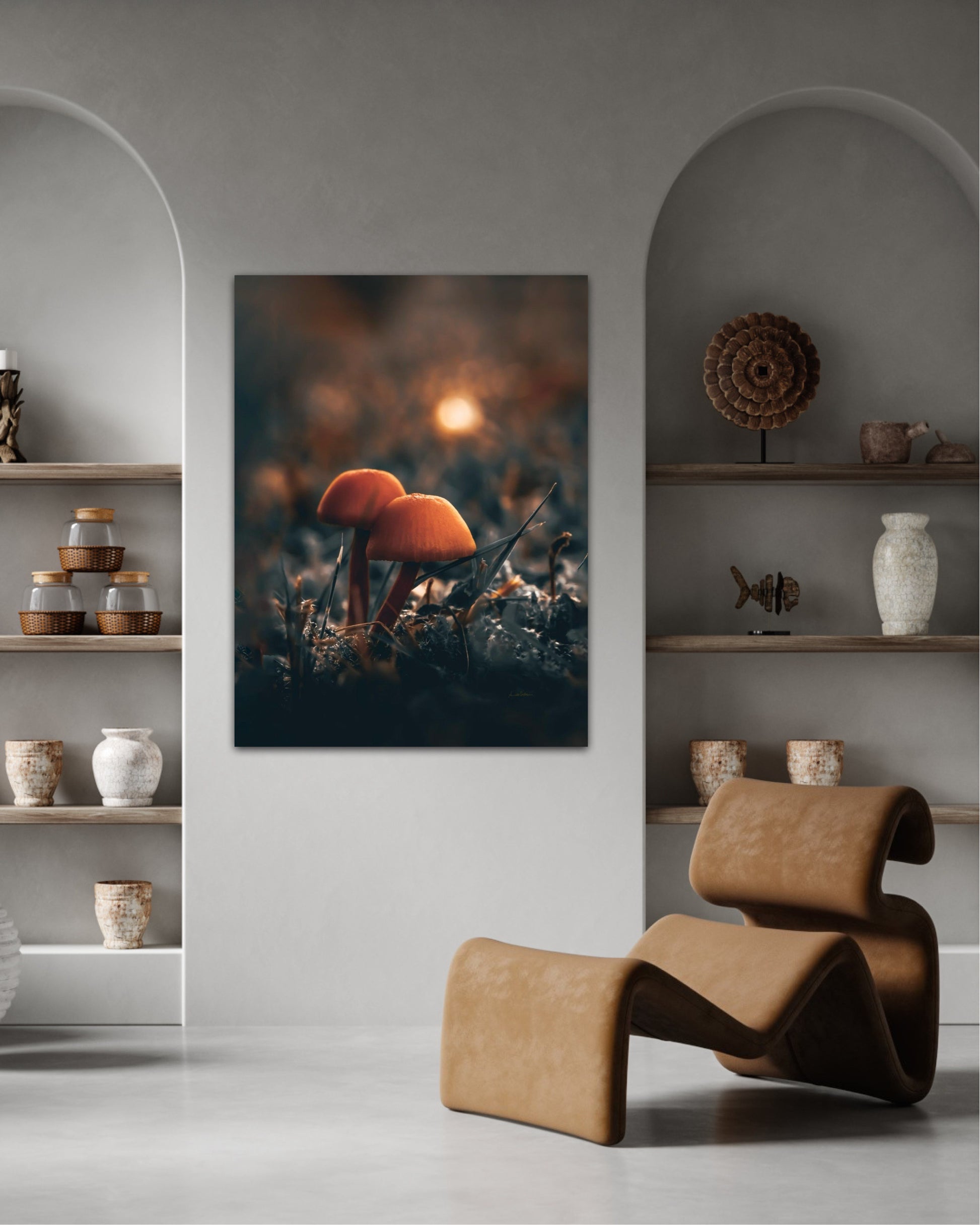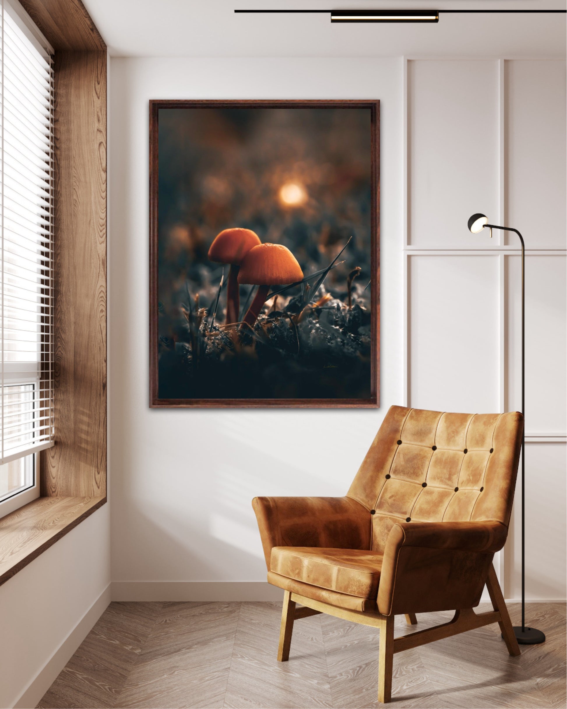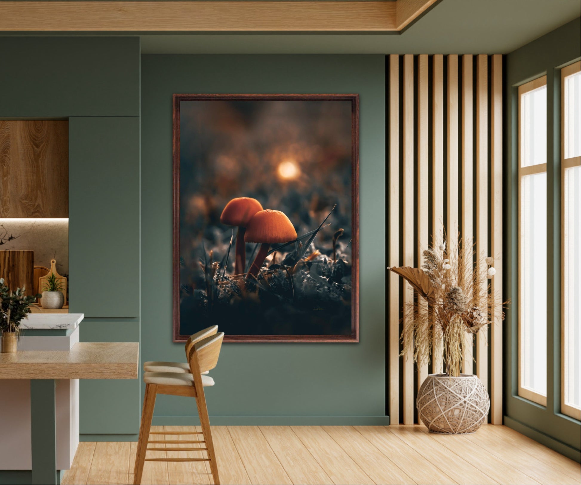 Beautiful photographic wall art of two mushrooms together in the grass, with stunning light in the background. This artwork has a lovely mood and will give your home that amazing cozy feel.