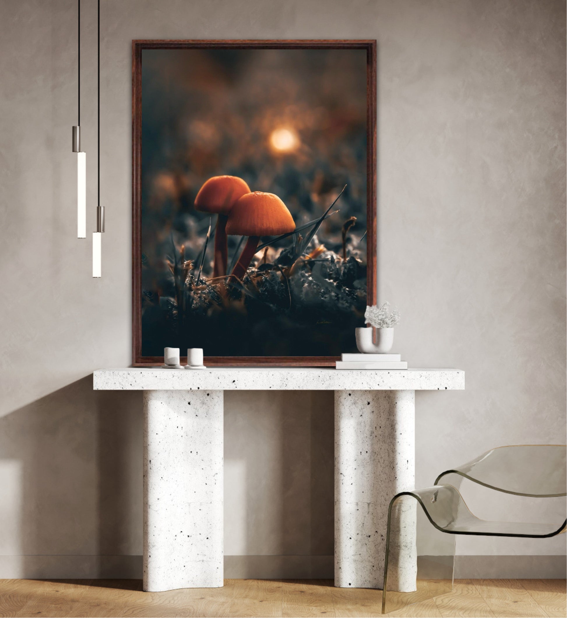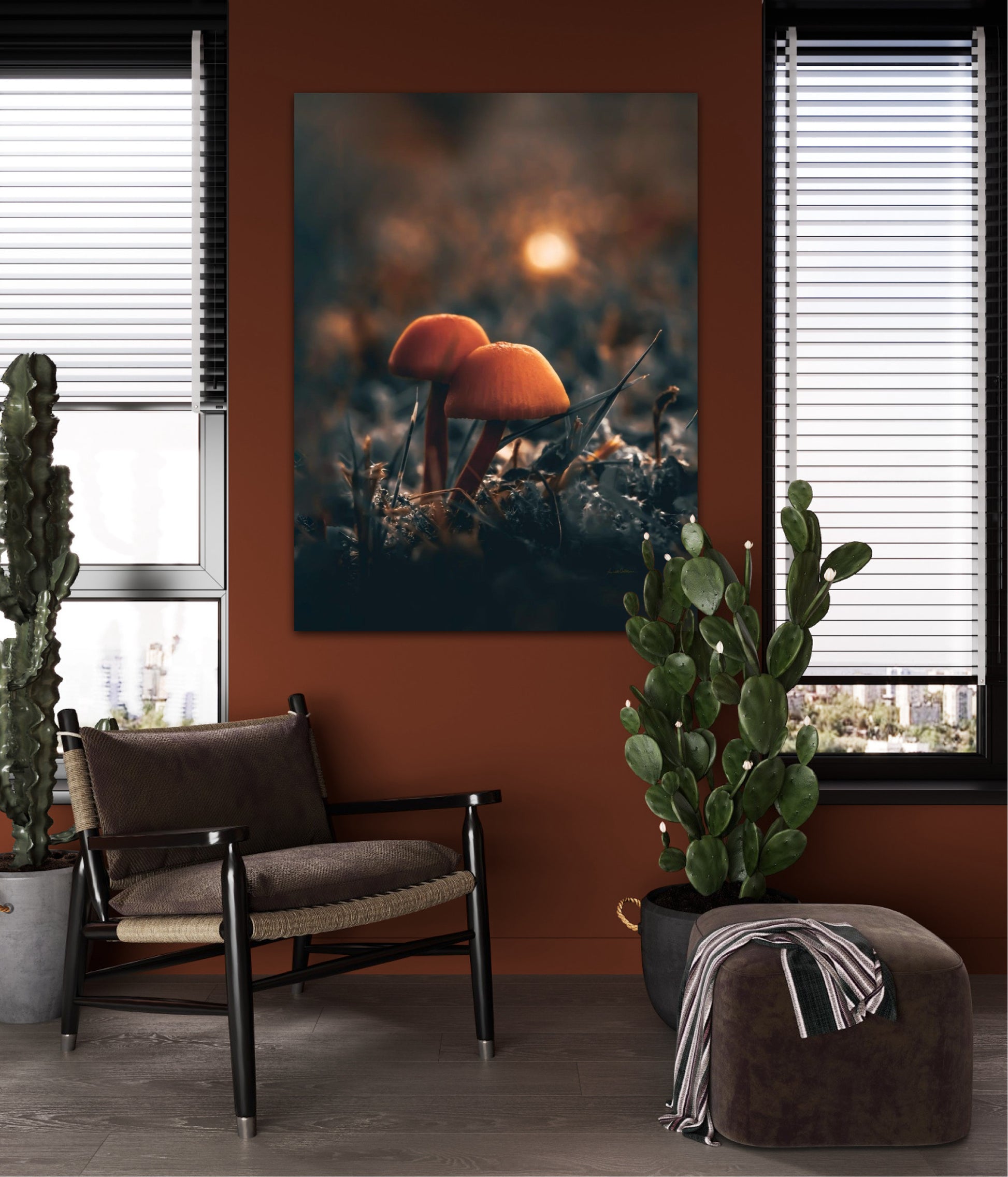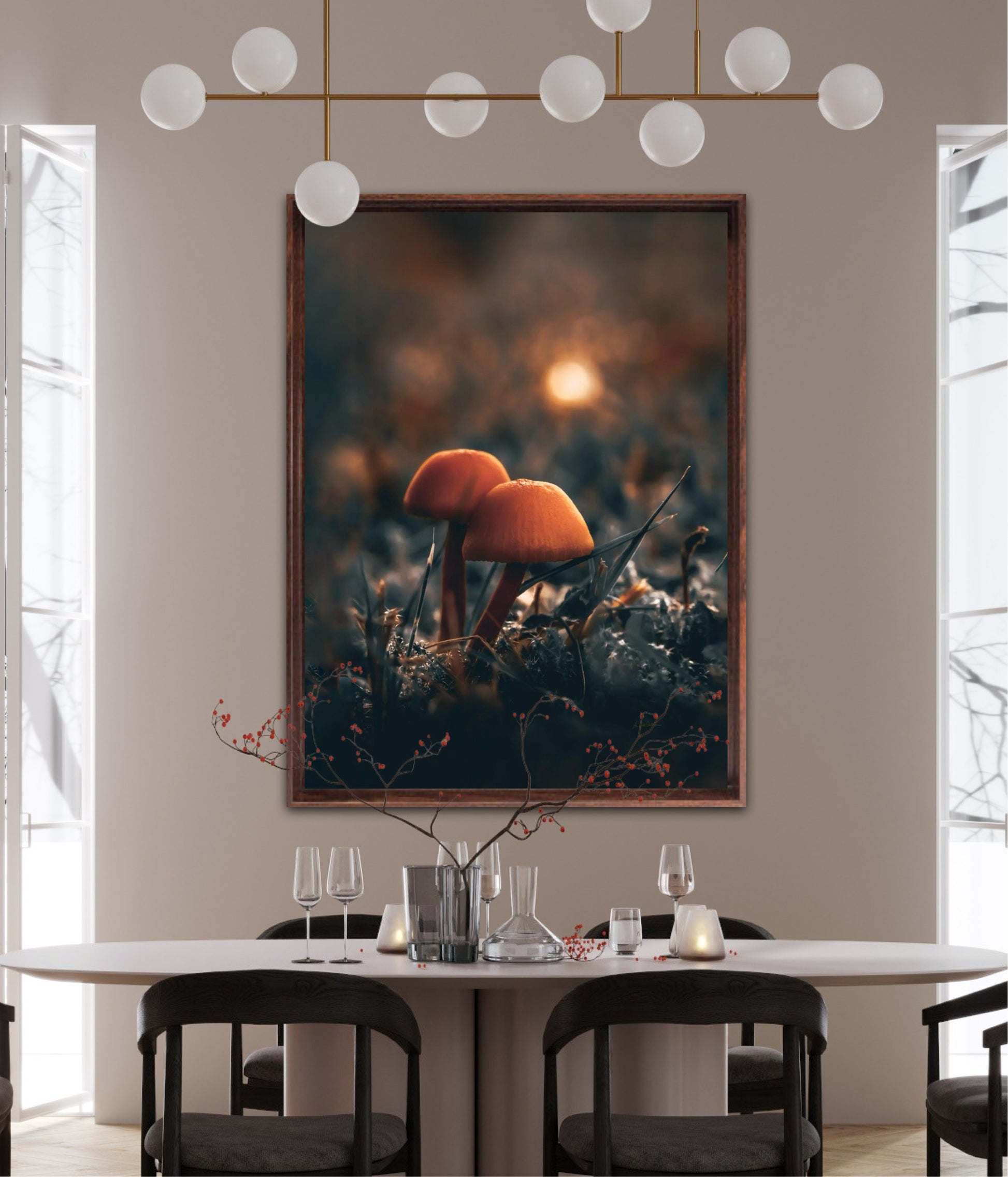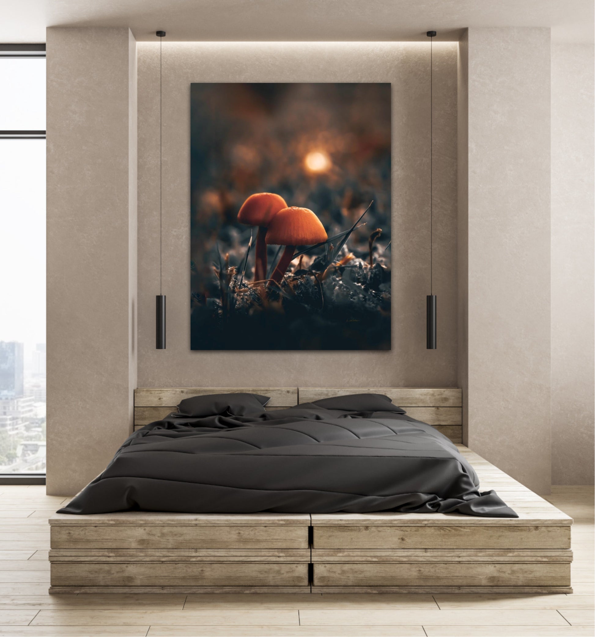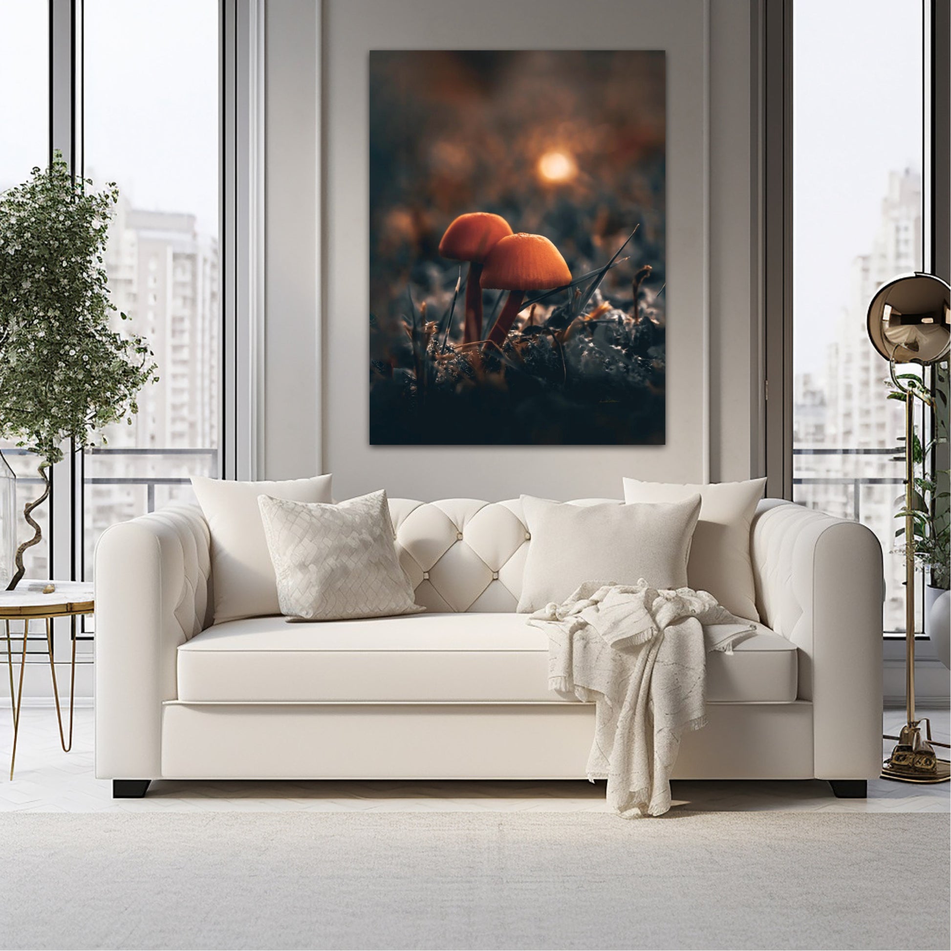 Beautiful photographic wall art of two mushrooms together in the grass, with stunning light in the background. This artwork has a lovely mood and will give your home that amazing cozy feel.