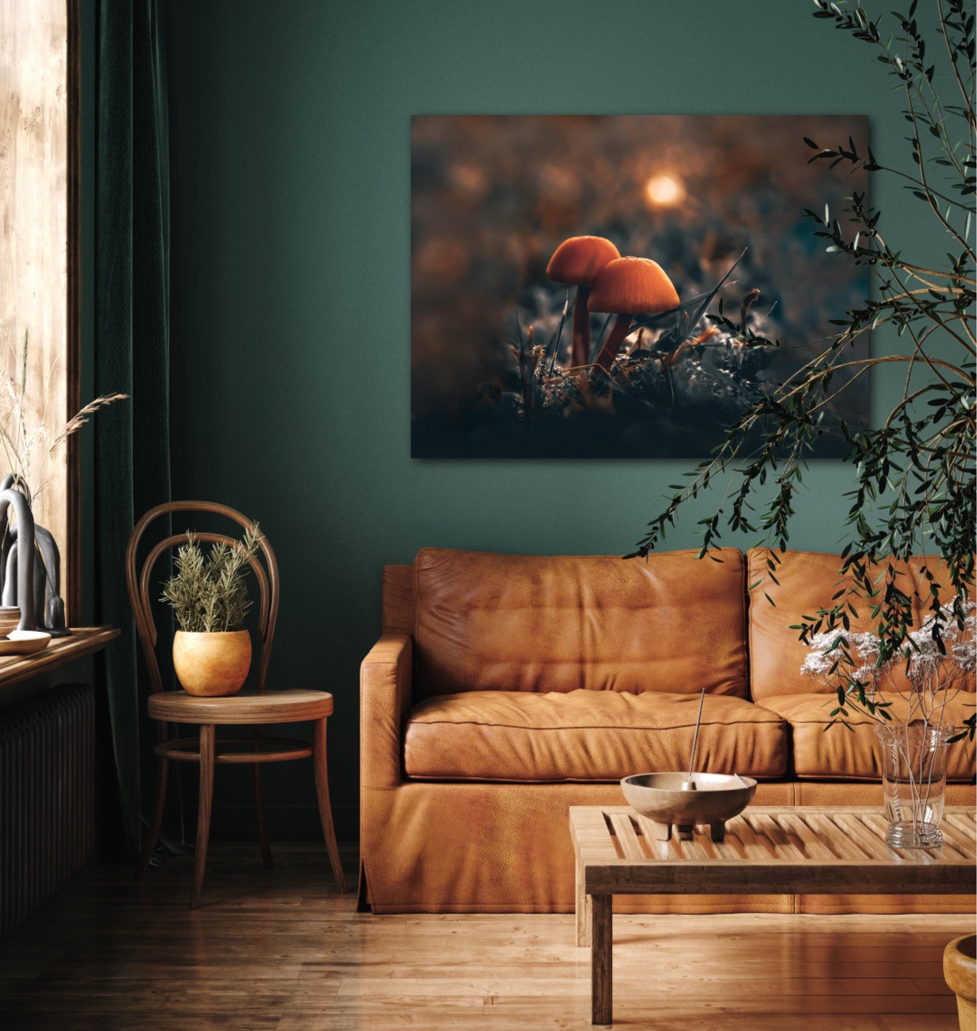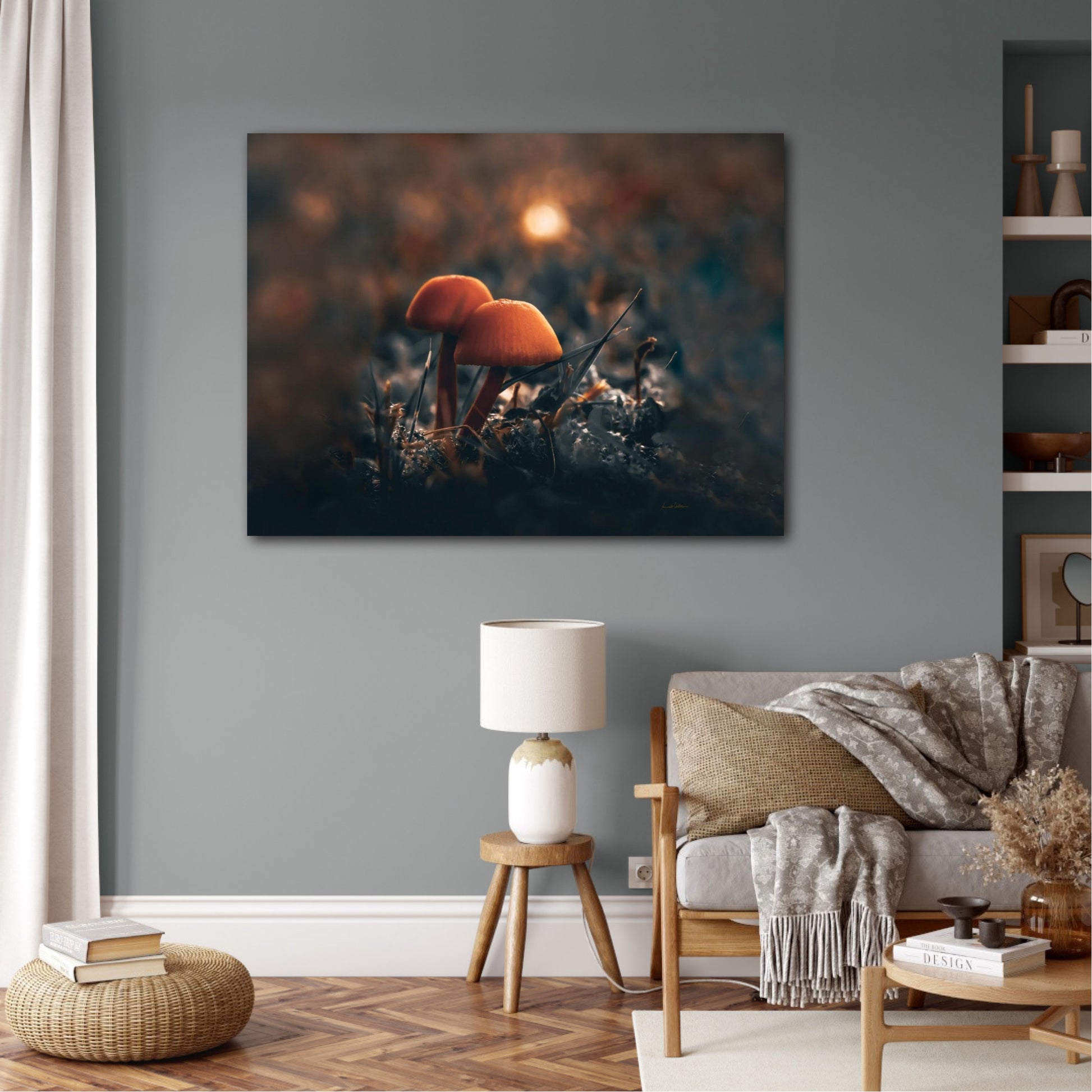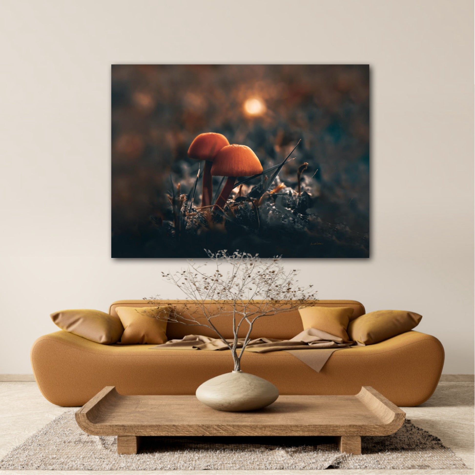 Beautiful photographic wall art of two mushrooms together in the grass, with stunning light in the background. This artwork has a lovely mood and will give your home that amazing cozy feel.