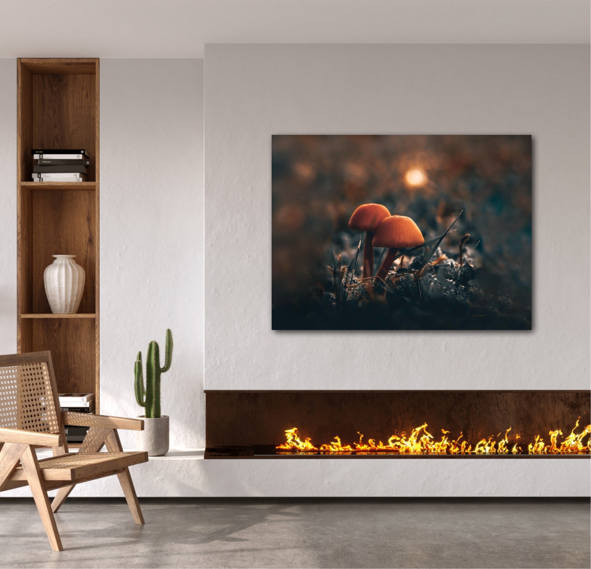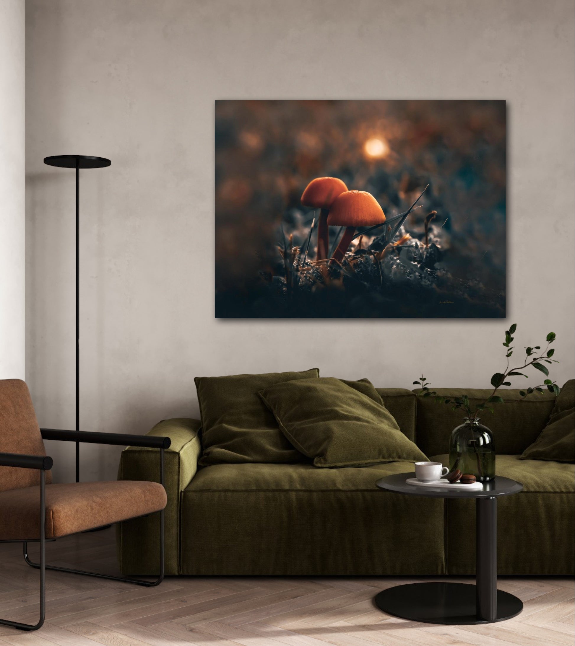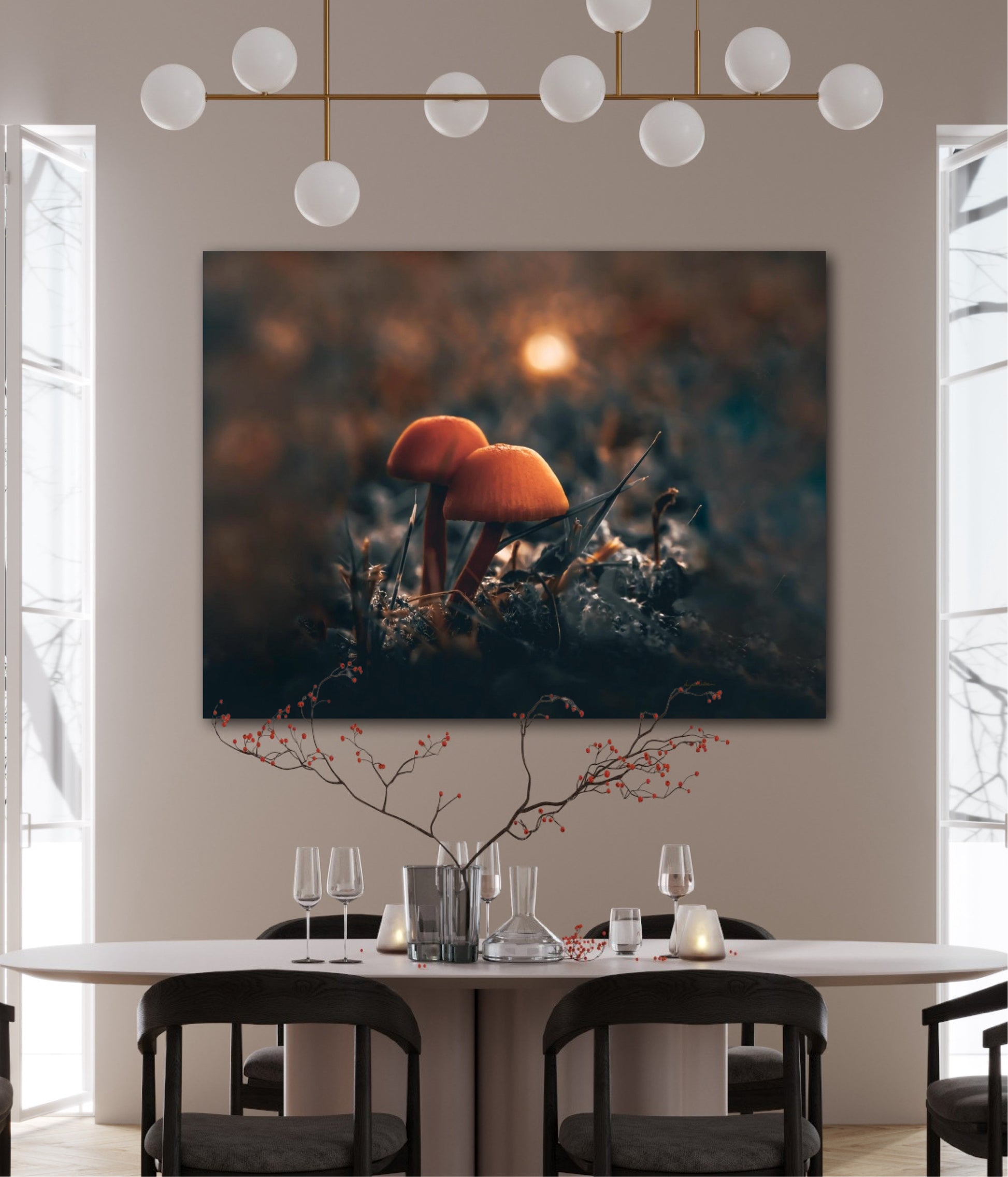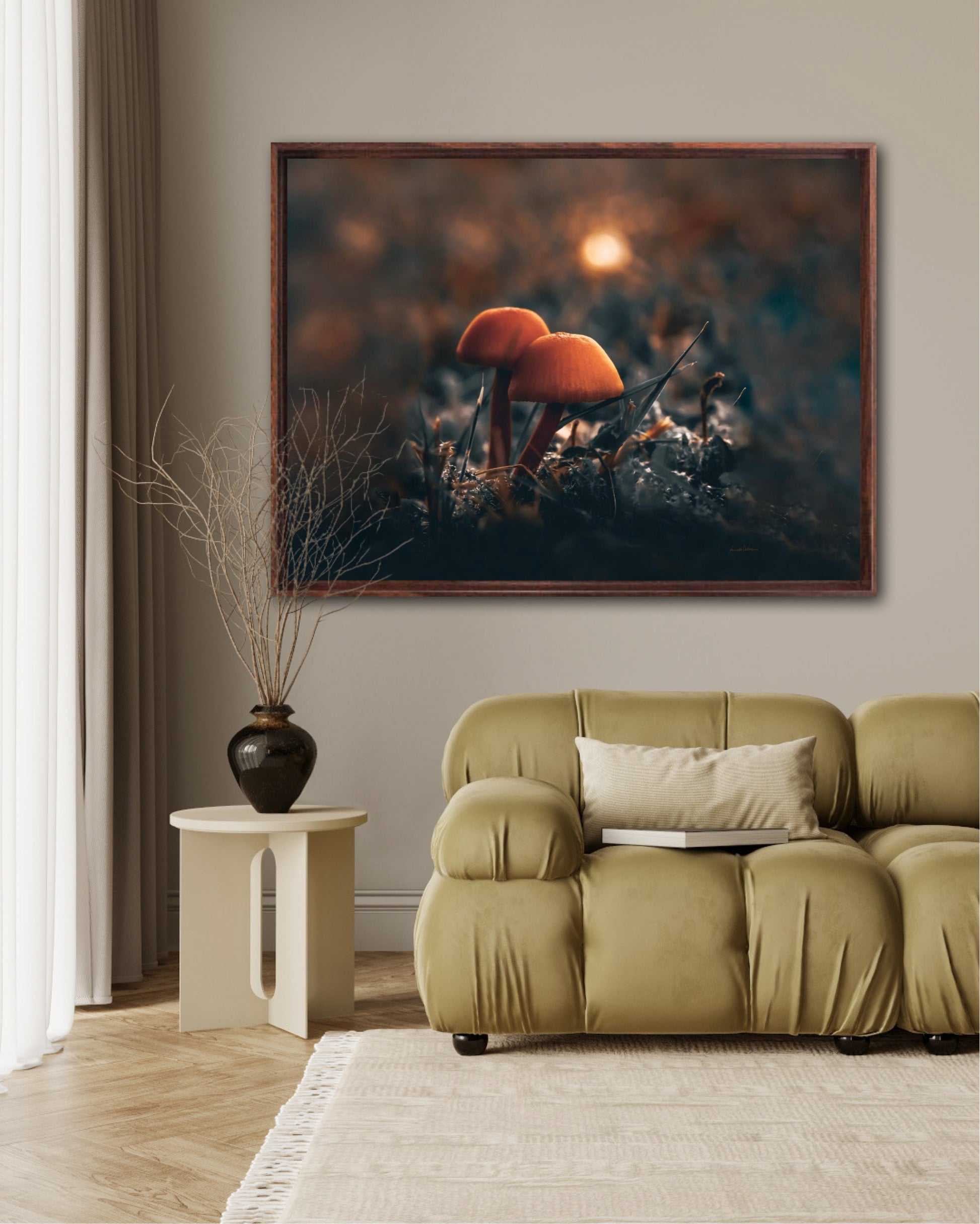 Beautiful photographic wall art of two mushrooms together in the grass, with stunning light in the background. This artwork has a lovely mood and will give your home that amazing cozy feel.