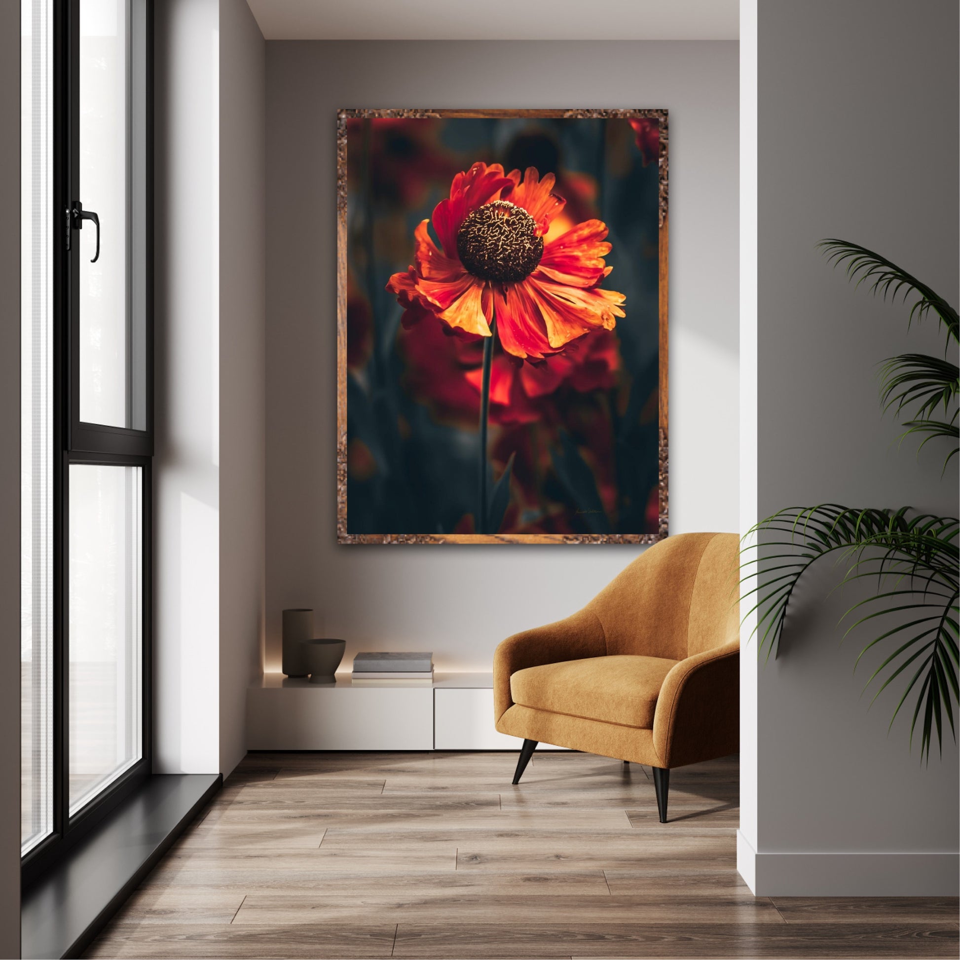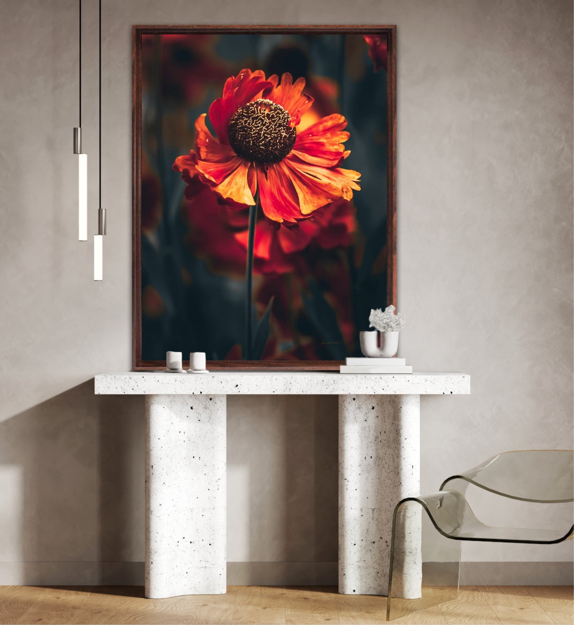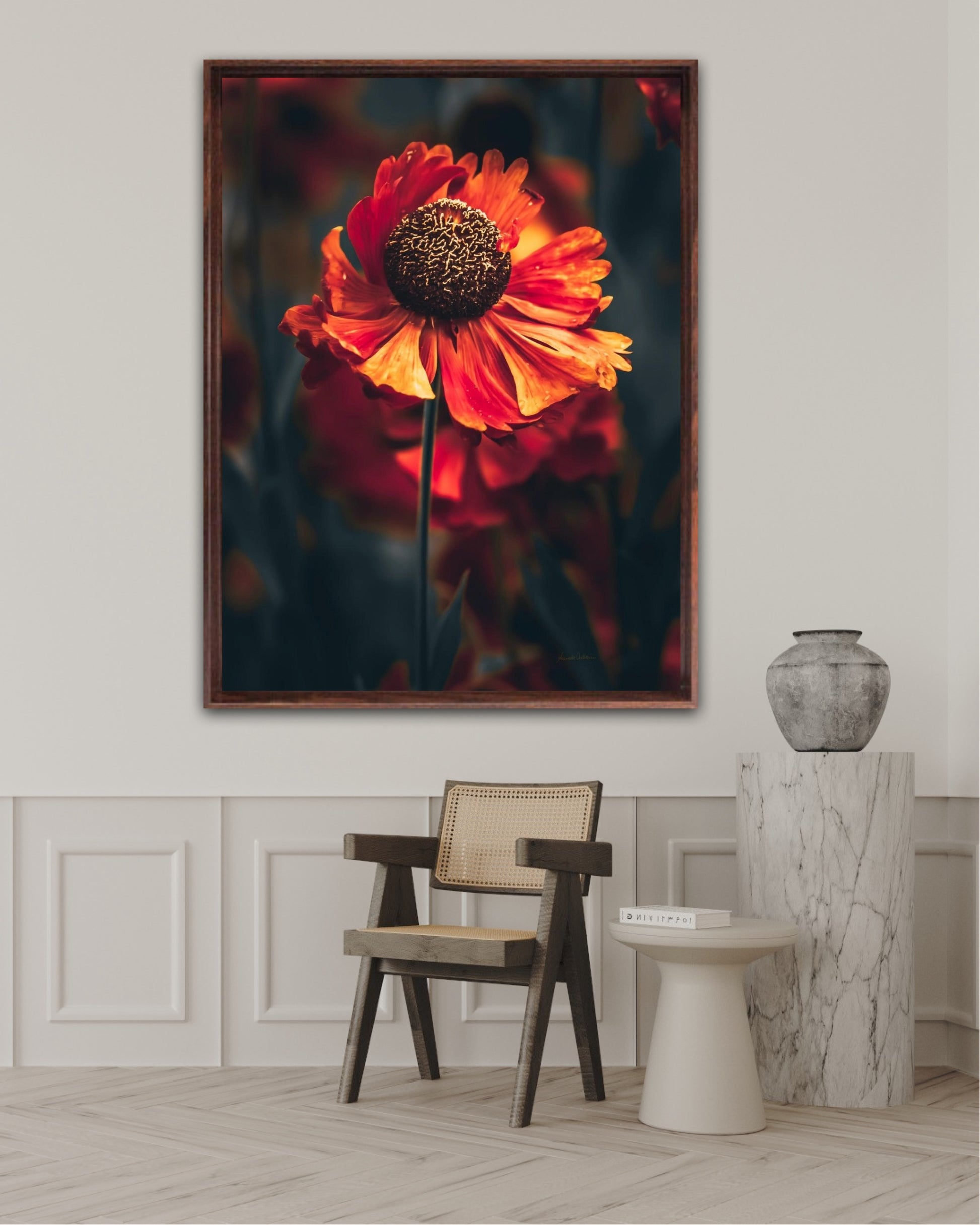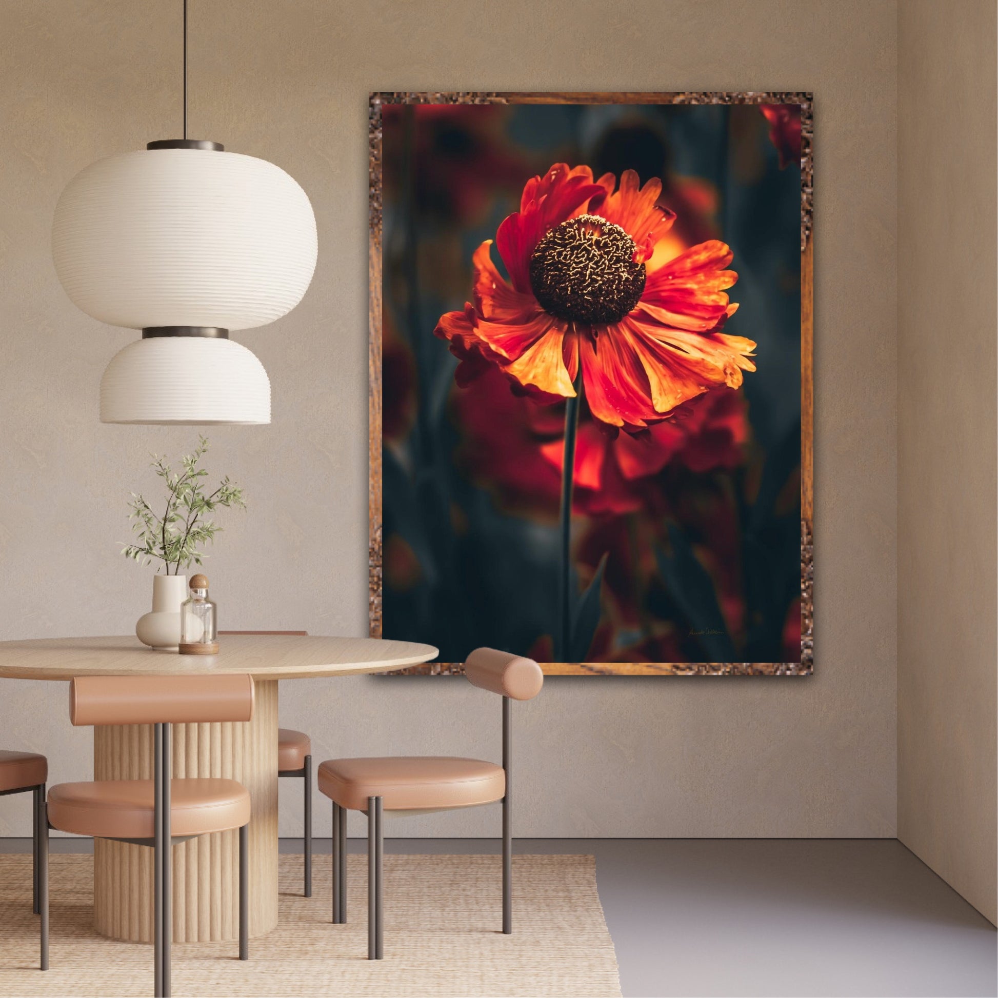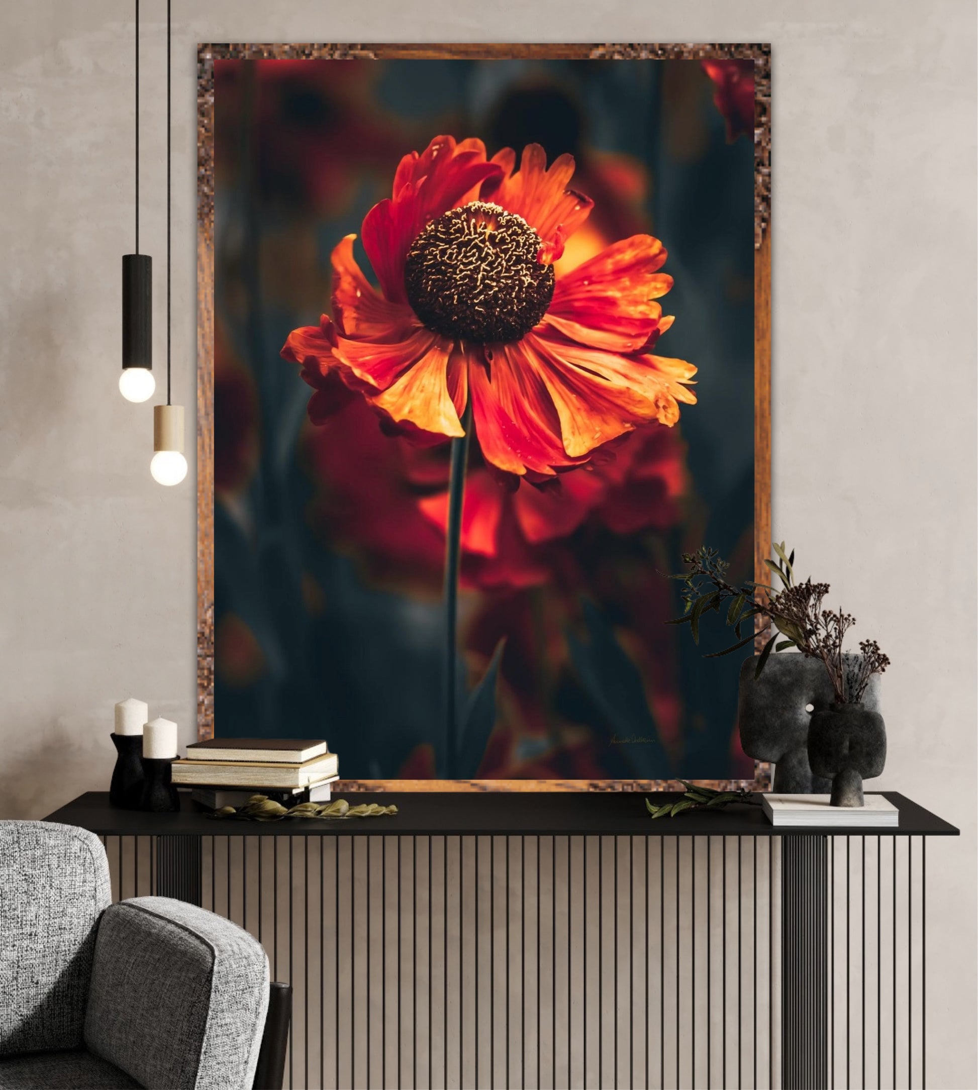 Beautiful photographic wall art of a gorgeous autumn solstice flower on a dark bluegrey background. This art piece will lift you up.